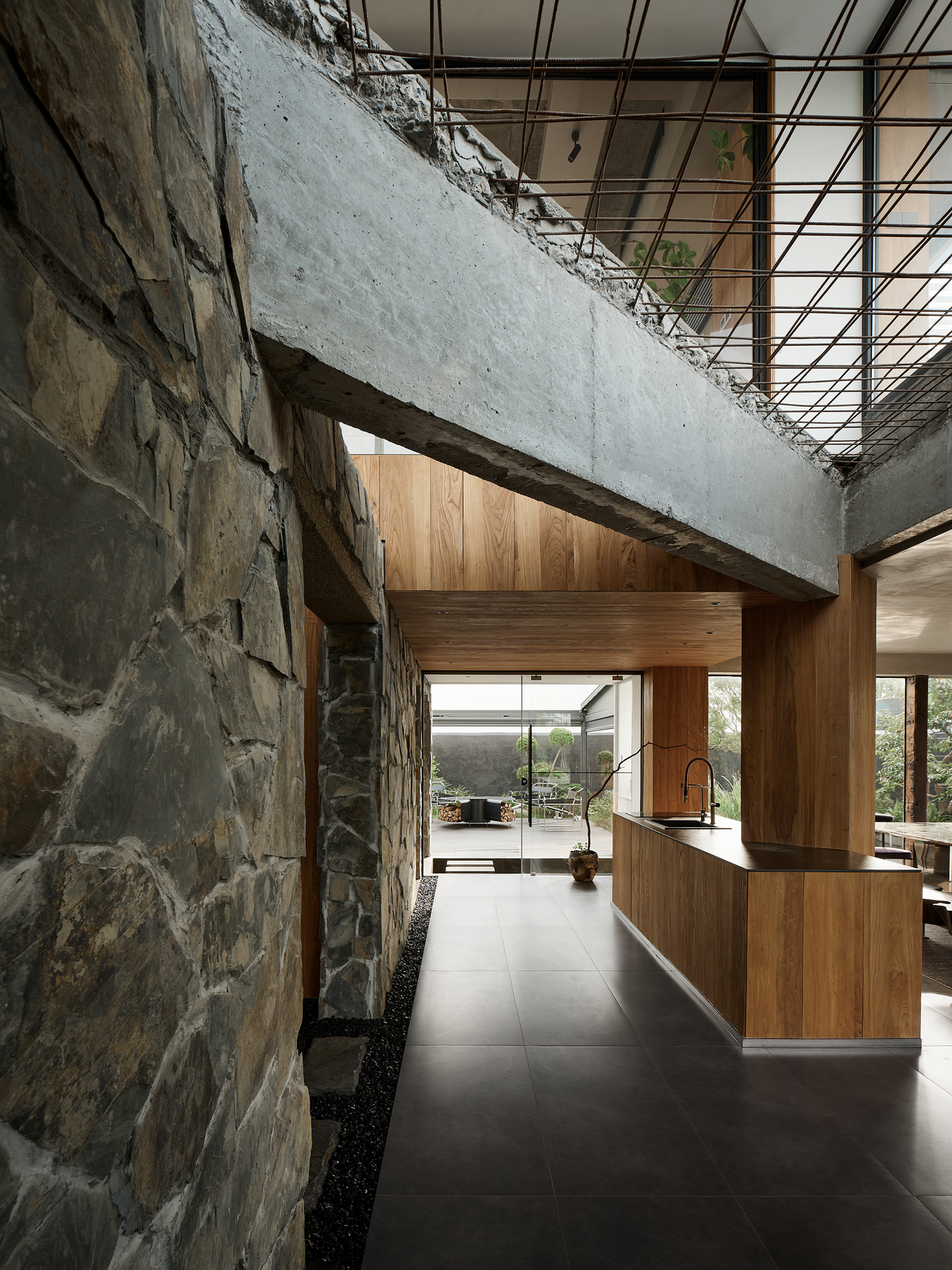 原建筑结构穿插于空间之中,模糊了室内外空间的边界。
