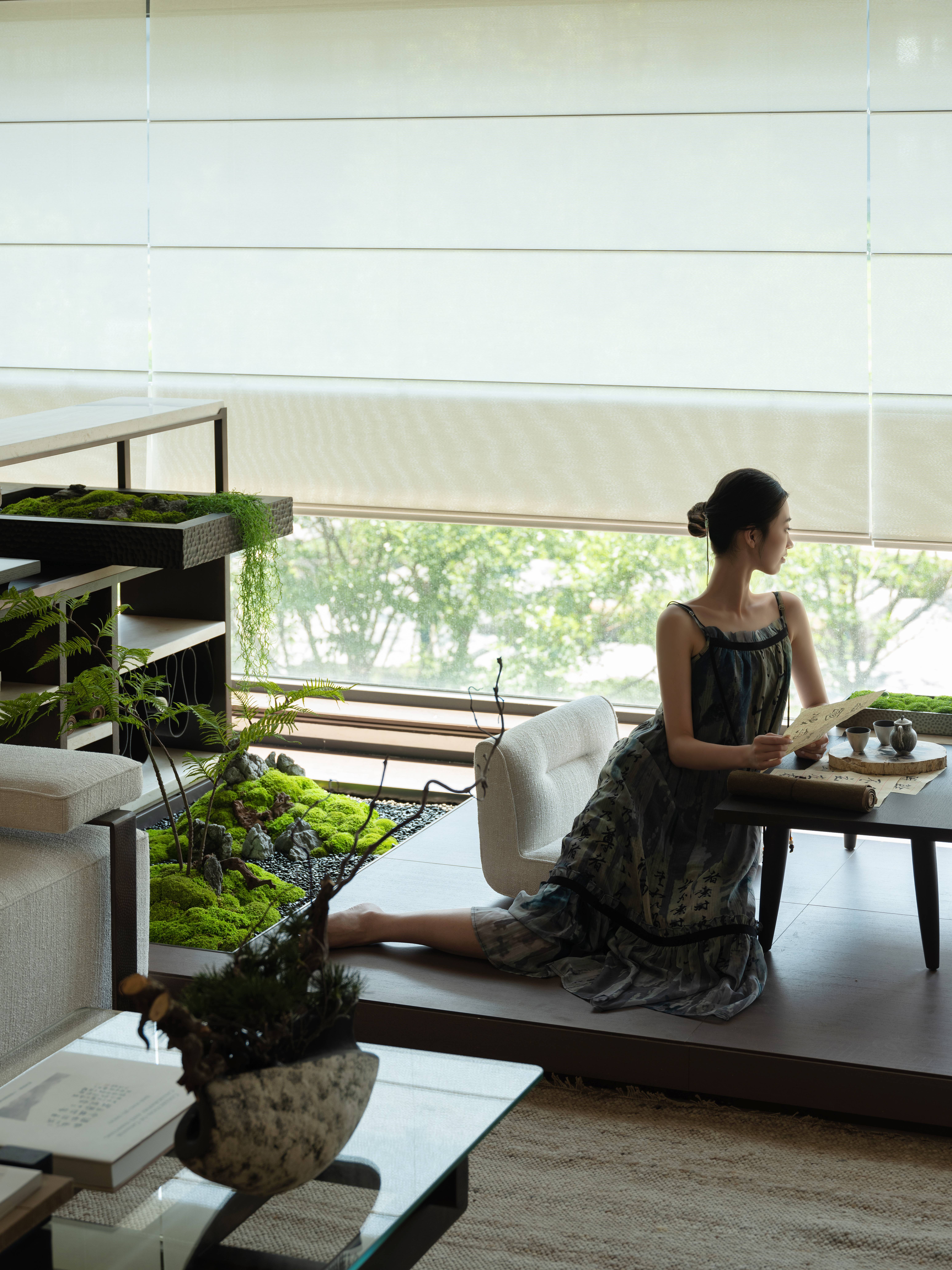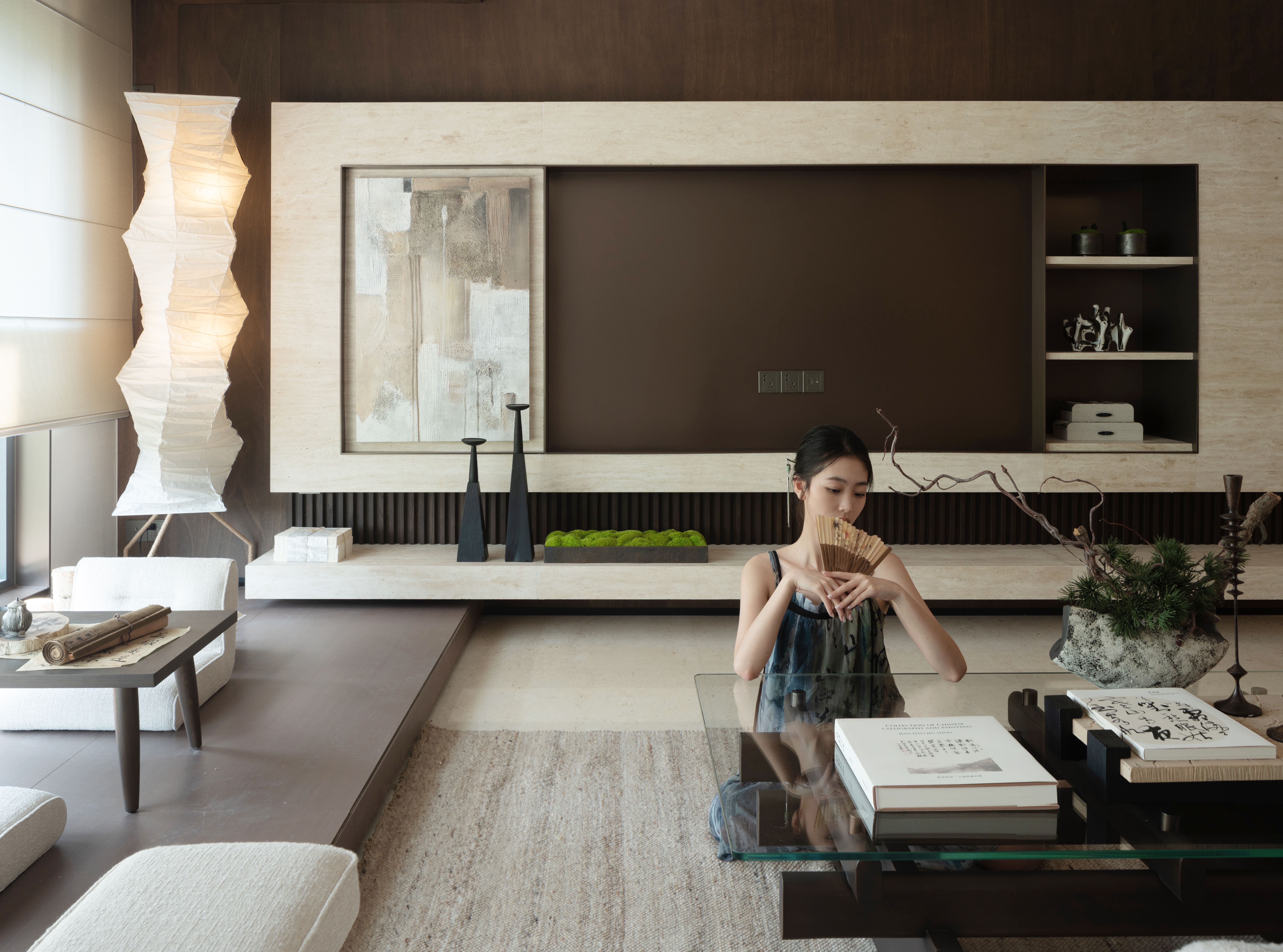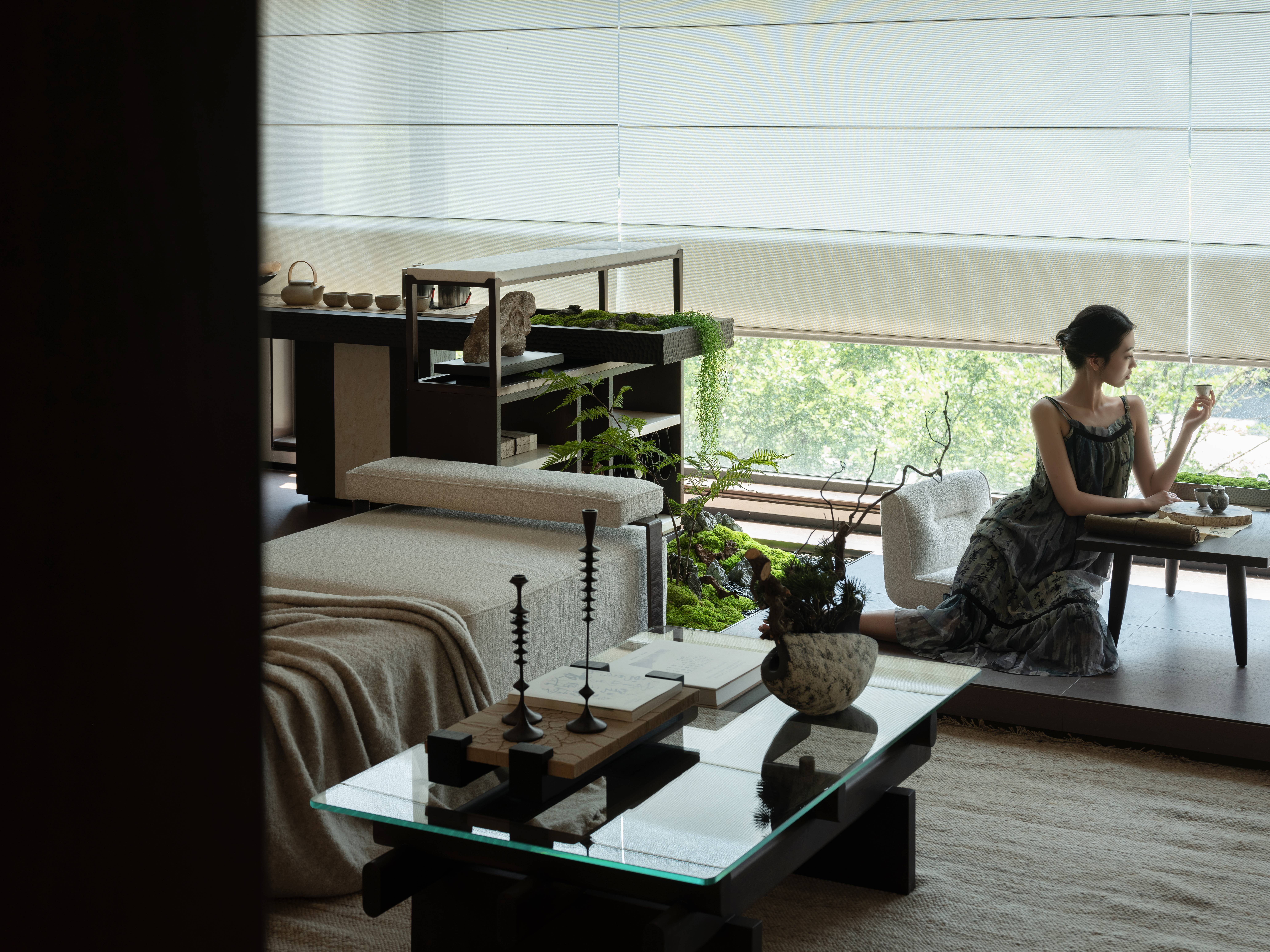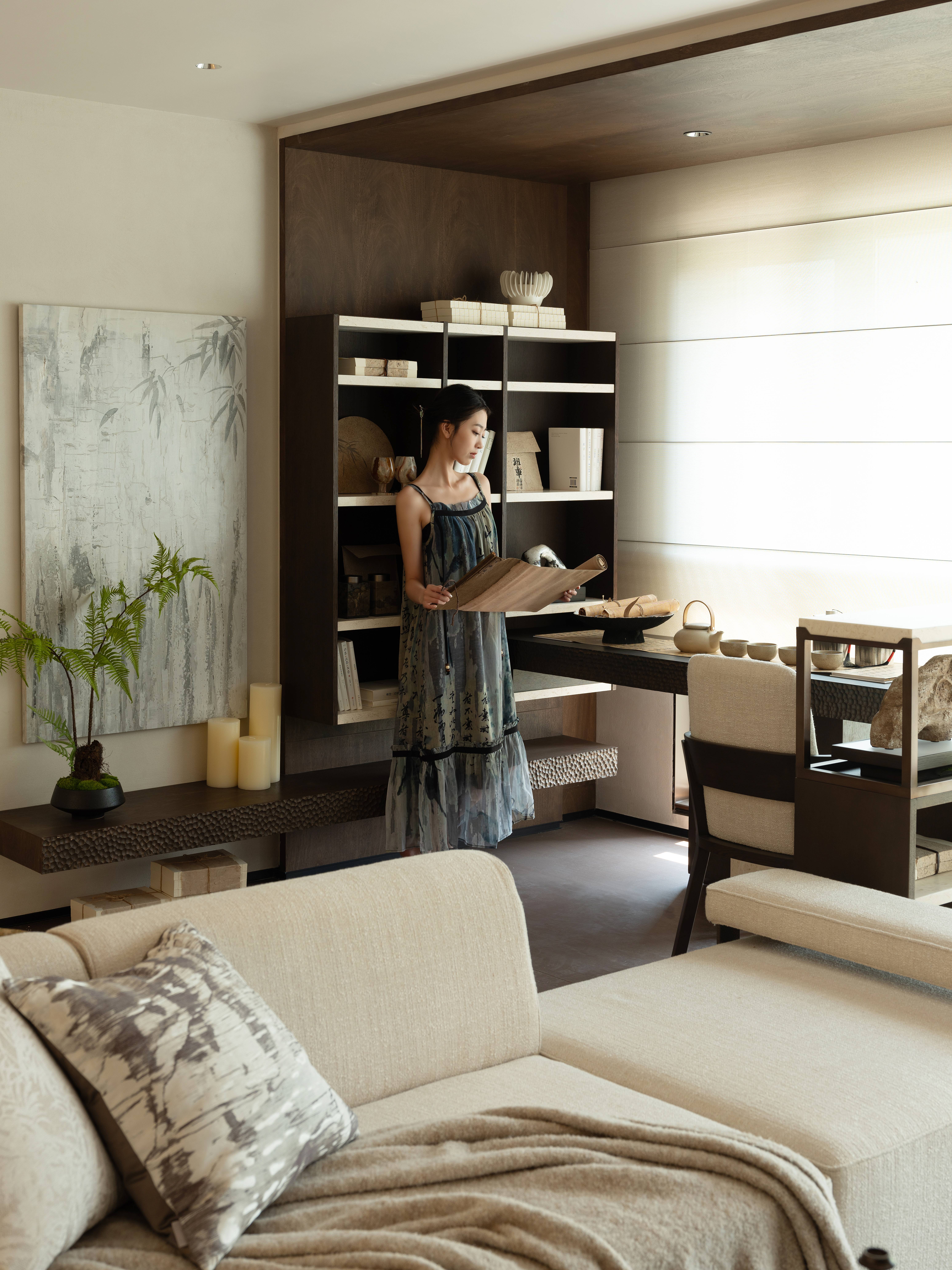 空间布局:空间布局上将宽厅尺度再利用,阳台处叠合会客/品茗/书画多位一体打造空间场景,给予参观者更具包裹感沉浸式的体验感受,回归自然,空间中细节之处都流露出自然的折皱与纹理,注入舒适与平和。