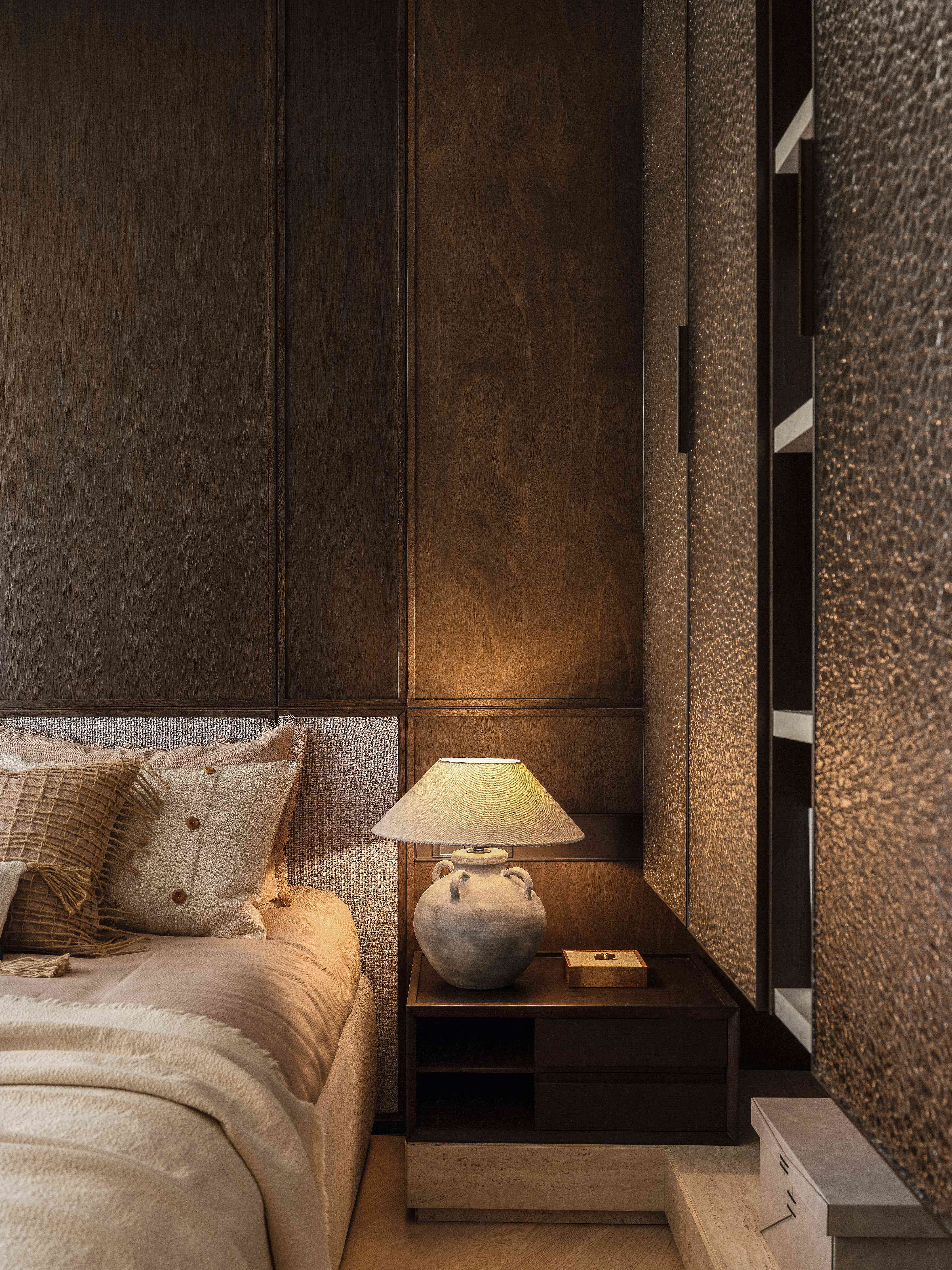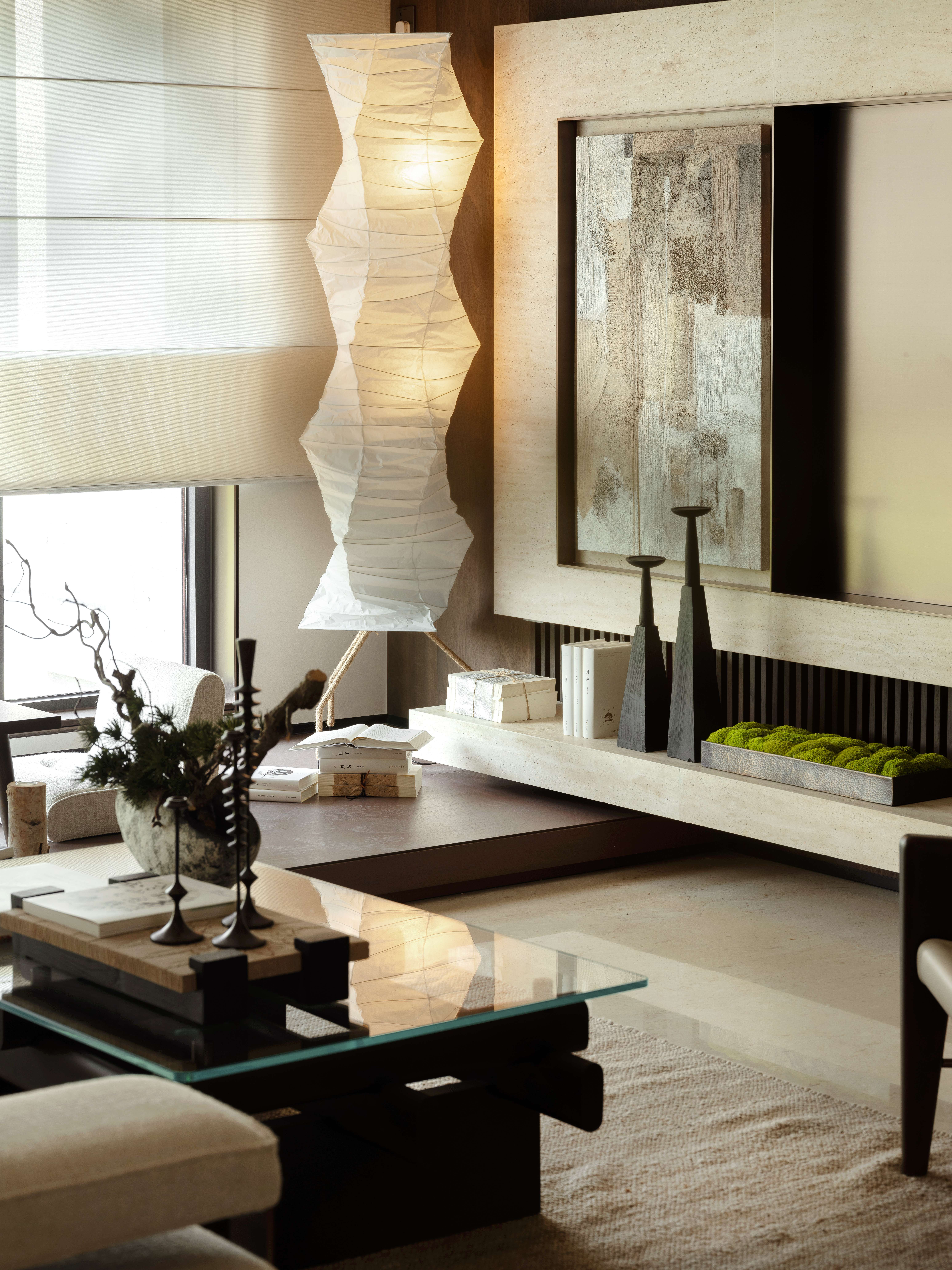 设计选材:选材上以弱化奢华石材为背景逻辑,用温润的莱姆石作为主材铺设场景,弱化视野边界感,从而带来更轻缓放松的居住氛围感受。
