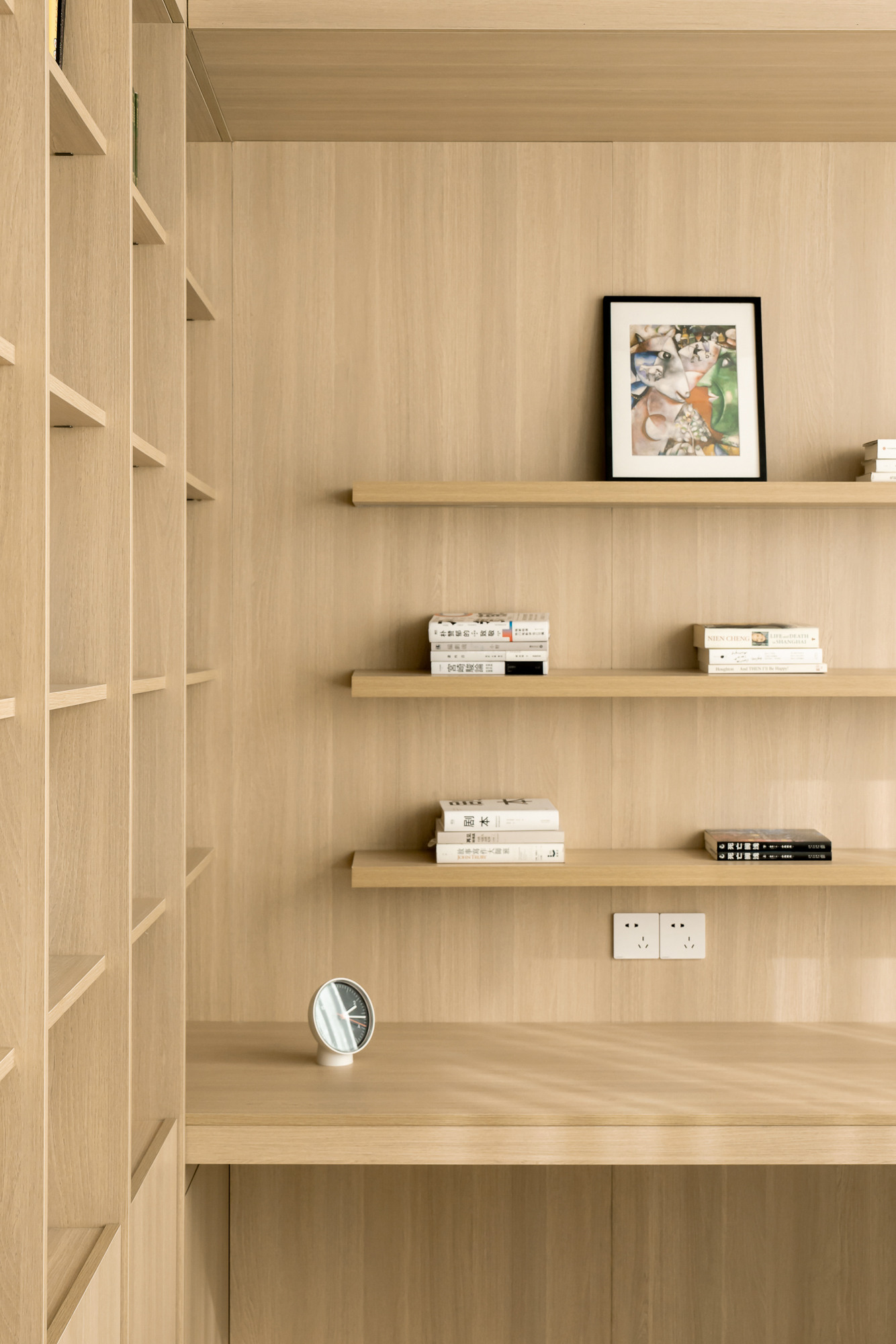 空间意境:南向是通透的落地窗景,打开后的空间将光线和城市景观全部纳入室内,我们在兼顾松弛感与工作需求的前提下,削弱了公寓场景功能的边界感,将其打造成一个可以随意切换使用模式的自由空间,期望公寓主人可以在办公与居住之间的切换中游刃有余。通过嵌入一面收纳书架来划分功能场景,使原本的空间秩序在推拉之间得到重组,生活与办公的边界既能完全相融也能被明确分隔,不仅提供了偶得趣意的空间体验,同时也为生活留出了更多塑造美的可能。