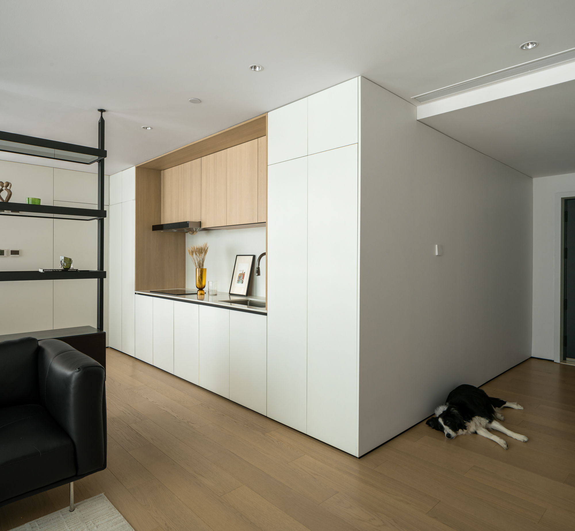 空间布局:城市中的边界感给人以自有的约束,而在家里,多场景的区域互动当具有互动的趣味感,整个空间的规划从一开始就从整体性和交互性作思考,结合建筑本身的采光优势和高层景观,通透的视野让整个场域有了比实际面积更大的感官体验,进一步丰富了使用者的居住体验。玄关与厨房选择使用了少量的金属材质,在突出功能划分的同时,保证整体的克制感受。书房拥有大型的储物空间,满足导演在电影制作期间所需的各种物品和设备的存放需求。这些储物空间被巧妙地隐藏在墙壁、柜子和抽屉之中,确保了整个公寓的整洁和有序。无论是摄影器材、剧本、道具还是后期剪辑所需的设备,都可以轻松地找到并取用。