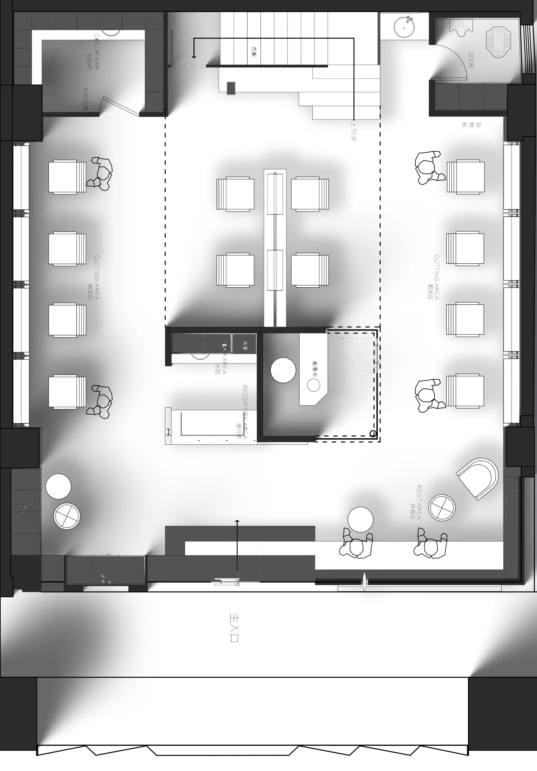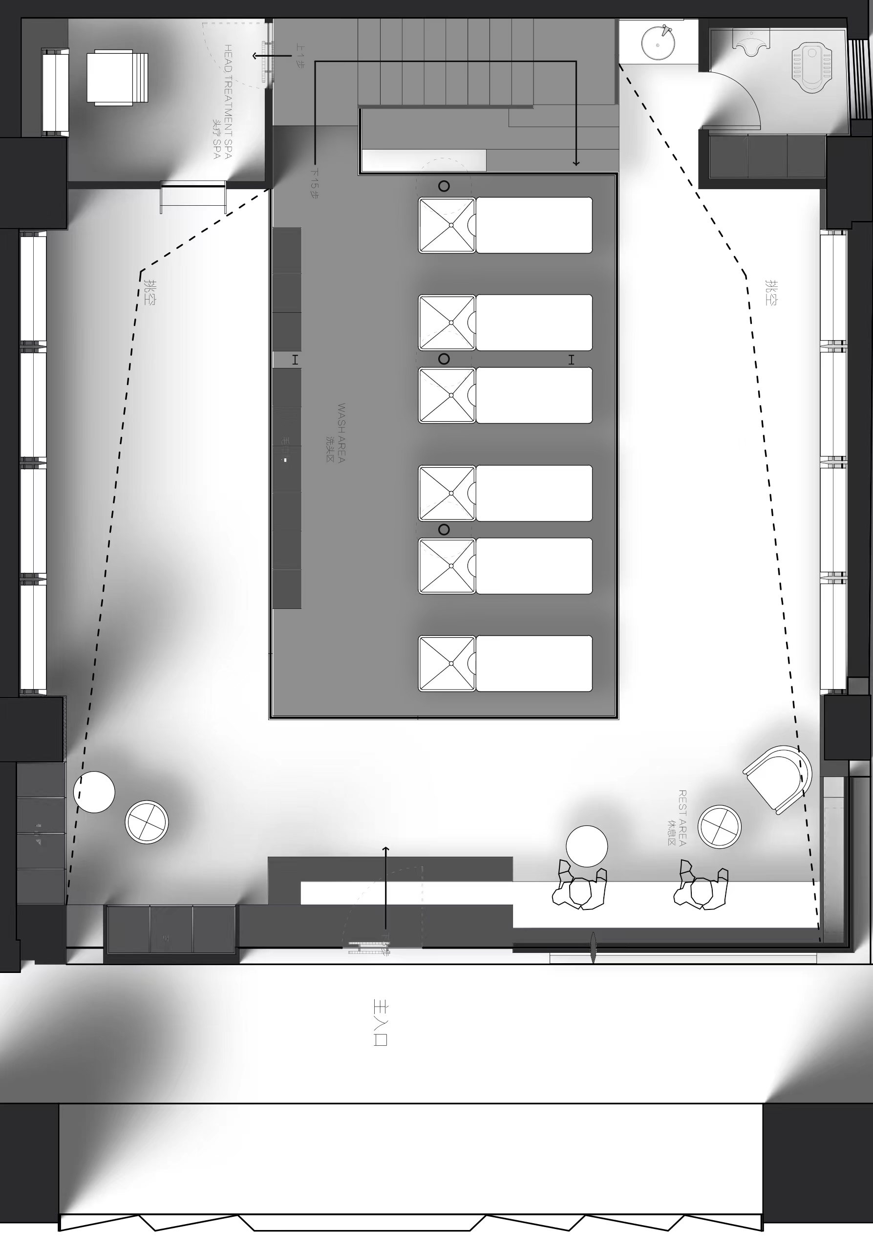 悬挑的洗护区,三面镂空的设计,解放了空间压抑之感,形成了空间的层次,产生了空间自上而下,从左到右,从前到后的自然对话。 -