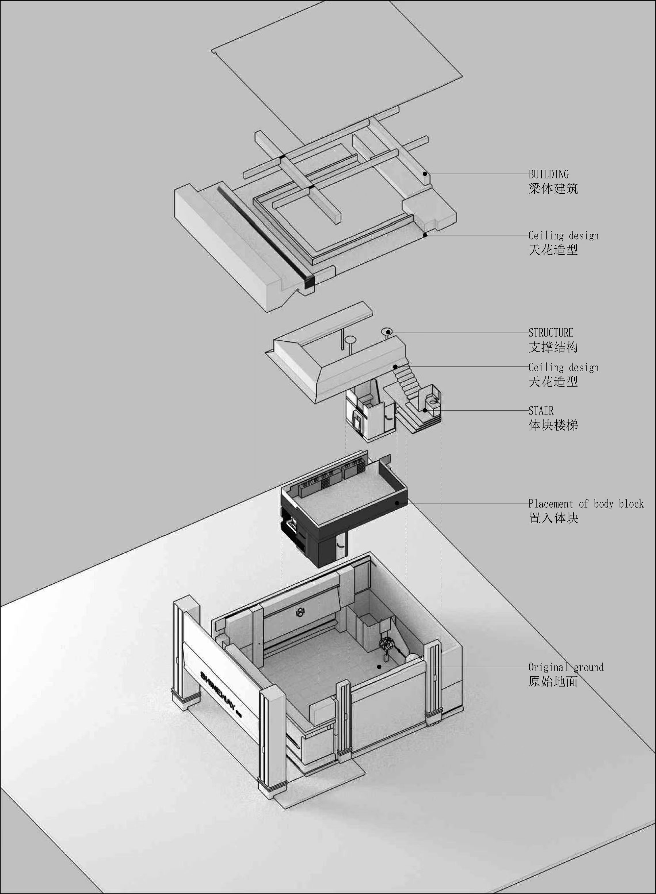 空间布局:空间不该以一种居高临下的姿态存在,尊重体验者真实的感受,才是展示空间的核心。各功能区域间的视觉互通而又不相互干扰才是品牌空间的具象呈现,独立的建筑体块,斜切的屋檐无形中产生空间中的另一空间,我们在达成现代审美的同时更需要超越单一的空间界限,构建出一个充满创意与想象的精神世界。