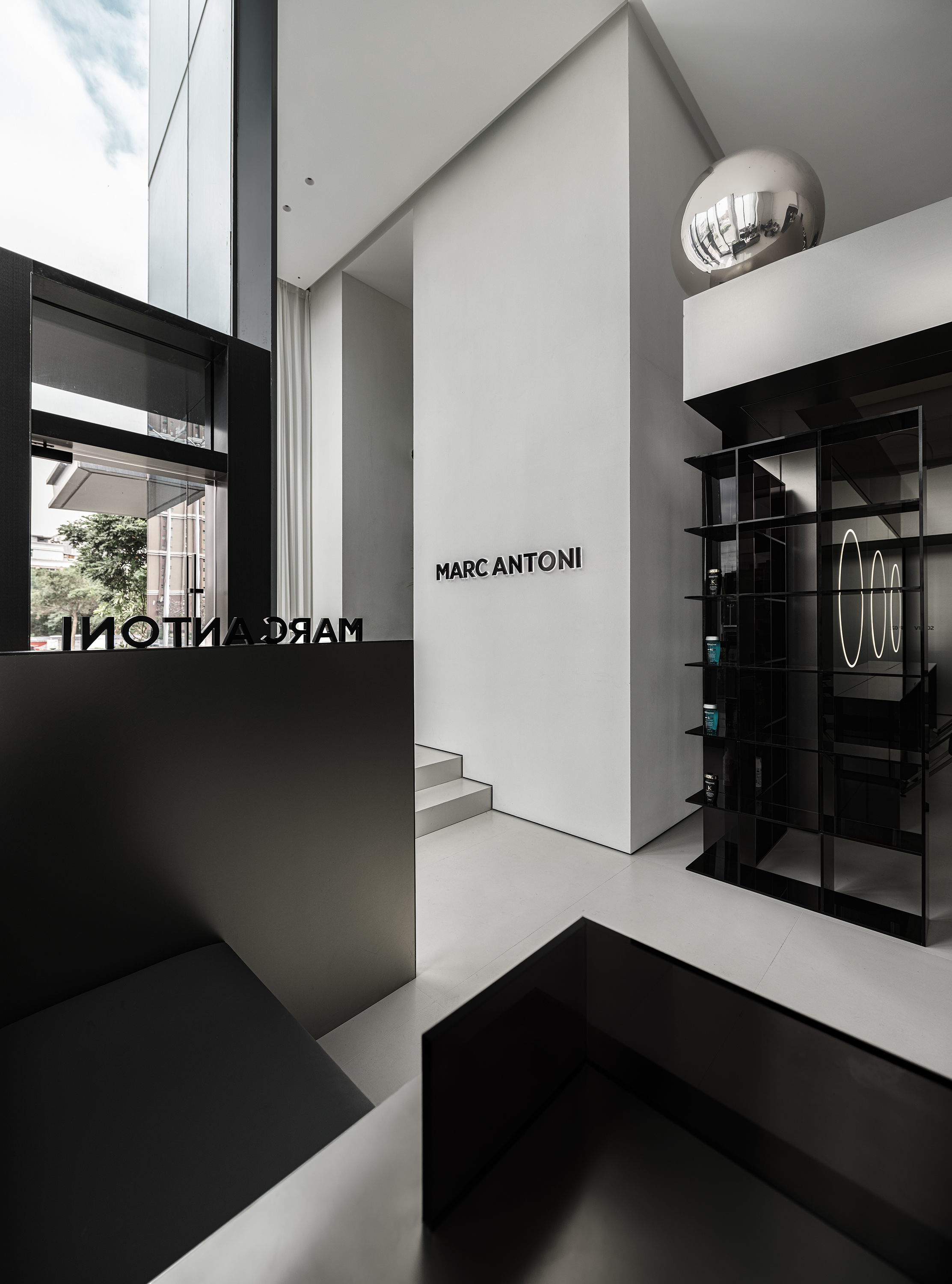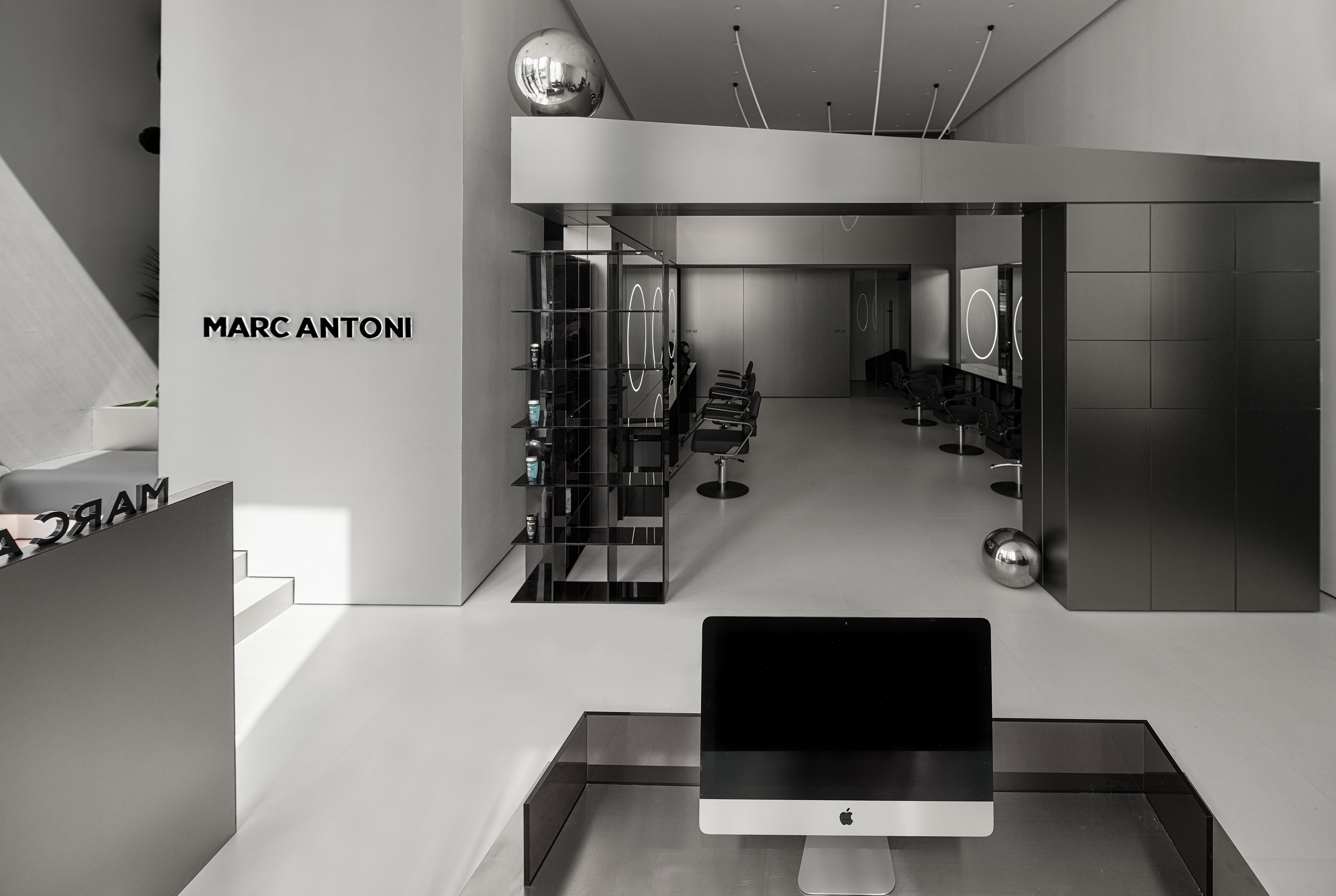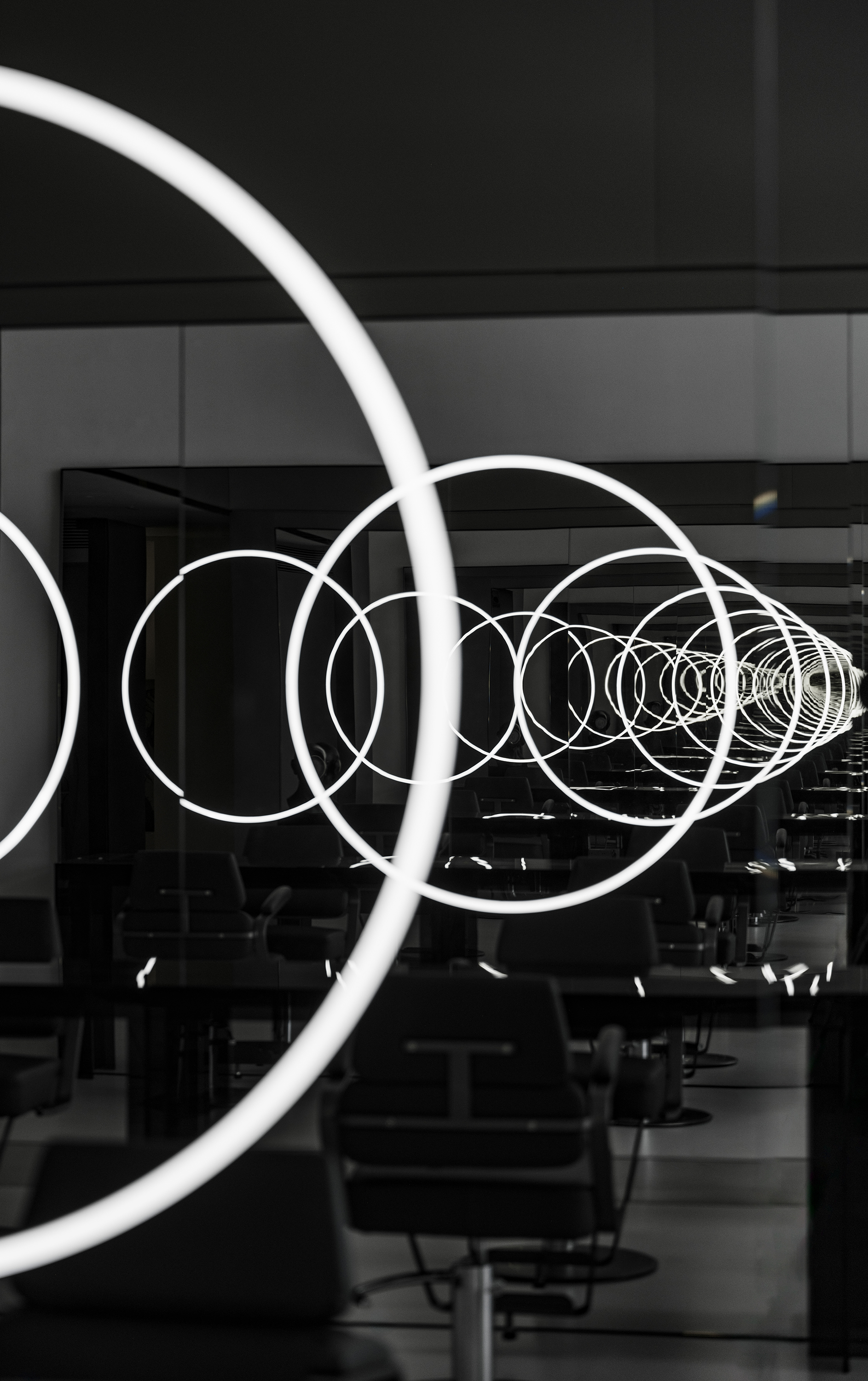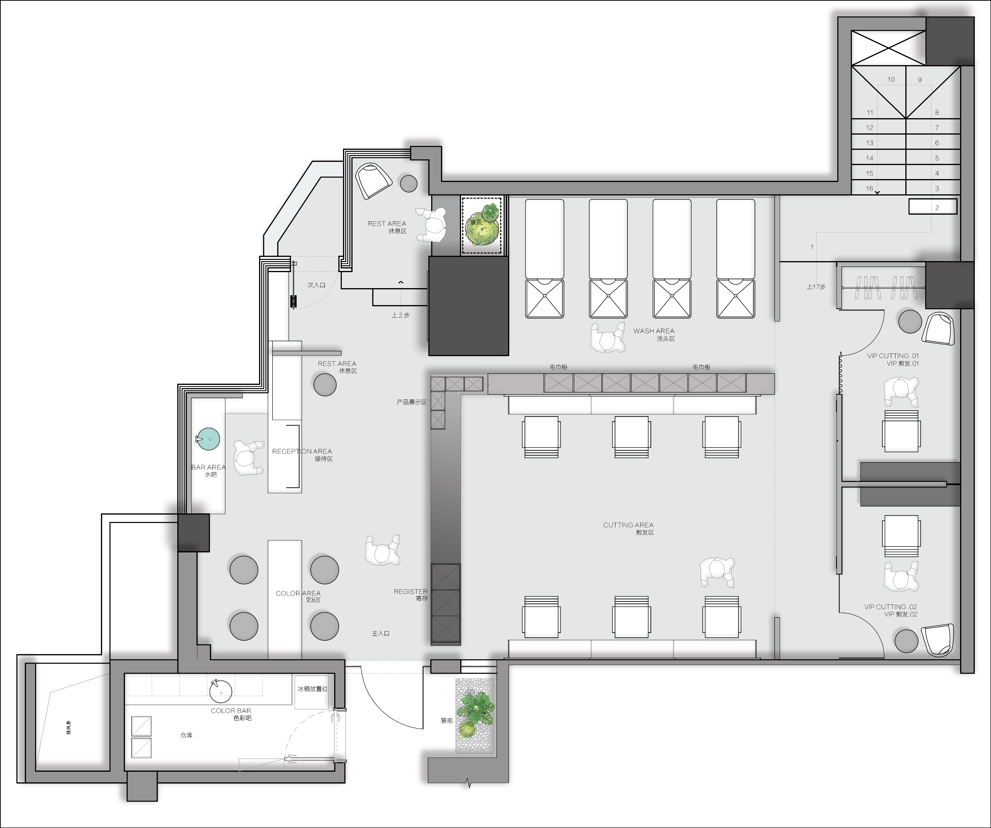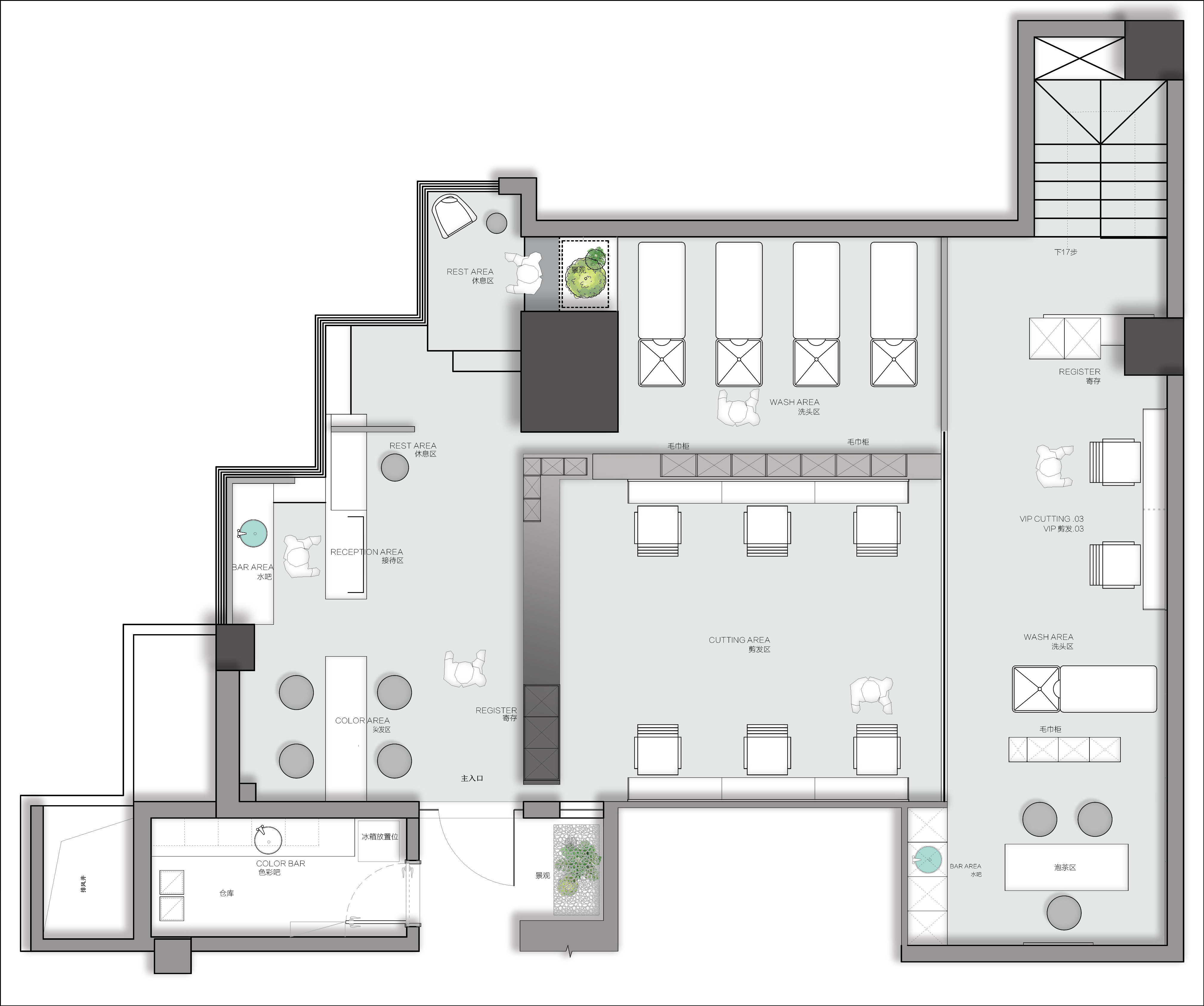 围合是对空间的重新定义具有凝聚、界定、私密等驻足停留空间,同一材质串联起隔楼扶手,剪发区墙面,寄存空间,让空间关联性加强,L型亚克力产品柜的置入,丰富整体的沉闷感。