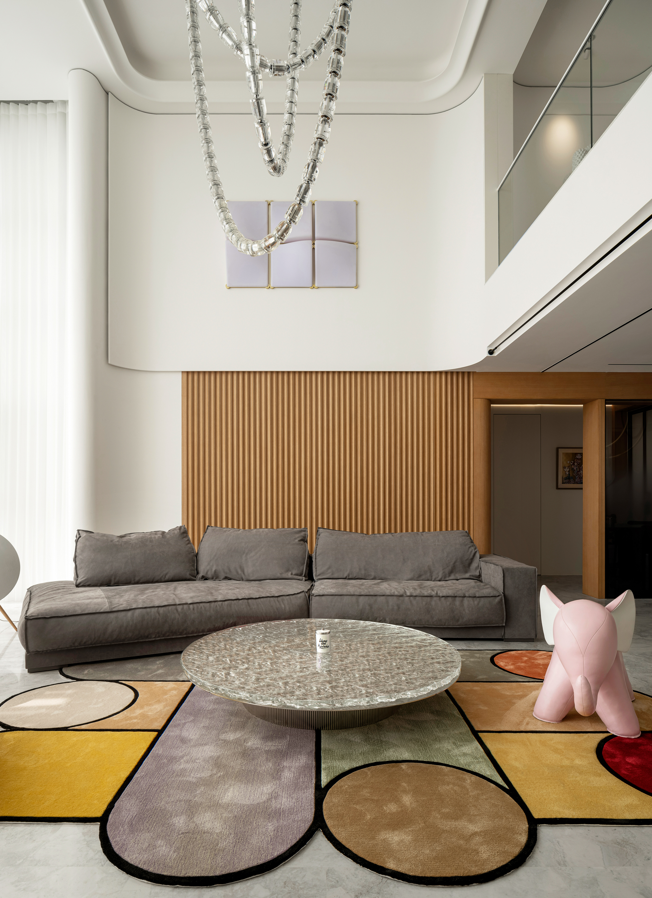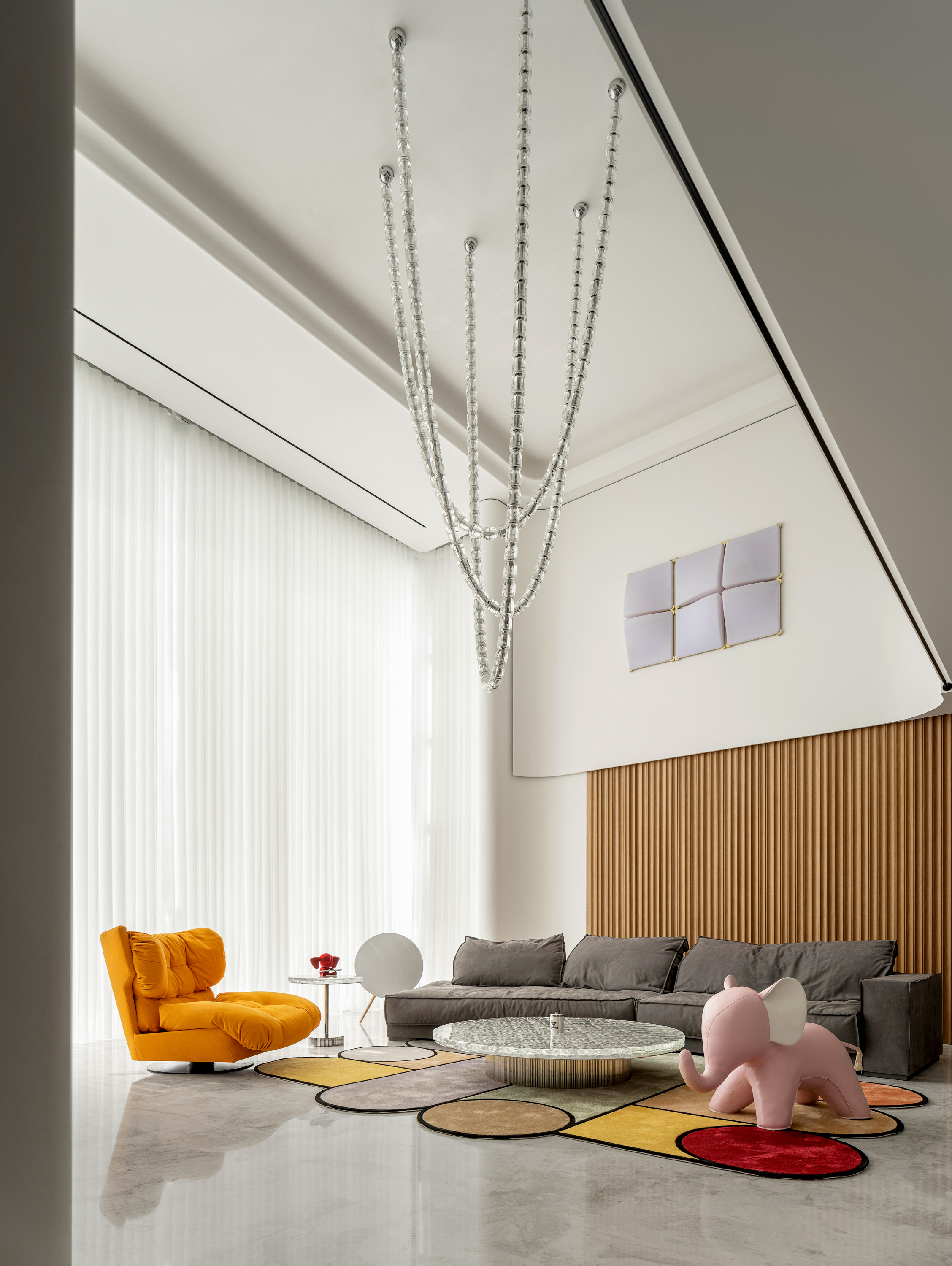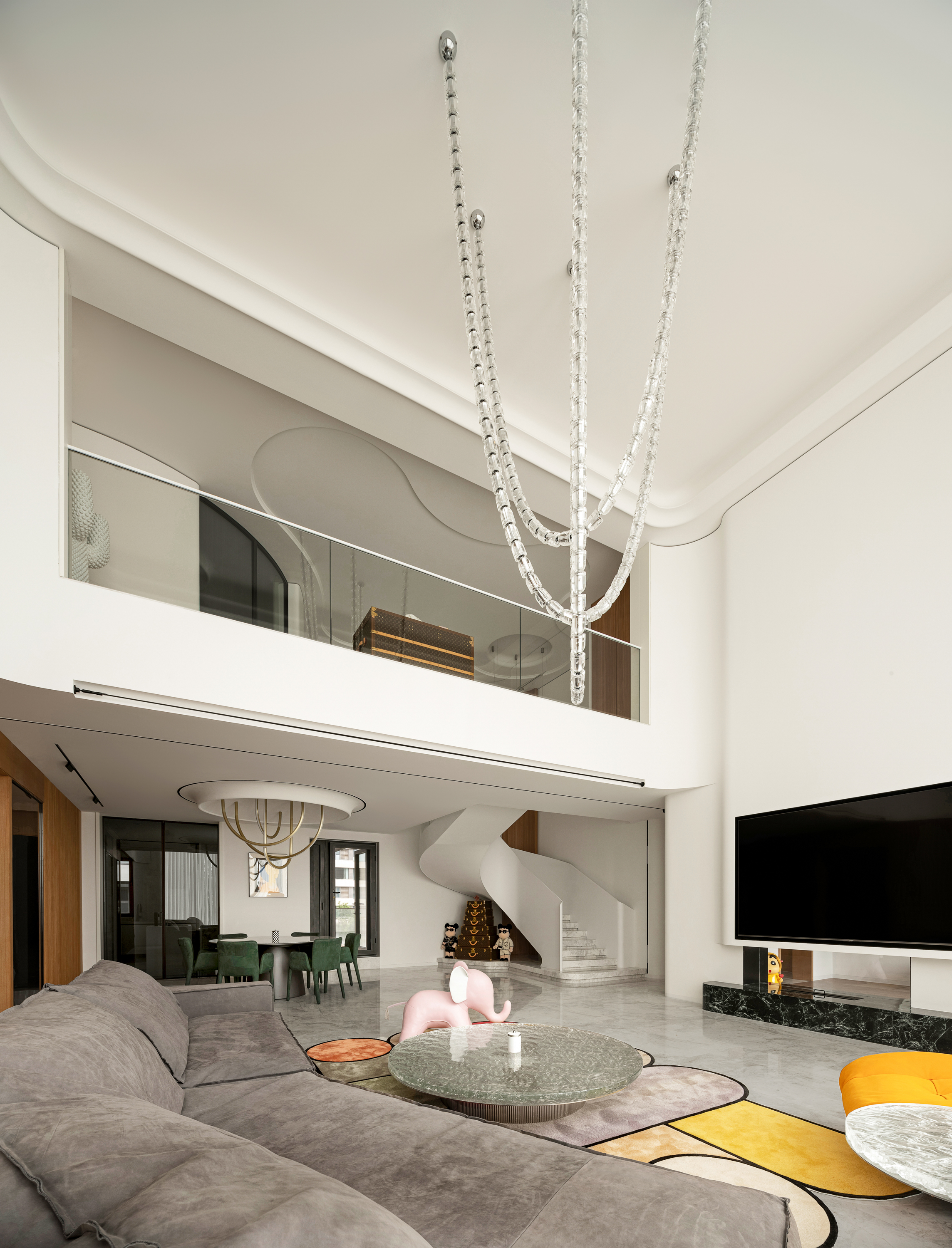 空间布局:观景于家,揽境入家。设计师通过框景的手法,微妙处理建筑轮廓,客厅布局开阔,未设隔断区分各区域,内外界限又很清晰。增强气息流通,以消弭空间界限,实现空气的动线流畅。水晶吊灯洒下柔和光芒,挑高的设计,予人一眼忘尽的通透与大气感。