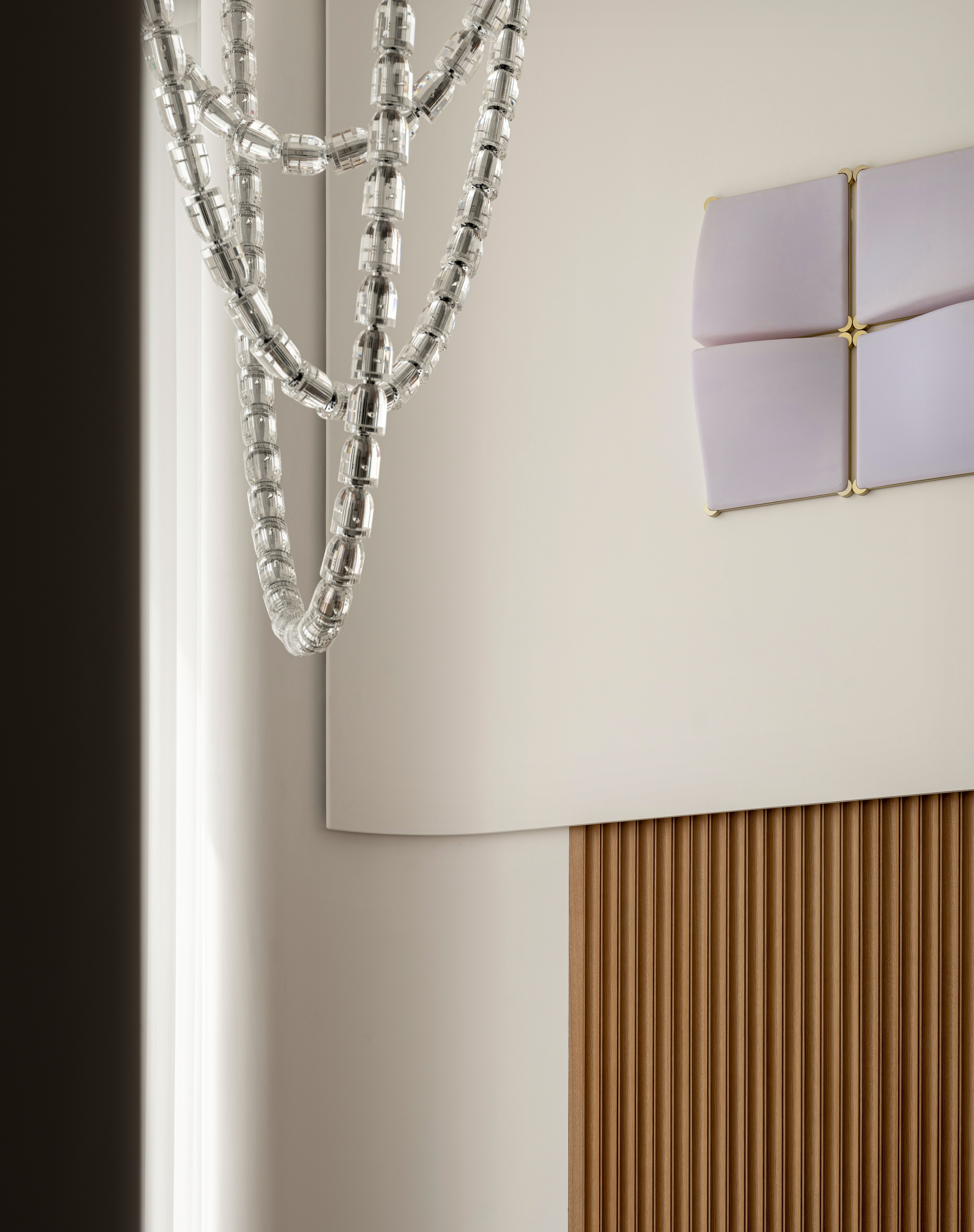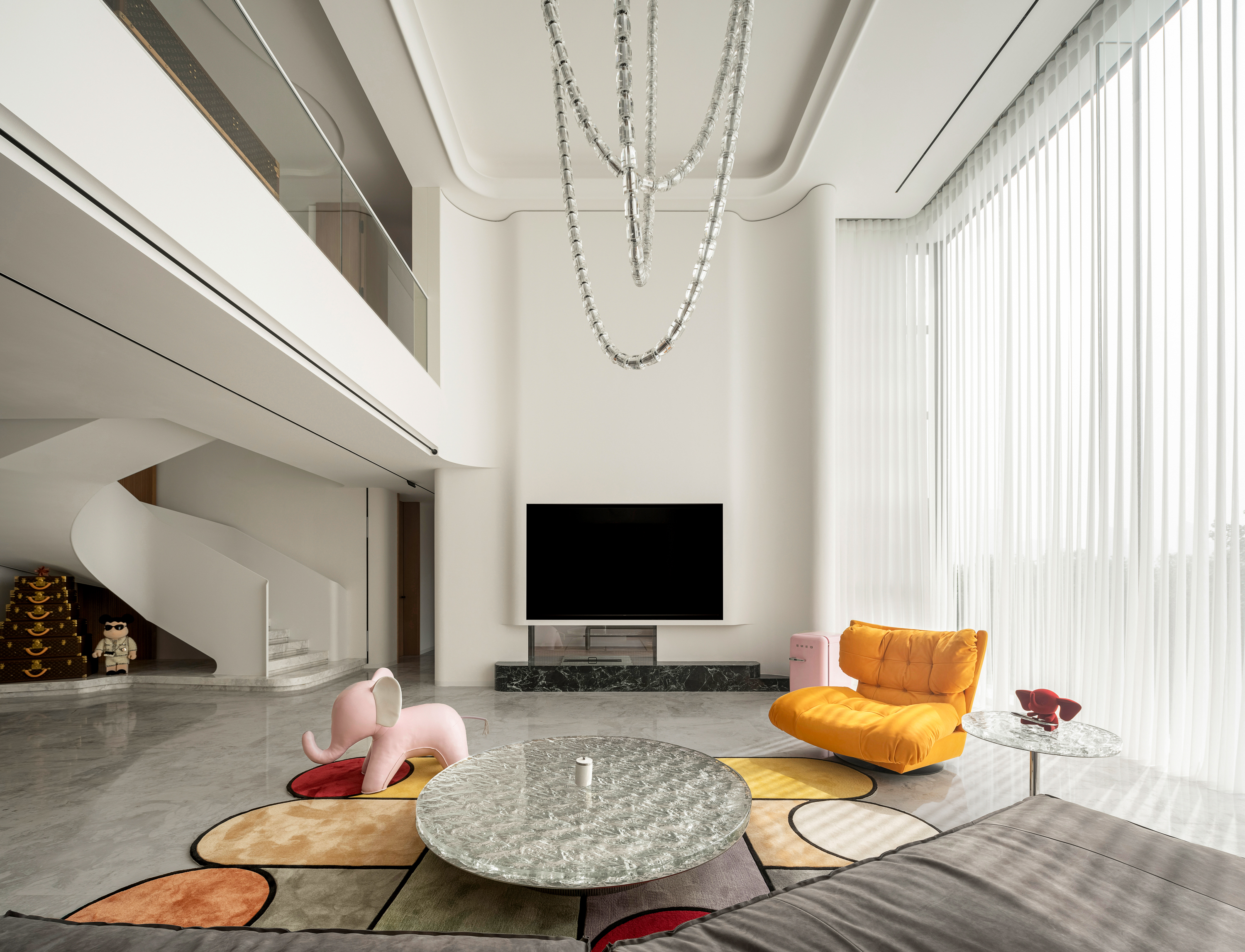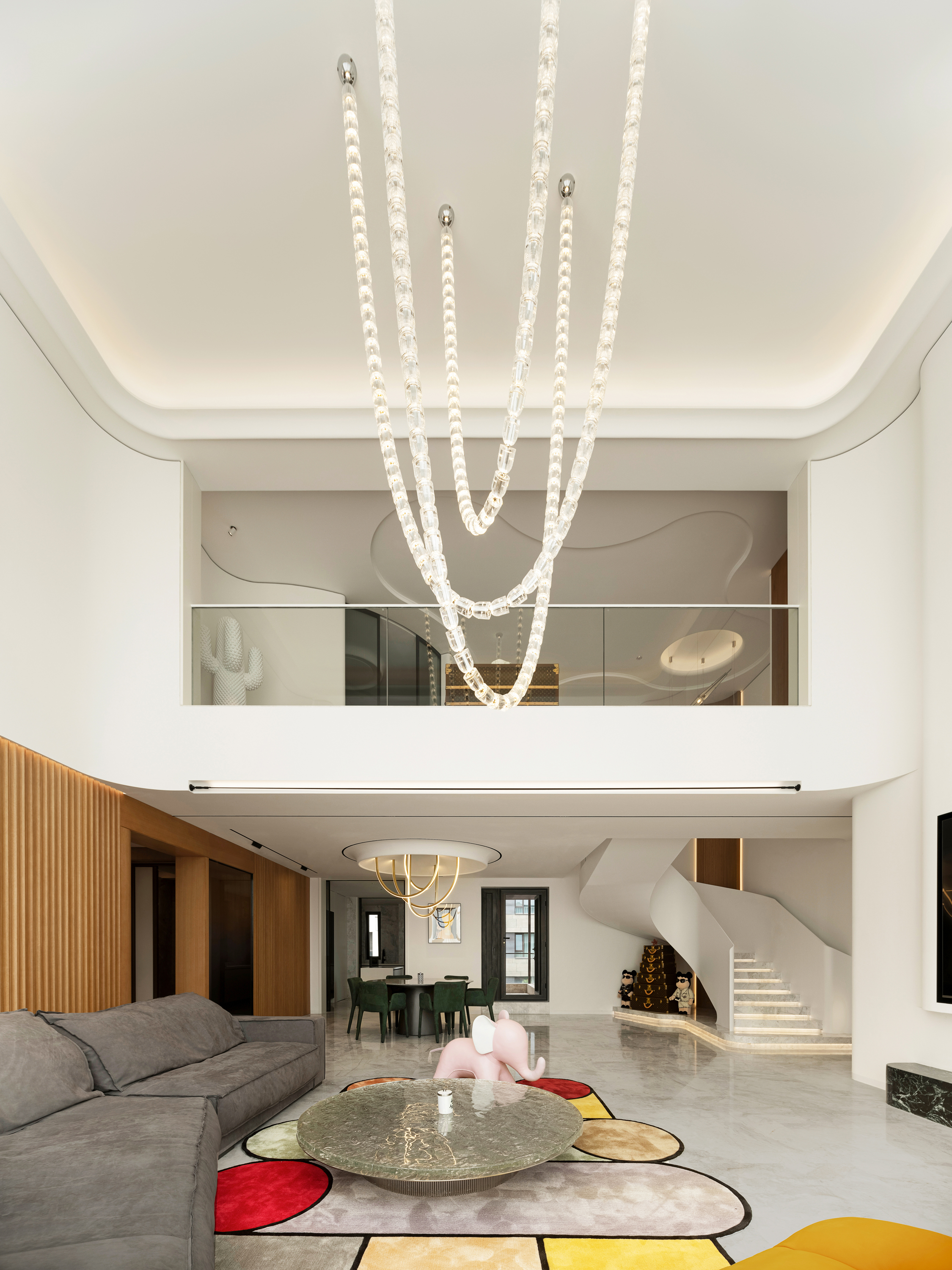 空间布局:观景于家,揽境入家。设计师通过框景的手法,微妙处理建筑轮廓,客厅布局开阔,未设隔断区分各区域,内外界限又很清晰。增强气息流通,以消弭空间界限,实现空气的动线流畅。水晶吊灯洒下柔和光芒,挑高的设计,予人一眼忘尽的通透与大气感。