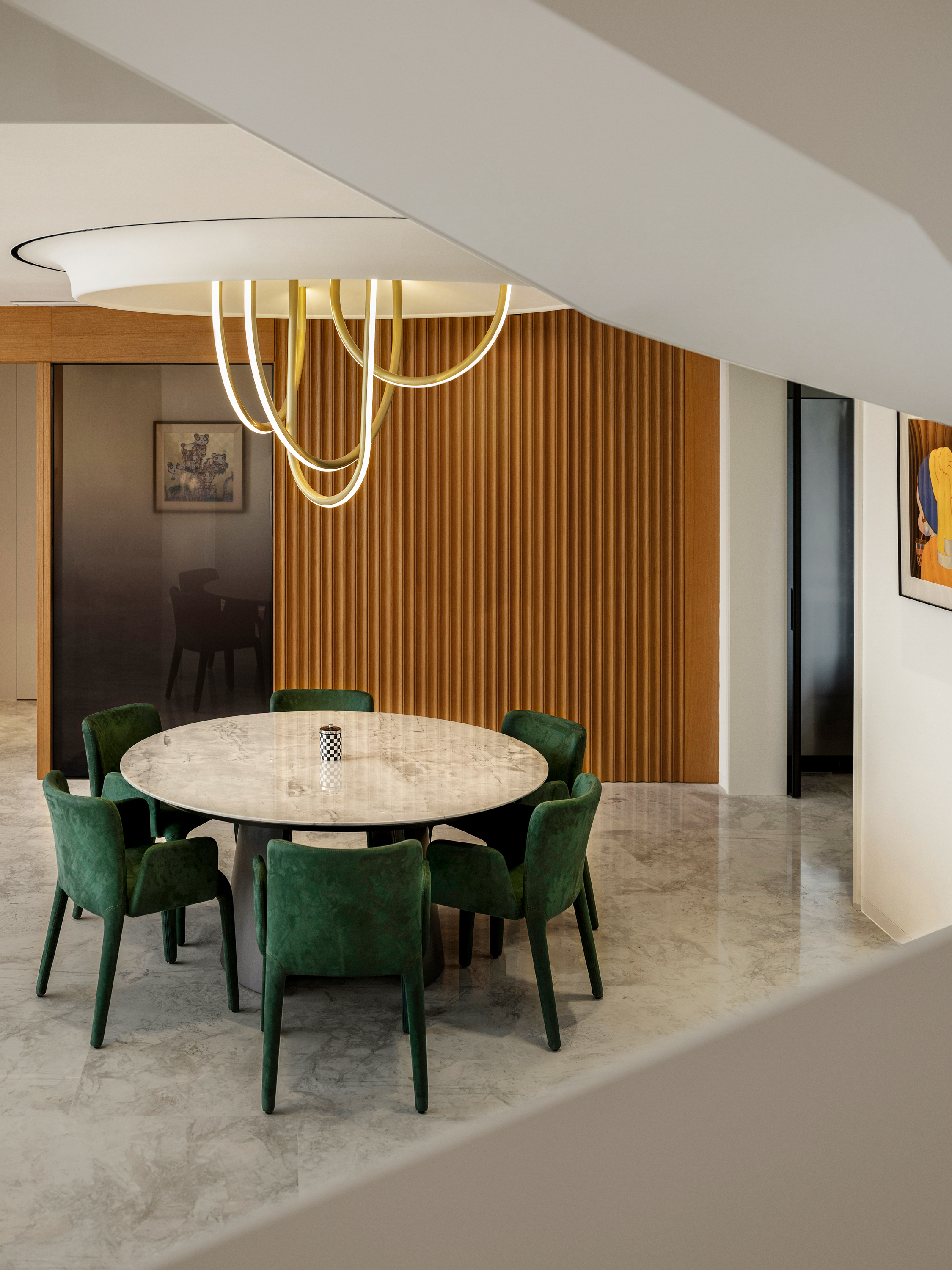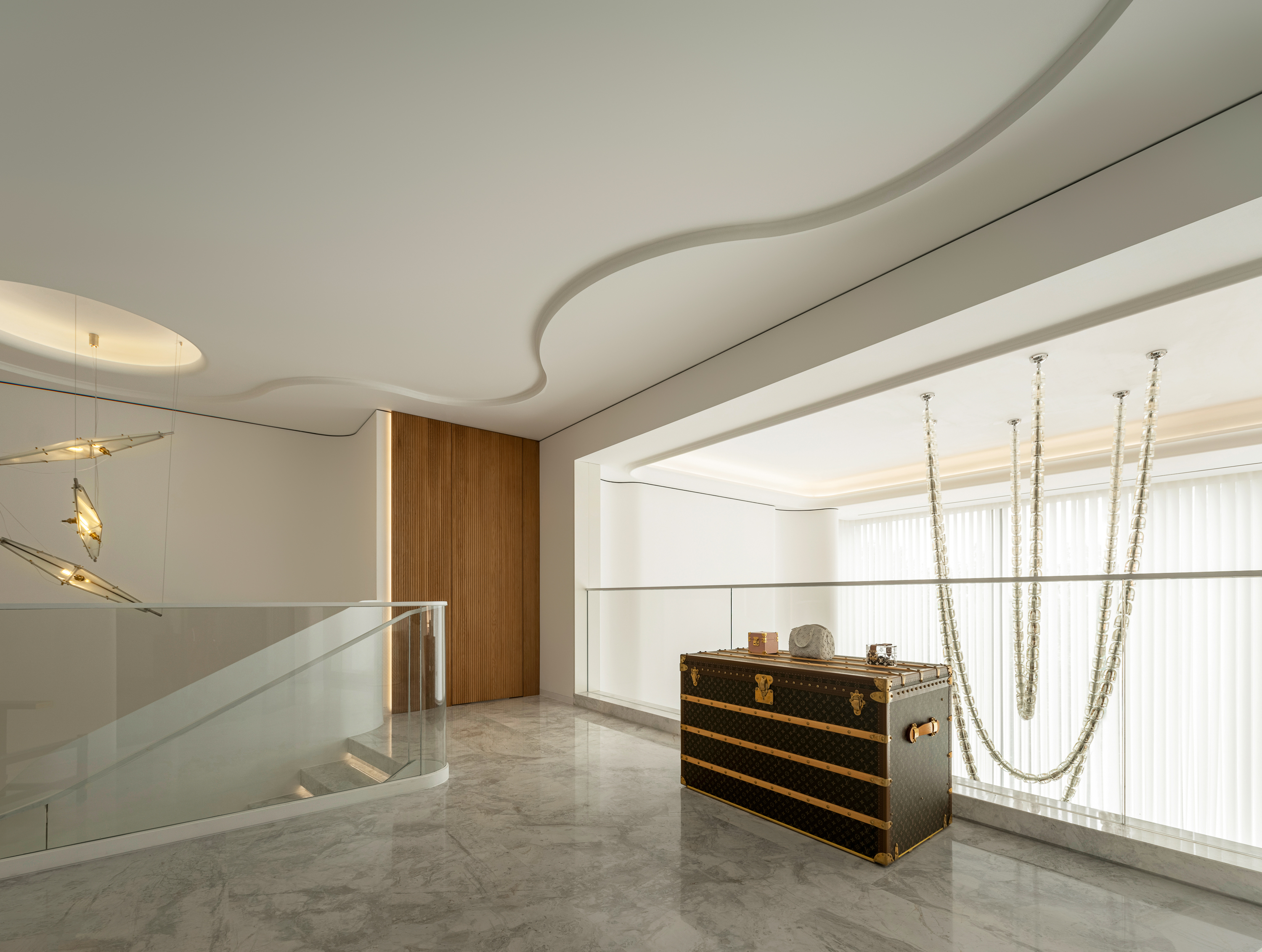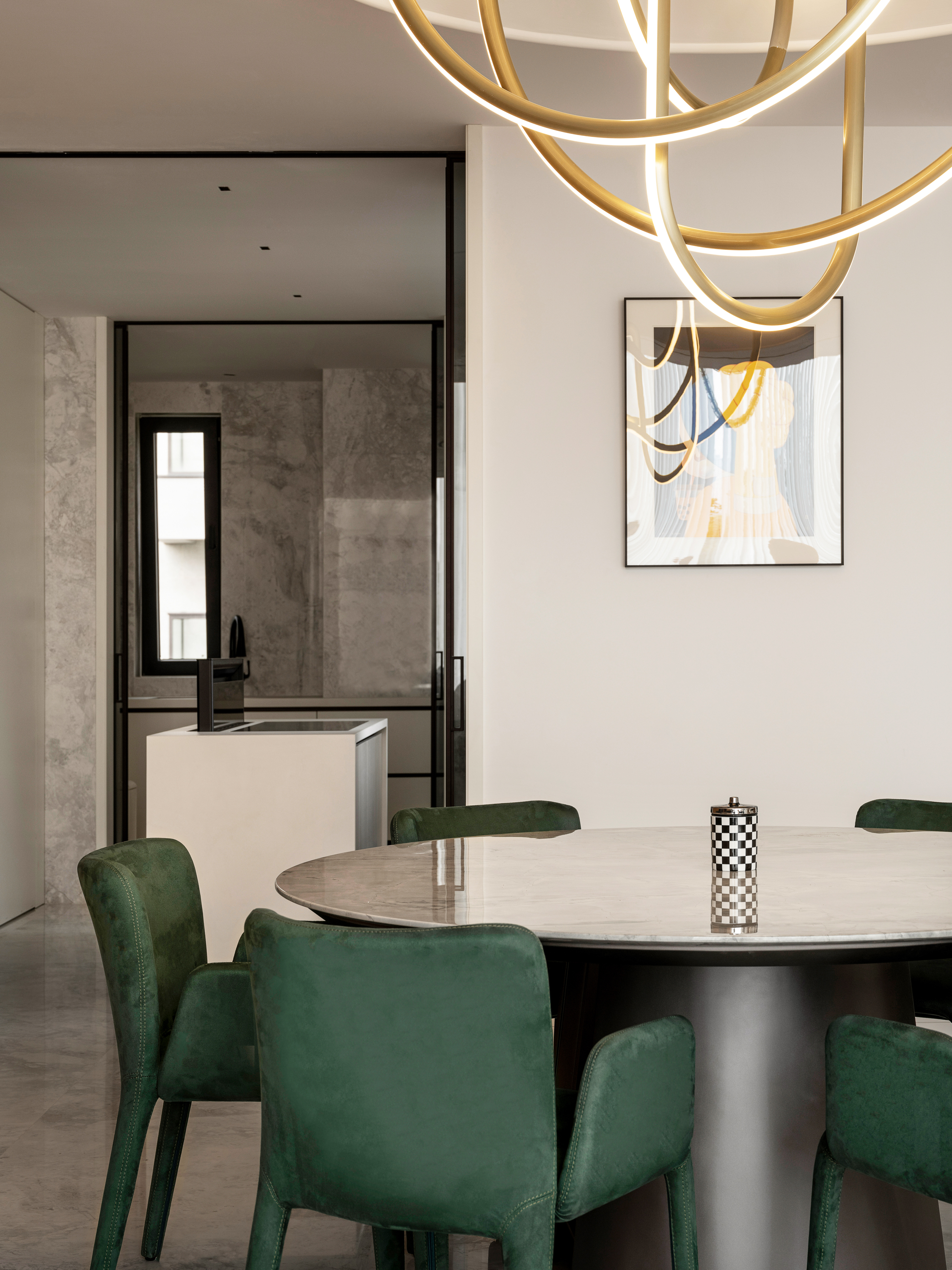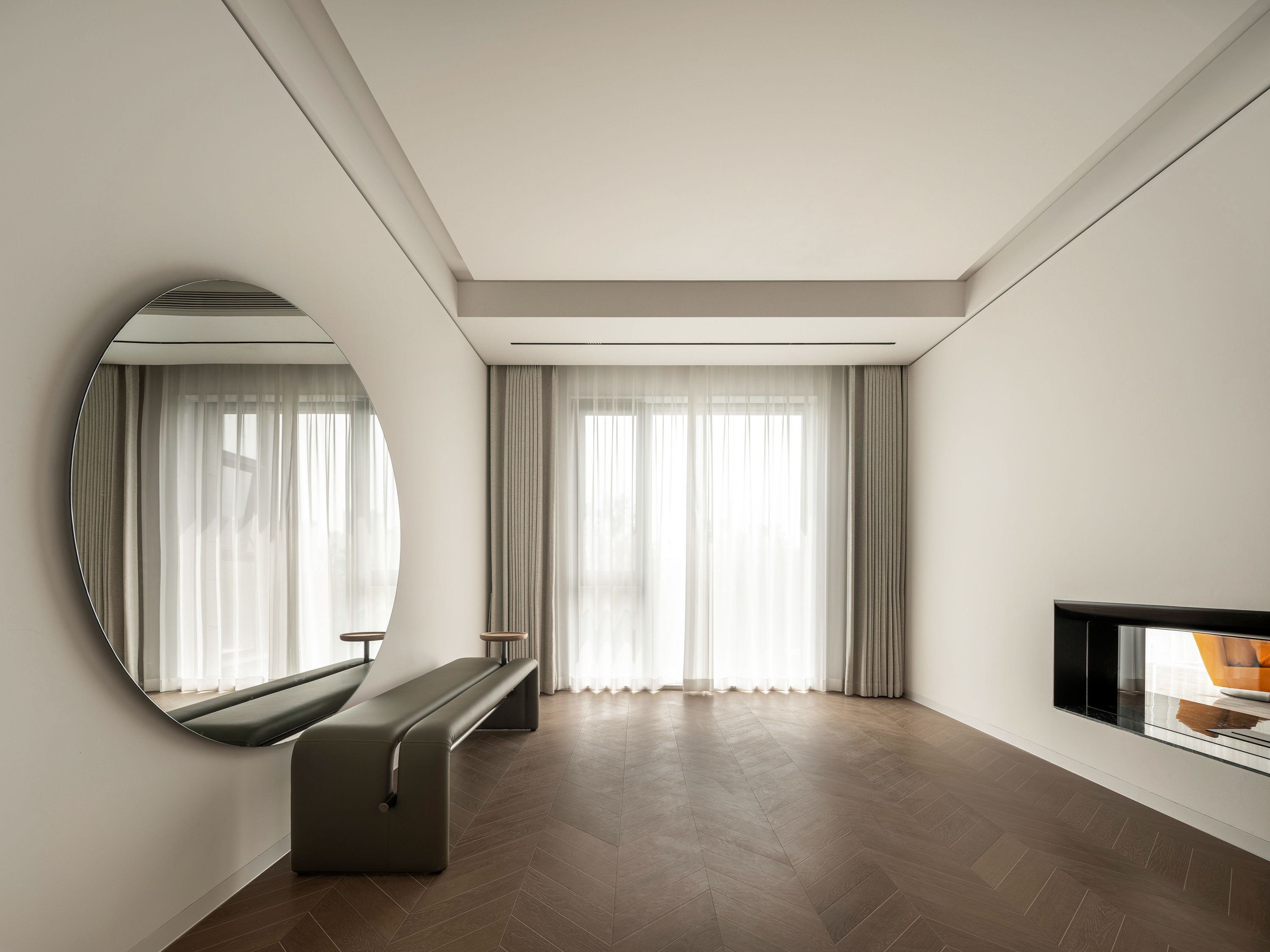 项目定位:顶跃大宅,临河而驻,得天独厚的开阔视野和景色豁然而至。力求达到人在空间中,以家观天下,静泊以致通达的开阔境界。“如何相得益彰地匹配这种极佳的户外持景,是设计的格局需要迎面正视的问题。”设计师王与说道。