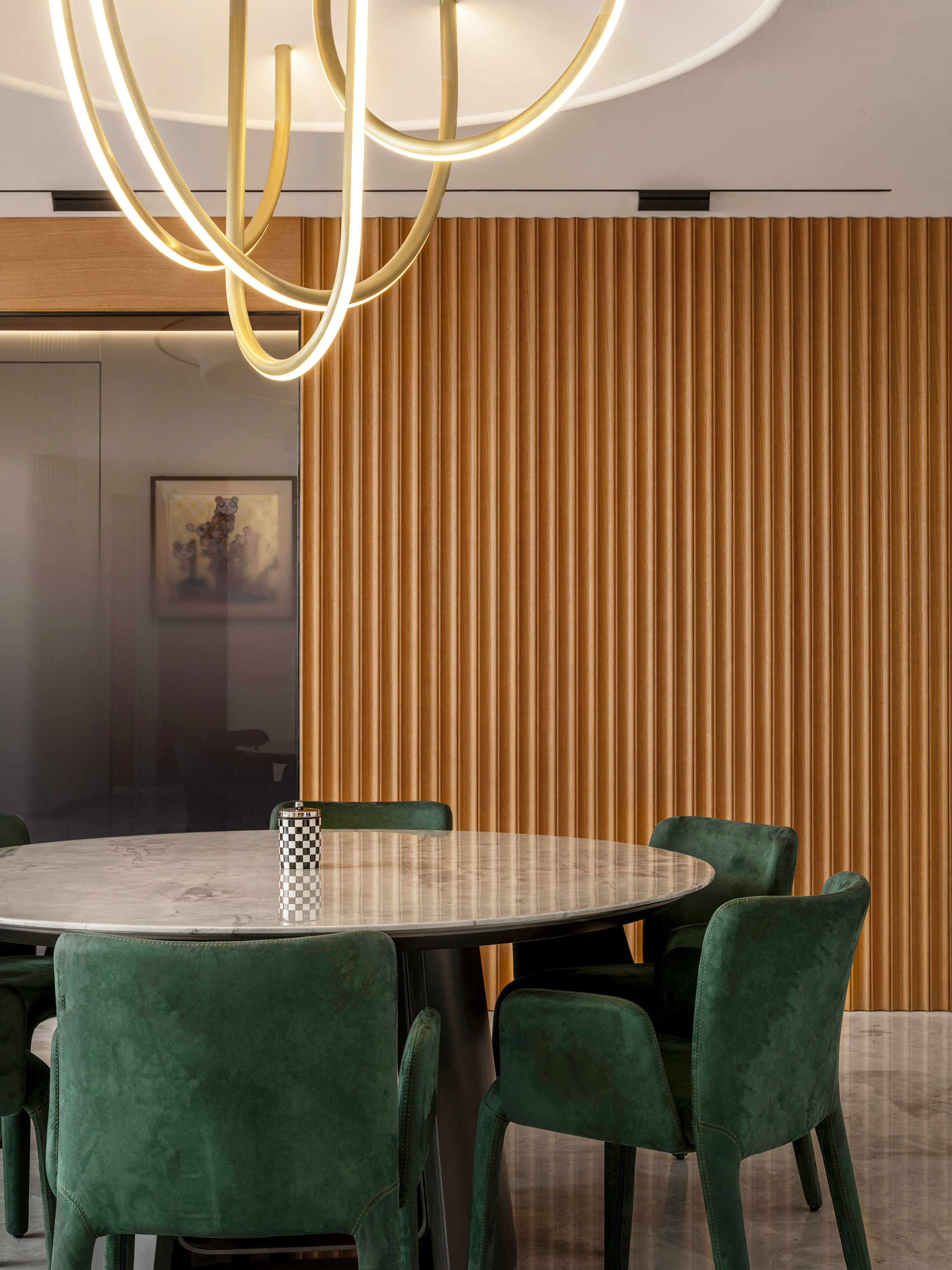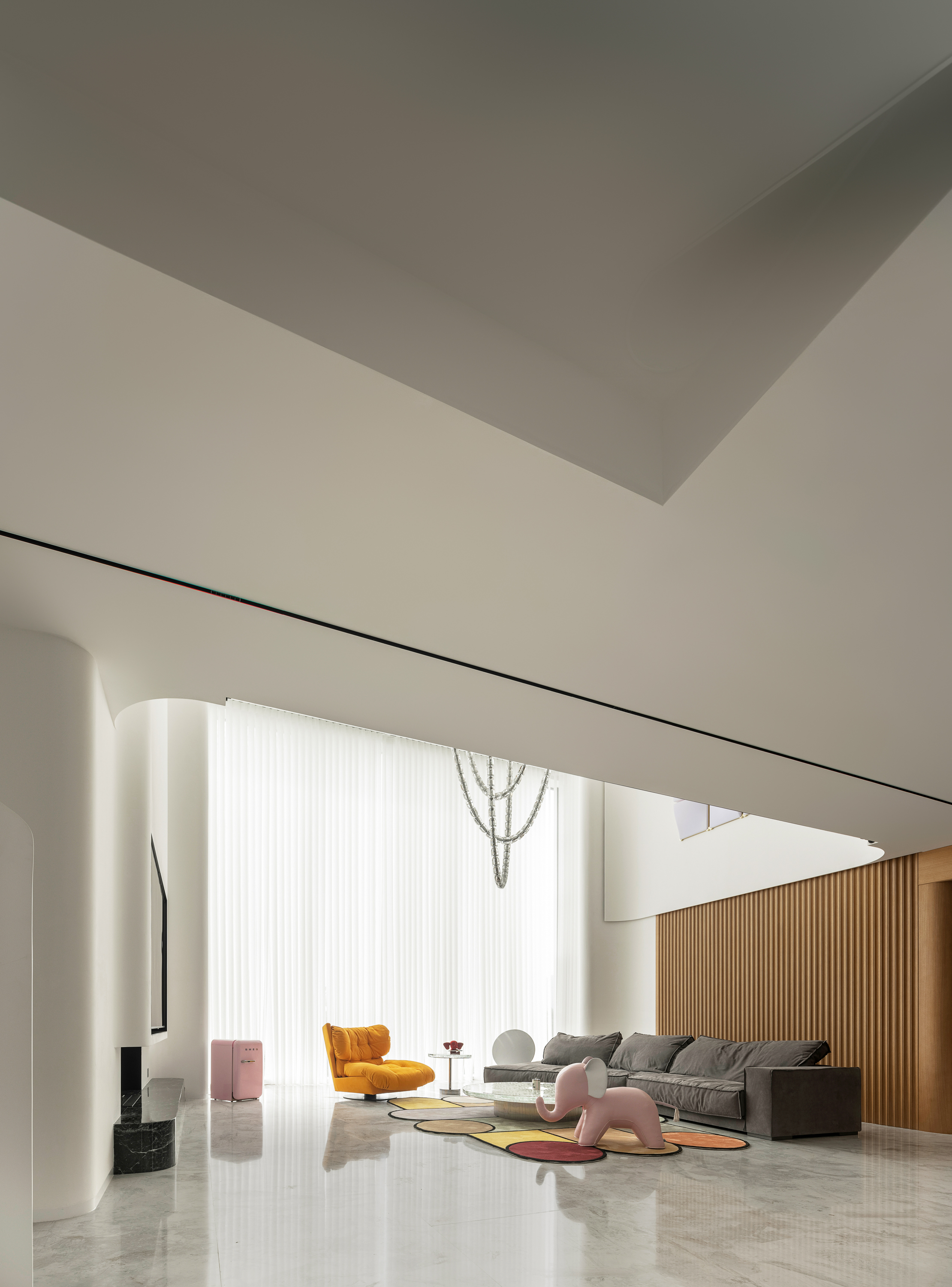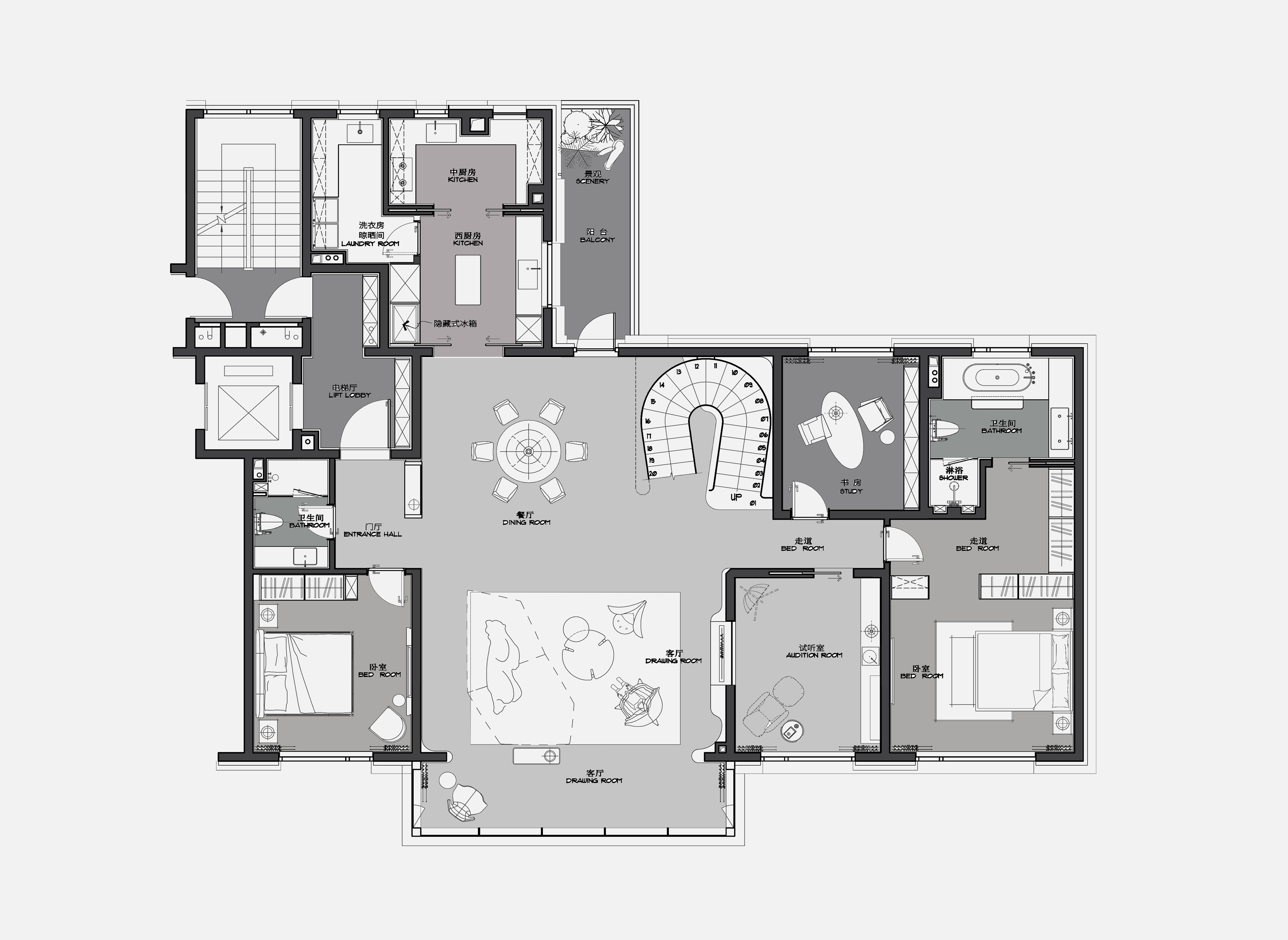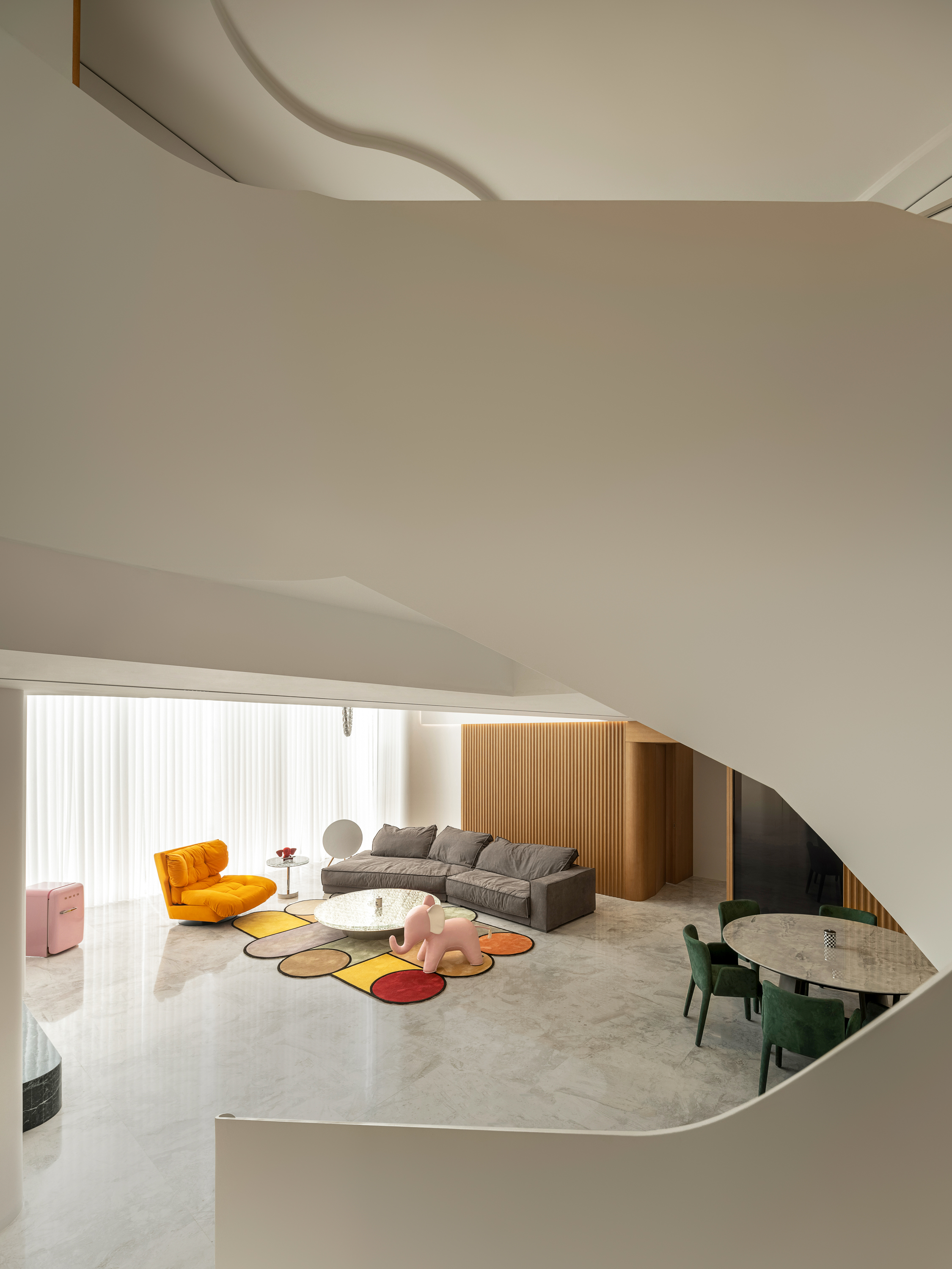 项目定位:顶跃大宅,临河而驻,得天独厚的开阔视野和景色豁然而至。力求达到人在空间中,以家观天下,静泊以致通达的开阔境界。“如何相得益彰地匹配这种极佳的户外持景,是设计的格局需要迎面正视的问题。”设计师王与说道。