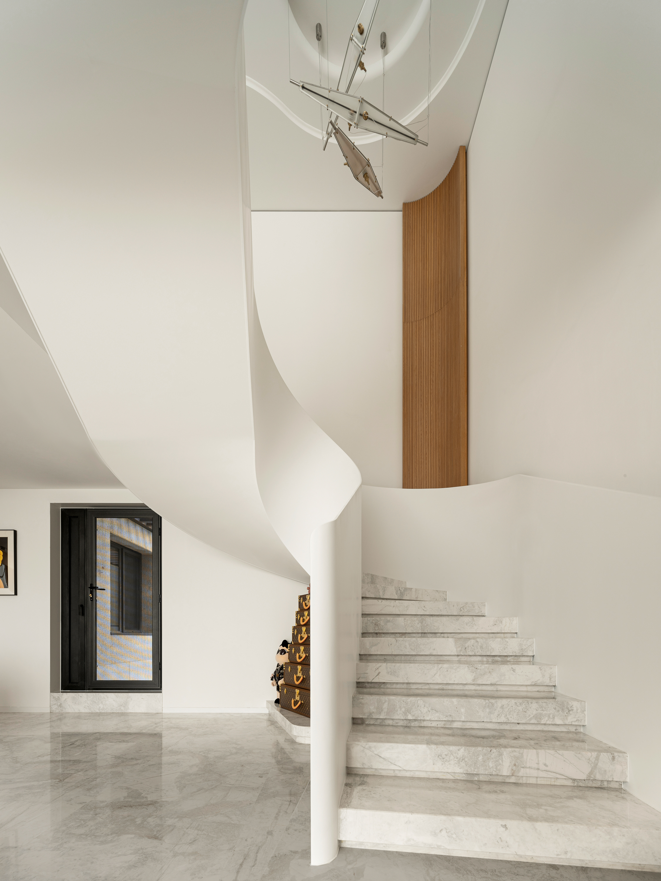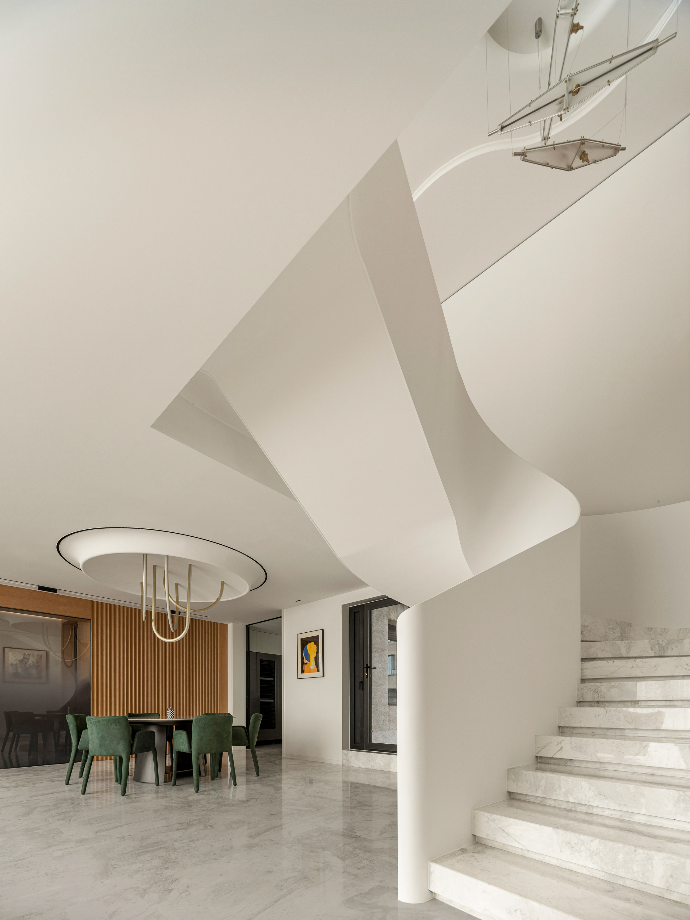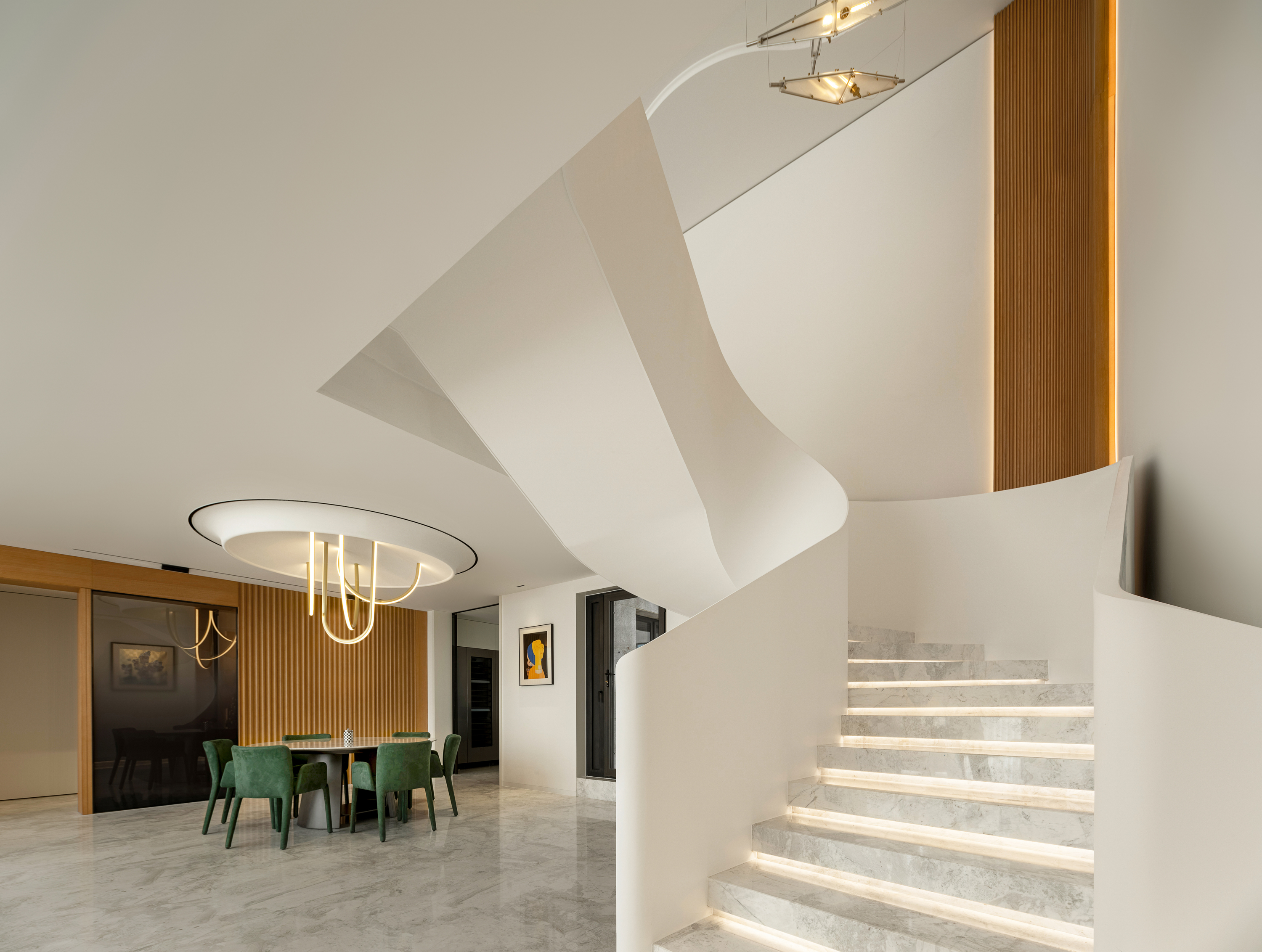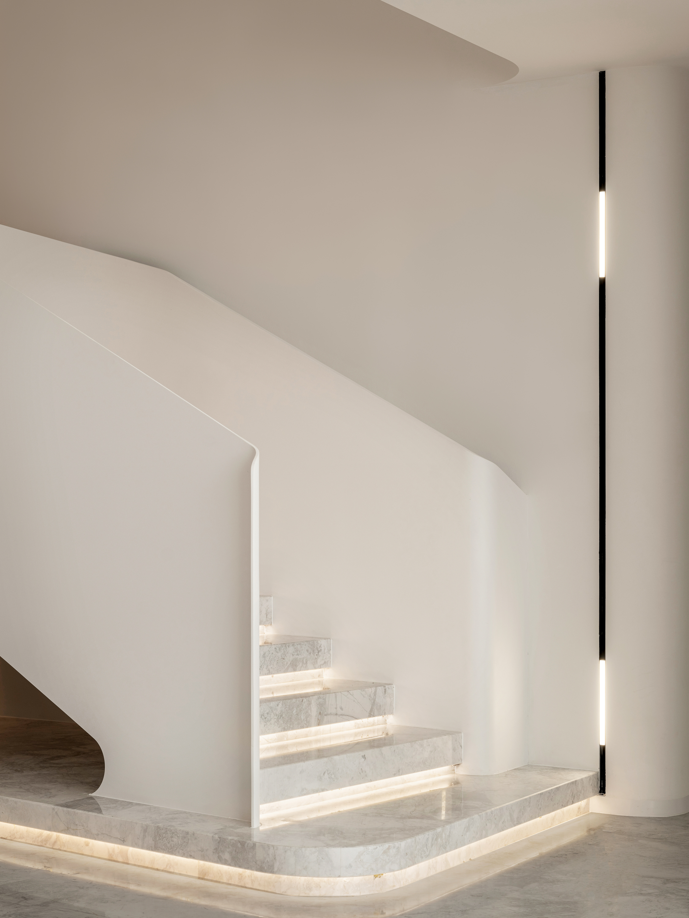 设计选材:楼梯 也可以是空间中的装置艺术品,楼梯设计上设计师也是花了很大的心思。它是空间中的雕塑,融入环保理念。纯白色面板、无边扶手、温润理石踏步,灯光逐阶梯而上,以强大的艺术张力瞬间抓住视线,为空间增添了灵动意境,又真正做到了不占用一丝多余的空间。自带丝丝清冷,又显露淡淡柔和,轻描淡写的质感中却不容忽视。