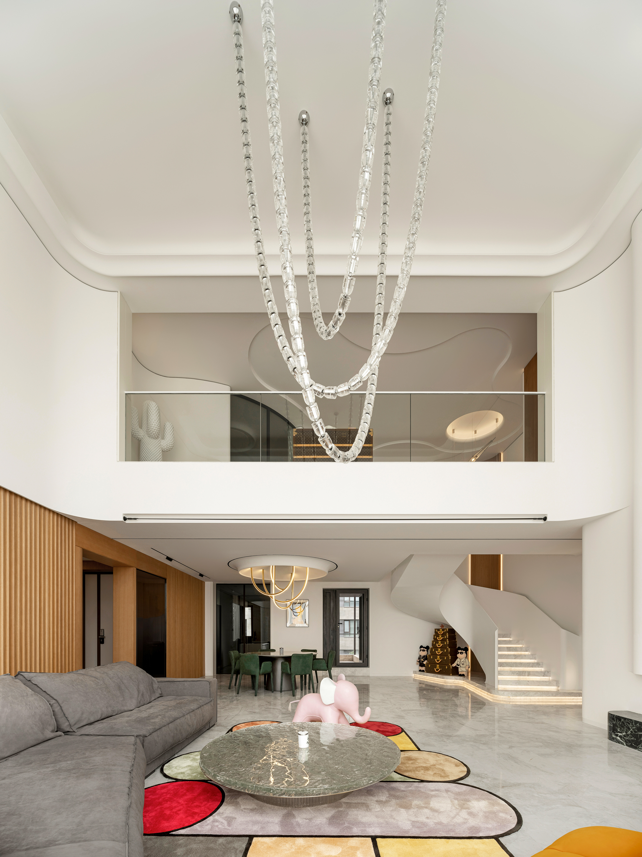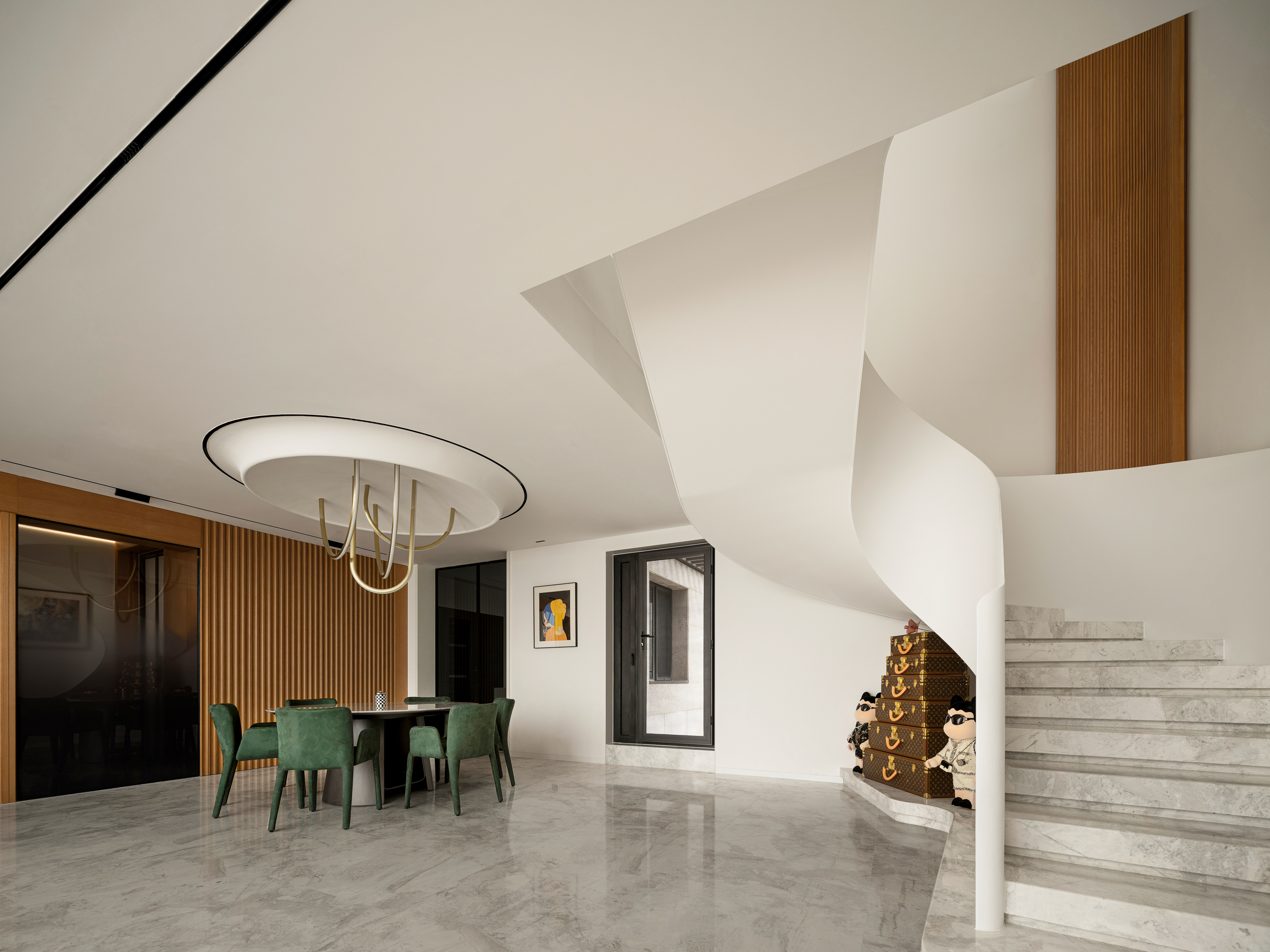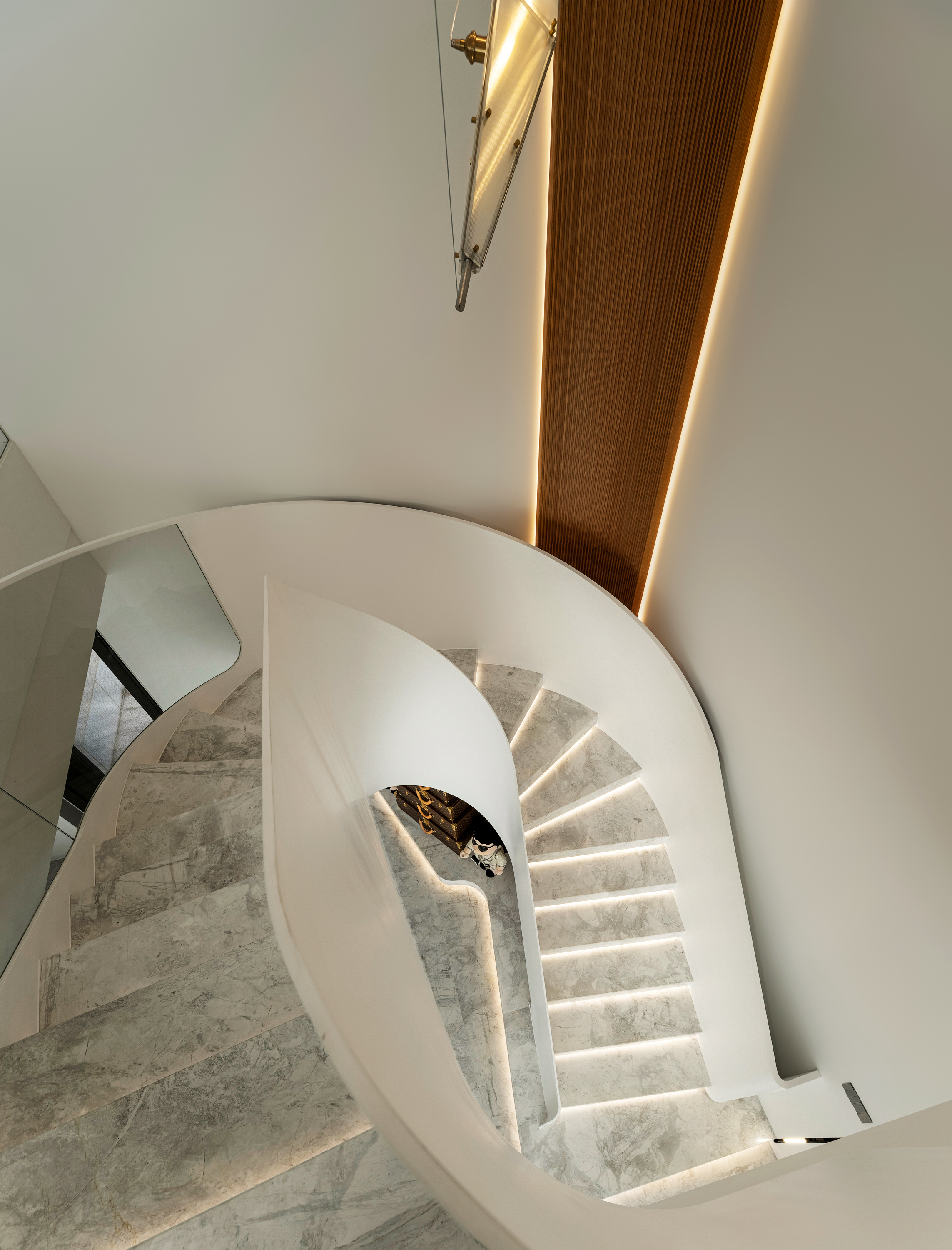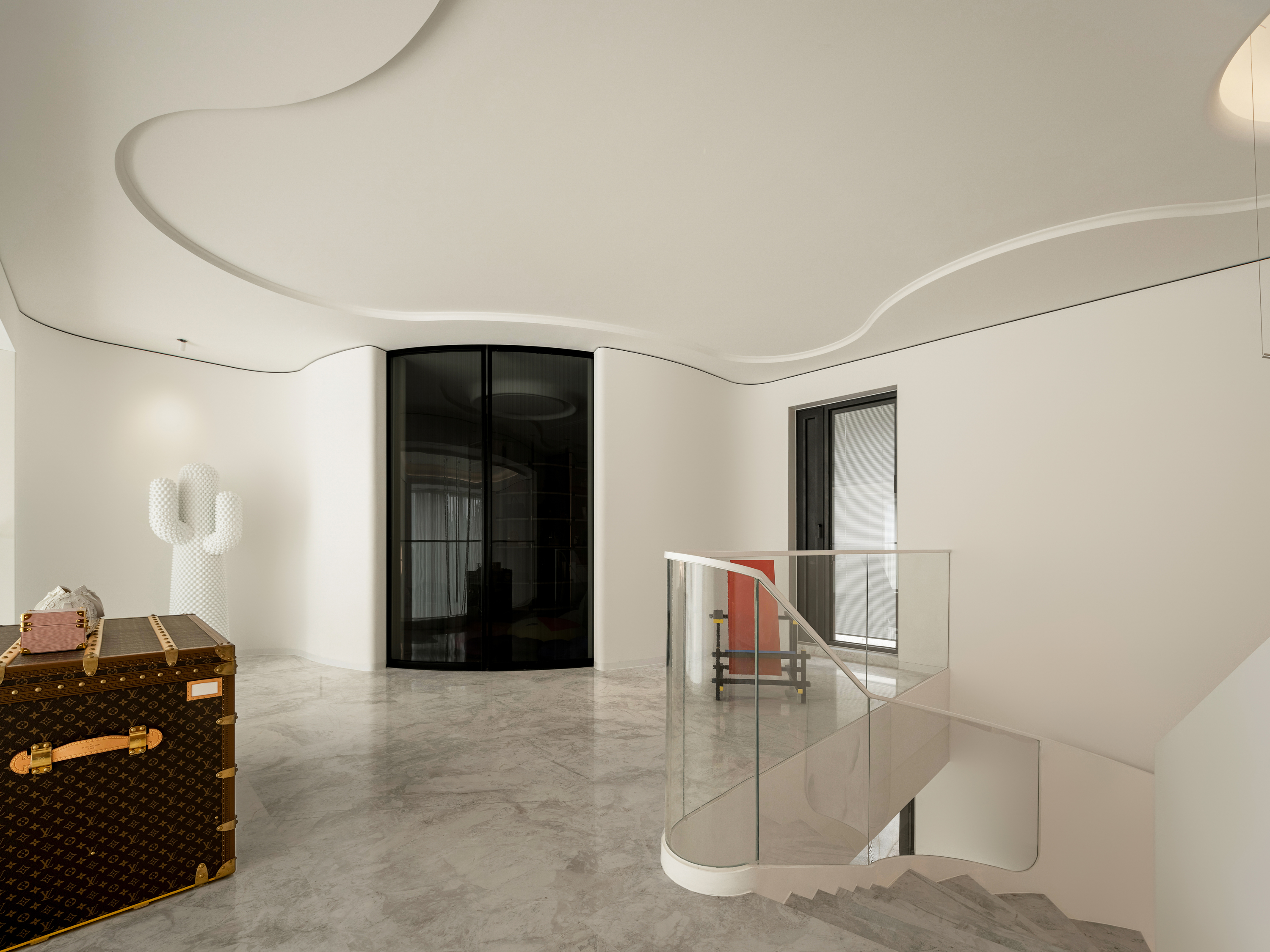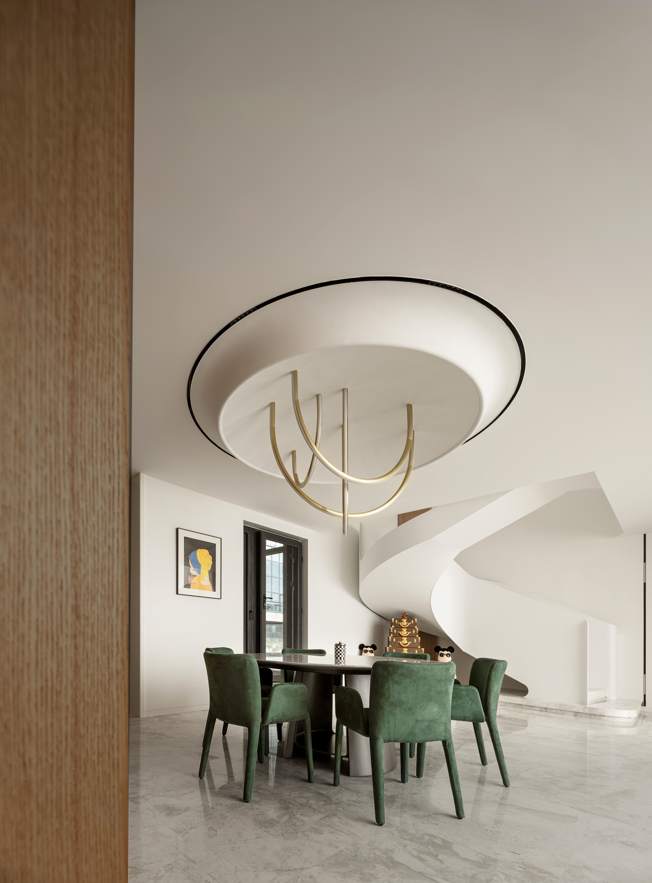 设计选材:楼梯 也可以是空间中的装置艺术品,楼梯设计上设计师也是花了很大的心思。它是空间中的雕塑,融入环保理念。纯白色面板、无边扶手、温润理石踏步,灯光逐阶梯而上,以强大的艺术张力瞬间抓住视线,为空间增添了灵动意境,又真正做到了不占用一丝多余的空间。自带丝丝清冷,又显露淡淡柔和,轻描淡写的质感中却不容忽视。