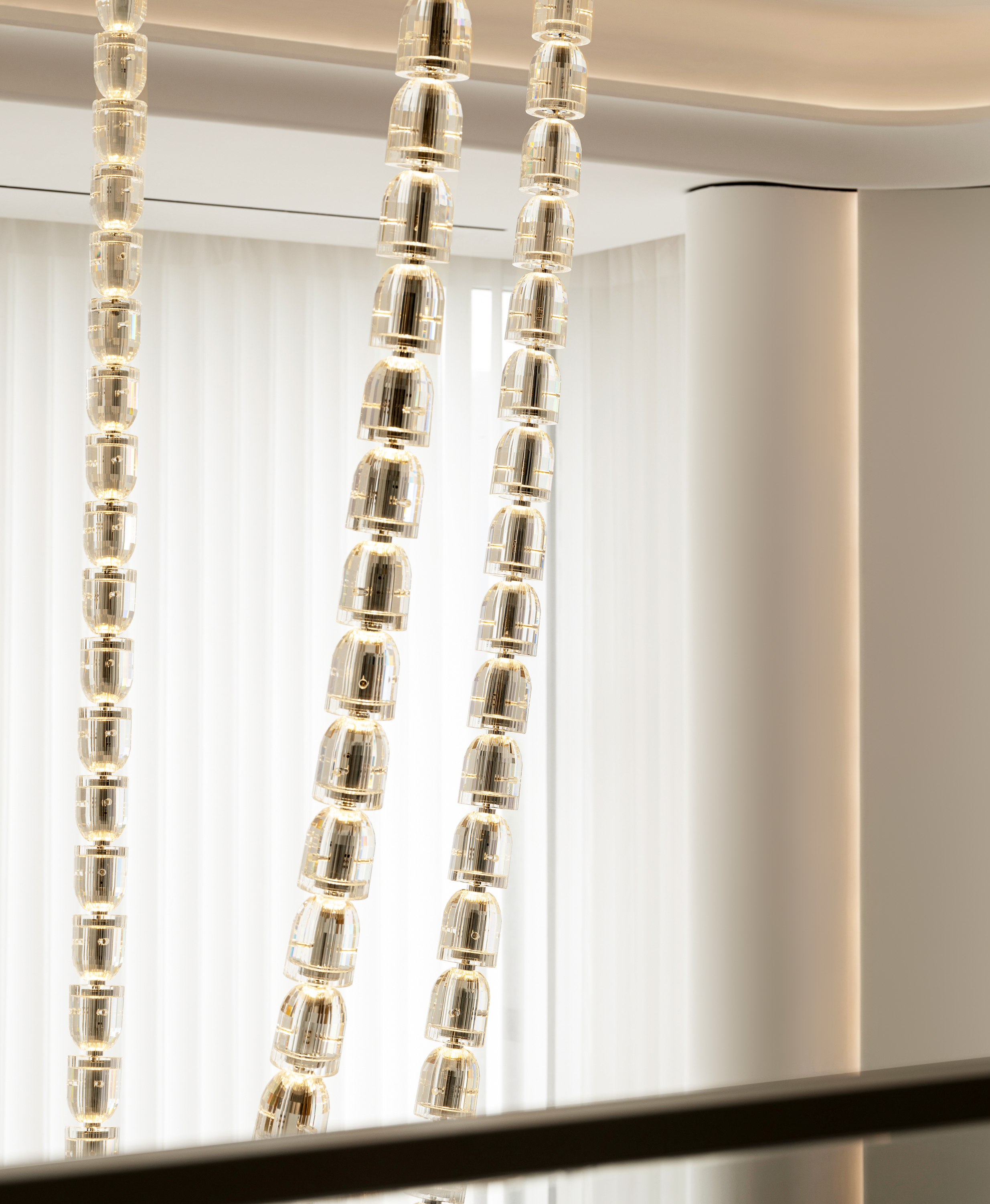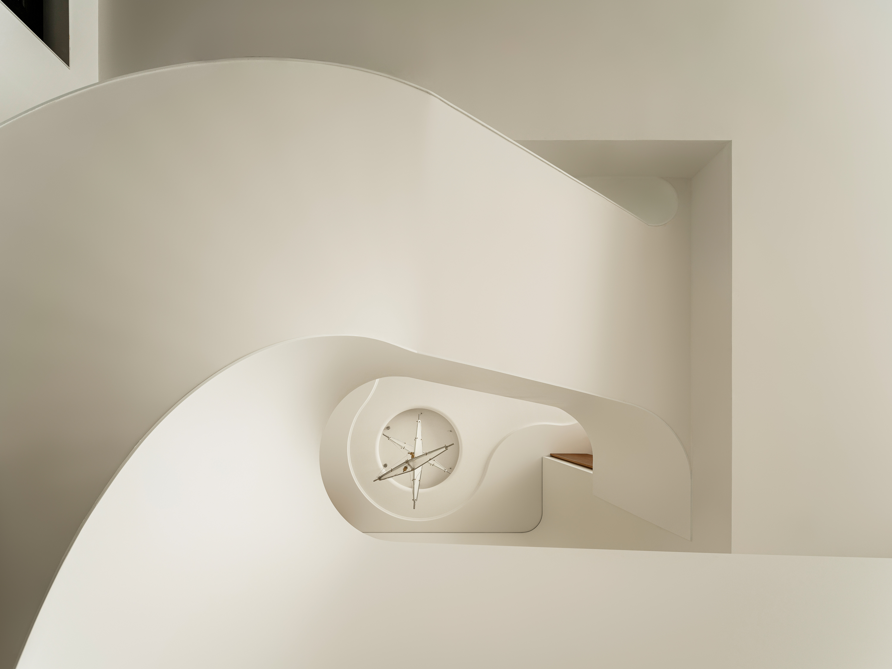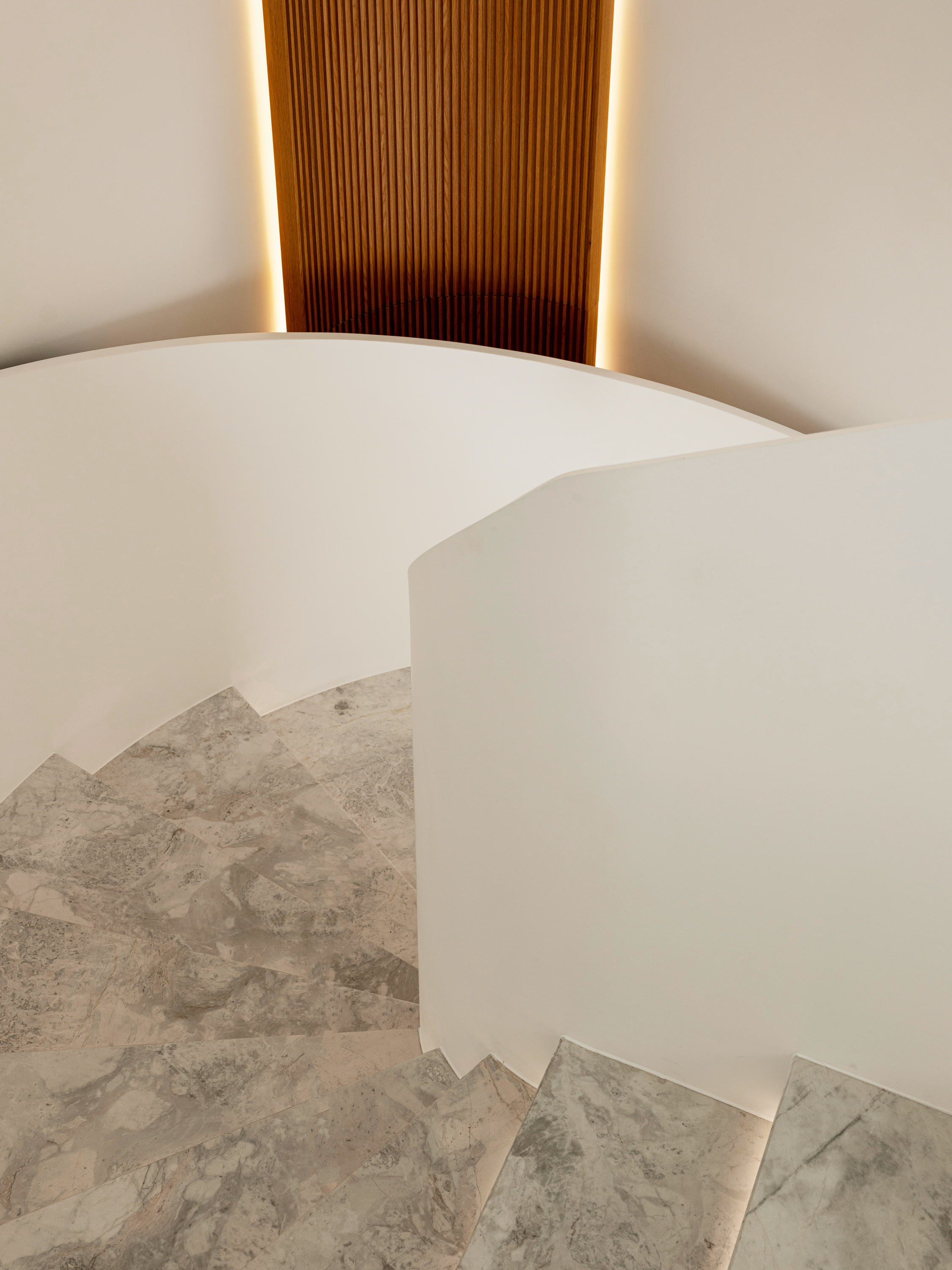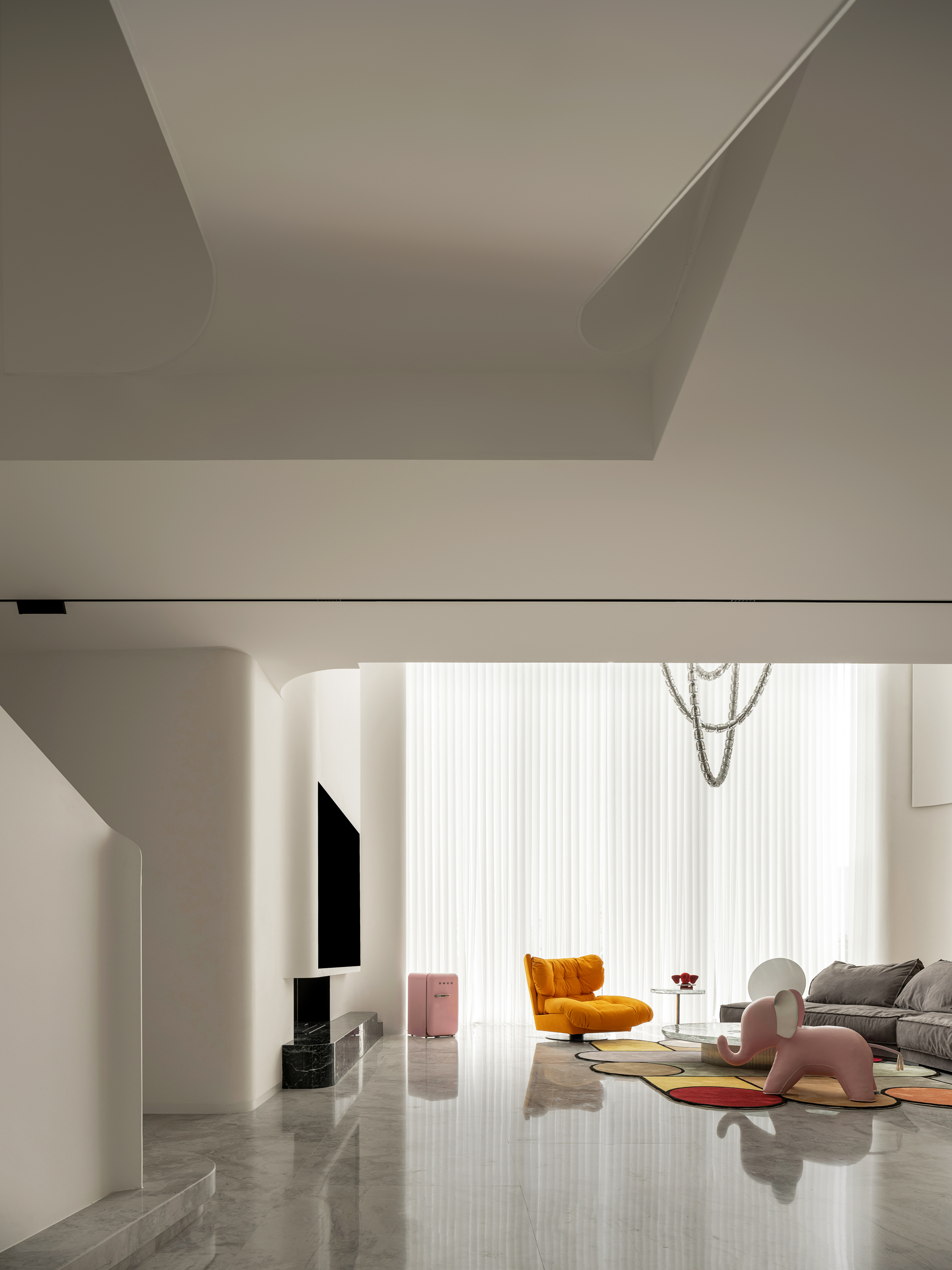 设计选材:楼梯 也可以是空间中的装置艺术品,楼梯设计上设计师也是花了很大的心思。它是空间中的雕塑,融入环保理念。纯白色面板、无边扶手、温润理石踏步,灯光逐阶梯而上,以强大的艺术张力瞬间抓住视线,为空间增添了灵动意境,又真正做到了不占用一丝多余的空间。自带丝丝清冷,又显露淡淡柔和,轻描淡写的质感中却不容忽视。