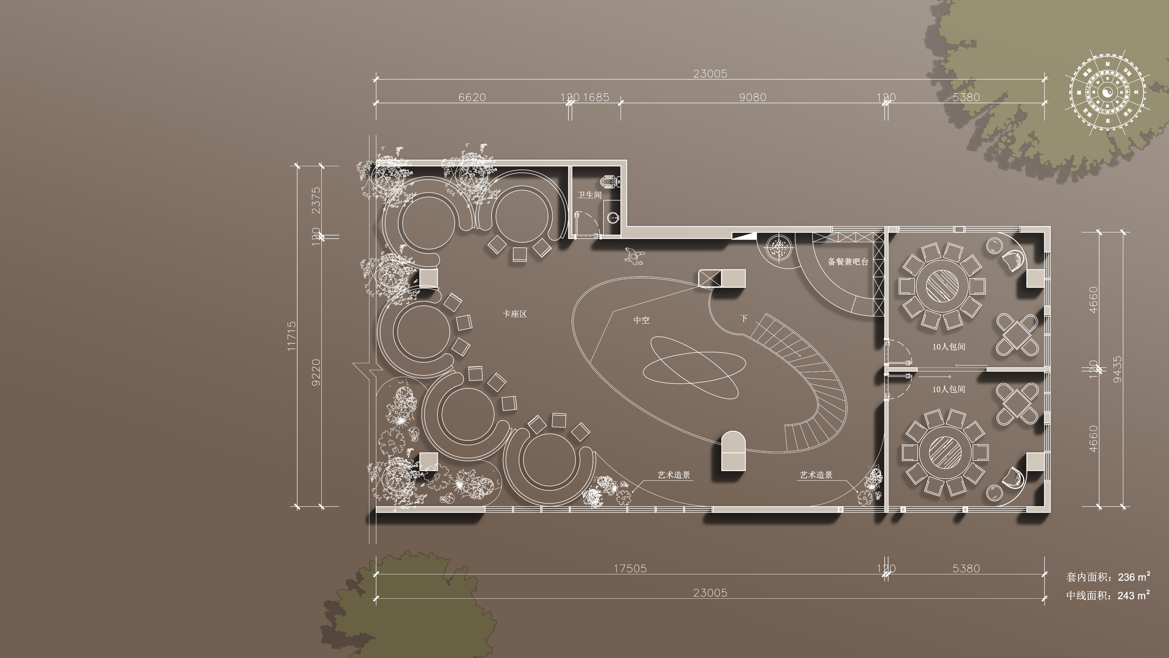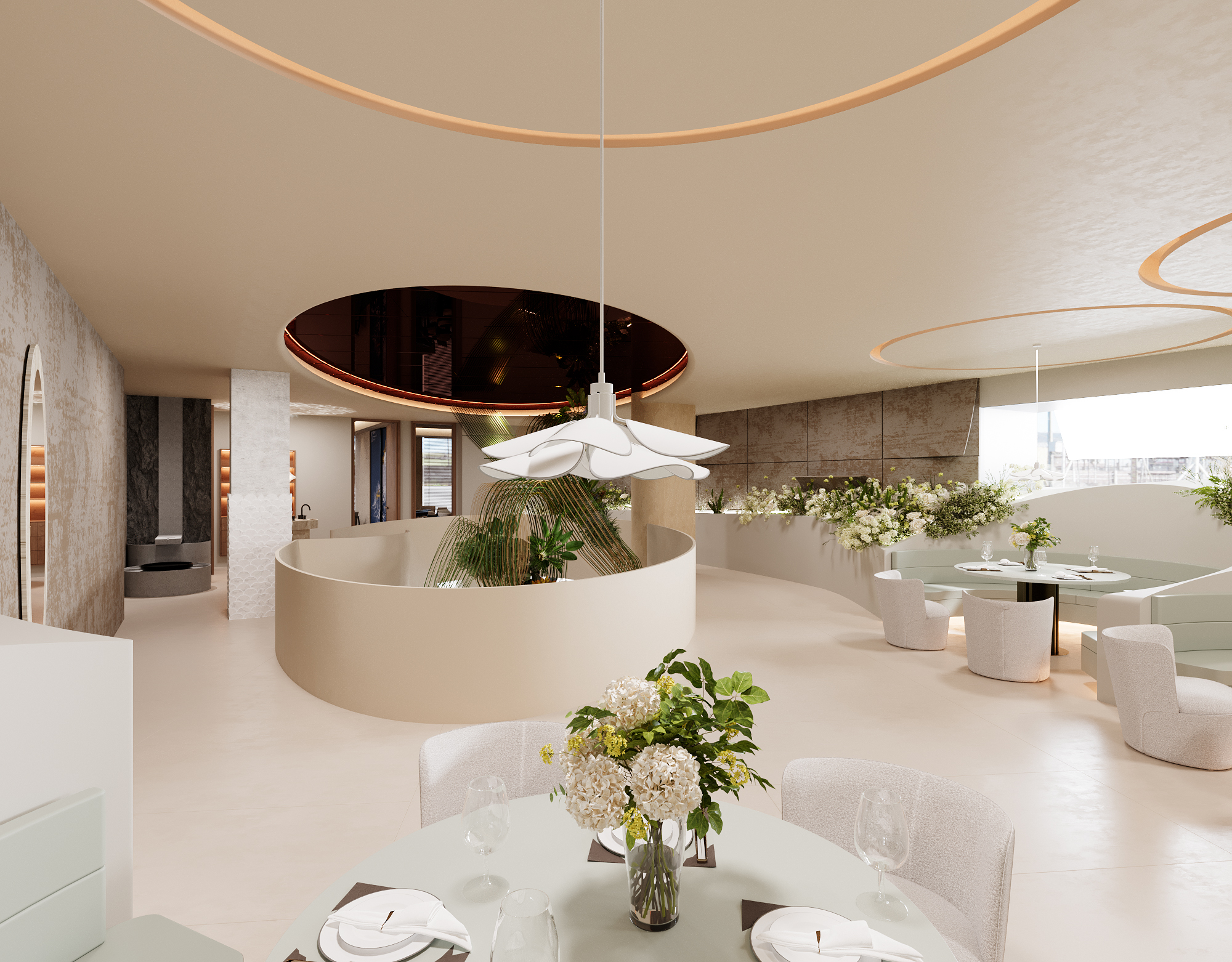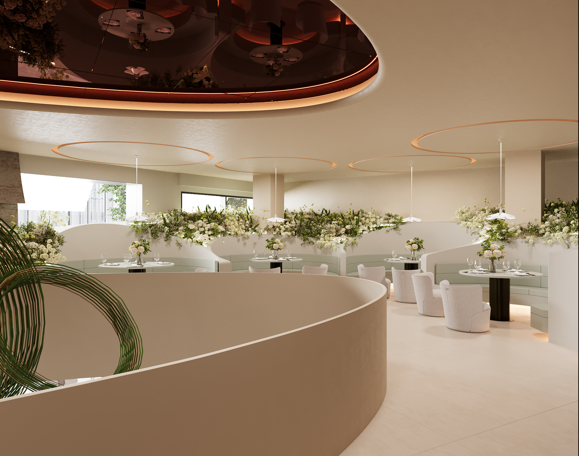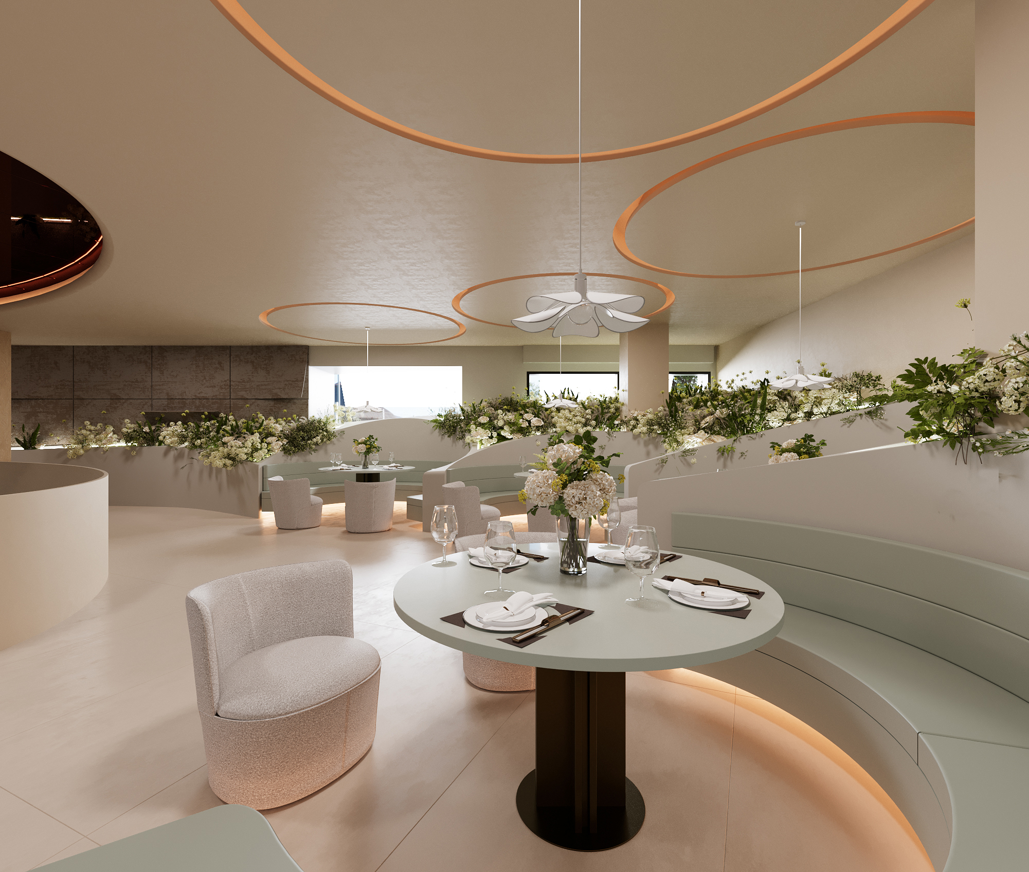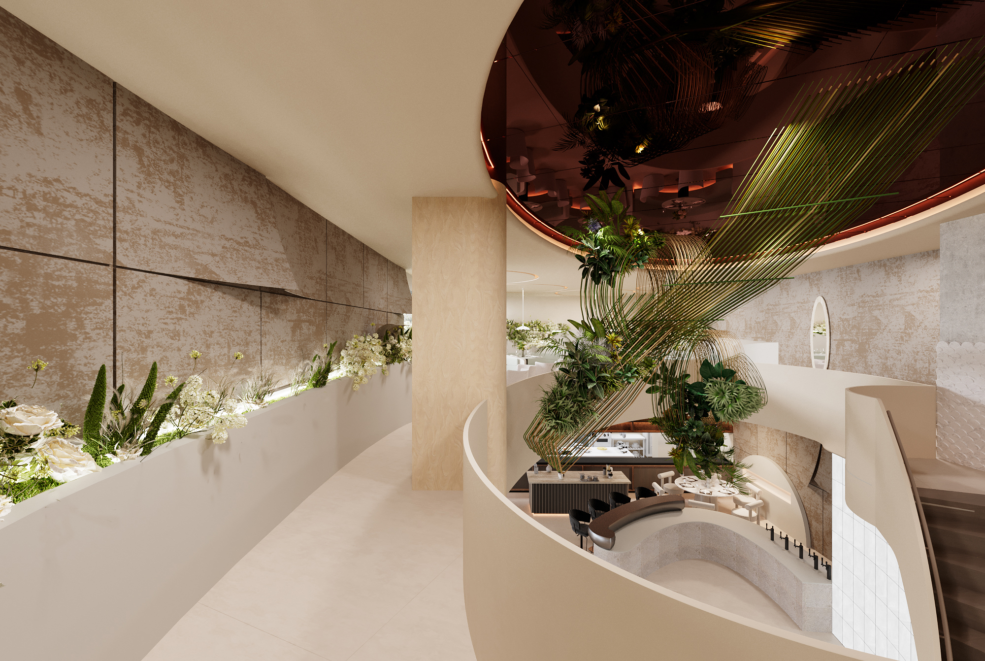 餐厅中心利用椭圆镜面顶下吊植物作为大型艺术装置,让整个空间灵动起来。