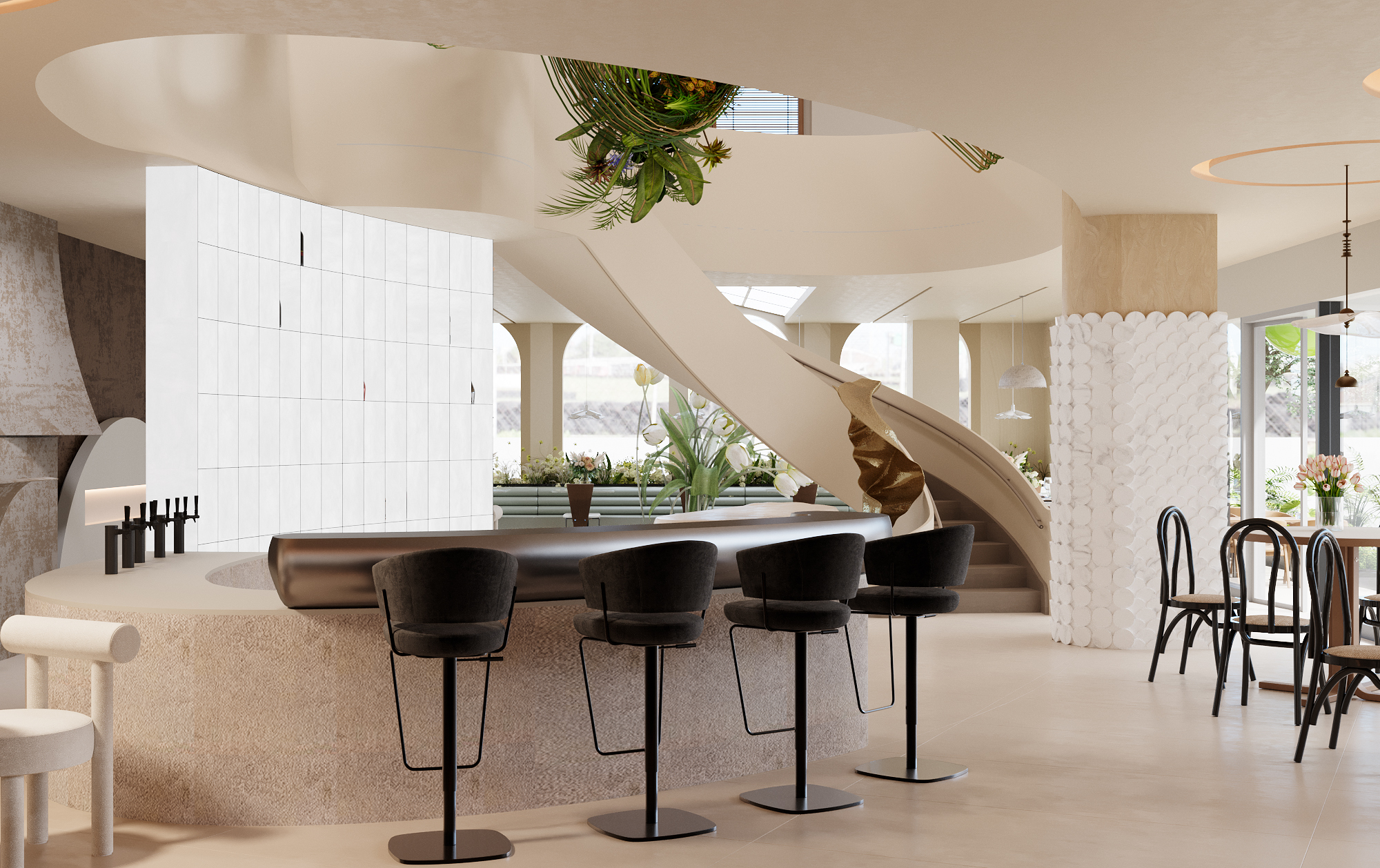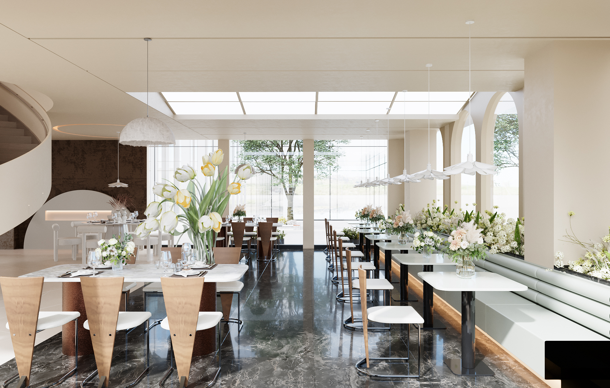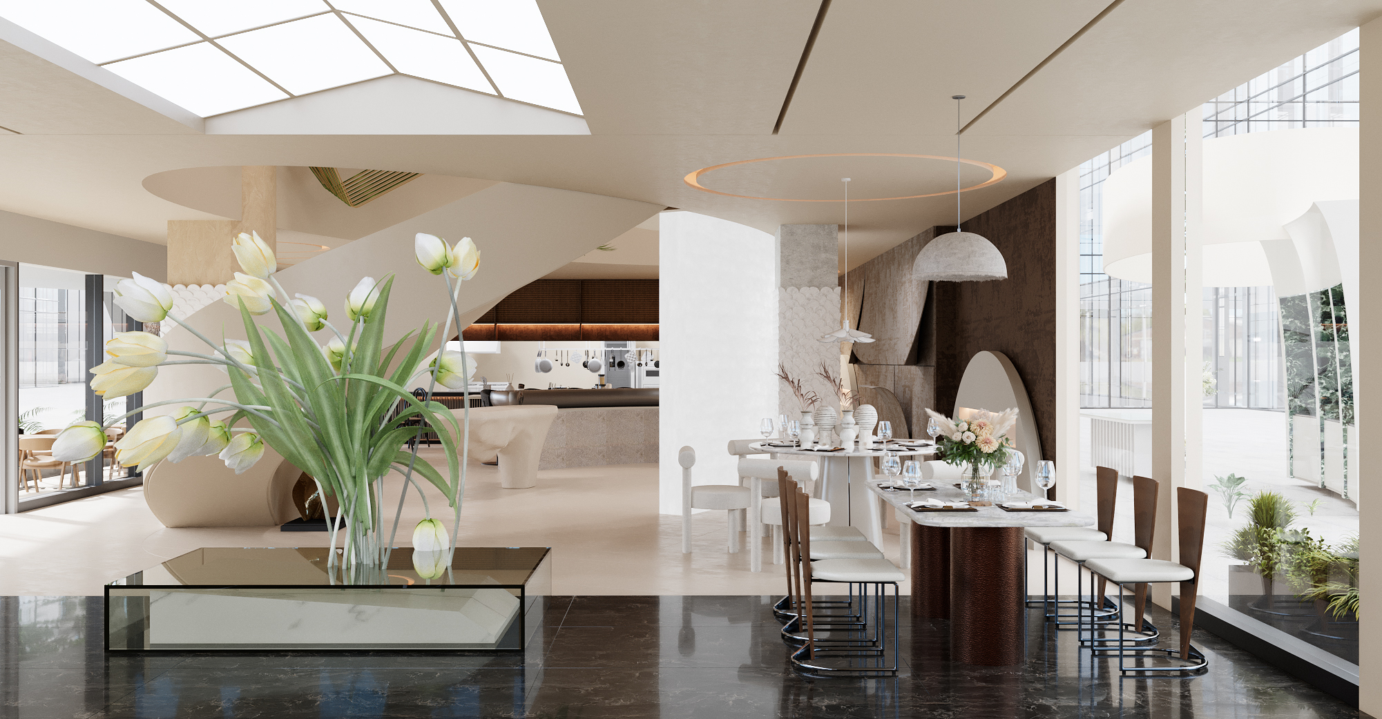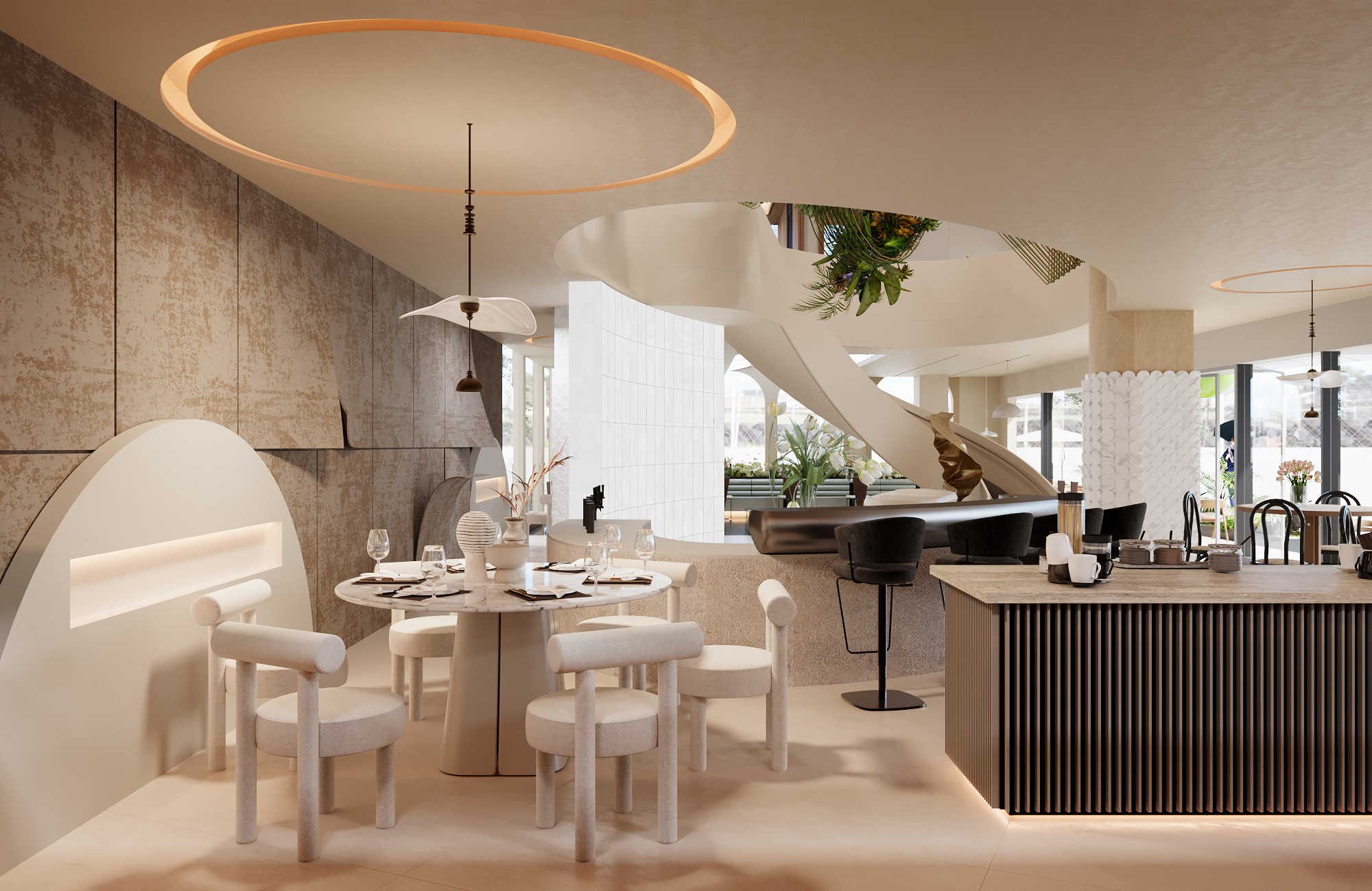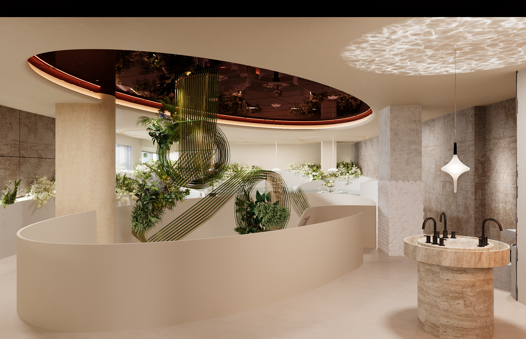餐厅中心利用椭圆镜面顶下吊植物作为大型艺术装置,让整个空间灵动起来。