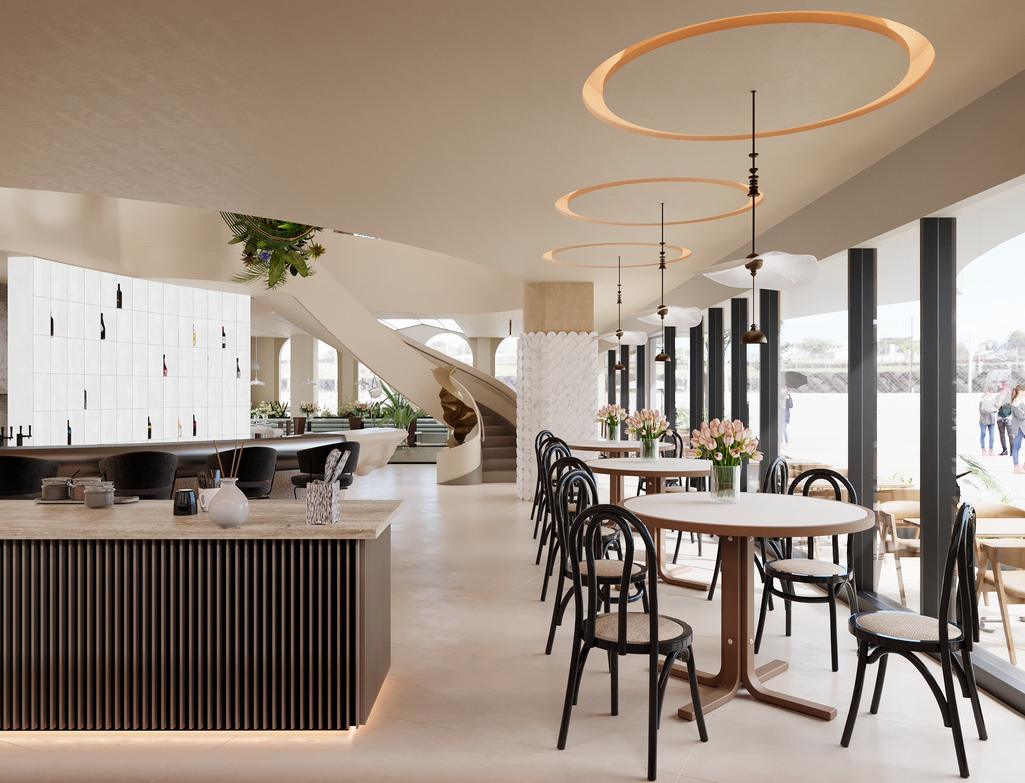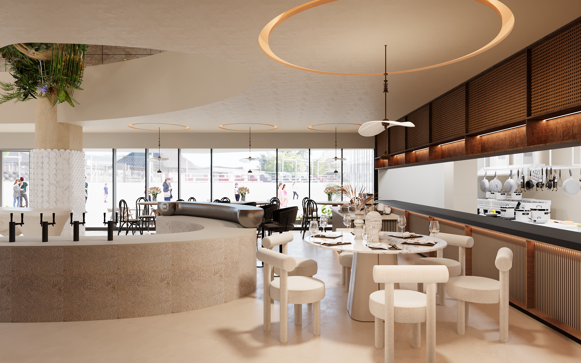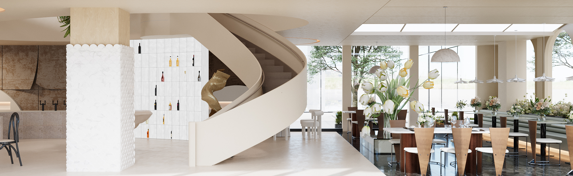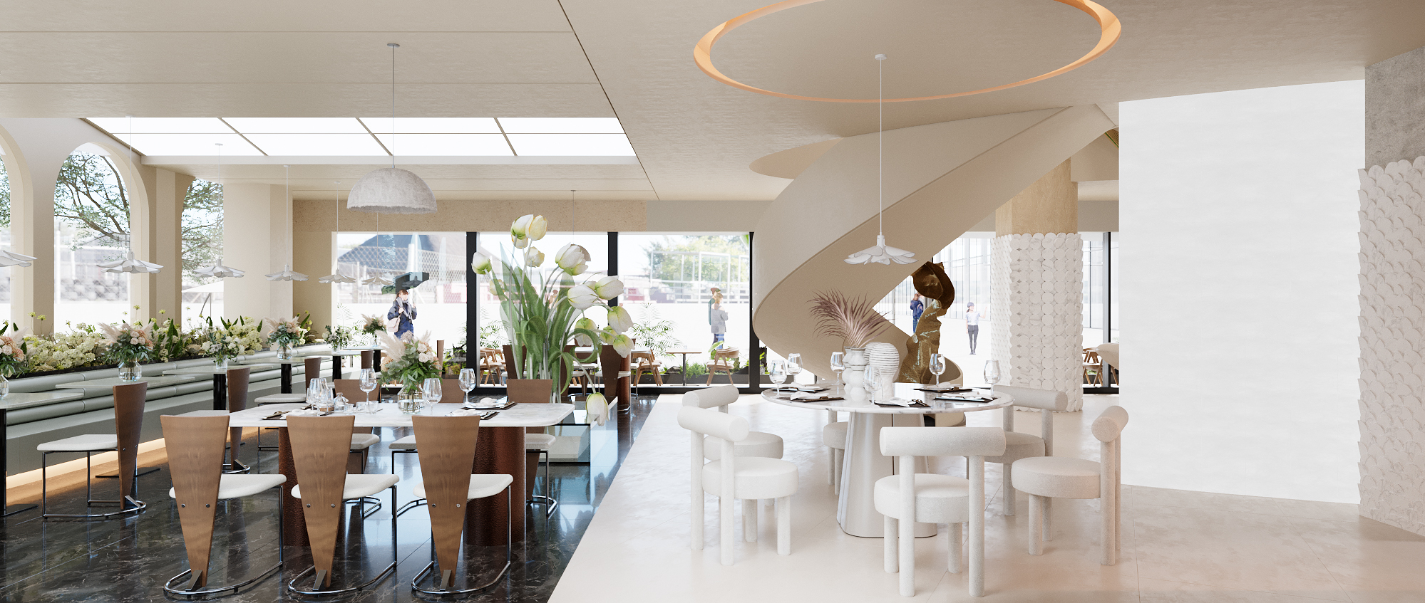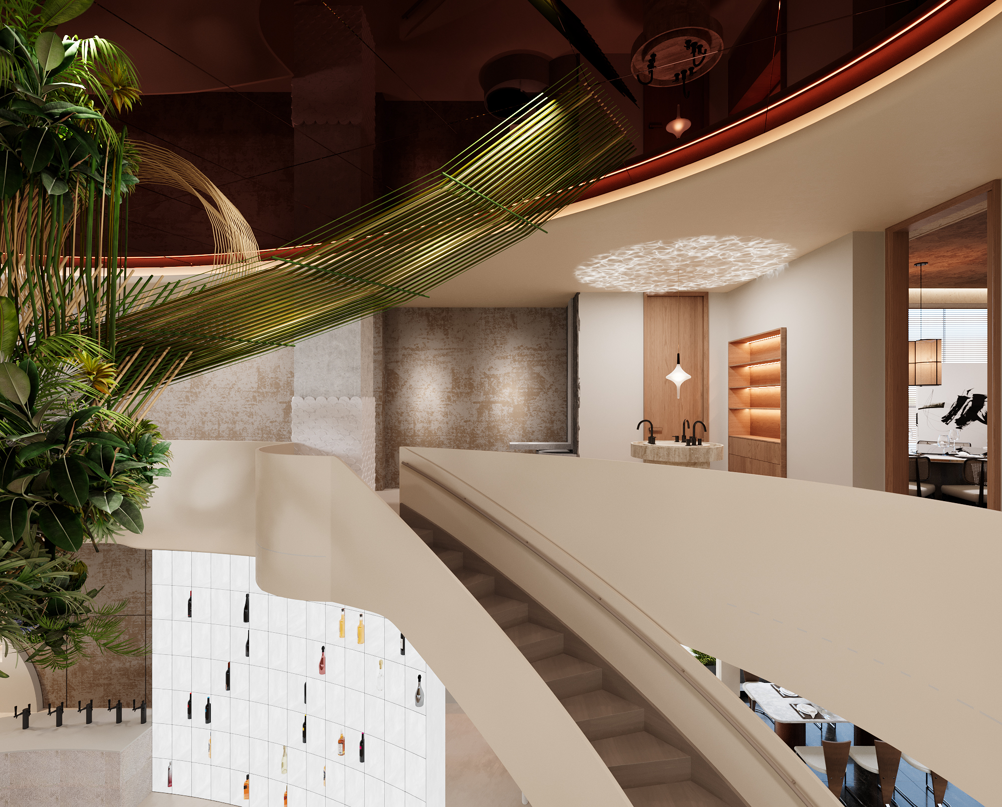 餐厅中心利用椭圆镜面顶下吊植物作为大型艺术装置,让整个空间灵动起来。