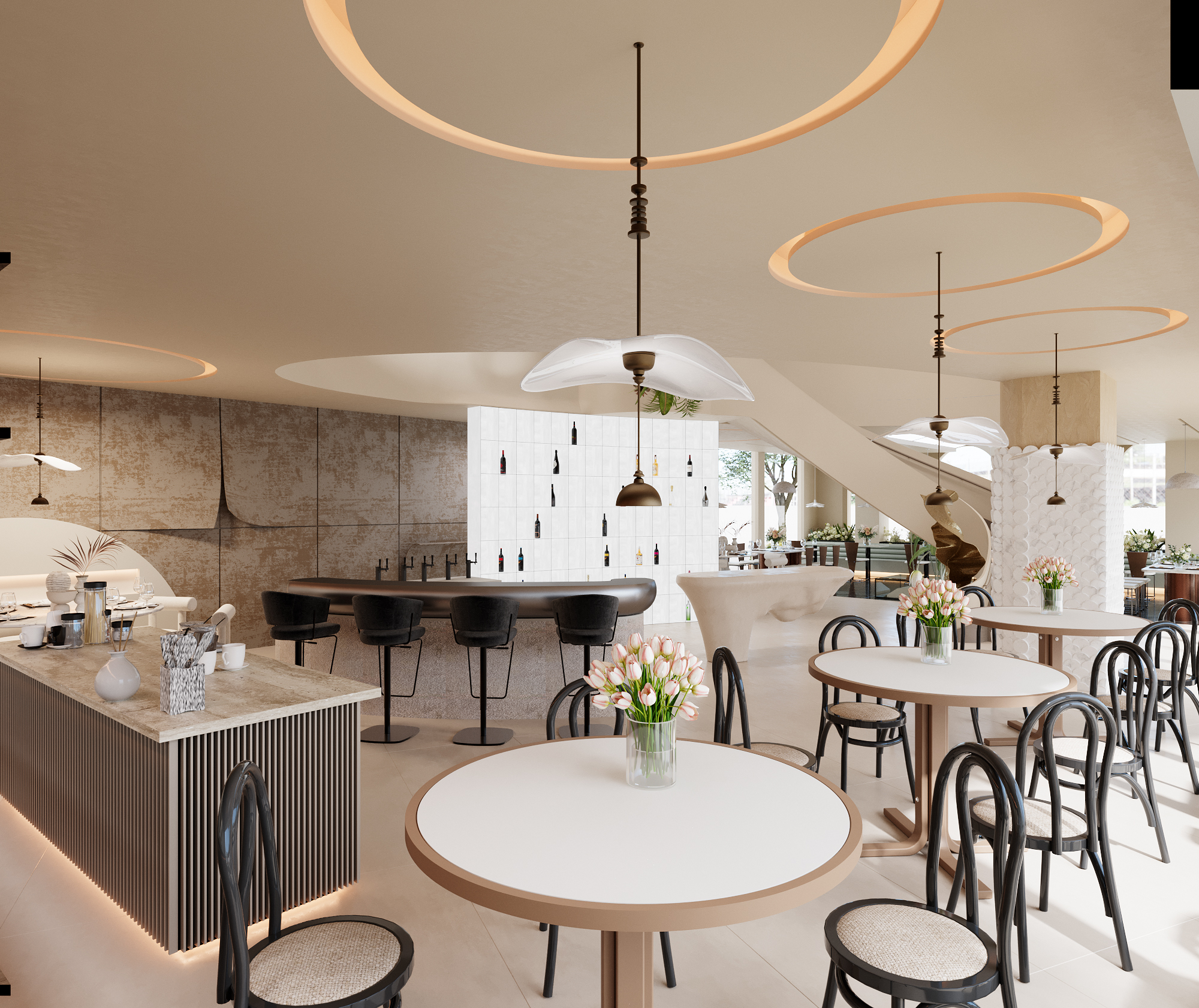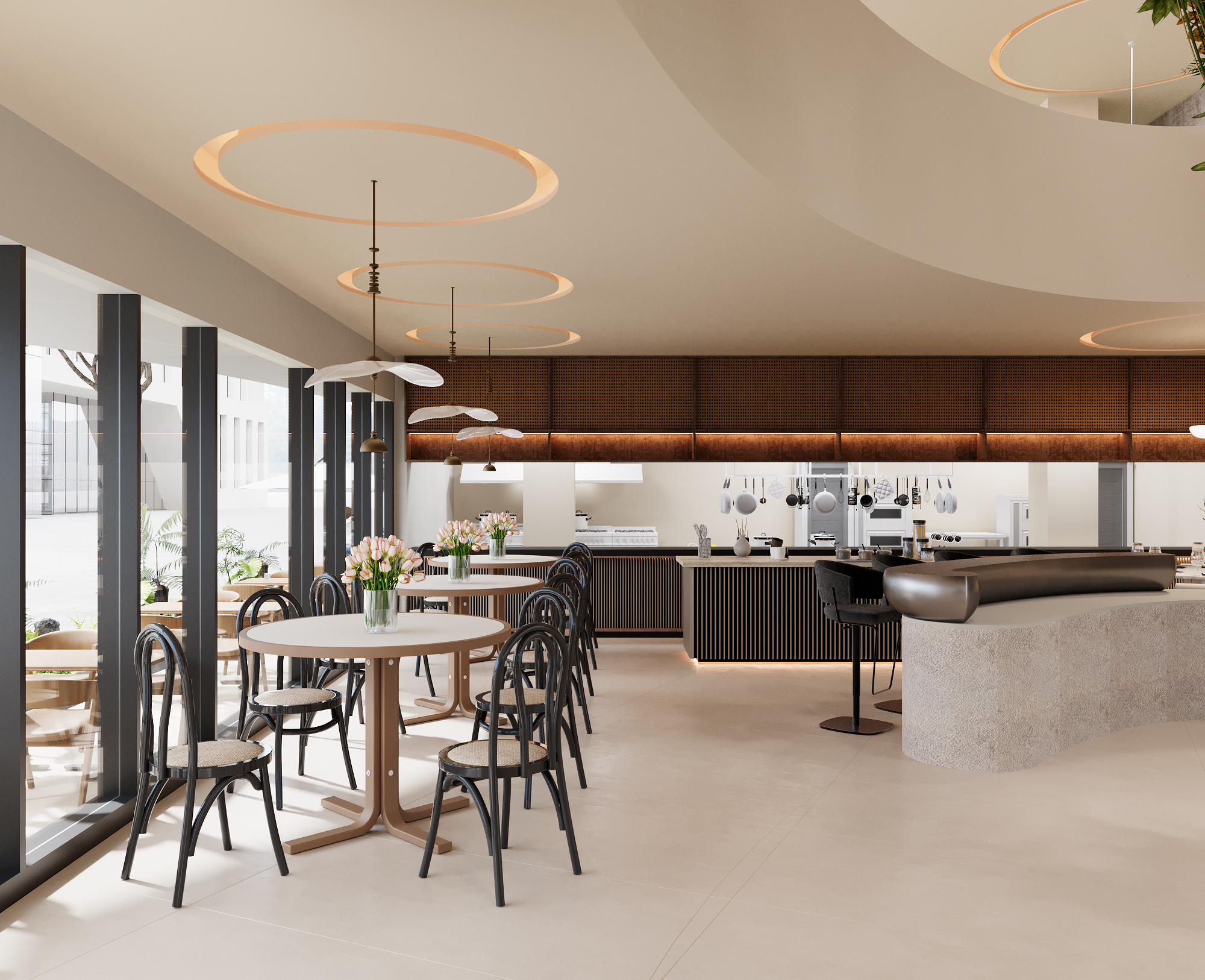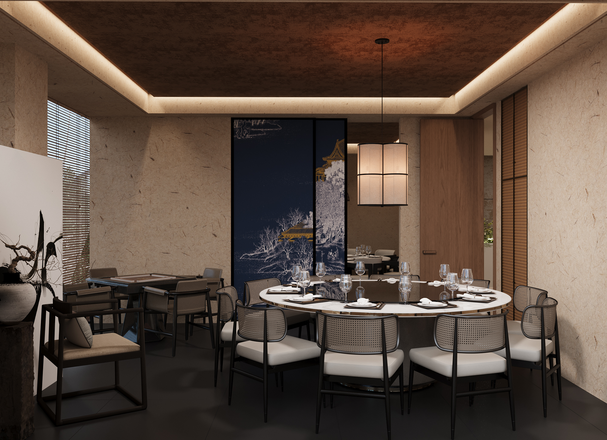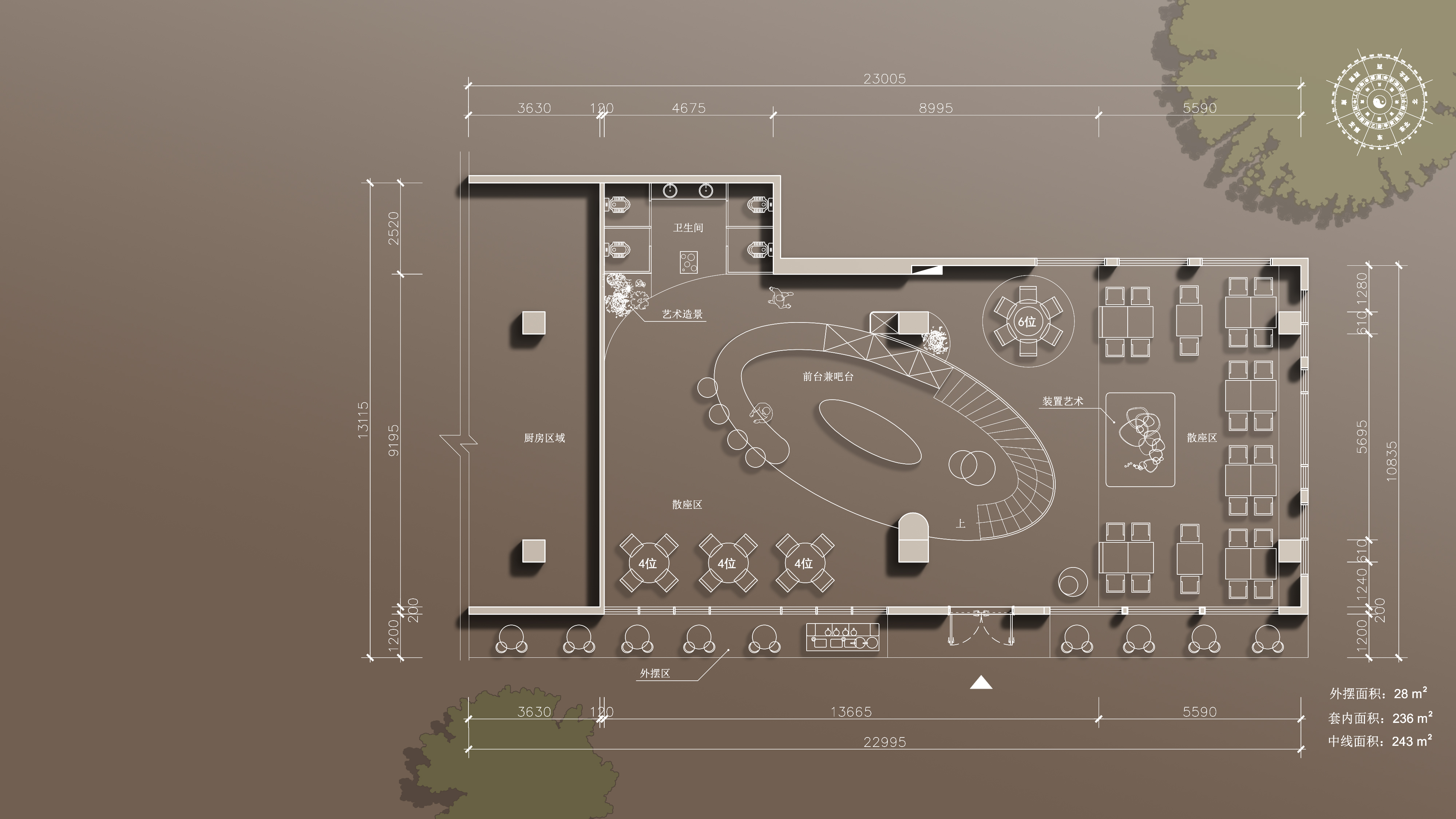 采用开放式布局,利用大量绿植作为隔断,划分散座区,卡座区和包间,整个空间大量使用白色,木与石点缀,整体显得开阔明亮。