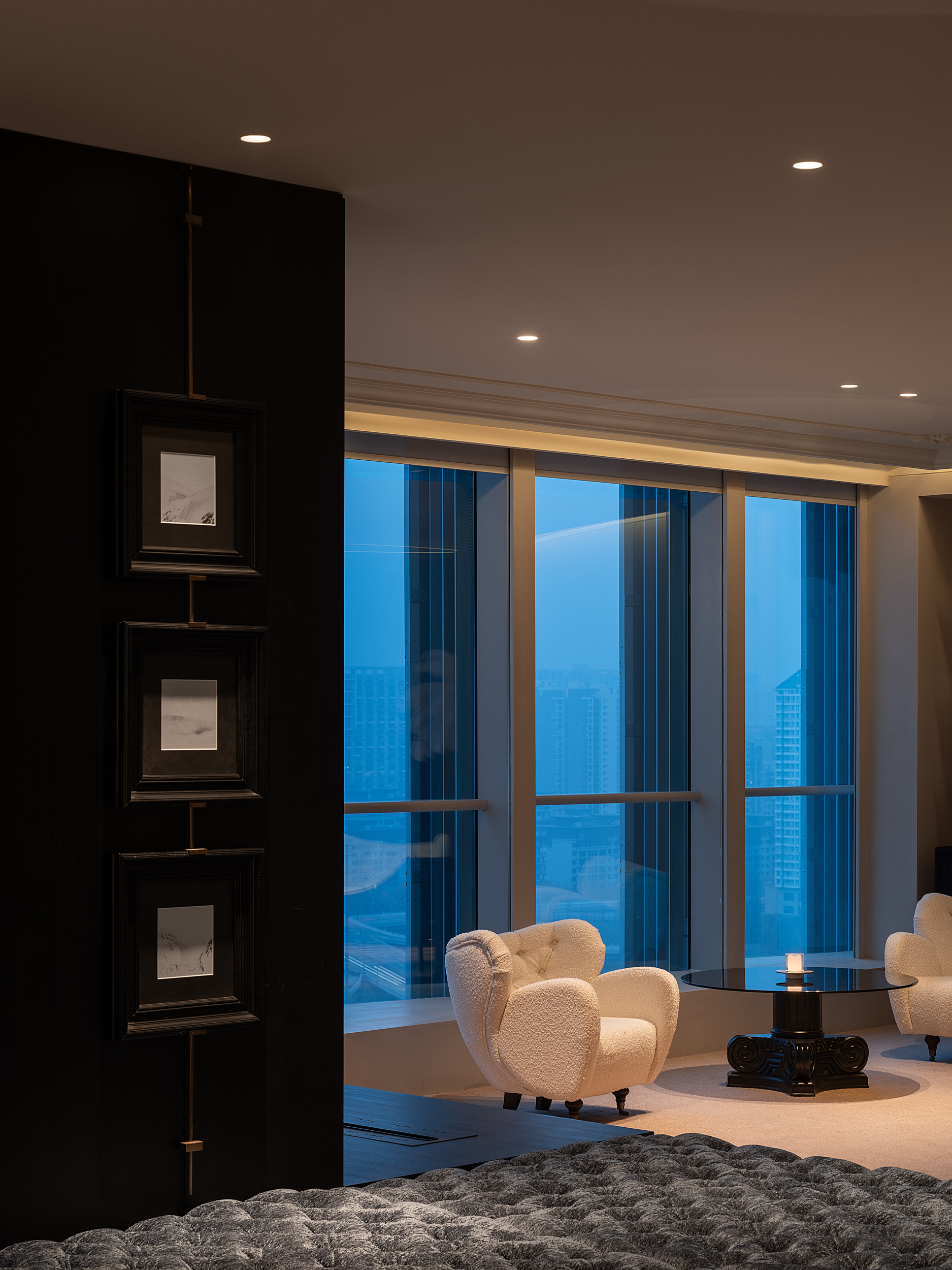 因为6个多功能接待区并未做完全的分割,主理人希望能够有一个较为私属的小区域,动线回转,玻璃砖结合地台,将开阔的空间拉出节奏感,夜幕最好的视角给足仪式感,地台上递进一阶,两个新古典风的鸟笼椅能包裹整个人,完全满足私聊的需求,又能与周边信息及时互动。