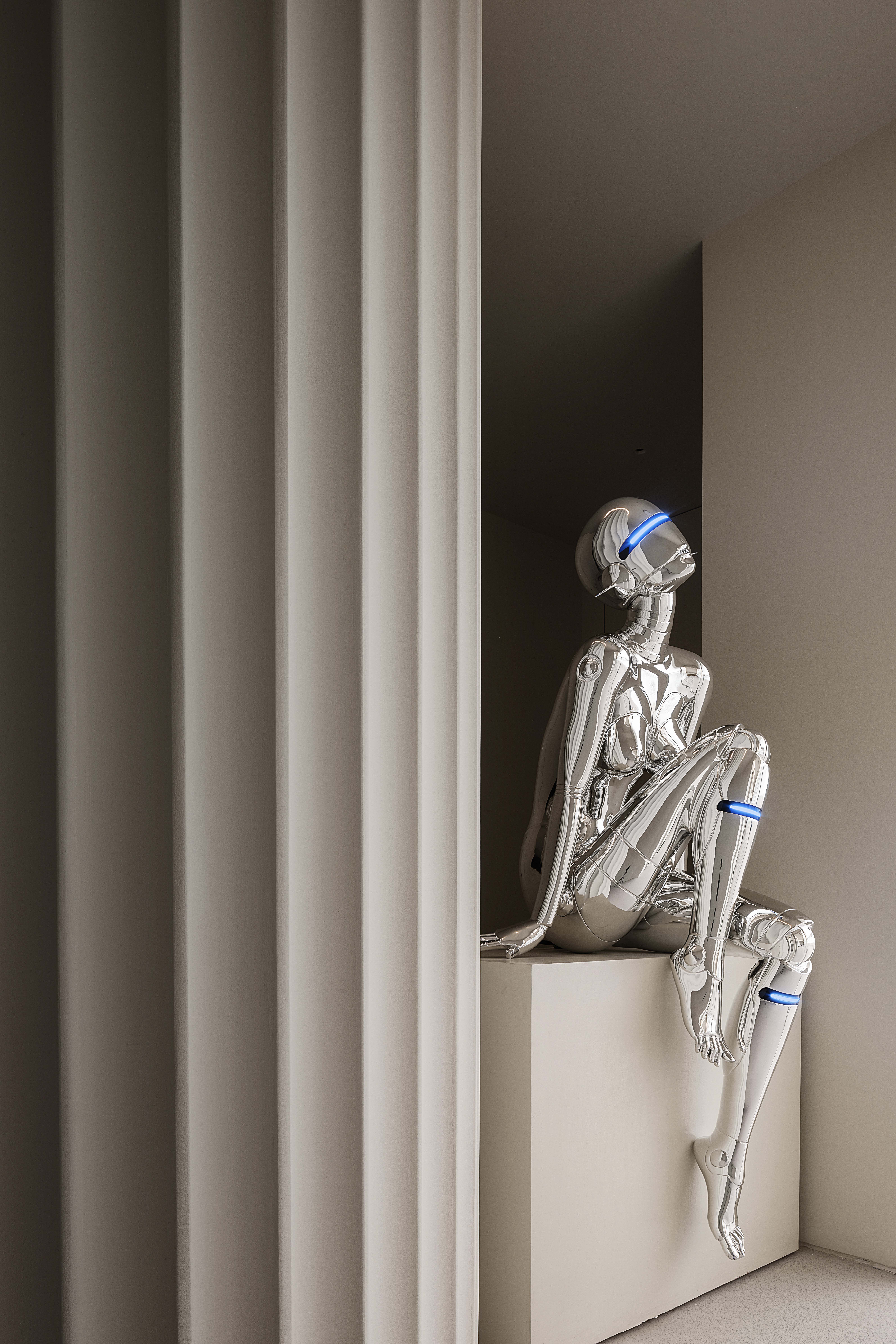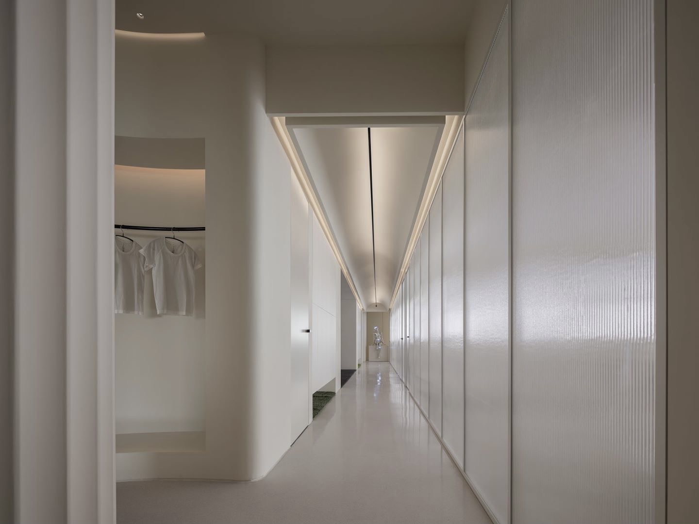 前台接待区到健身区,中间做了停顿连接点,此处作为专业普拉提的装备展示区,原始的建筑承重方柱子设计师做了巧妙“消隐”,将柱子圆形化,石膏线瓦楞的视觉层次感,同时将此处空间动线一分为二,既能满足停留驻足细看的时间,也互不打扰,视线的最远处,刚好看到入户盒子门,多方的互动悄然发生。