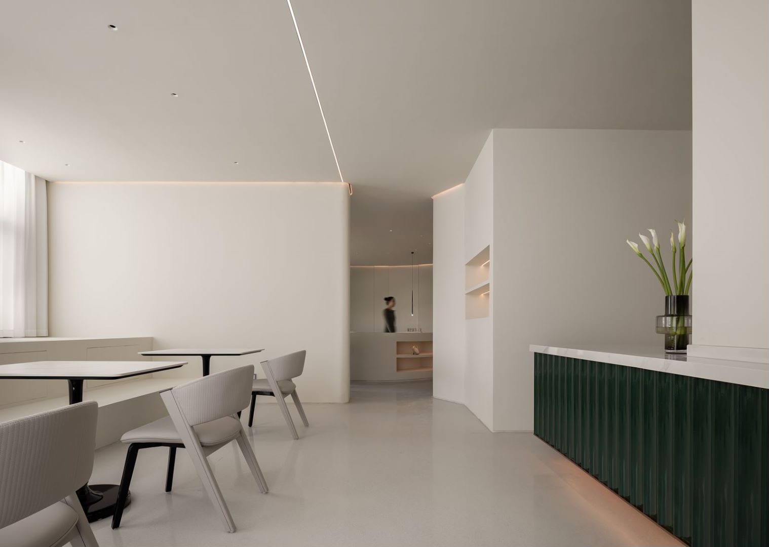 将空间的竖向关系变成横向关系,弧形水平窗拉开光影序幕,下浮坐下来的视角,细细观察感受,让每个空间都留有“视口”,留给咨询时的舒适感;