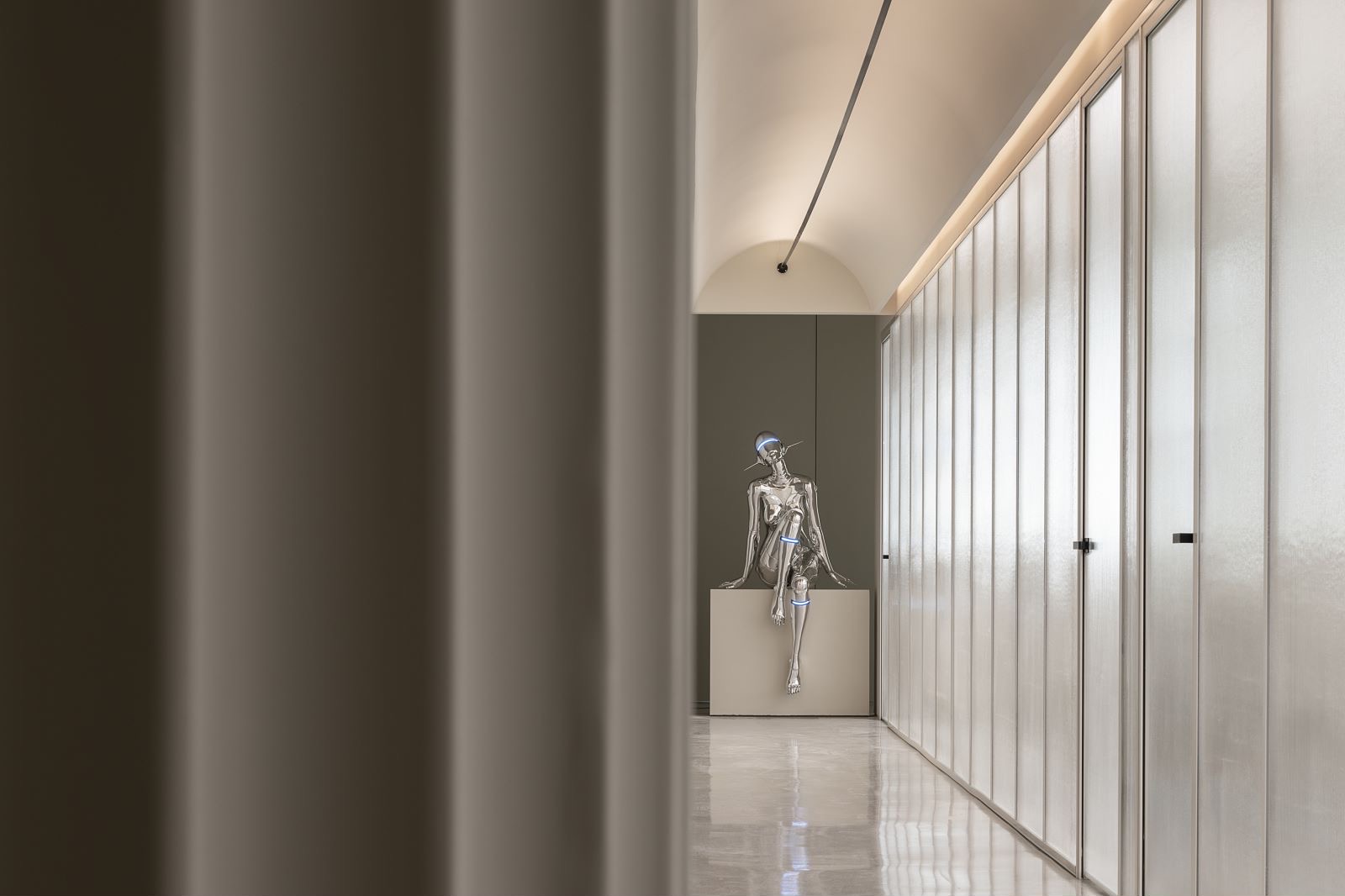 走廊拱形结合陕北榆林的窑洞特色进行现代化设计的演绎呈现,走廊尽头的装置配上不同的绿色又一次点题。