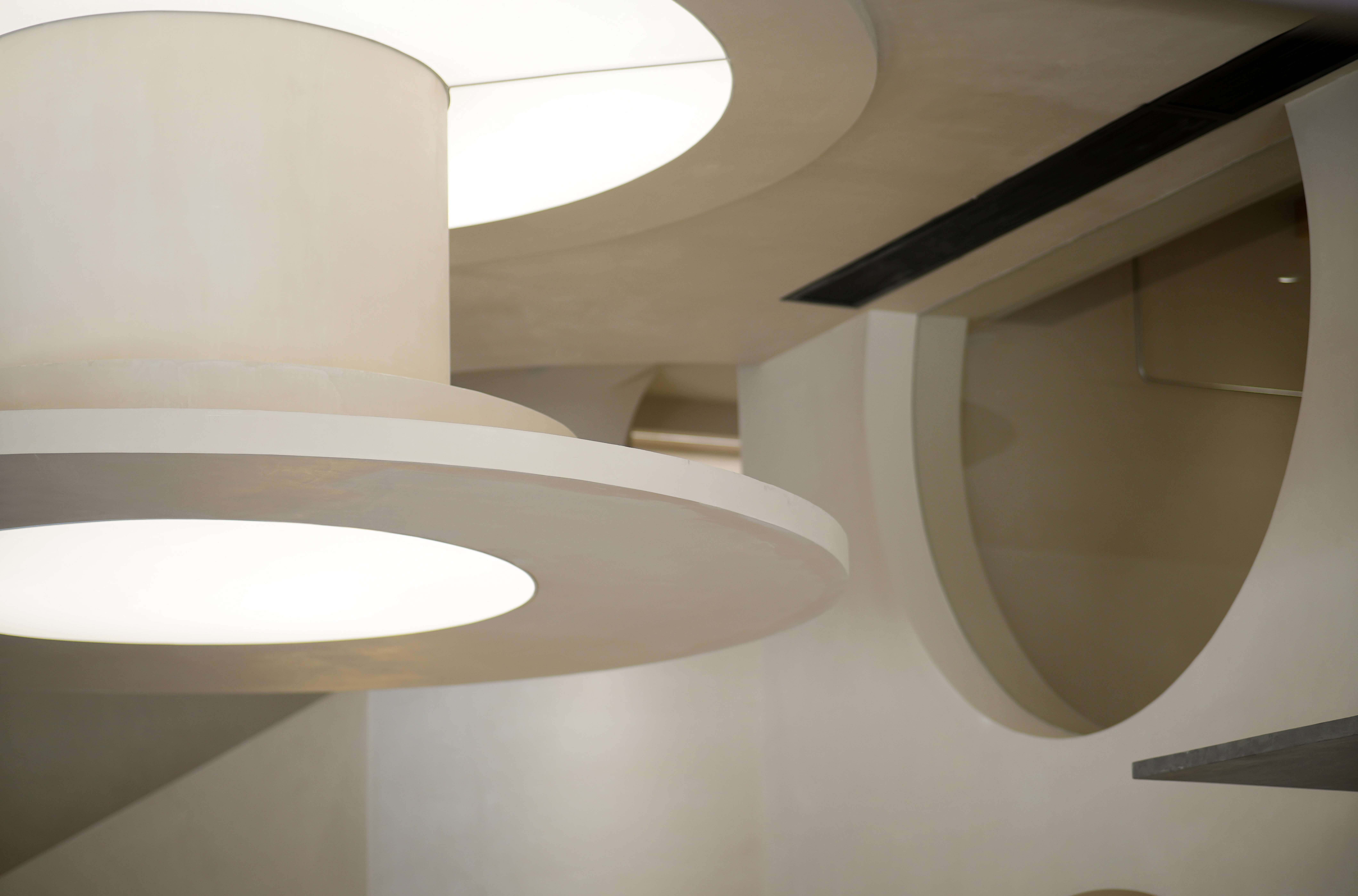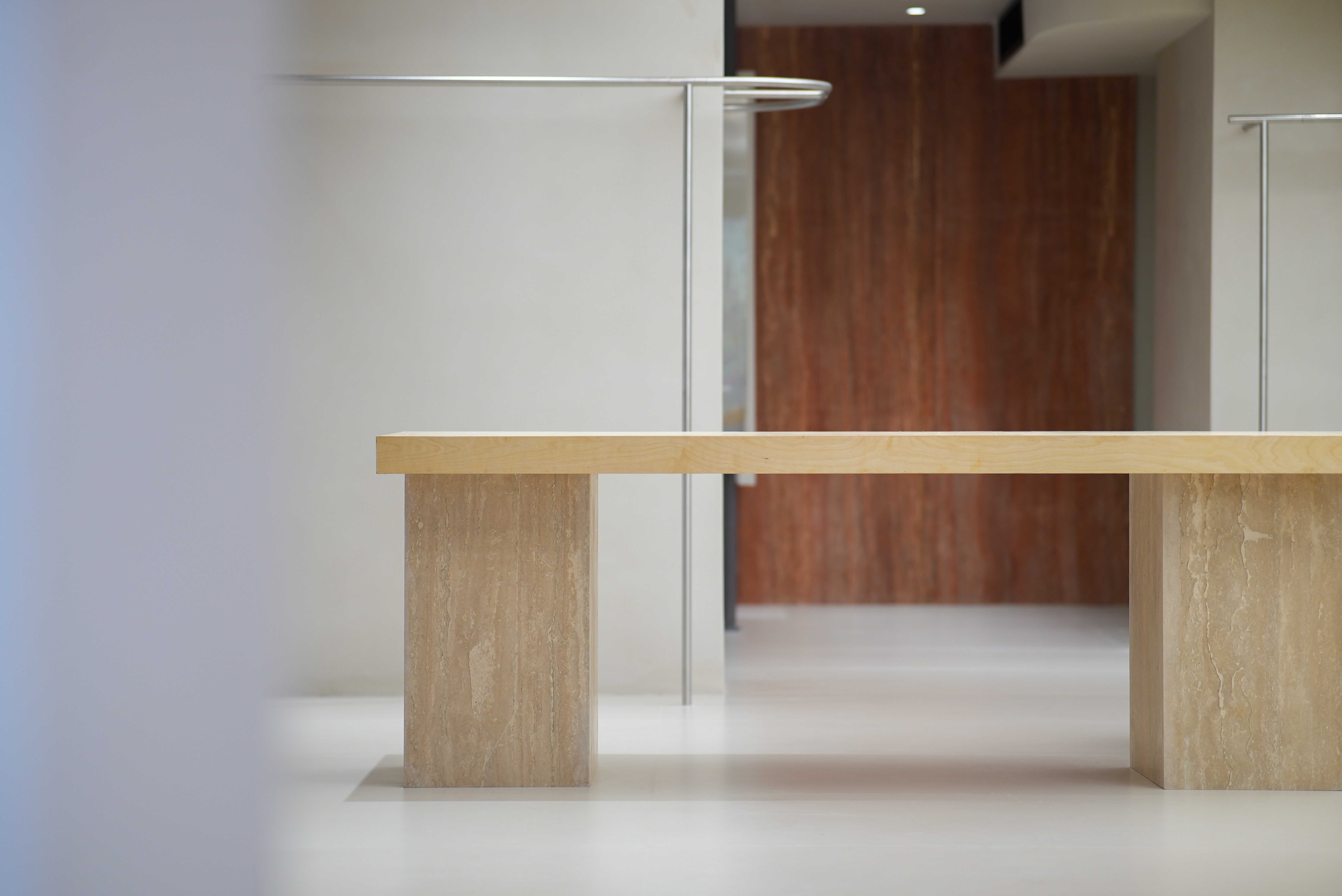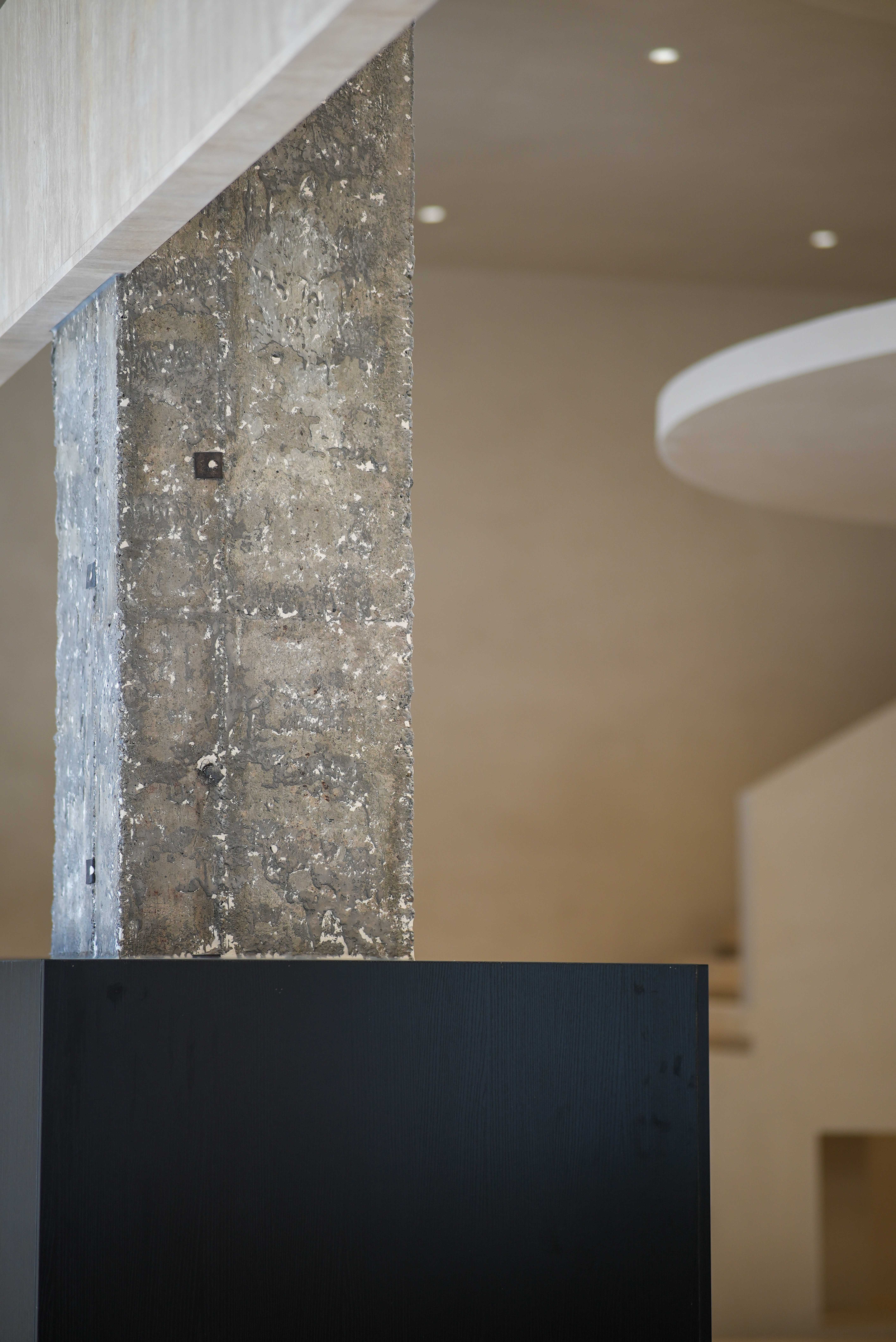 在这个空间中,采用「微沃微水泥」完成了所有的墙顶面、部分家具表面的涂装。微水泥拥有优异的延展性,在一些弧形曲面区域有着很好的表现力,并且防水、防潮、耐污,应用于建筑外墙能达到美观与实用的完美结合。进入内部,设计师用纯粹的几何形体去除刻意的装饰和造型,原始的水泥立柱使空间回归本源,黑色雕塑般的体块也为公共区域带来了层次。在微水泥带来暖色基调中,洞石、金属、大理石等材质以不同的组合关系和组合形式穿插其中,顺应逻辑规律,在空间中协调共生。微水泥有极好的包容性,是一种极好的底色,与多种材料能自然搭配融合,并且不止于纯色,它在不同的空间中根据设计需求能多元化定制调色,叠加肌理效果,使其细节质感更饱满与突出。