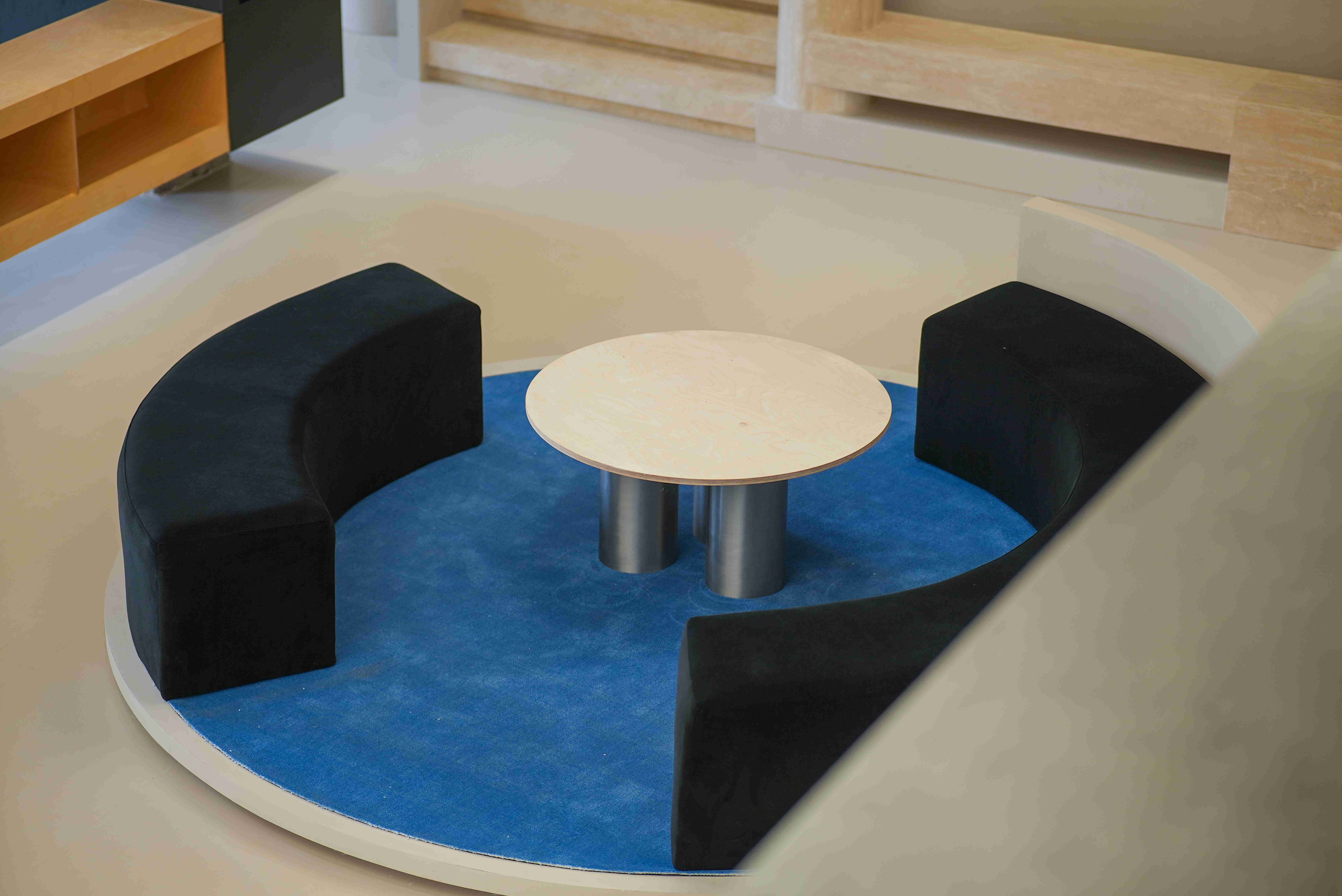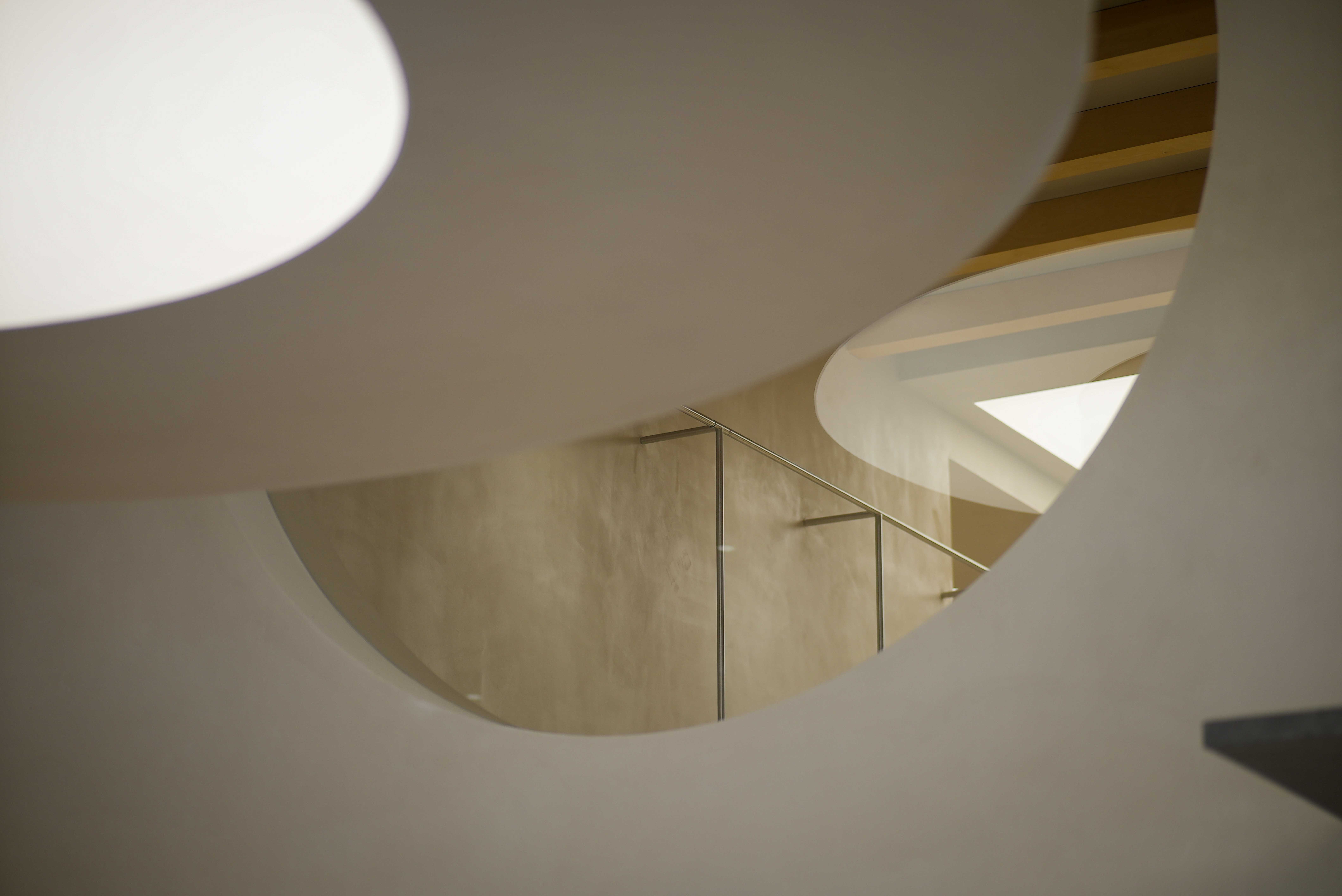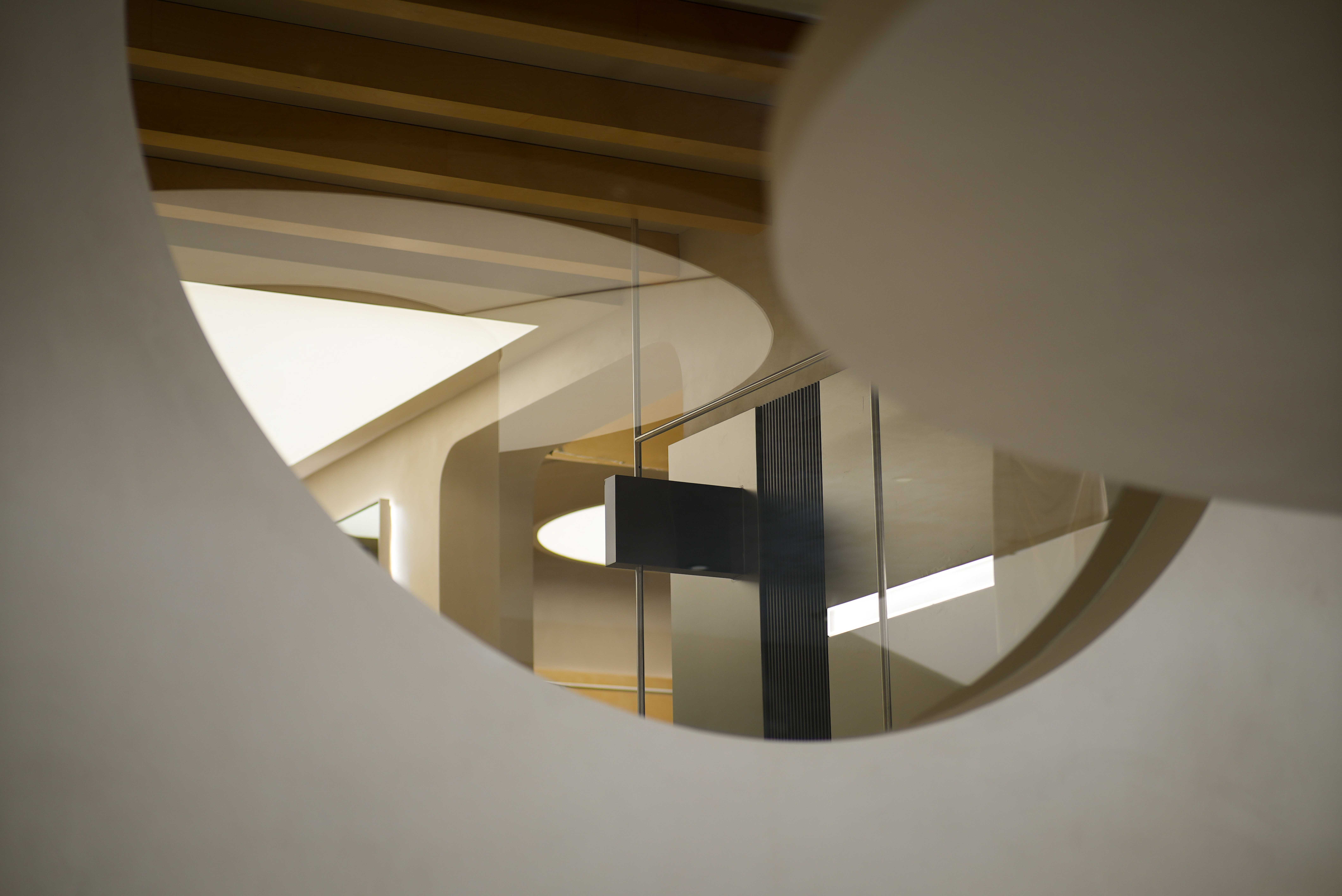 公共休闲区承袭空间的极简设计语言,沙发和地毯的色彩选择十分低调,沉稳、厚重、坚韧,与周围纯粹的环境形成视觉反差。既是吧台也是咖啡制作区,多种材质互相碰撞,“回"型的设计足够开放、通透,电子屏幕和吧凳的亮色似乎为这个区域纳入了鲜活的“生命力”。茶几外形、沙发摆放以及地台的设计,弧形靠背表面涂装微水泥,不管是形状还是材质,都与顶部的灯形成呼应。位于空间的中心位置,休闲区连接起了所有的水平或垂直空间,通过圆形拱门向内部的延续,一层通往二层的连接动线等。为缓解小空间固有的压迫感,顶部采用木饰面横梁来扩展界面,木纹的天然肌理与质感,也提升了室内空间的温度,带来新的平衡和美感。
