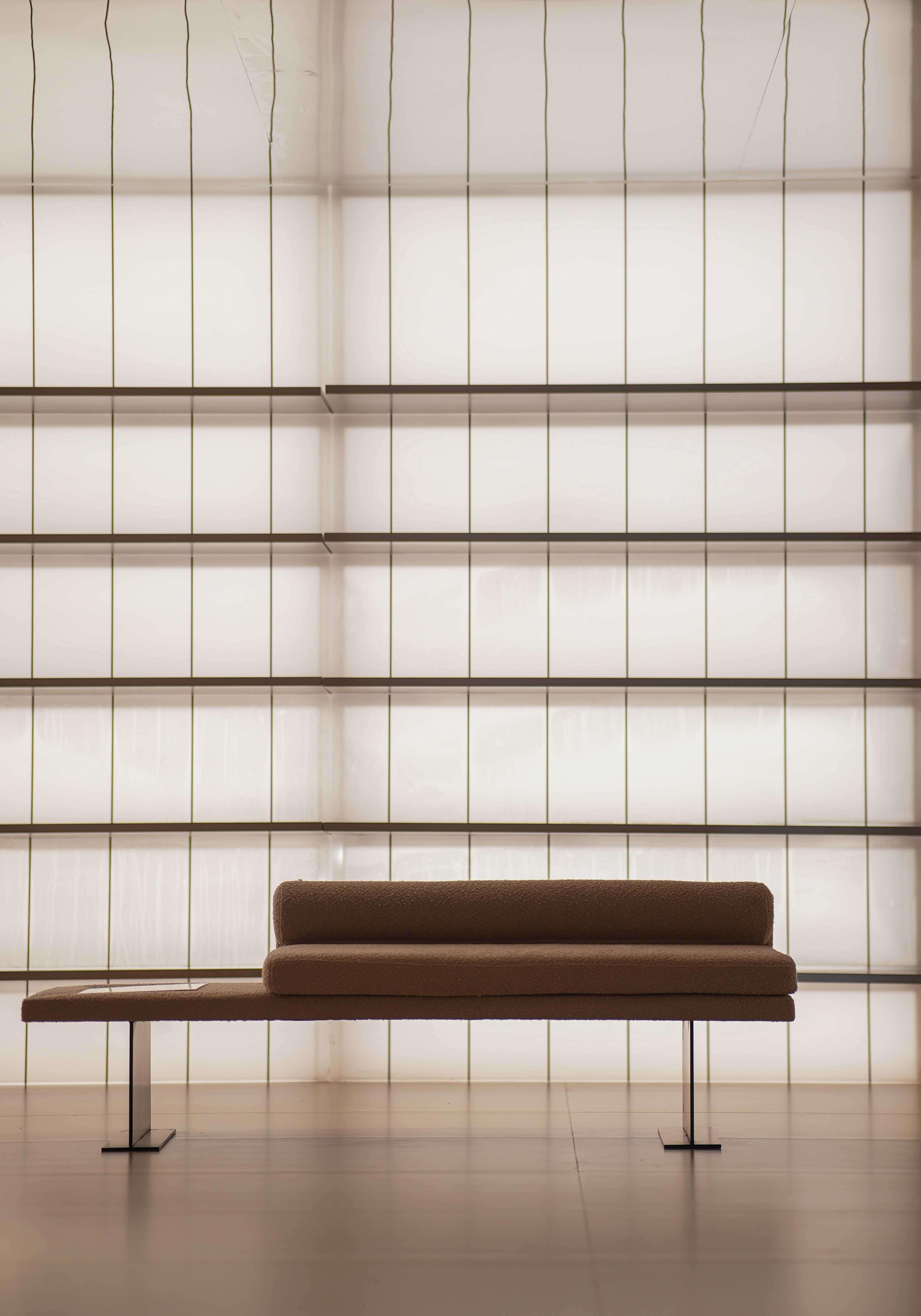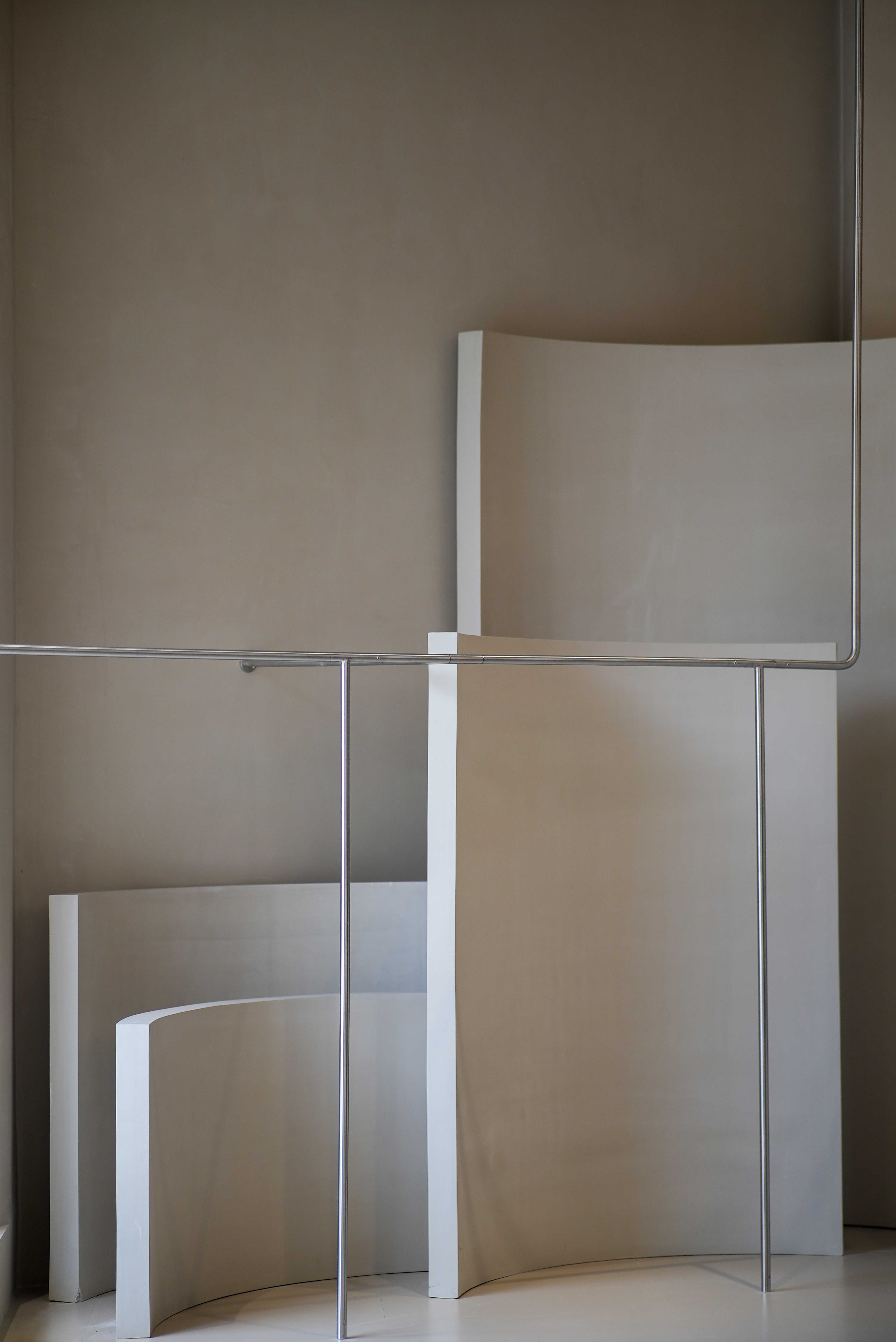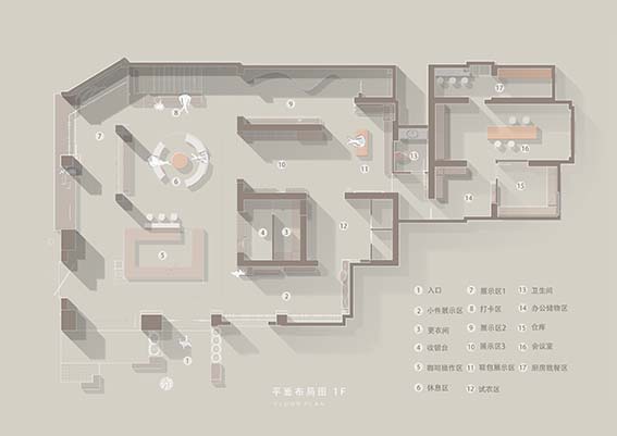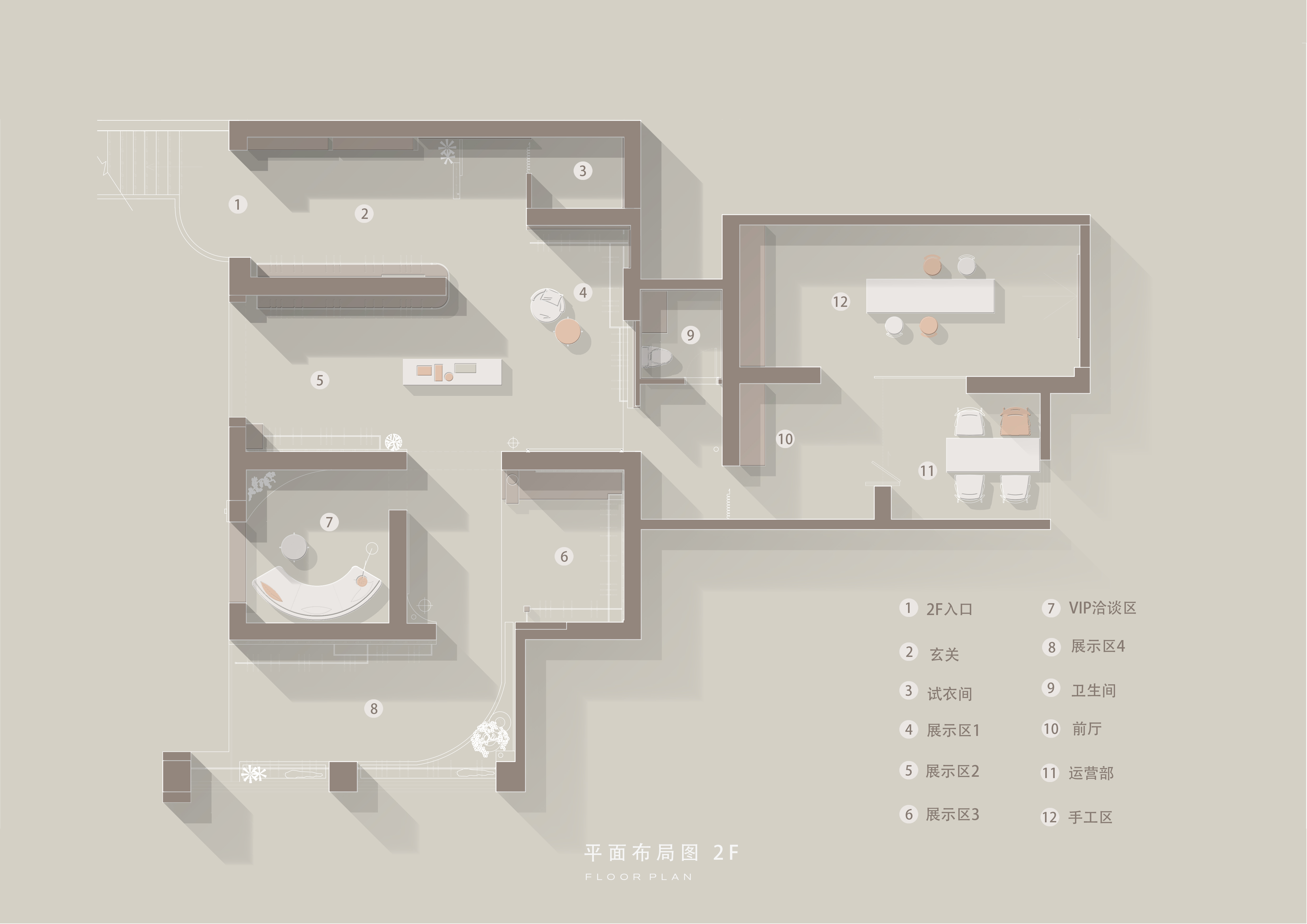 没有张扬的logo或喧嚣的色彩,以完全纯粹的暖白为底色,精准利落的线条及前倾的屋檐姿态提示着门店的入口。左侧墙面以透景的方式对空间再次切割,搭配光线的渗透,引导着向内探索的欲望。