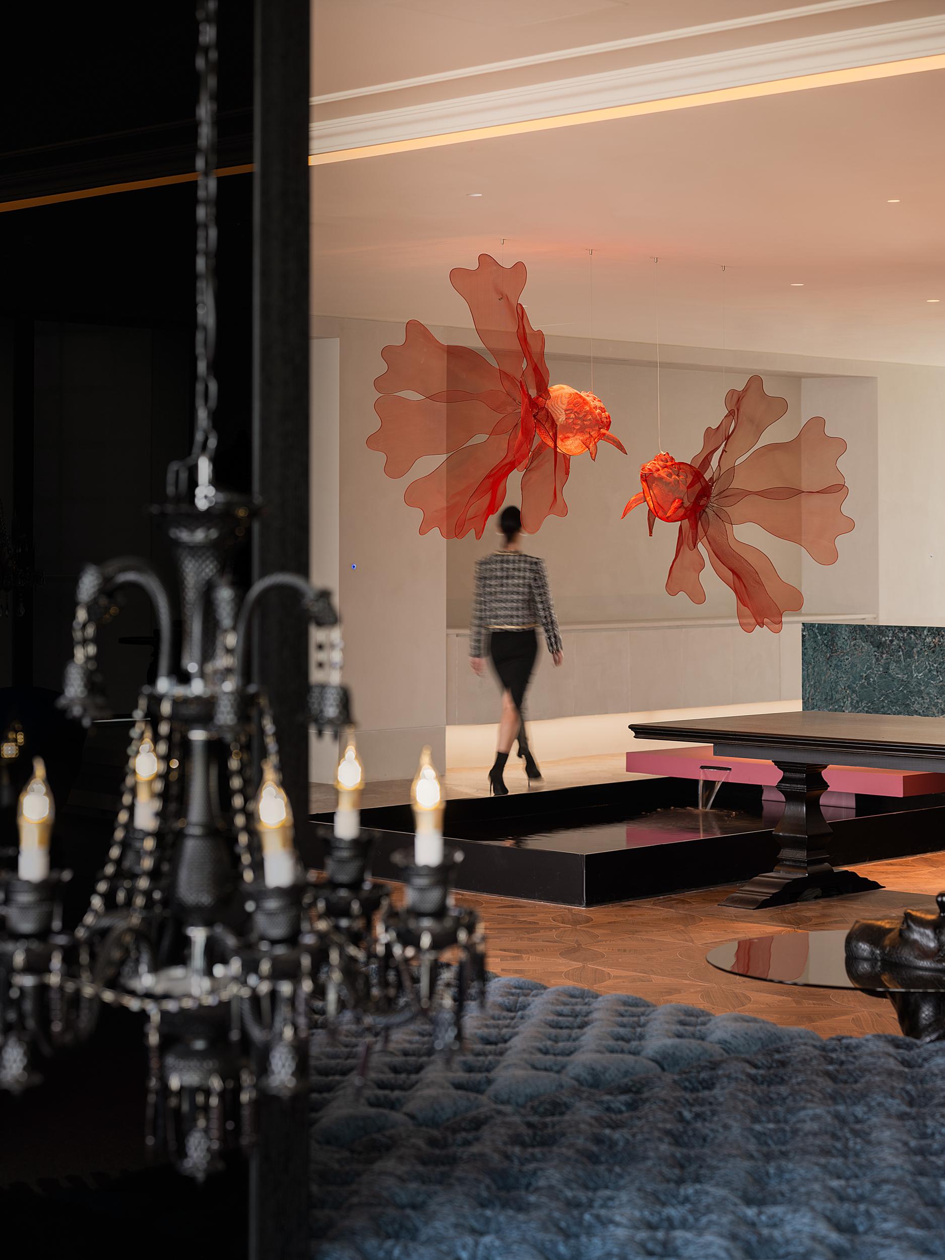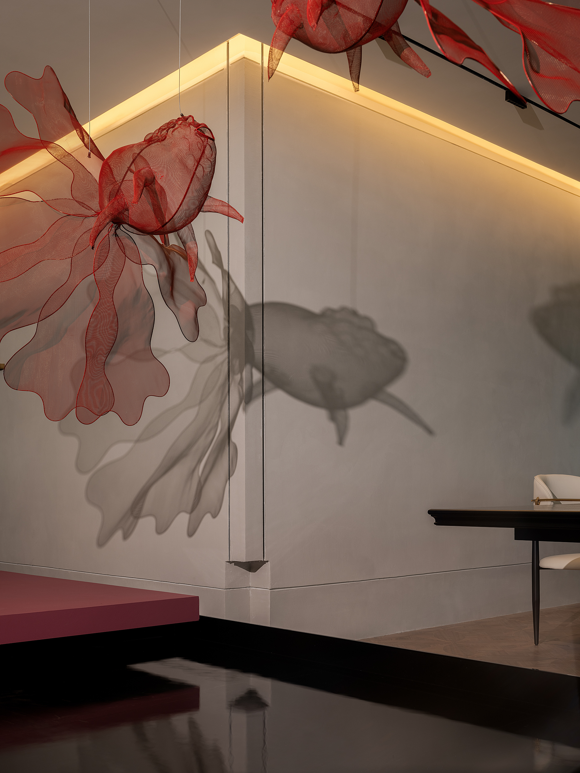 装置空间“游弋”,亦蕴含“鲤鱼越龙门”之意,在此,我们共同提升,赋予更好的自己。