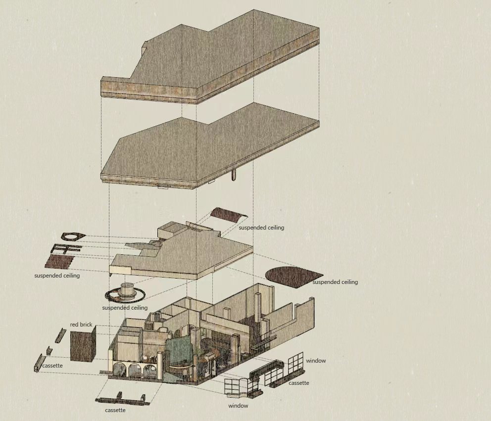 空间布局:我们依托场地形状,异面体块的切割和堆叠,模拟空间与光影相互交织的自然关系。用舒展的曲线建立动态的平衡,模糊室内与室外的界限,让开敞与封闭共存。矛盾的平衡与共存衍生出生机与耐人寻味的意境,内与外,同体不离。