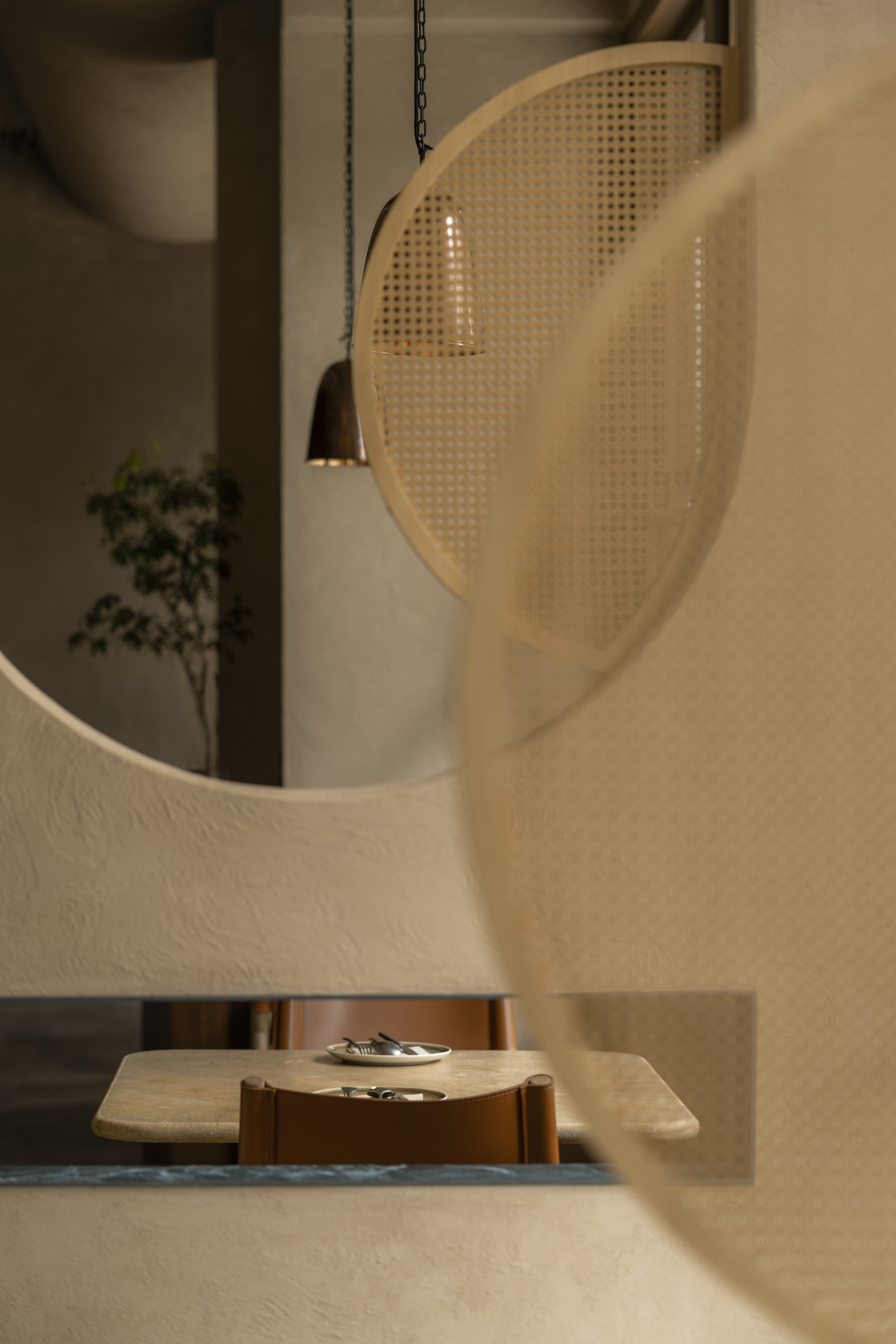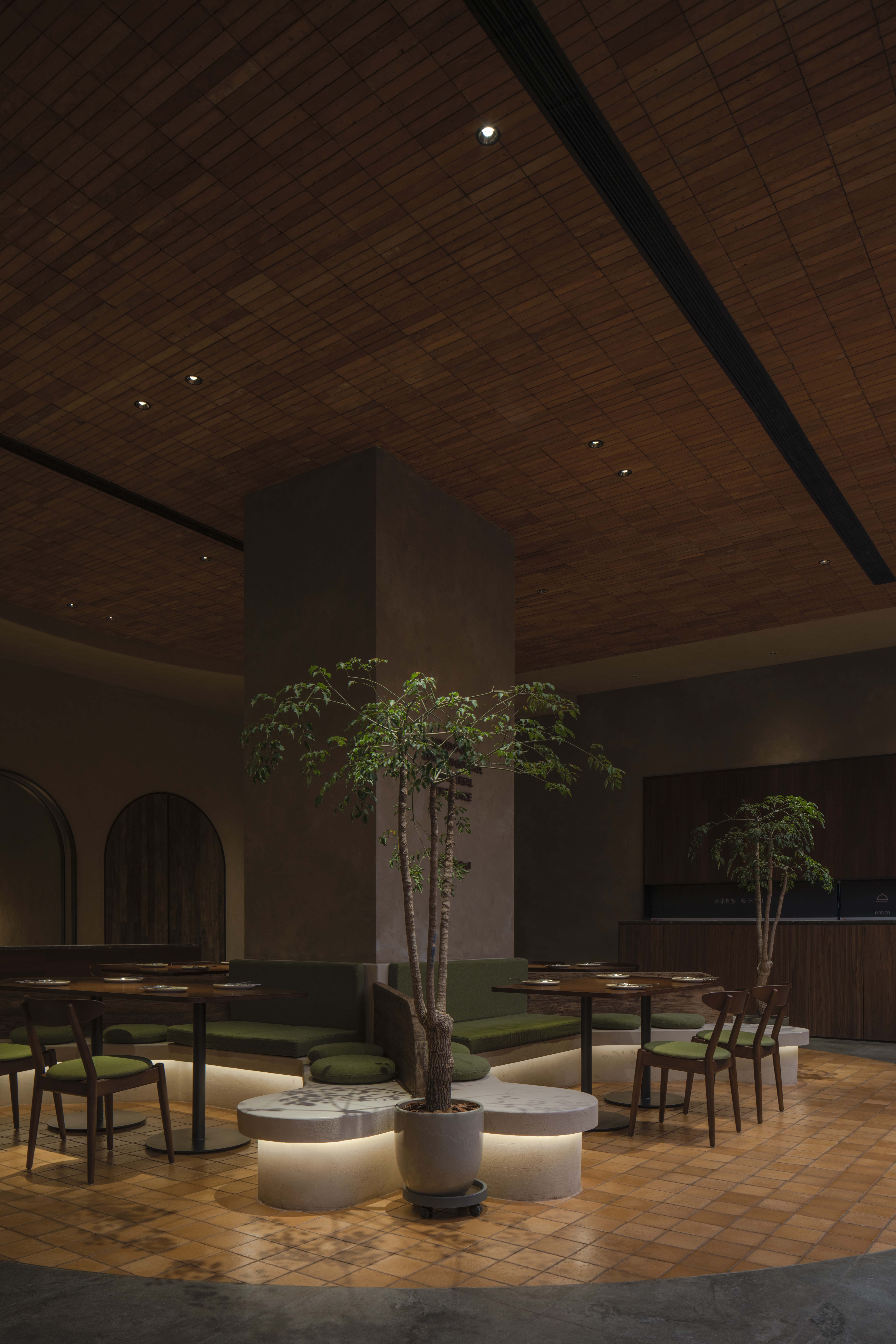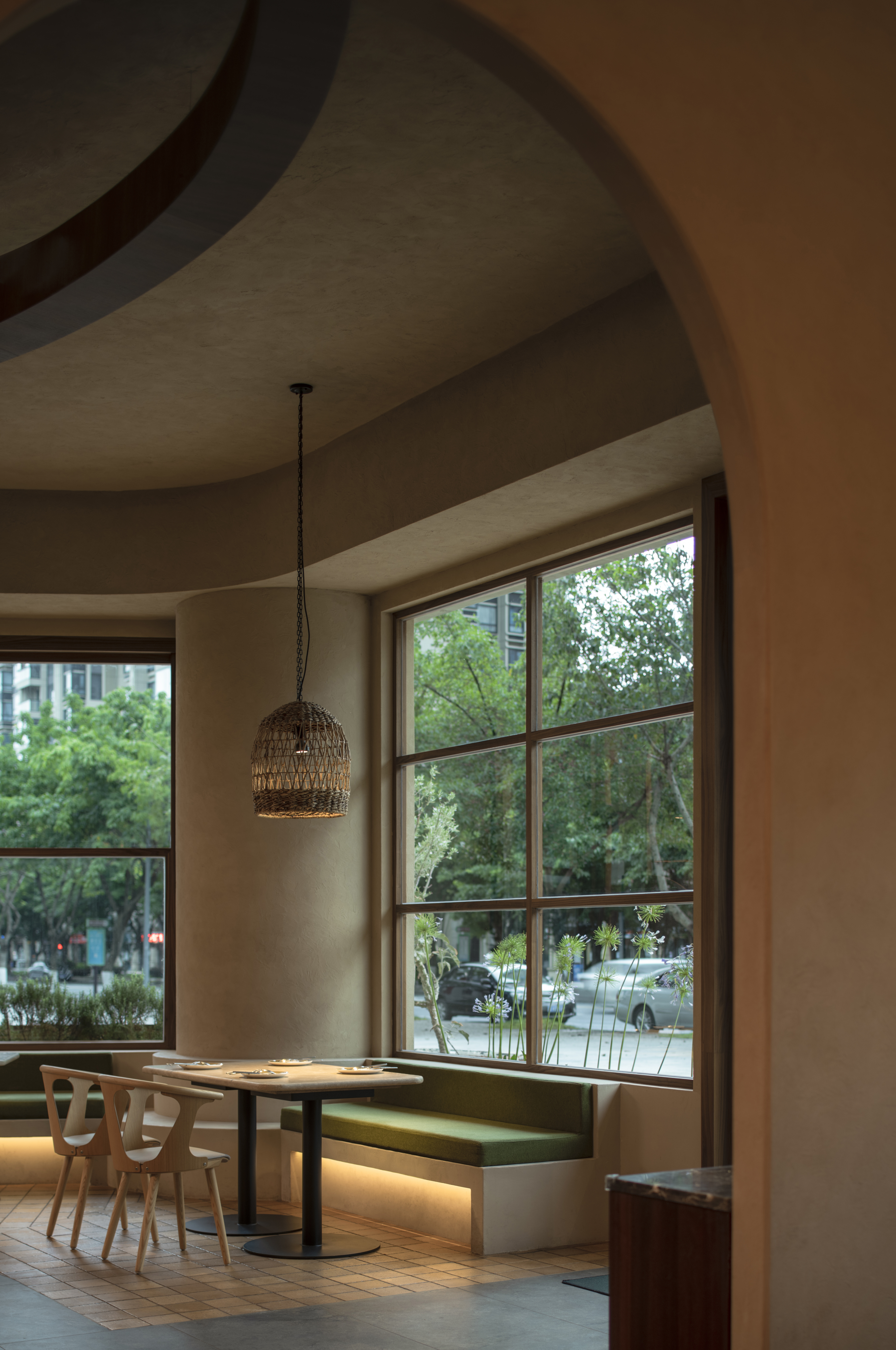 空间意境:自然光线从外面渗透进来,突出了精心挑选的材料的微妙色彩和丰富纹理时,也让空间倍感温馨。就如同许多食材的香气是充满活力与自然的,构成建筑的材料也是如此,结合微妙温润的叙事,以及精心策划的建筑框架,空间氛围深深植根于当地环境中。