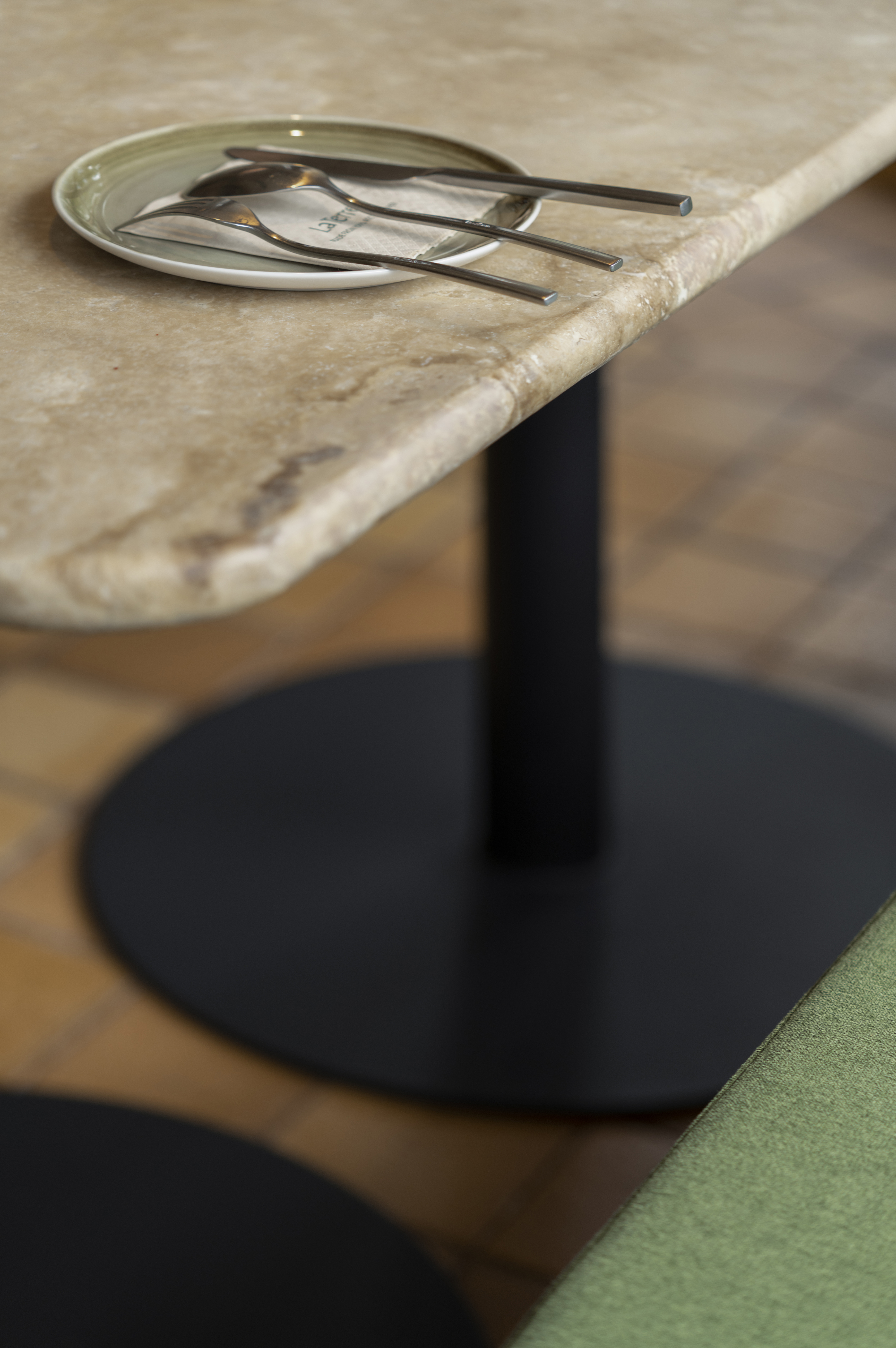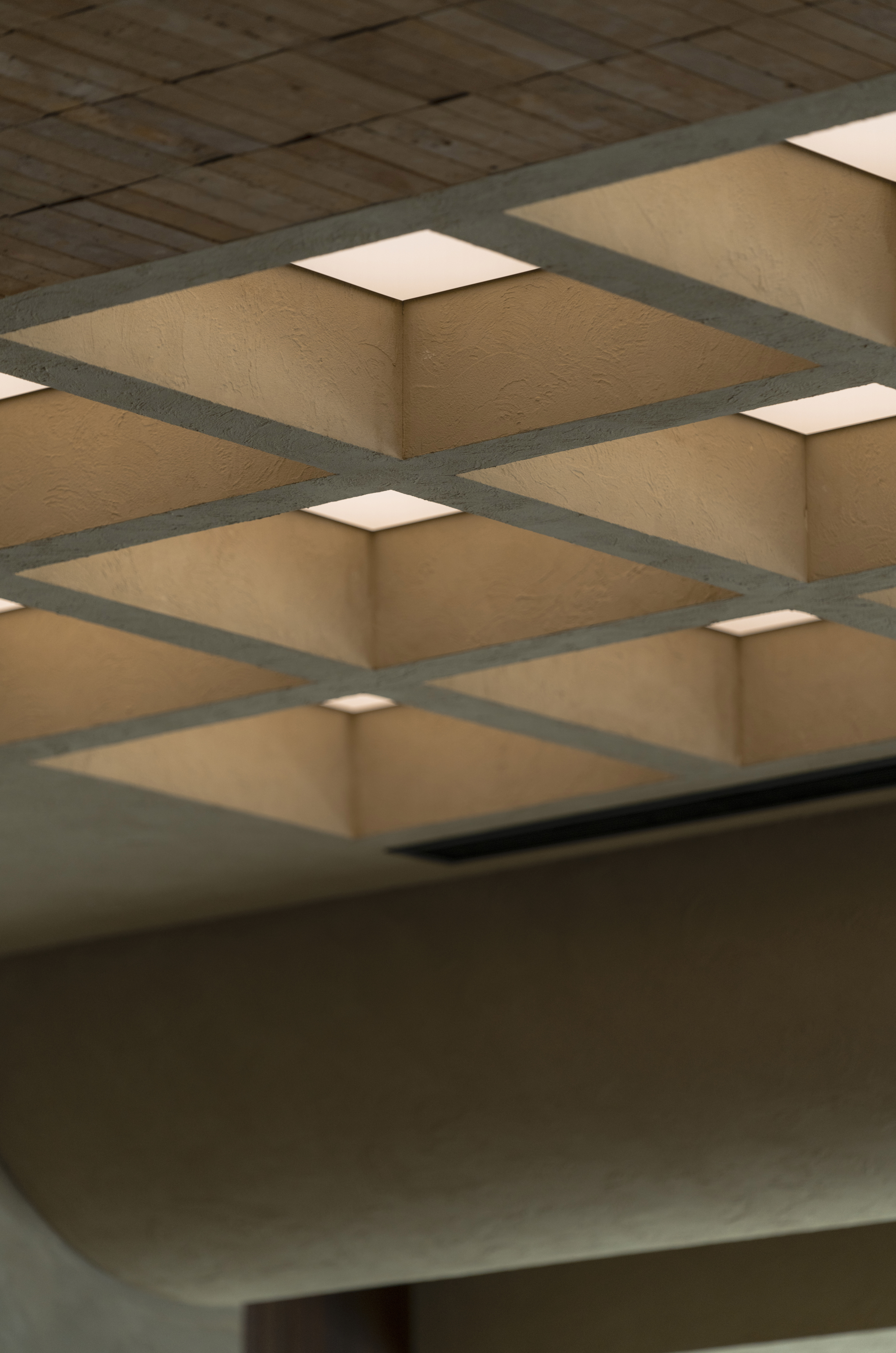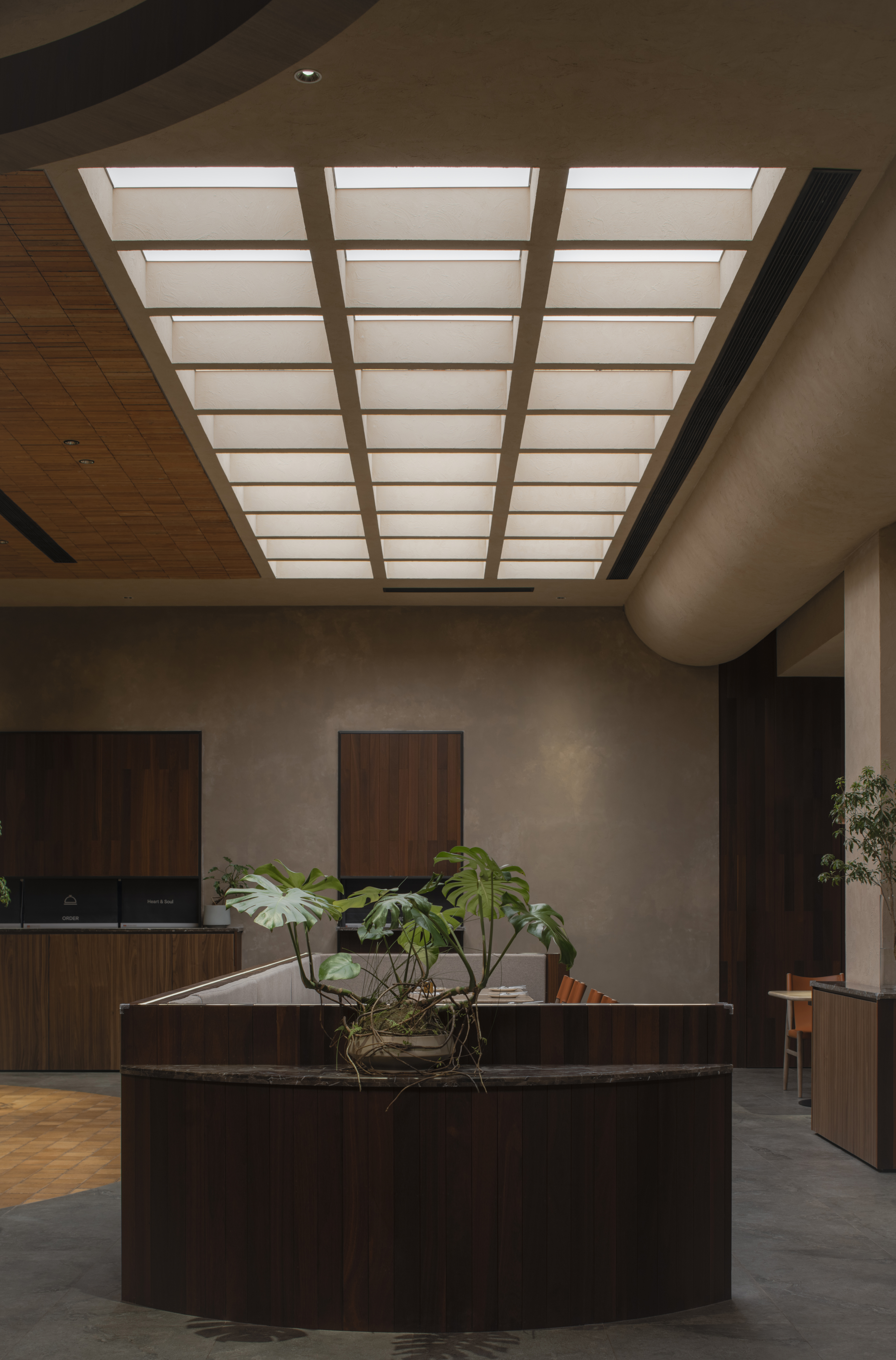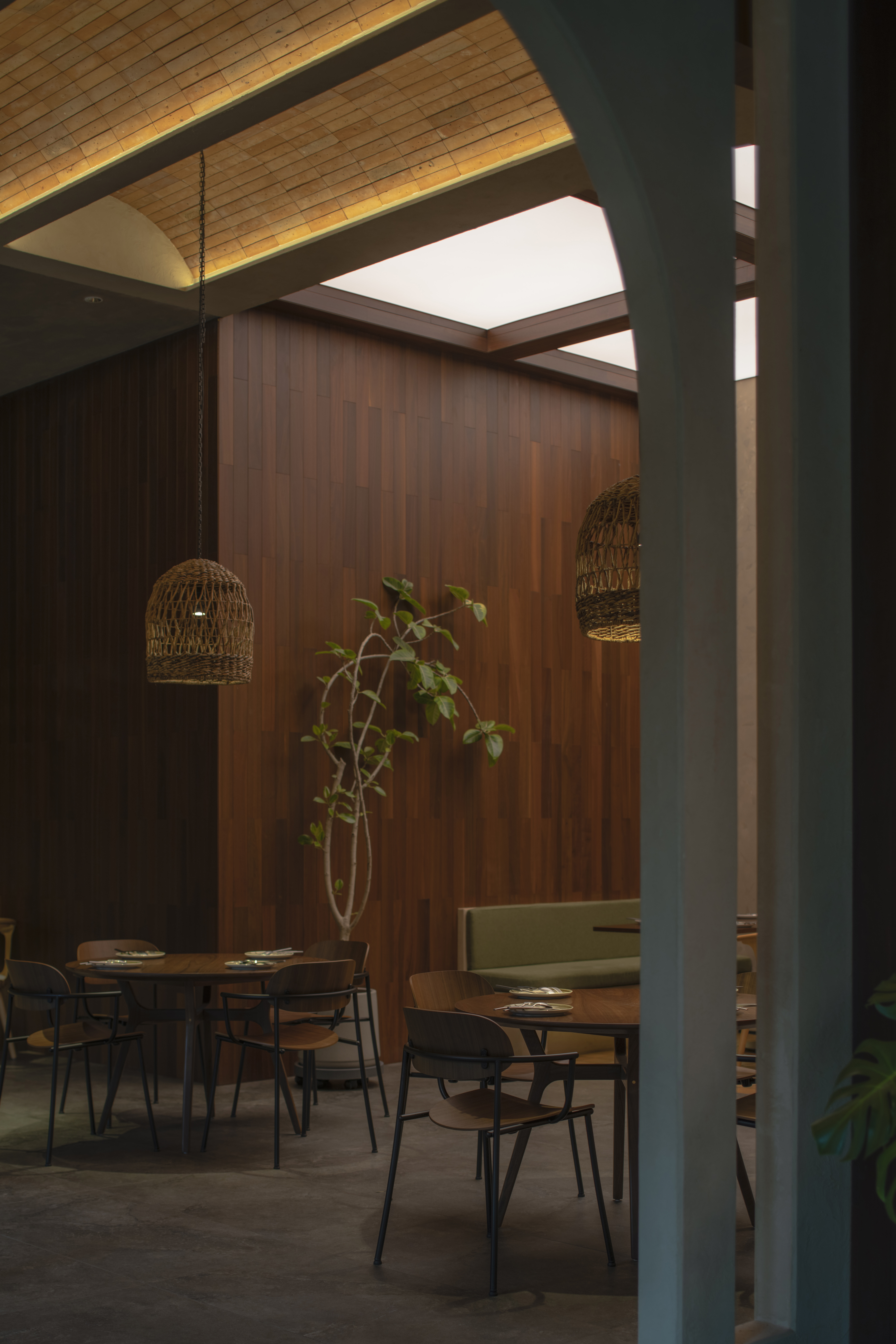 空间意境:自然光线从外面渗透进来,突出了精心挑选的材料的微妙色彩和丰富纹理时,也让空间倍感温馨。就如同许多食材的香气是充满活力与自然的,构成建筑的材料也是如此,结合微妙温润的叙事,以及精心策划的建筑框架,空间氛围深深植根于当地环境中。