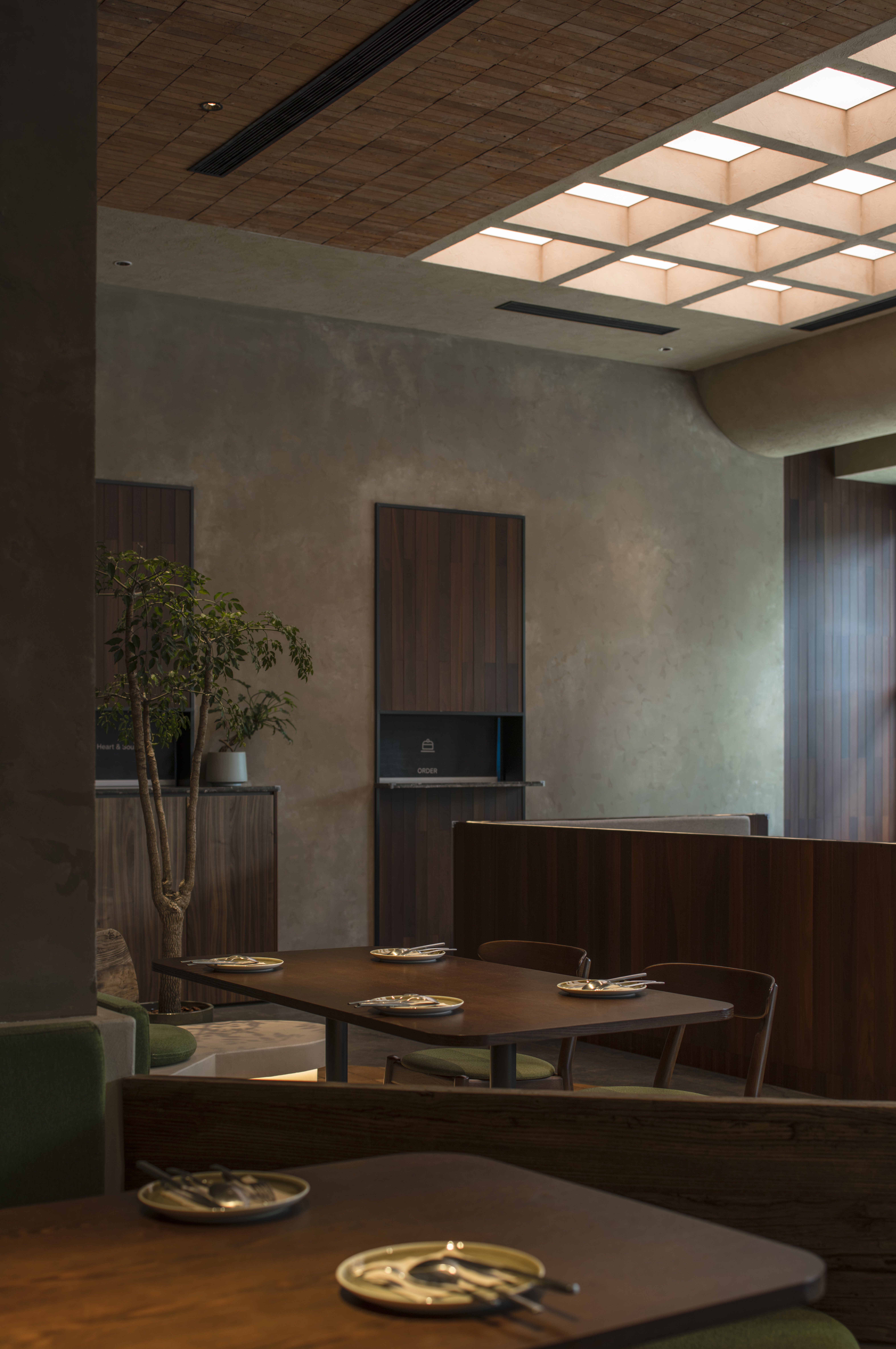 ⼈造⽽⾃然的空间,庄重却近亲的氛围,以⽭盾的共存传递自然食物哲学。 -