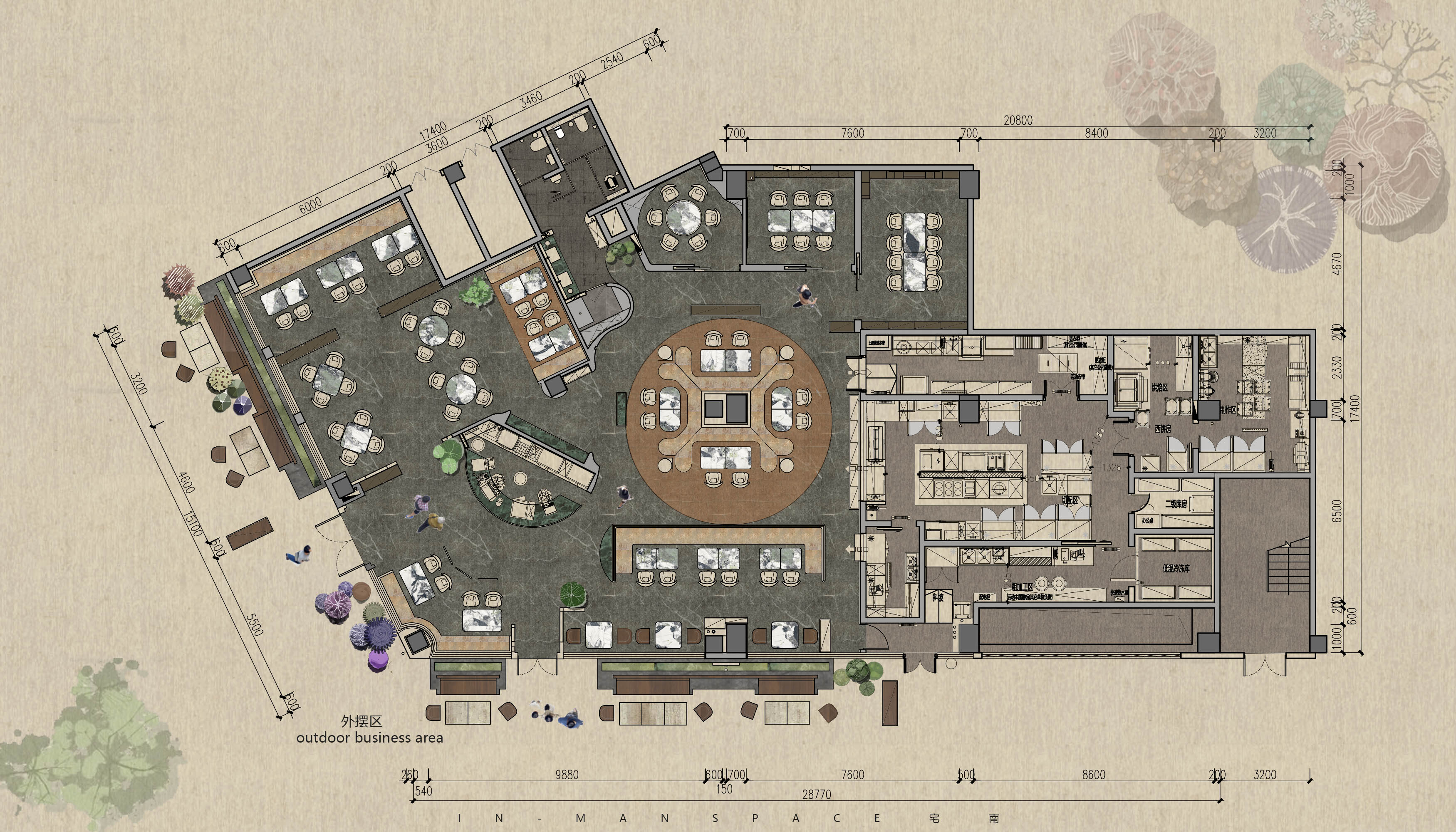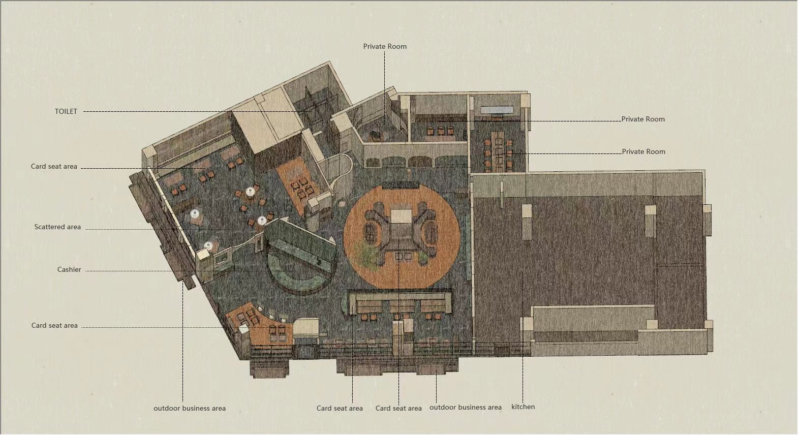 最大限度提高空间的利用率,控制住消费氛围的热烈与功能性区域的可达与意趣,做到动静适宜,设计师将直白的话语转化为视觉系统。