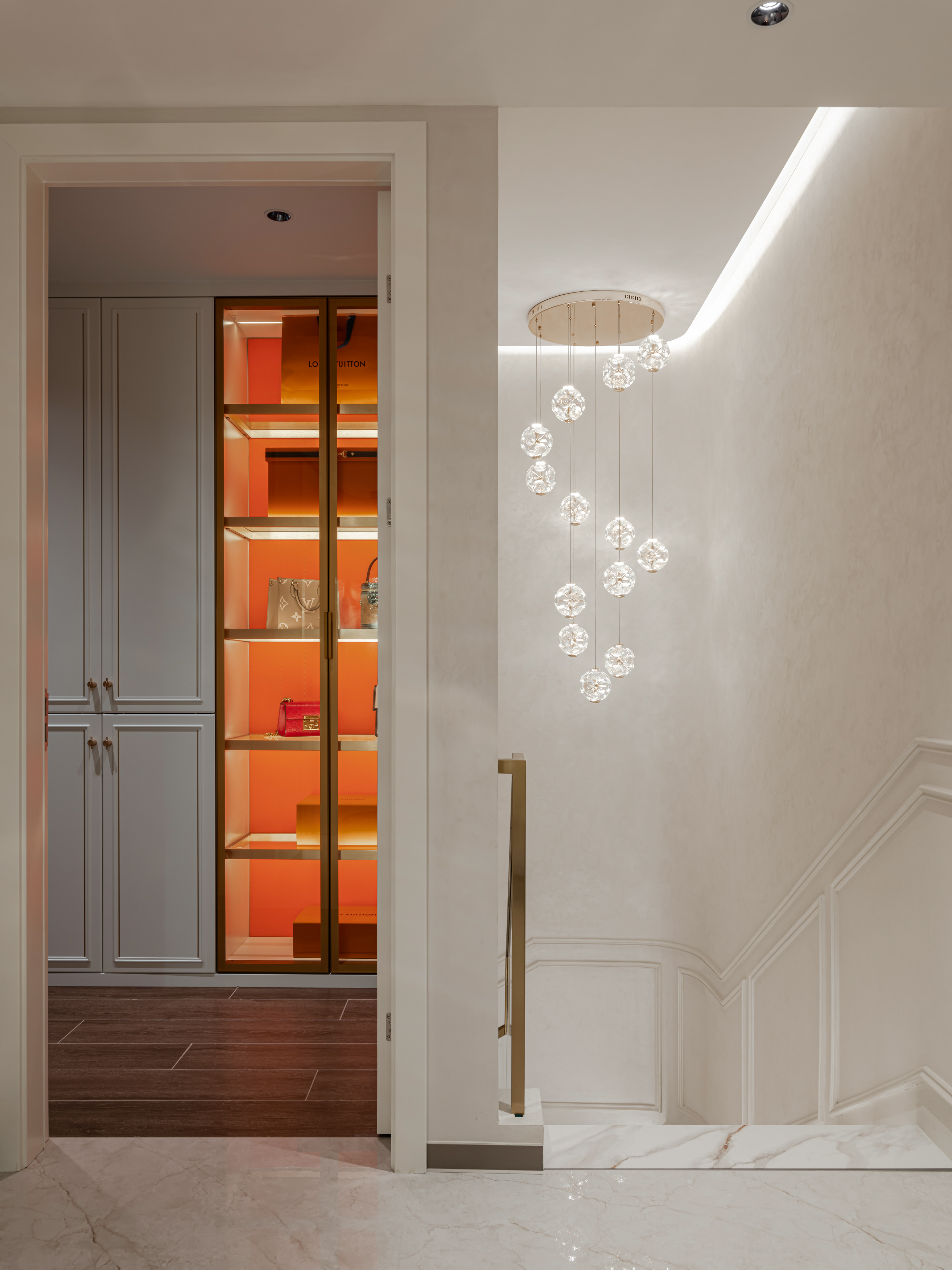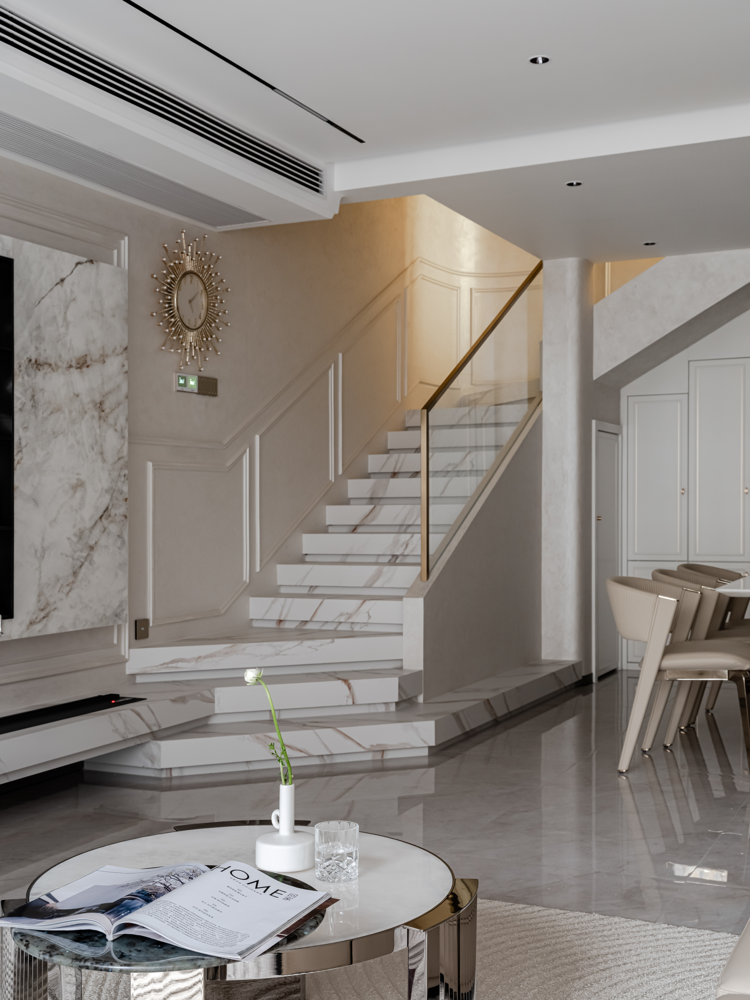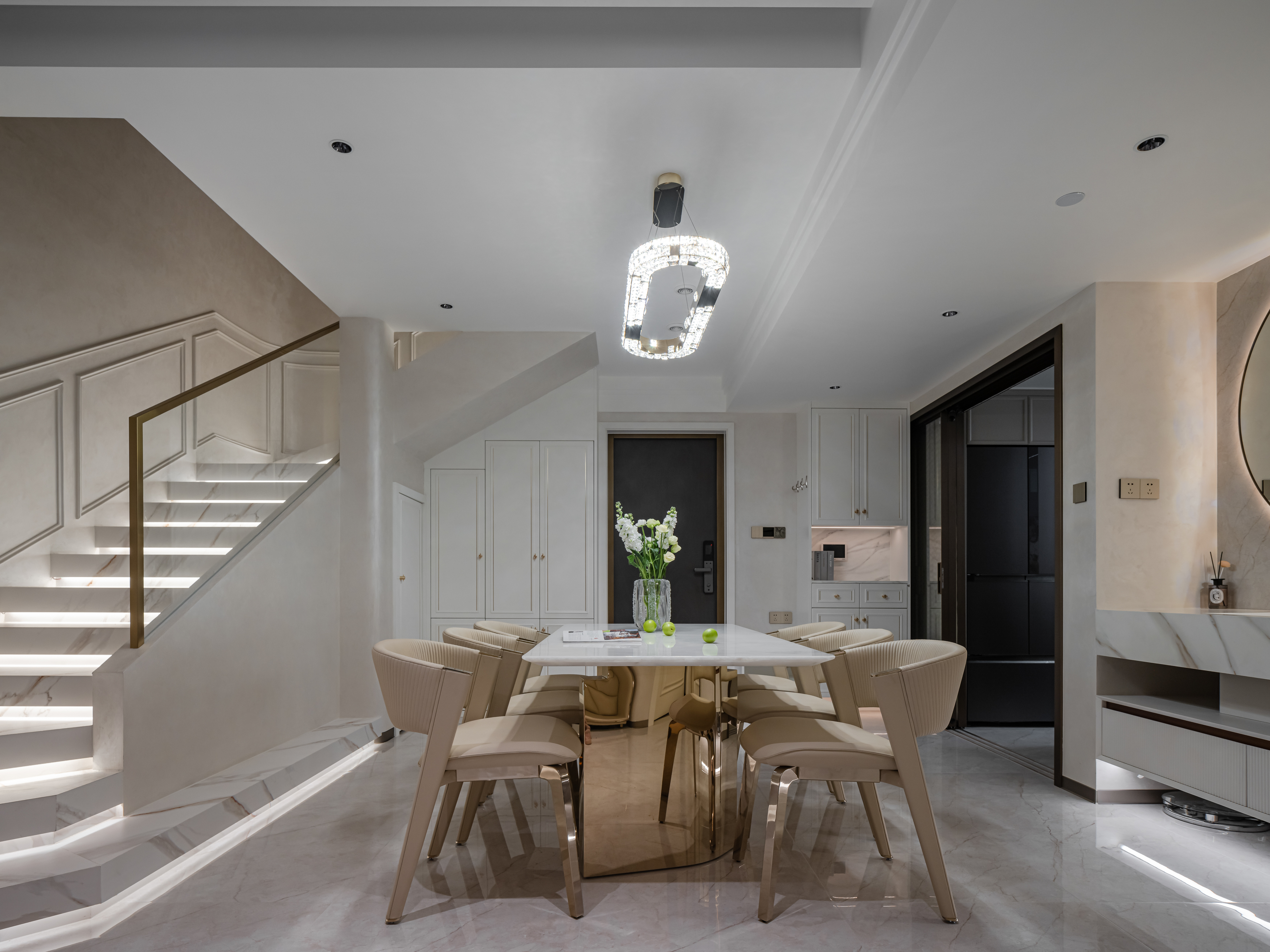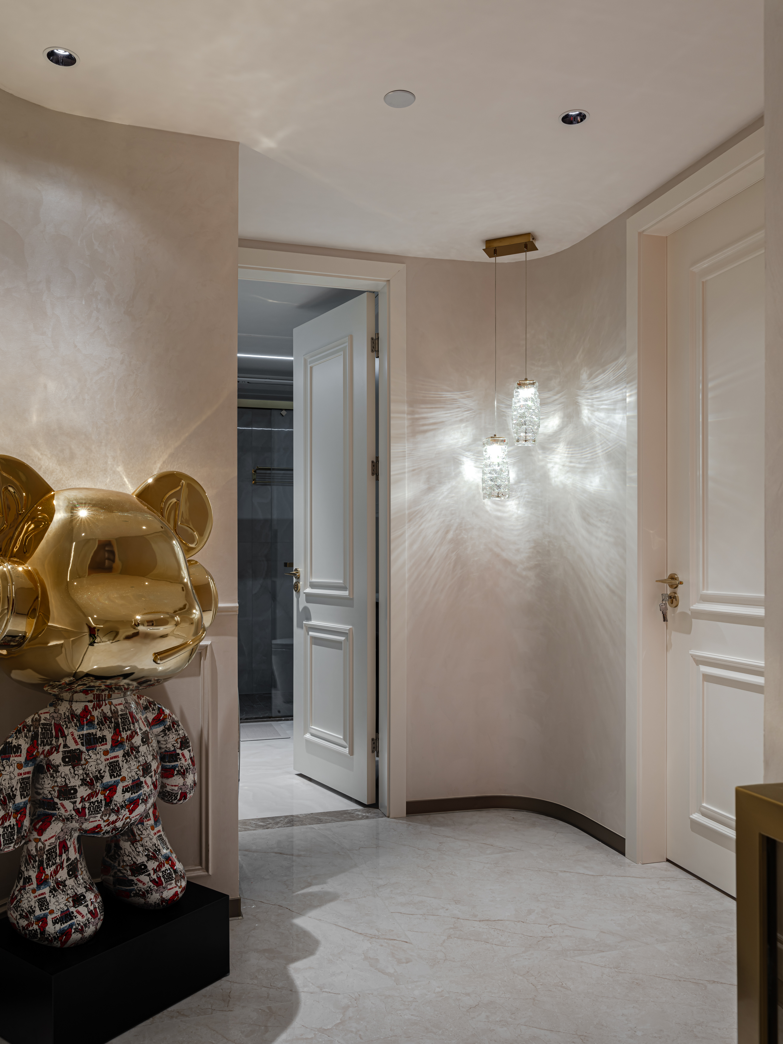 屋主人是一对经商的夫妇,有一个可爱的女儿。从刚一开始,两位就提出居家设计希望能尽显空间宽敞与大气,同时能具备一些仪式感,满足经常要在家里款待客人的需求。设计师在了解此愿景后,结合对房屋以及环境条件的详细研究,决定将空间打造成为一个「明亮轻奢」中尽显温柔的华丽之家。