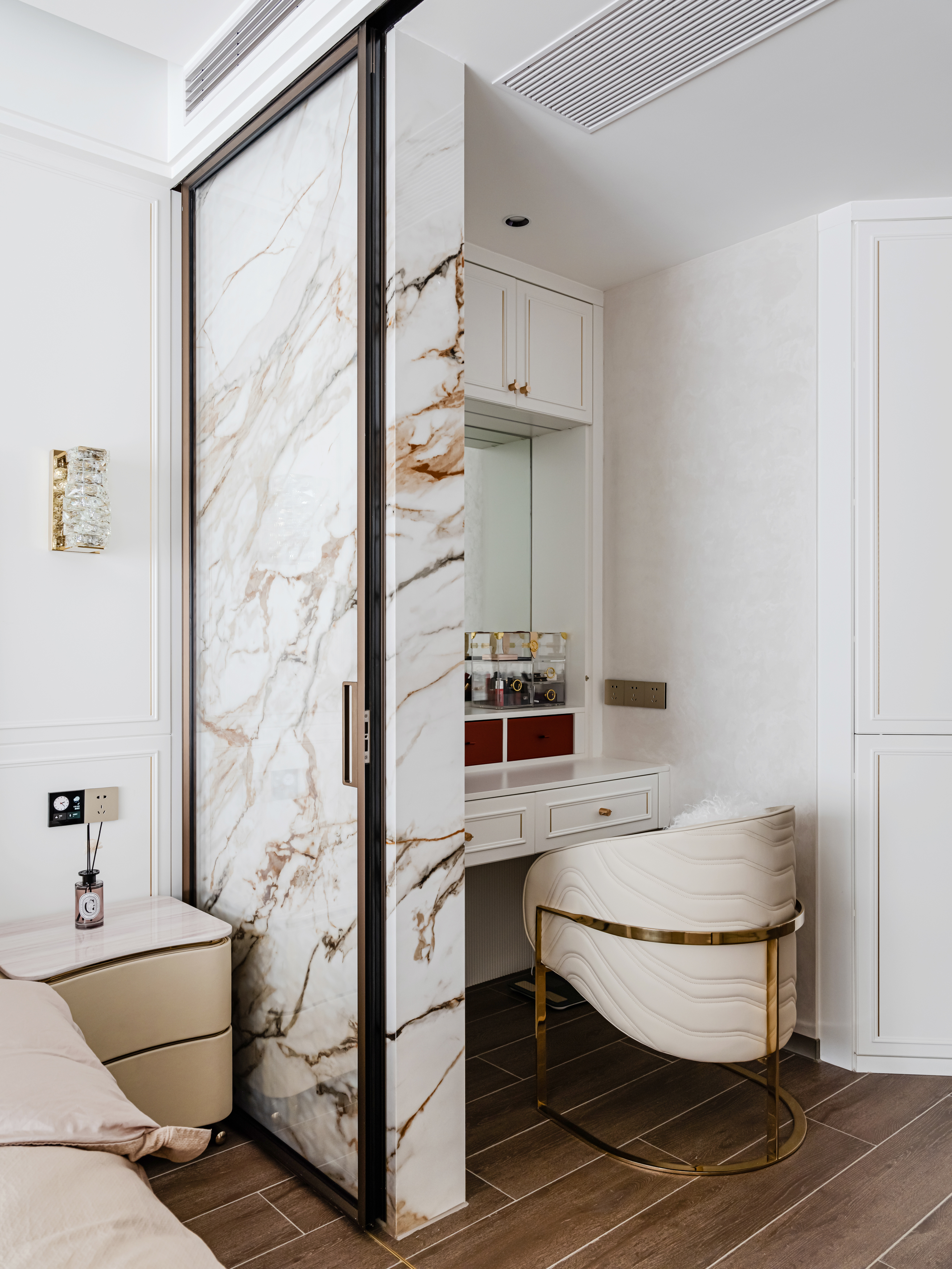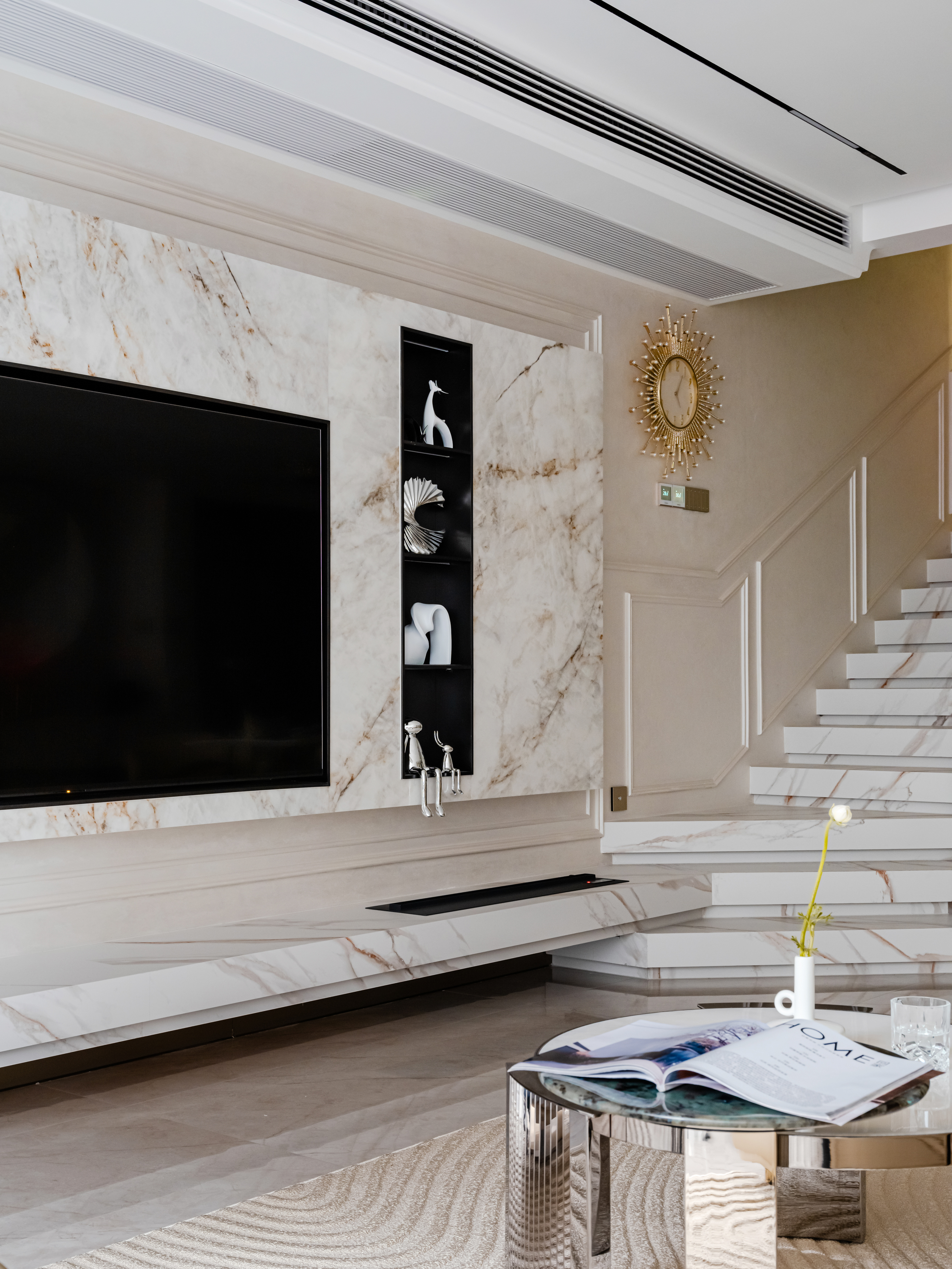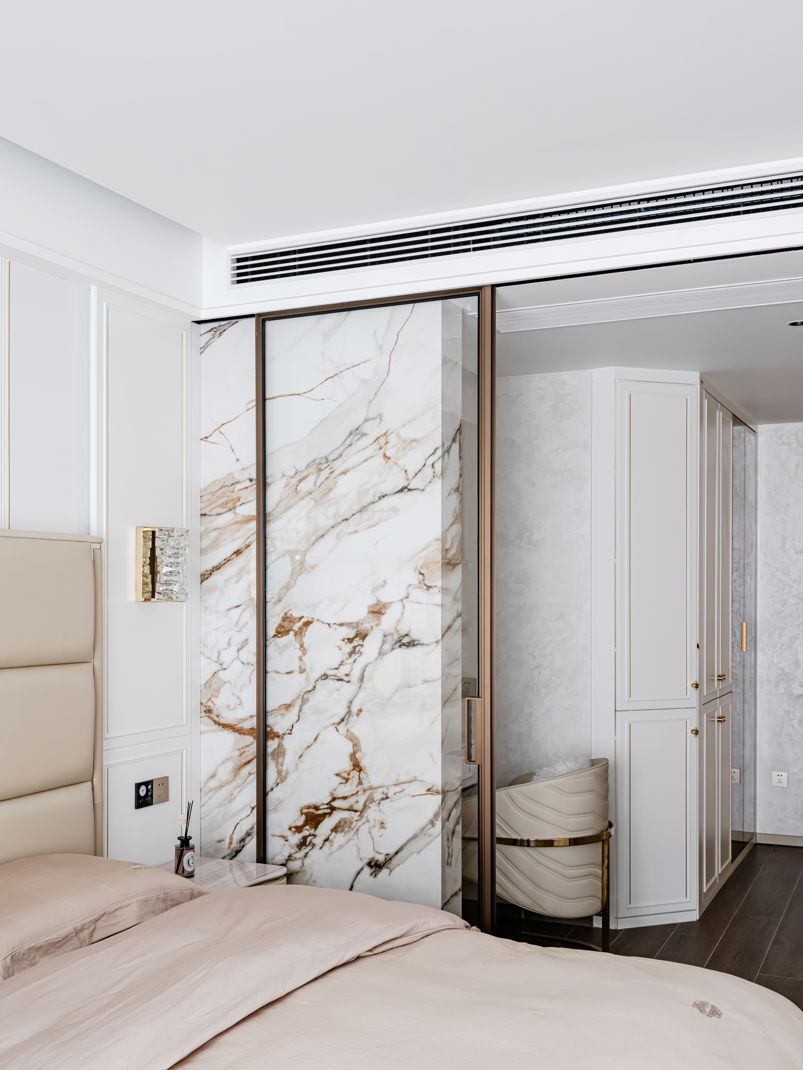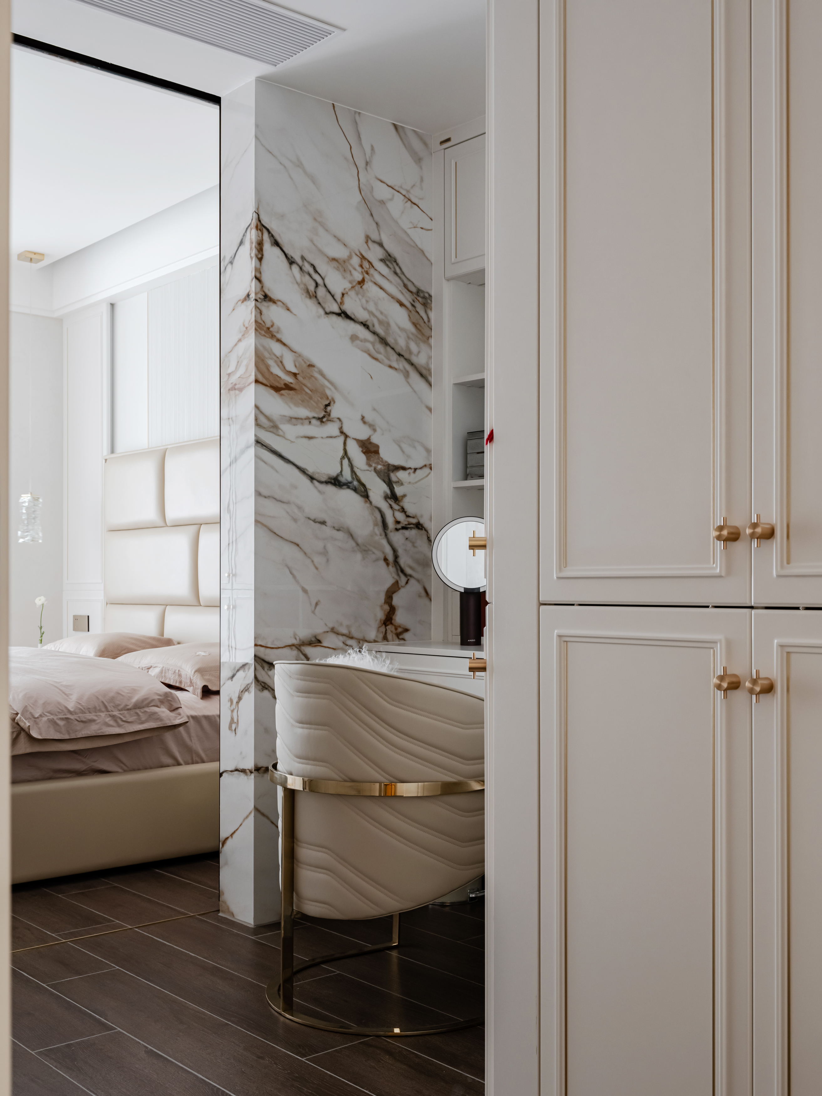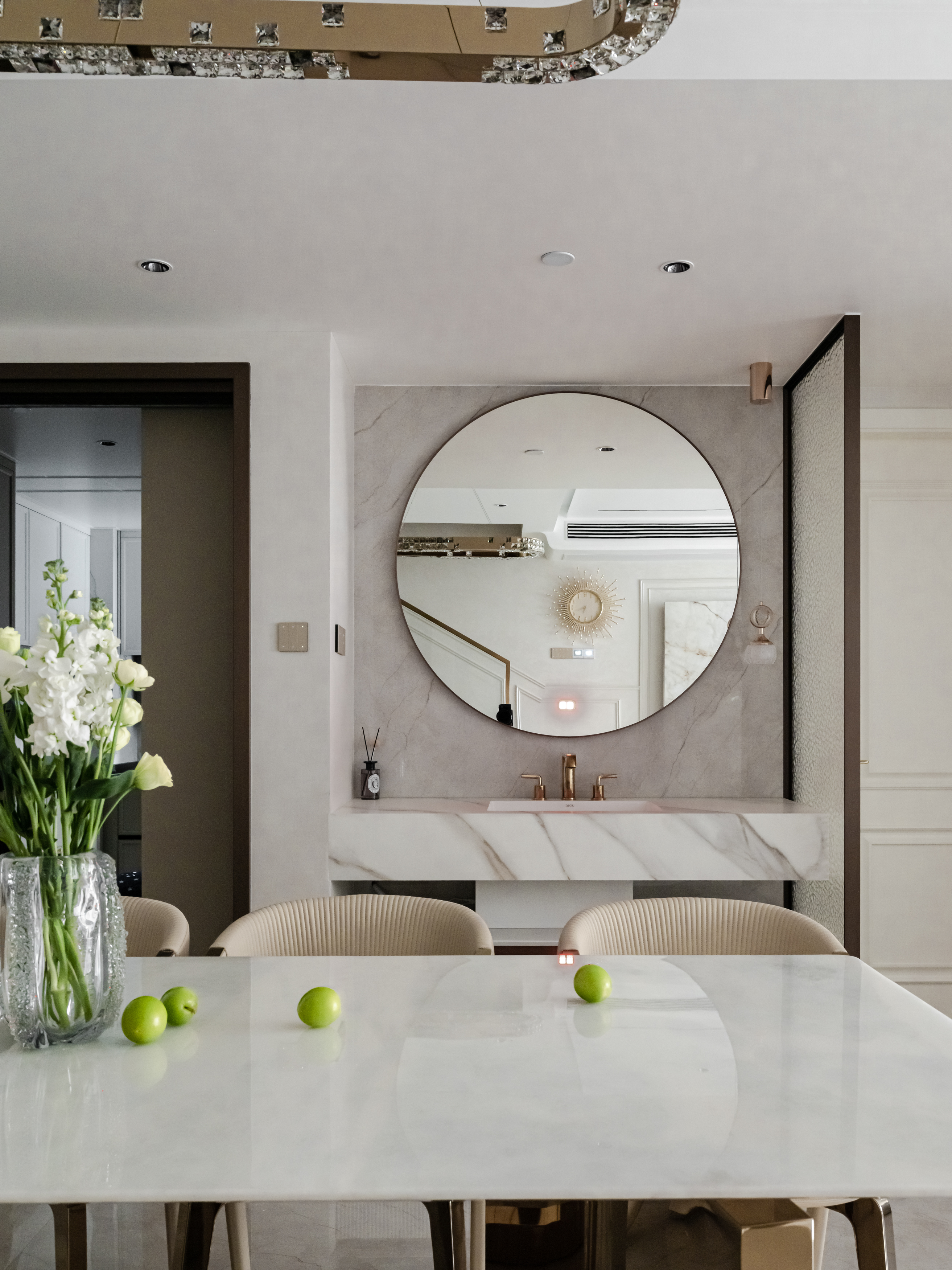 大理石的清冷高贵,需要温润质感的木饰面来中和,让空间尽显奢华的同时,有丝「拙」的意味
