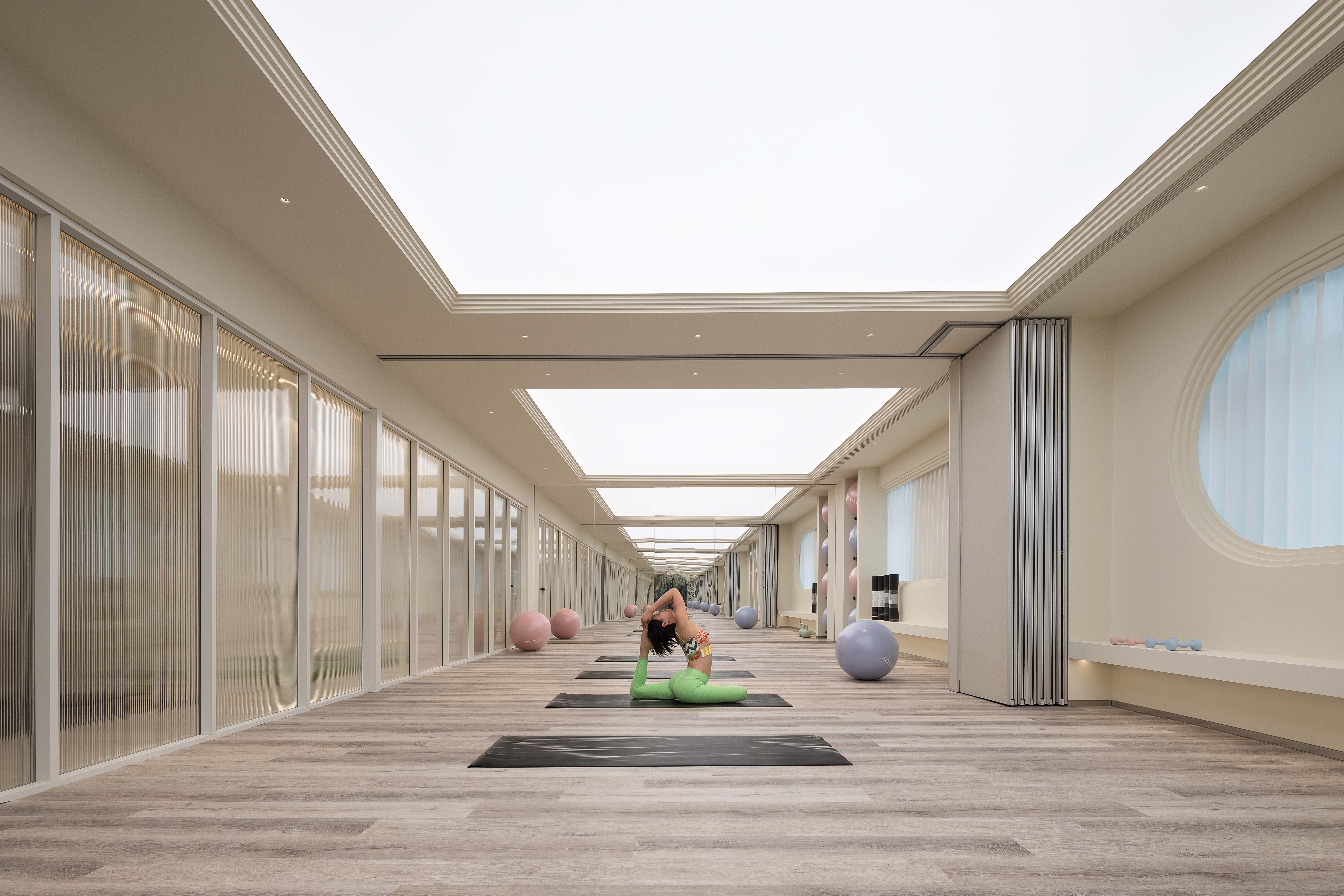 普拉提器械室,专业的器械室空间突出的核心,因此设计师将空间和器械间的安全距离设定好,不使用任何直射灯光,软膜天花模仿自然空间,圆弧的演绎在窗户一侧进行展现,我希望在此,你可以静下心来找自己。