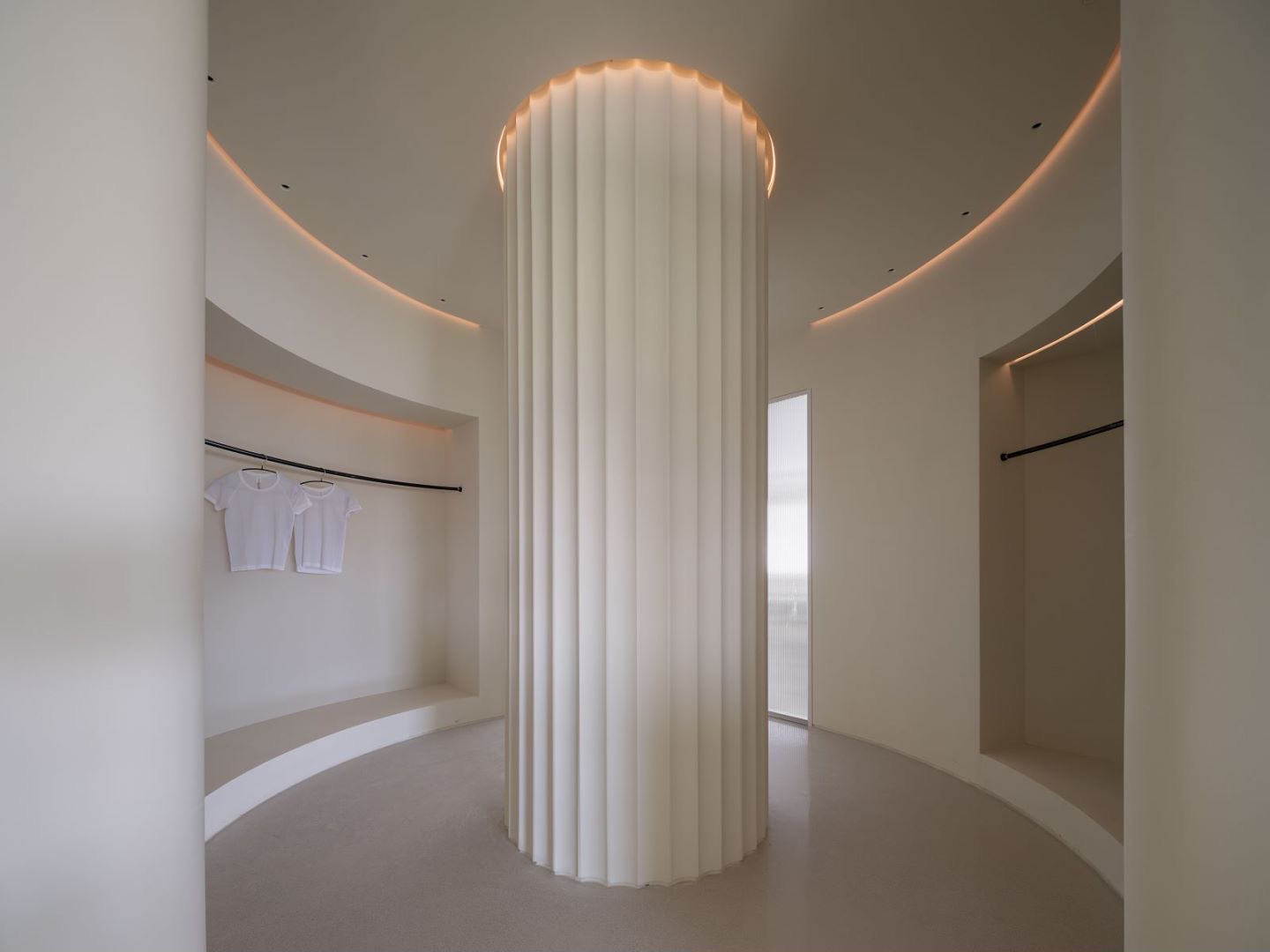悄 然 前台接待区到健身区,中间做了停顿连接点,此处作为专业普拉提的装备展示区,原始的建筑承重方柱子设计师做了巧妙“消隐”,将柱子圆形化,石膏线瓦楞的视觉层次感,同时将此处空间动线一分为二,既能满足停留驻足细看的时间,也互不打扰,视线的最远处,刚好看到入户盒子门,多方的互动悄然发生。