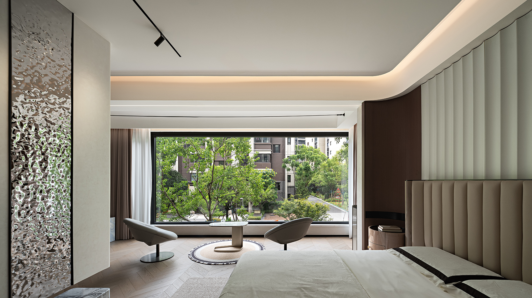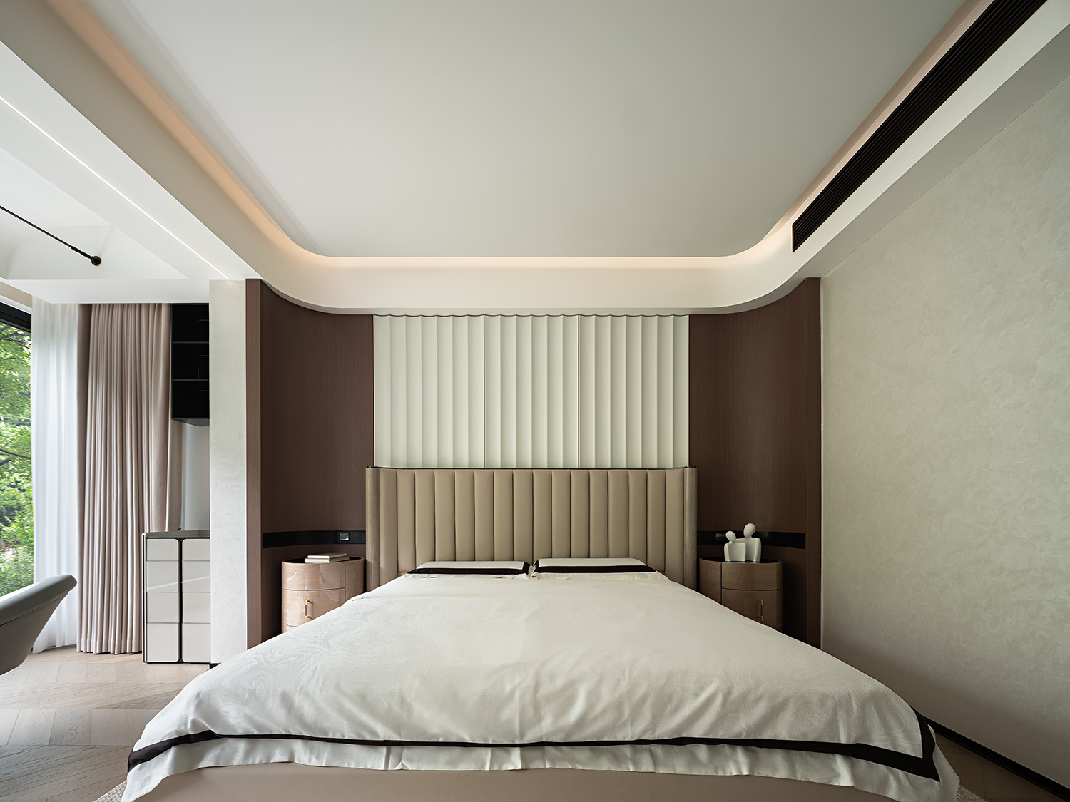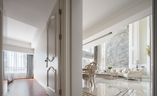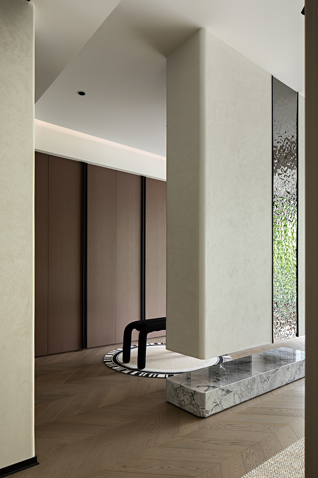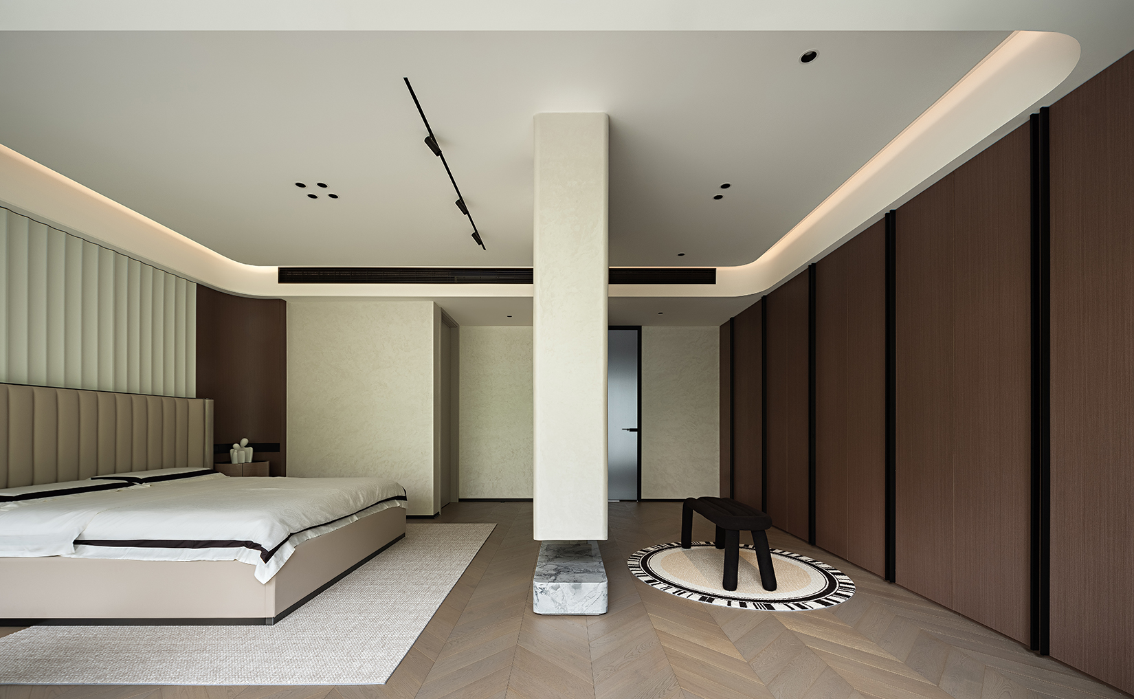 主卧与衣帽间的装饰隔断墙,即美观又在后面做了收纳功能;
