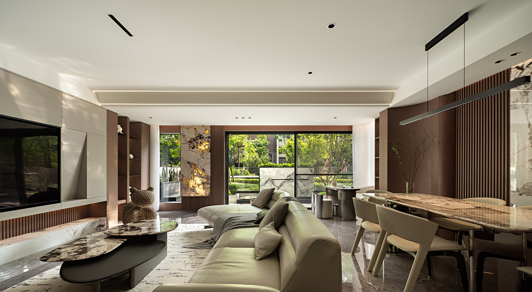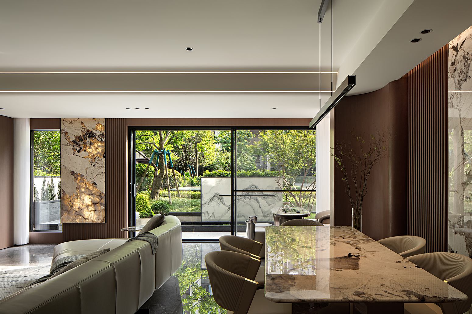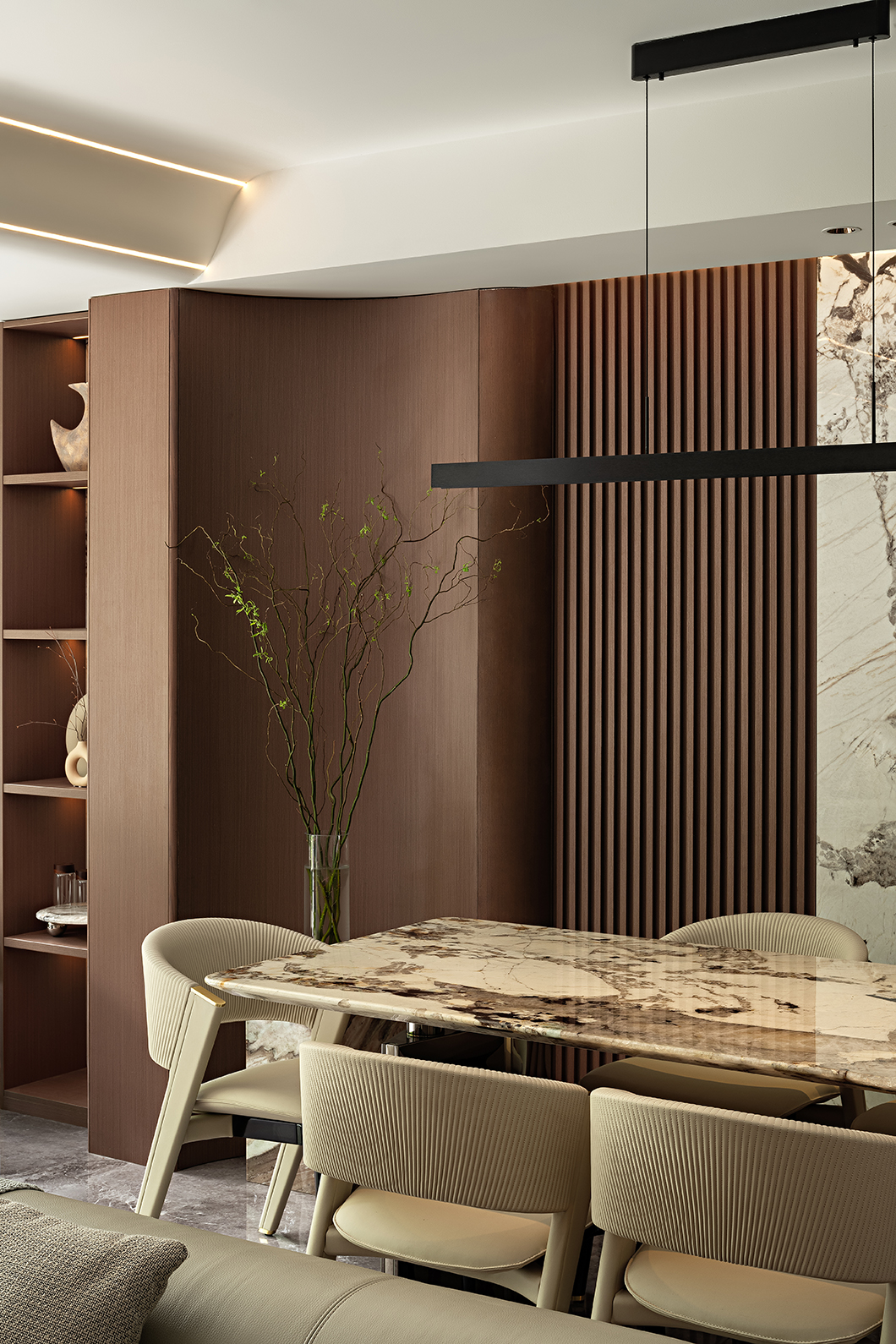 负二背景运用超大岩板与深色木材相互映衬,营造出奢华而又温馨的氛围,低调而奢华。