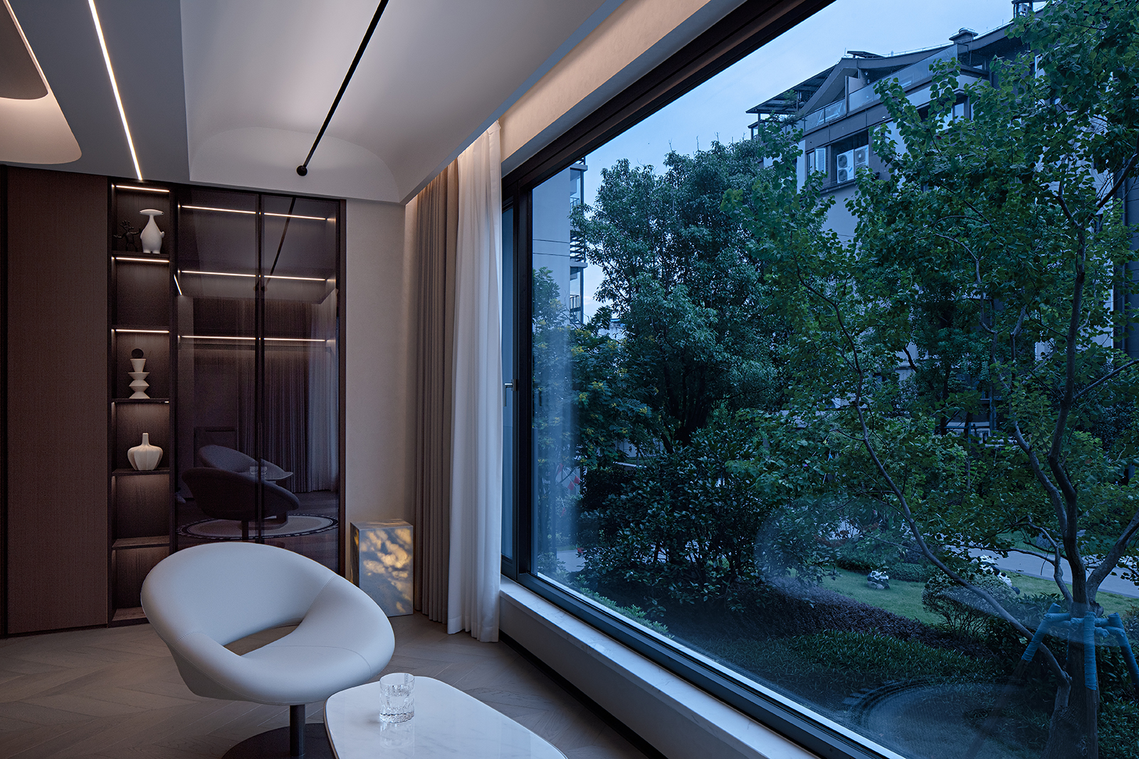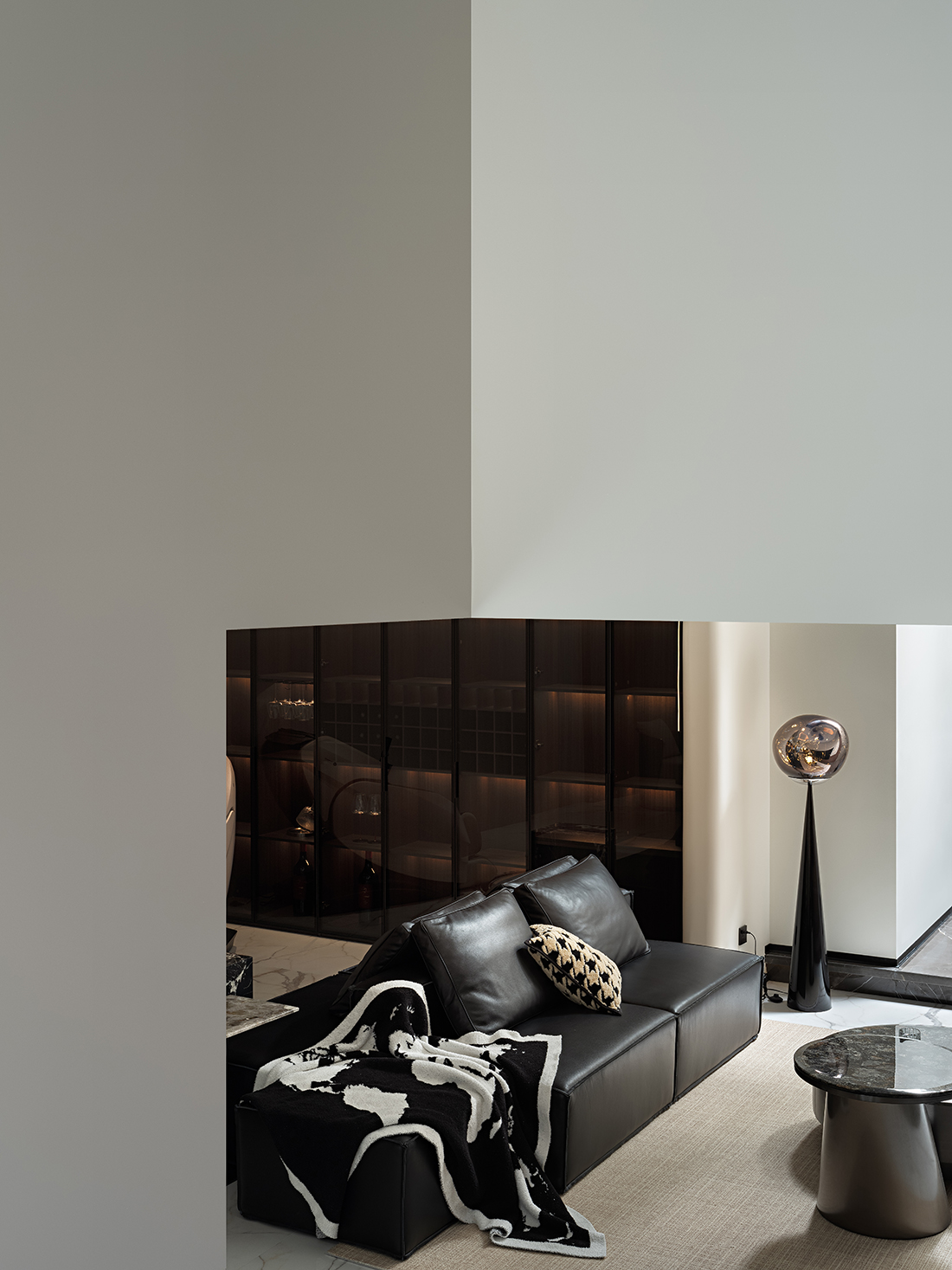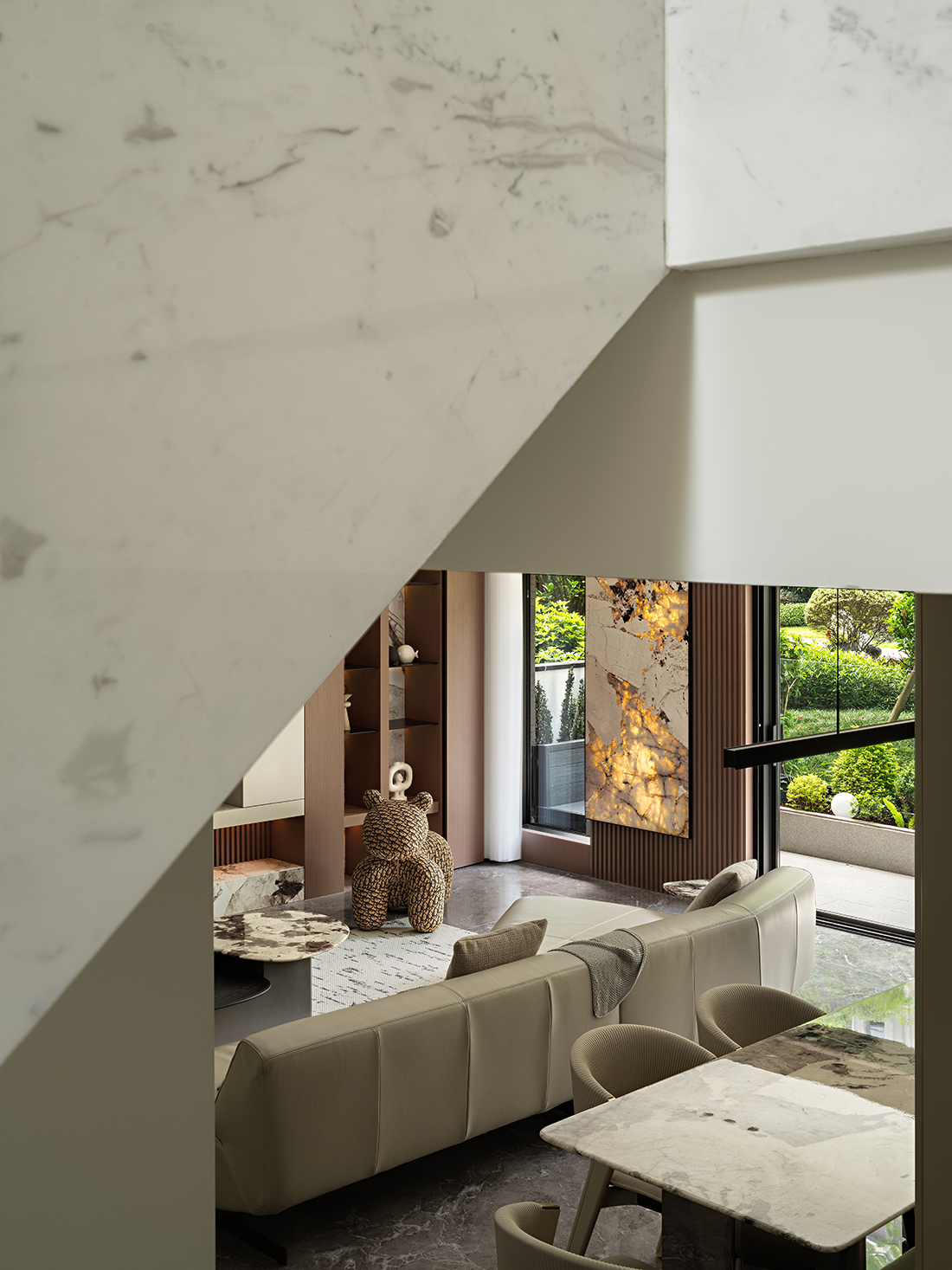 负二层高挑的客厅空间开阔,天窗将自然光线毫无保留地引入室内,光影在精致的PU石墙面上跳跃。