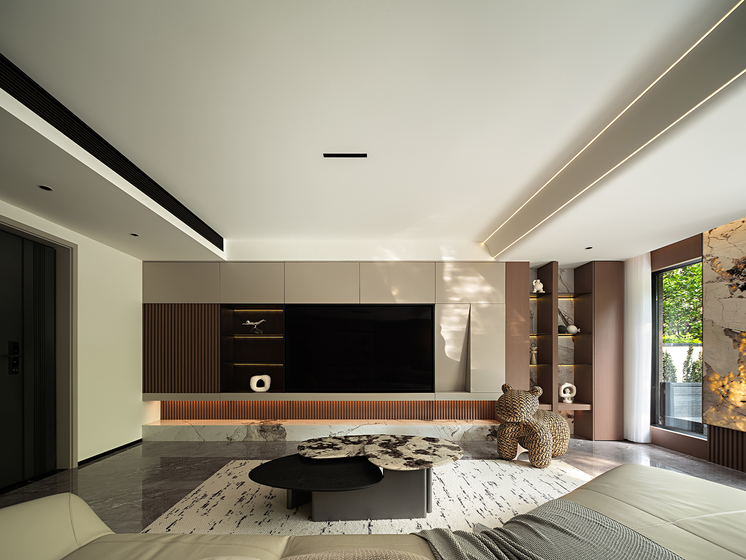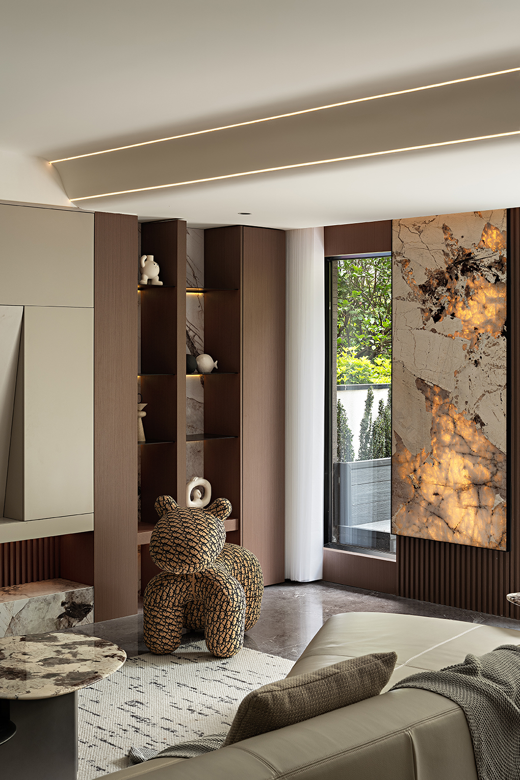 客厅采用大气磅礴的色彩搭配,奢石与深色木材相互映衬,营造出奢华而又温馨的氛围,低调而奢华。