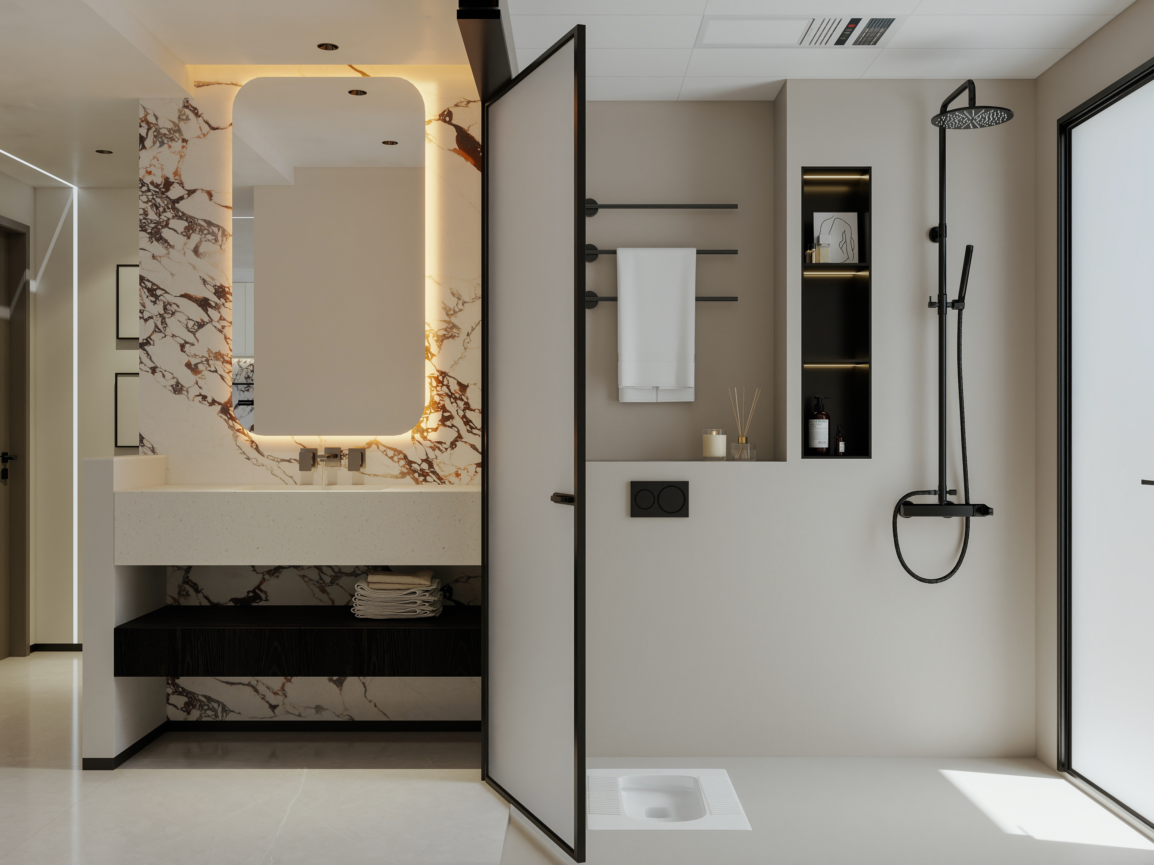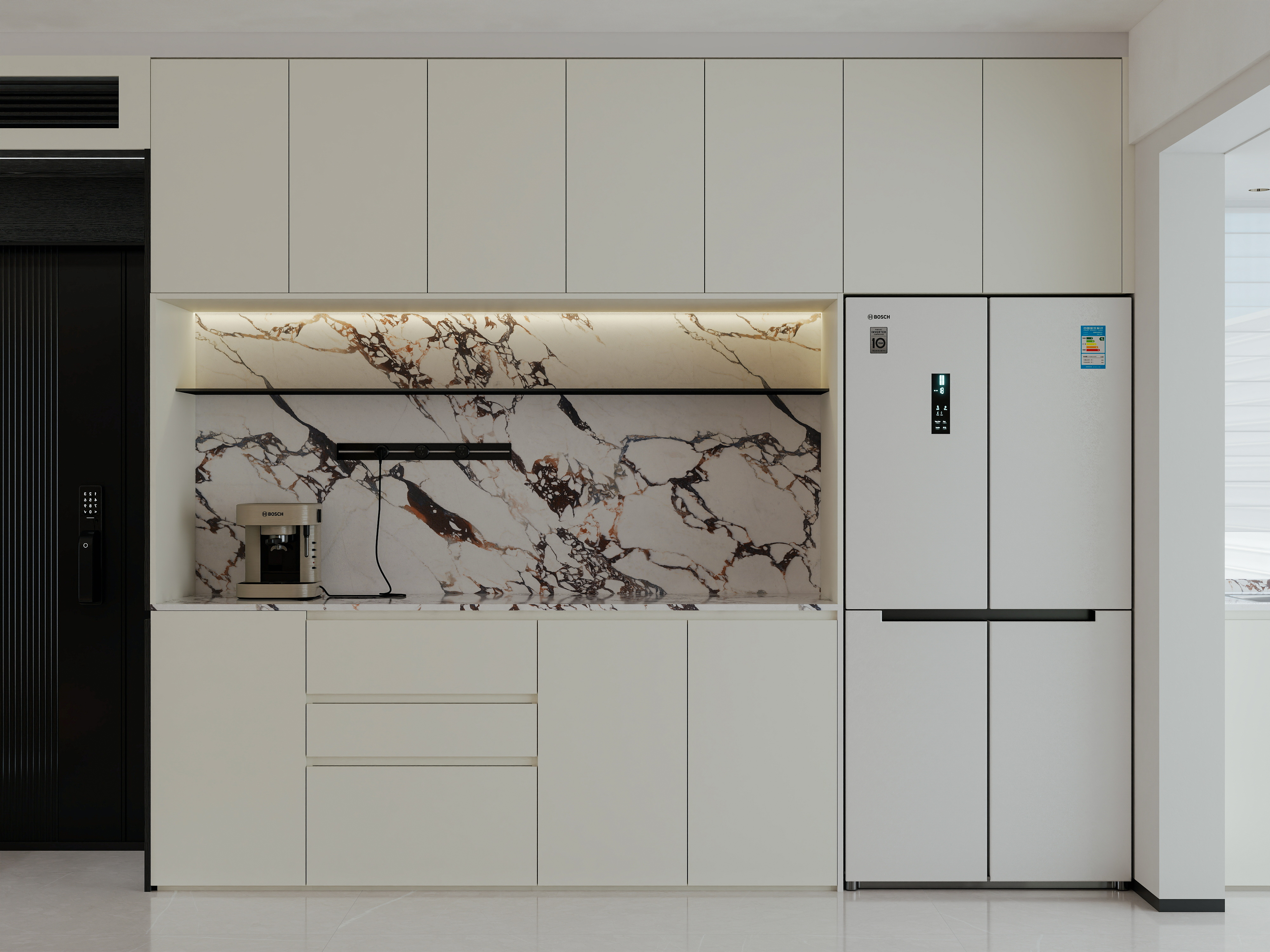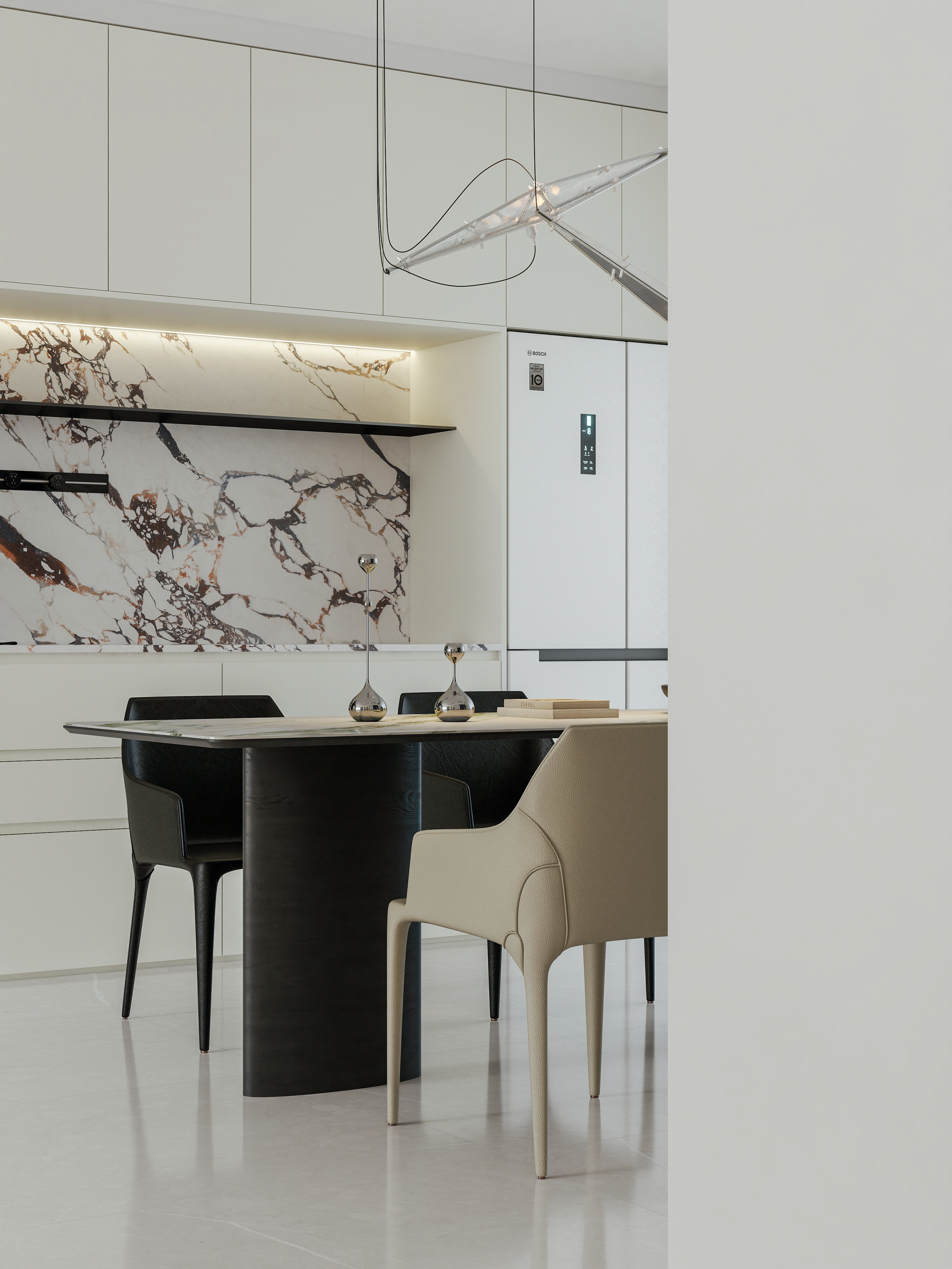 以白色大理石为基底,搭配白、黑,简洁又不失优雅
