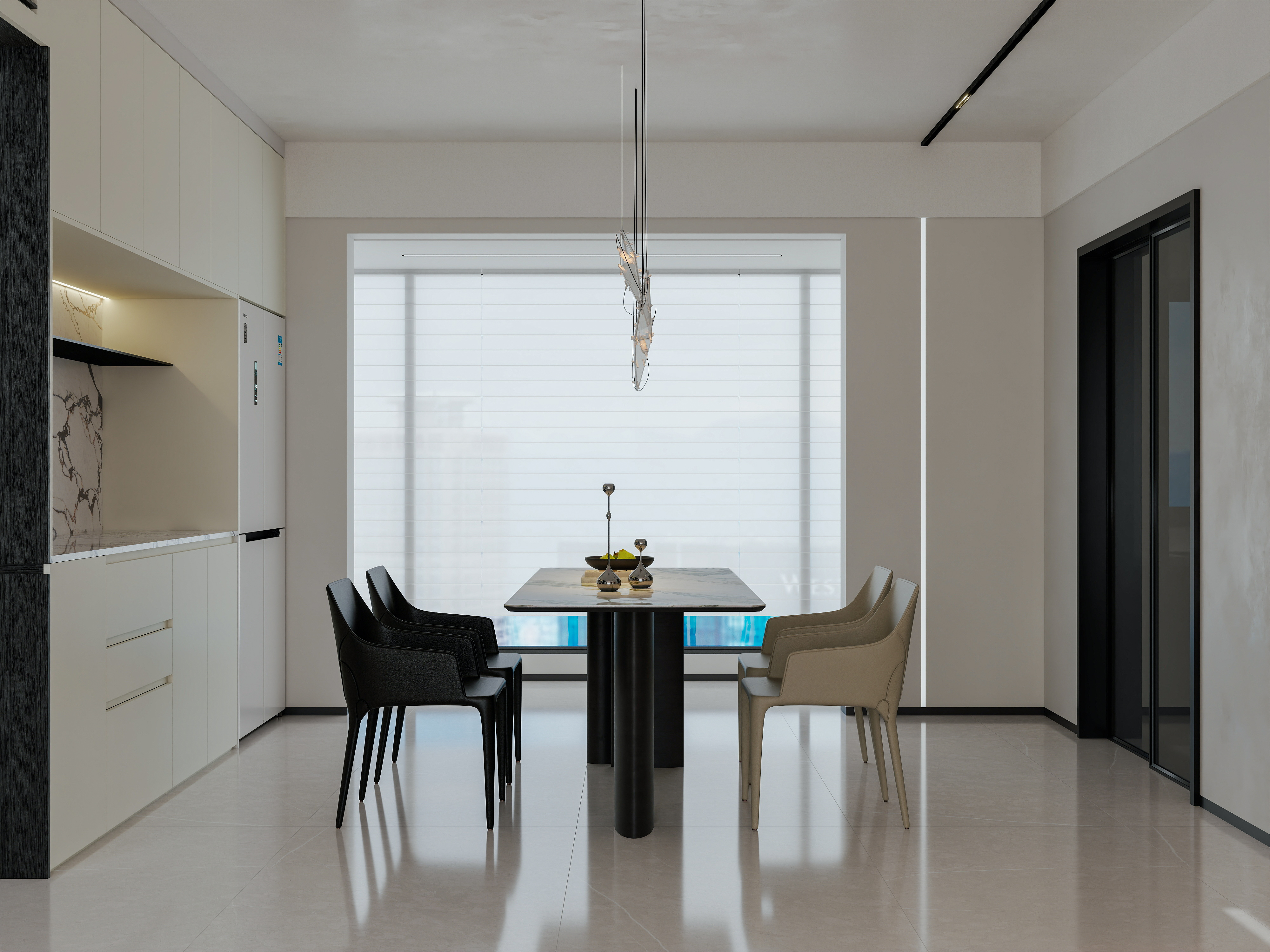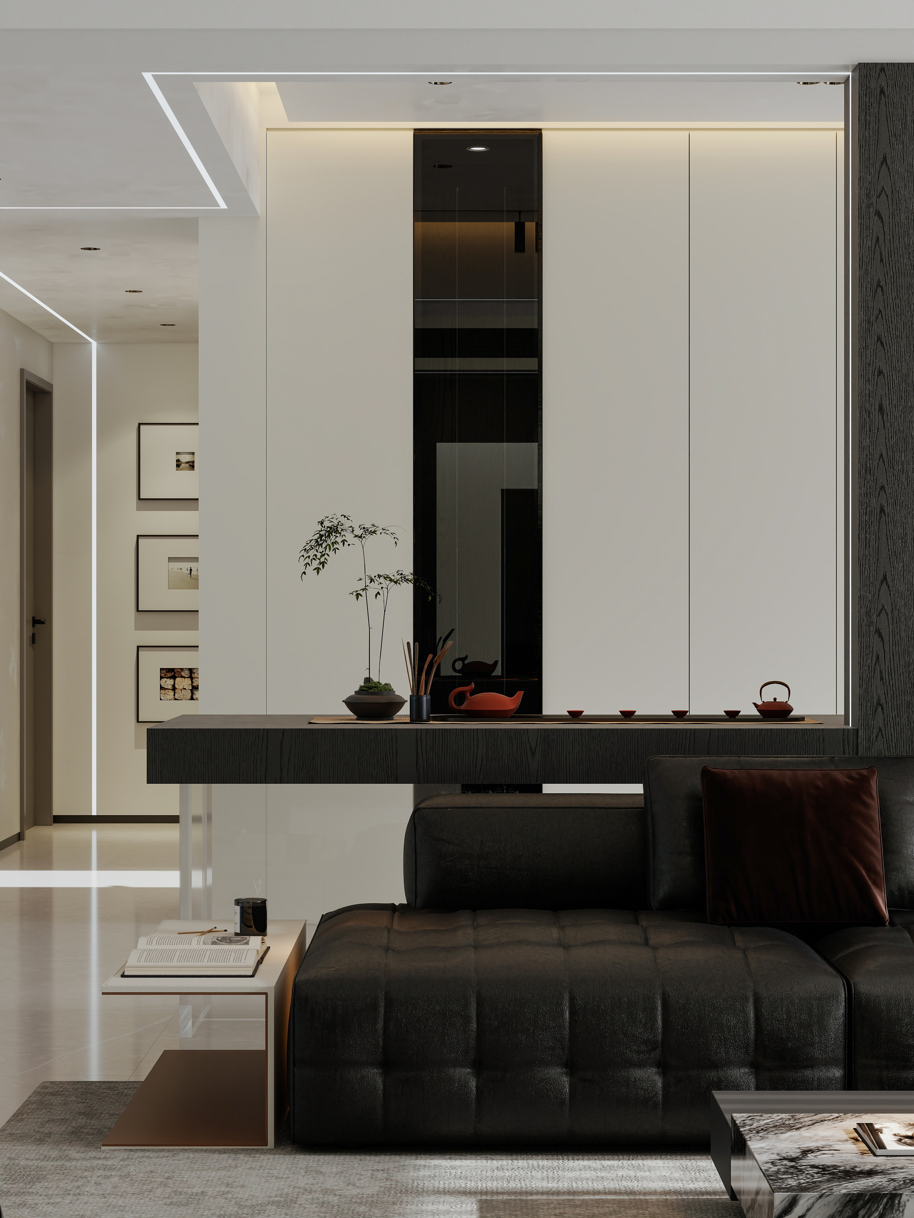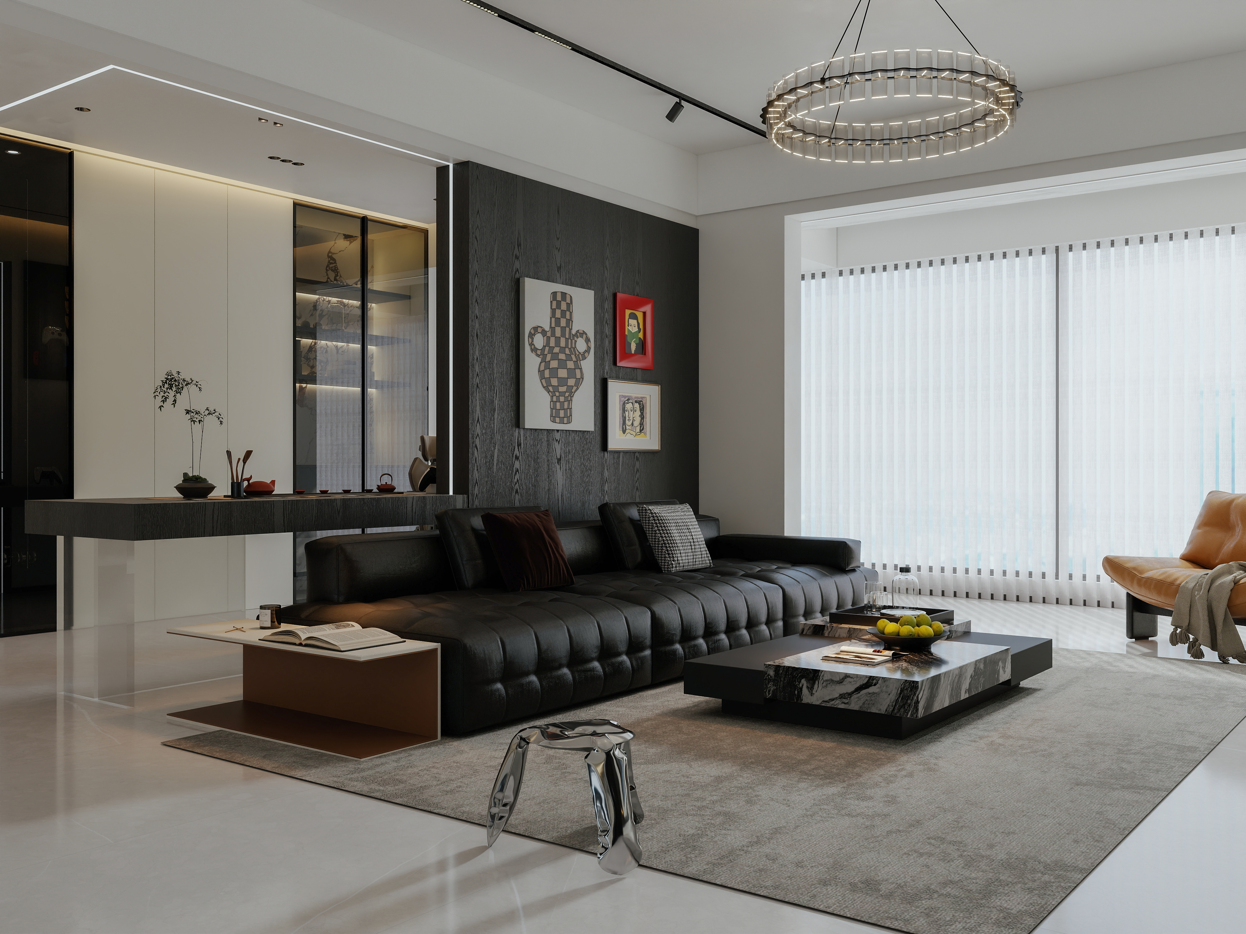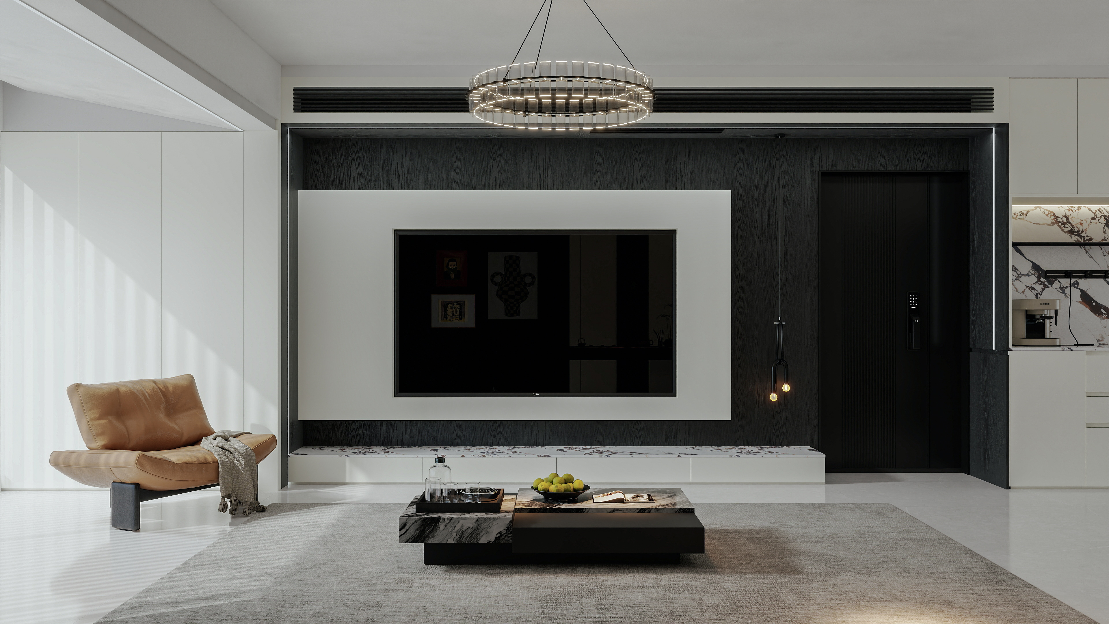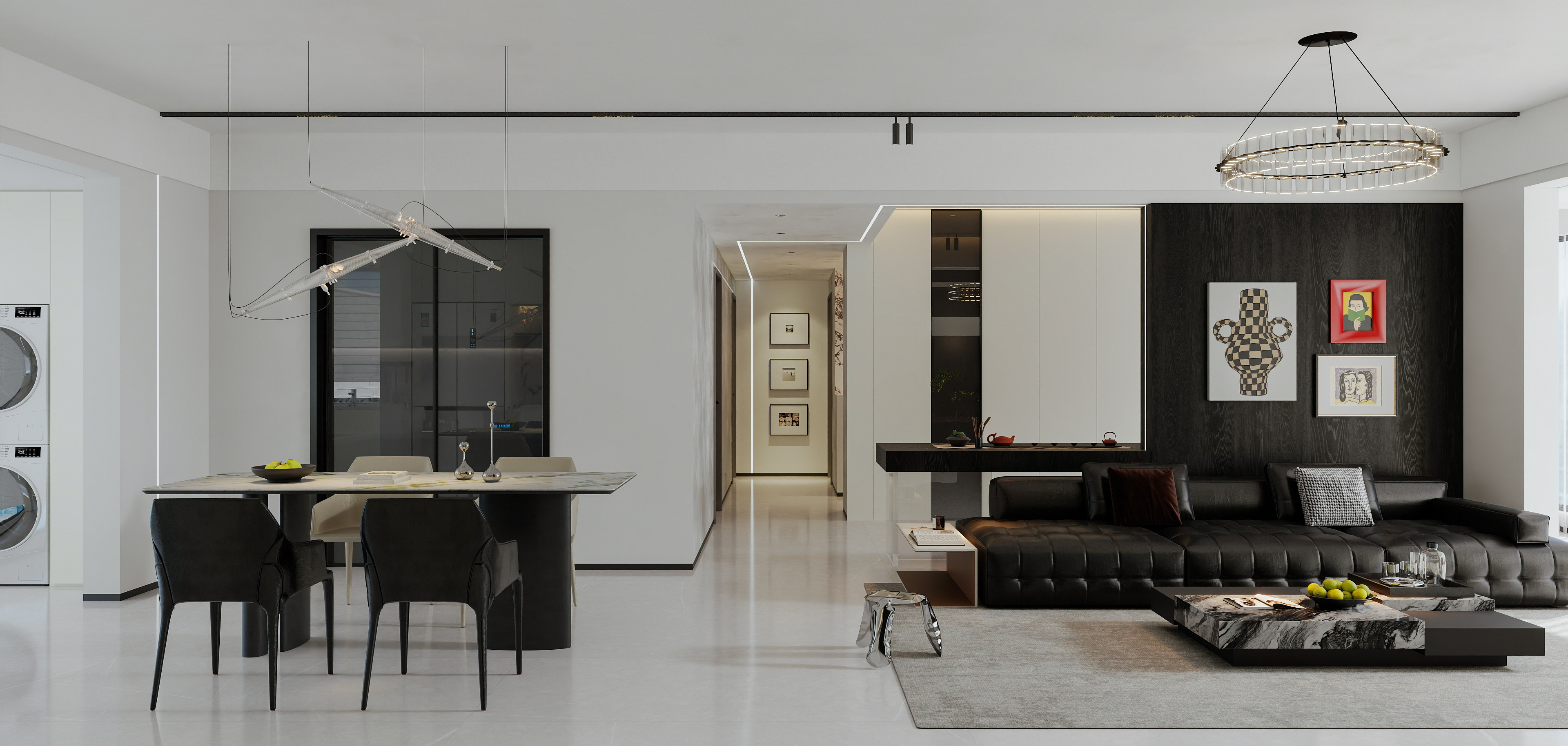 “少即是多”,追求空间的纯粹与宁静,通过简化设计元素、色彩与形式,达到视觉上的统一与和谐。在黑白灰的基调下,本设计旨在创造一个既现代又不失温馨的生活空间,让居住者在繁忙都市生活中找到一片心灵的净土。黑白灰不仅是色彩上的极简,更是对生活态度的精炼表达,体现了主人追求品质而不浮华的生活哲学。