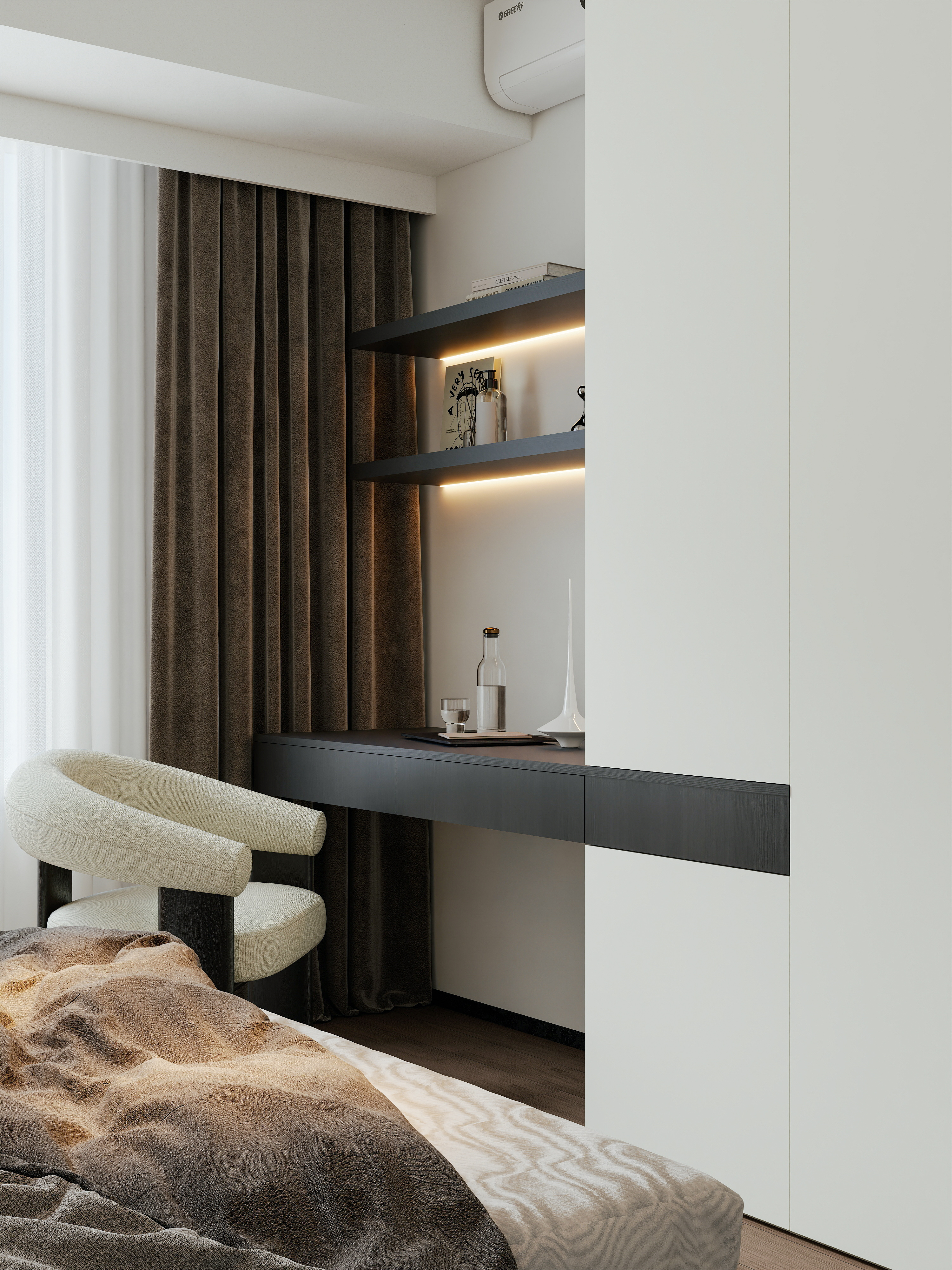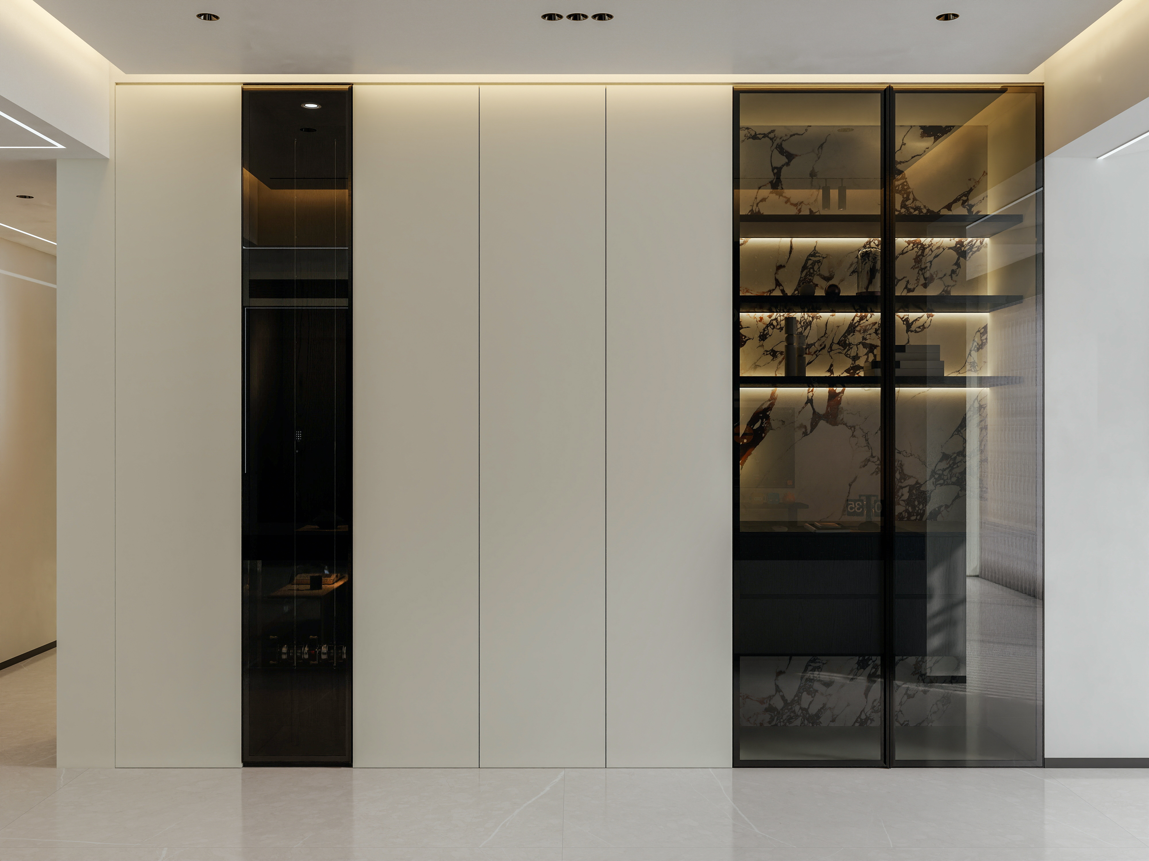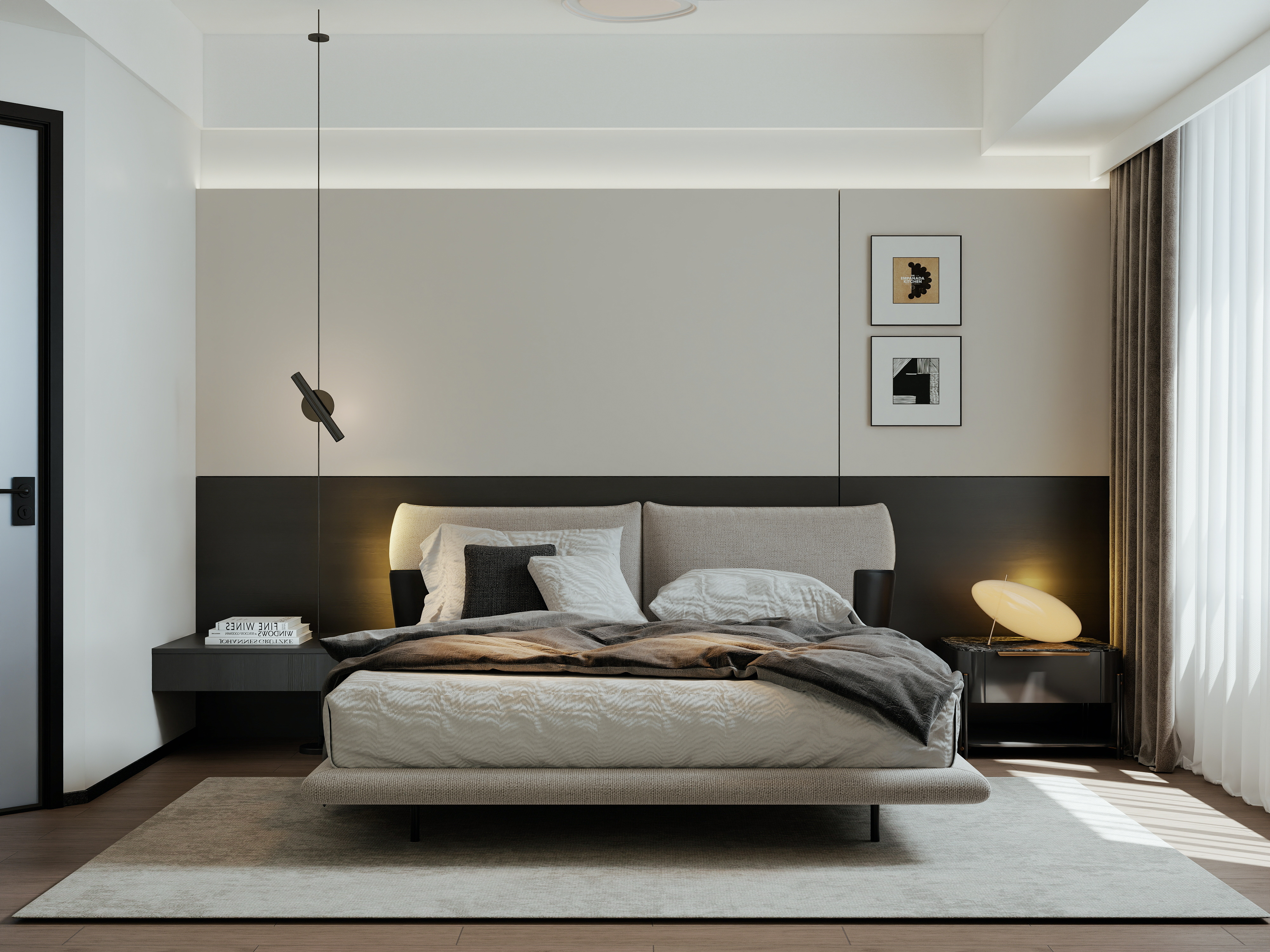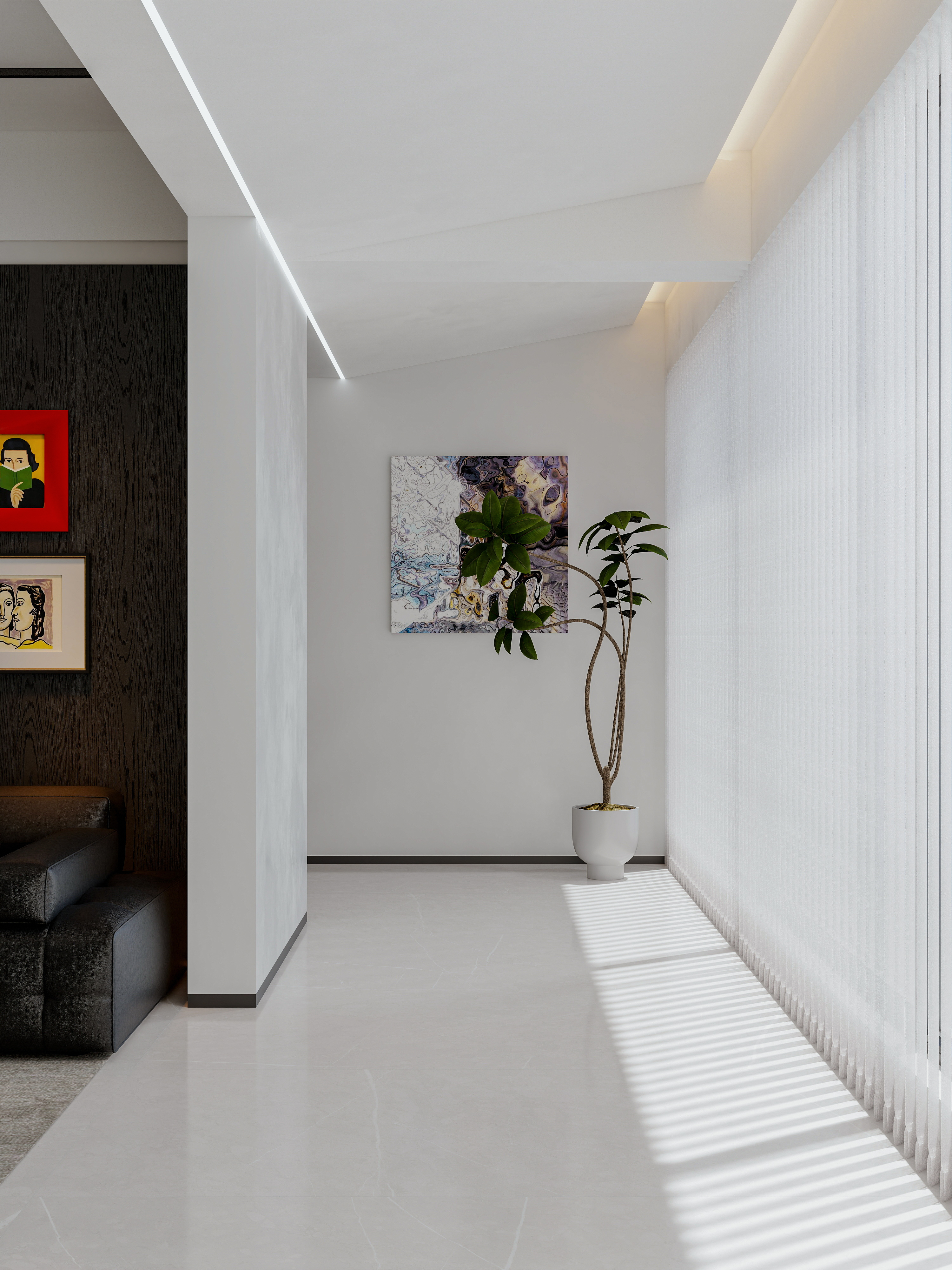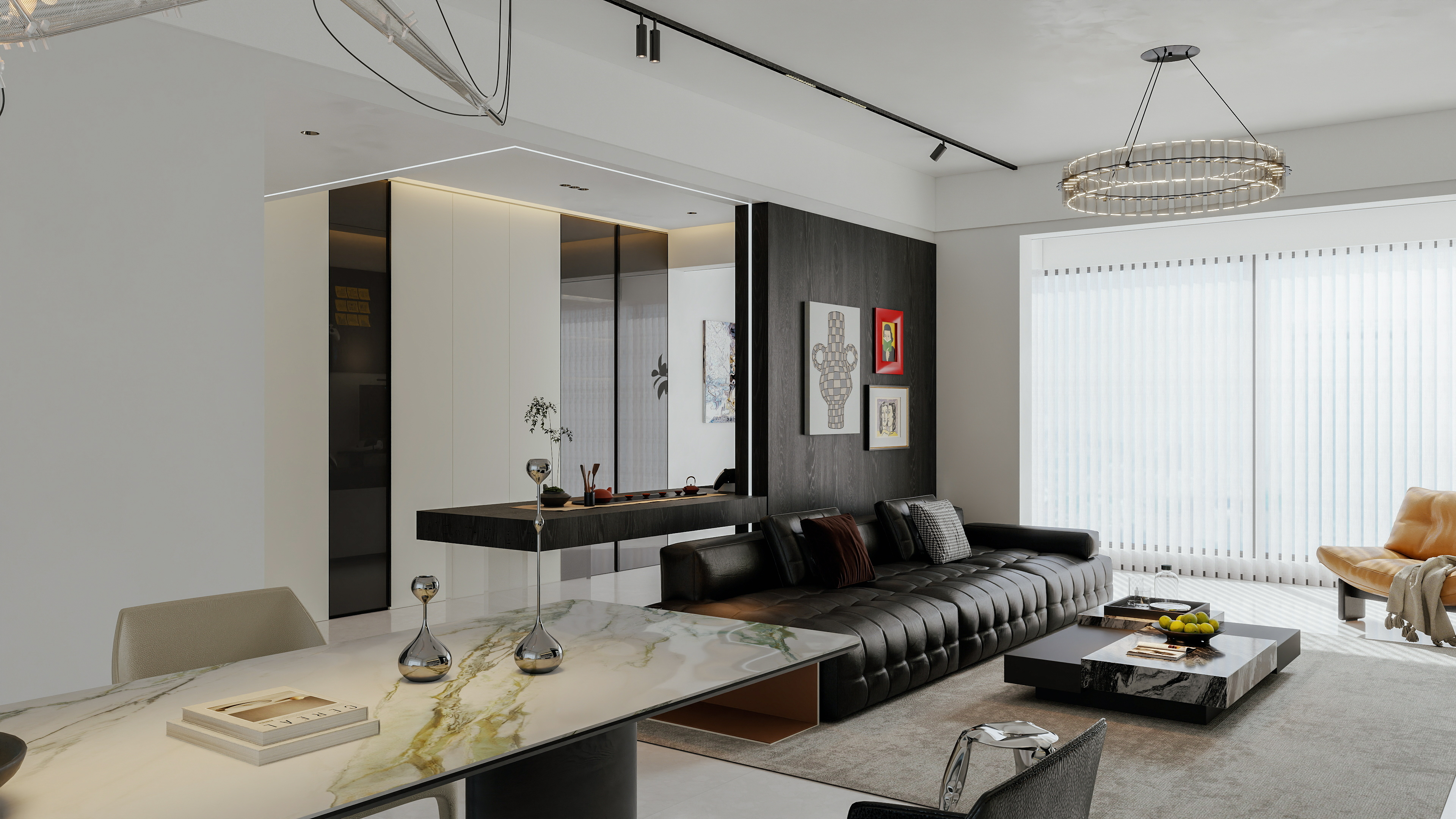 “少即是多”,追求空间的纯粹与宁静,通过简化设计元素、色彩与形式,达到视觉上的统一与和谐。在黑白灰的基调下,本设计旨在创造一个既现代又不失温馨的生活空间,让居住者在繁忙都市生活中找到一片心灵的净土。黑白灰不仅是色彩上的极简,更是对生活态度的精炼表达,体现了主人追求品质而不浮华的生活哲学。
