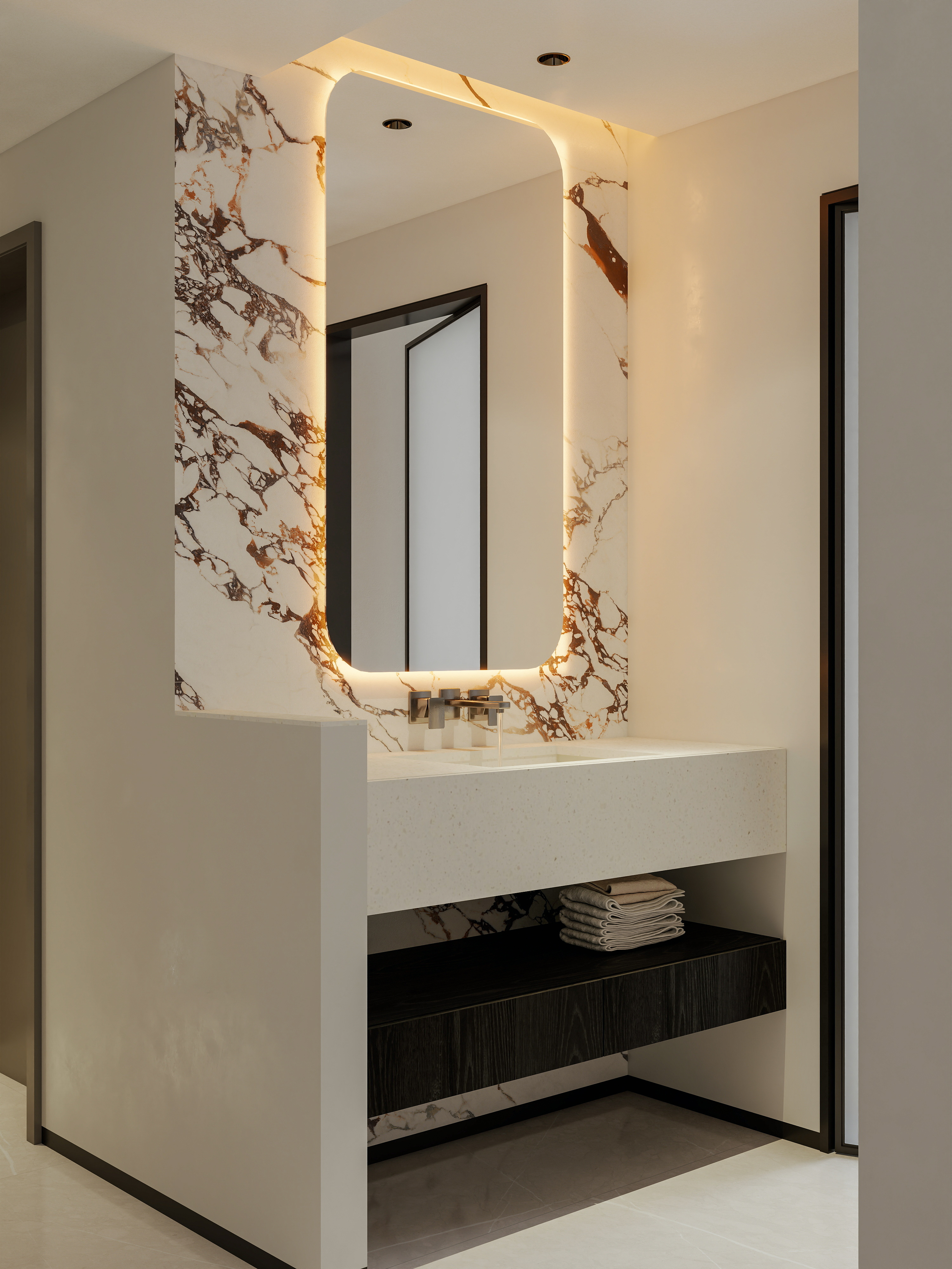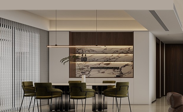 大理石的清冷高贵,需要温润质感的木饰面来中和,让空间尽显奢华的同时,有丝「拙」的意味