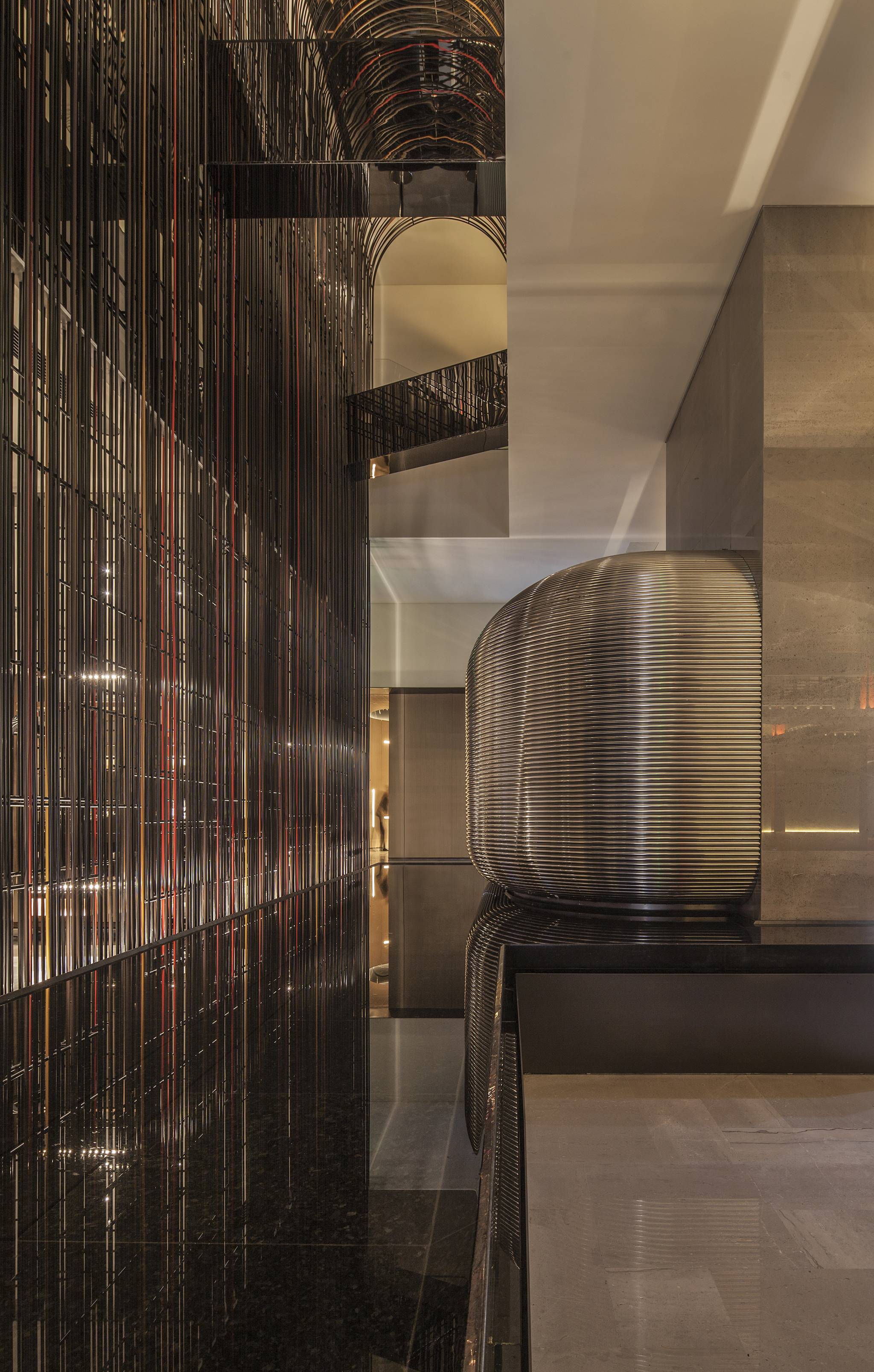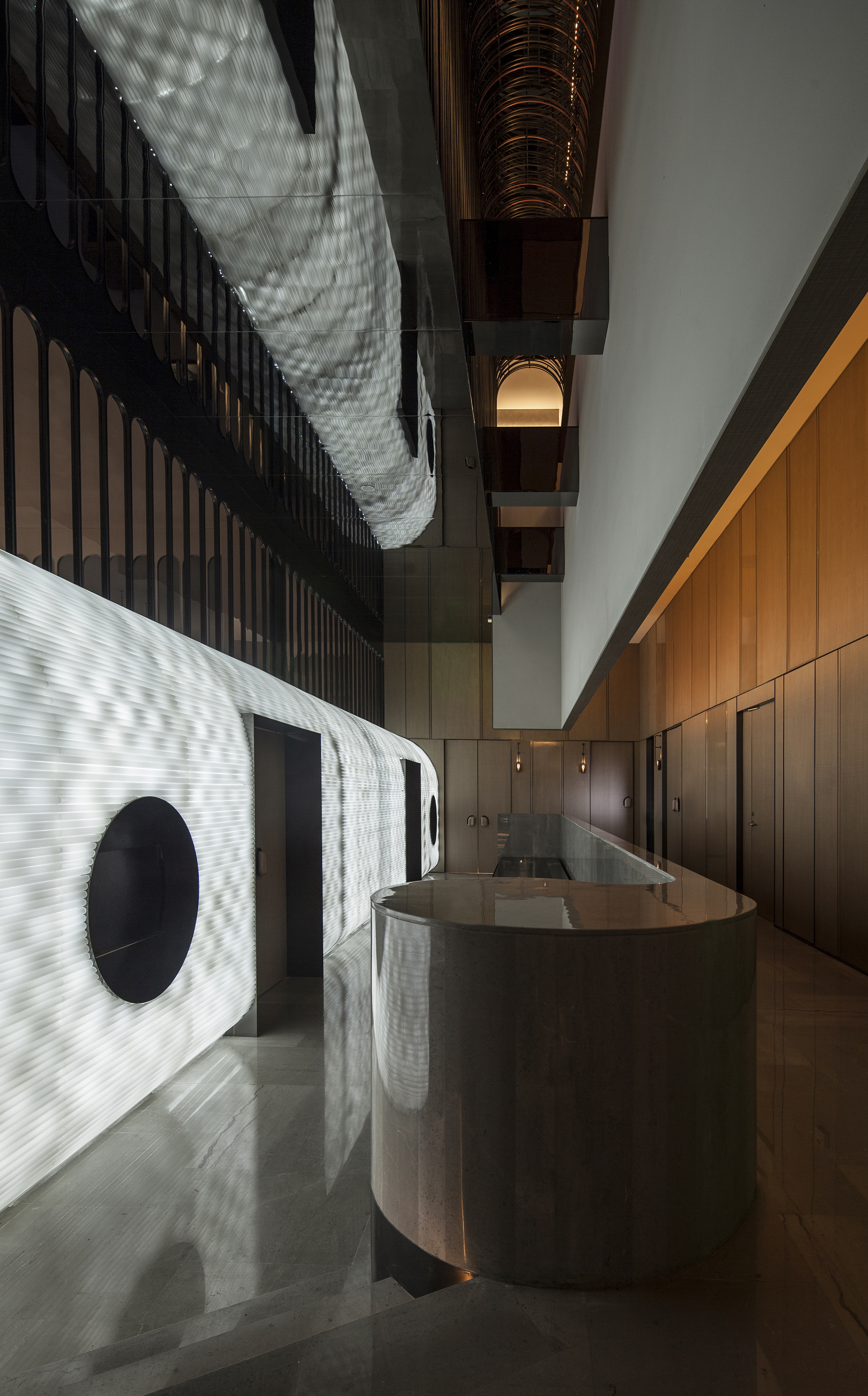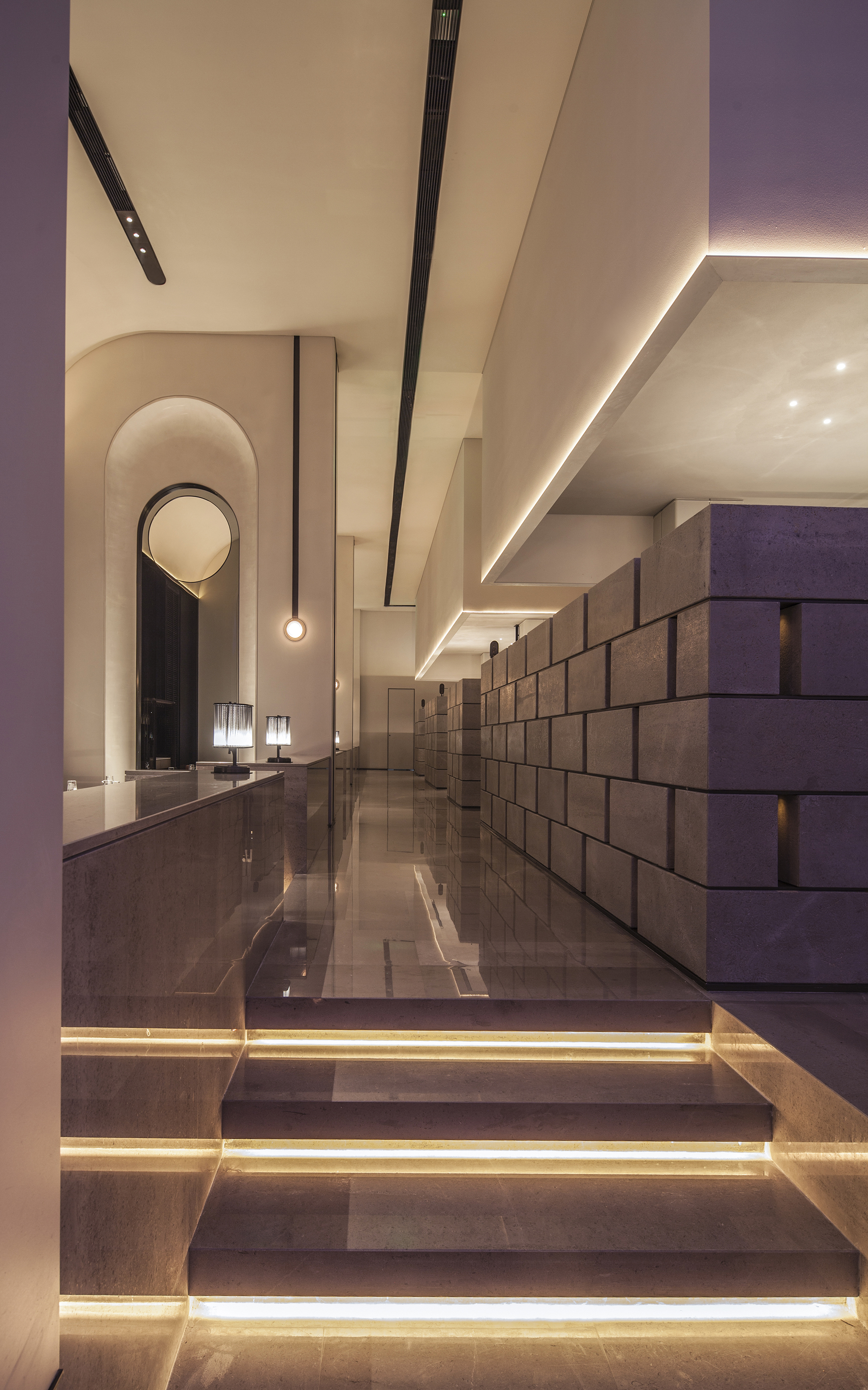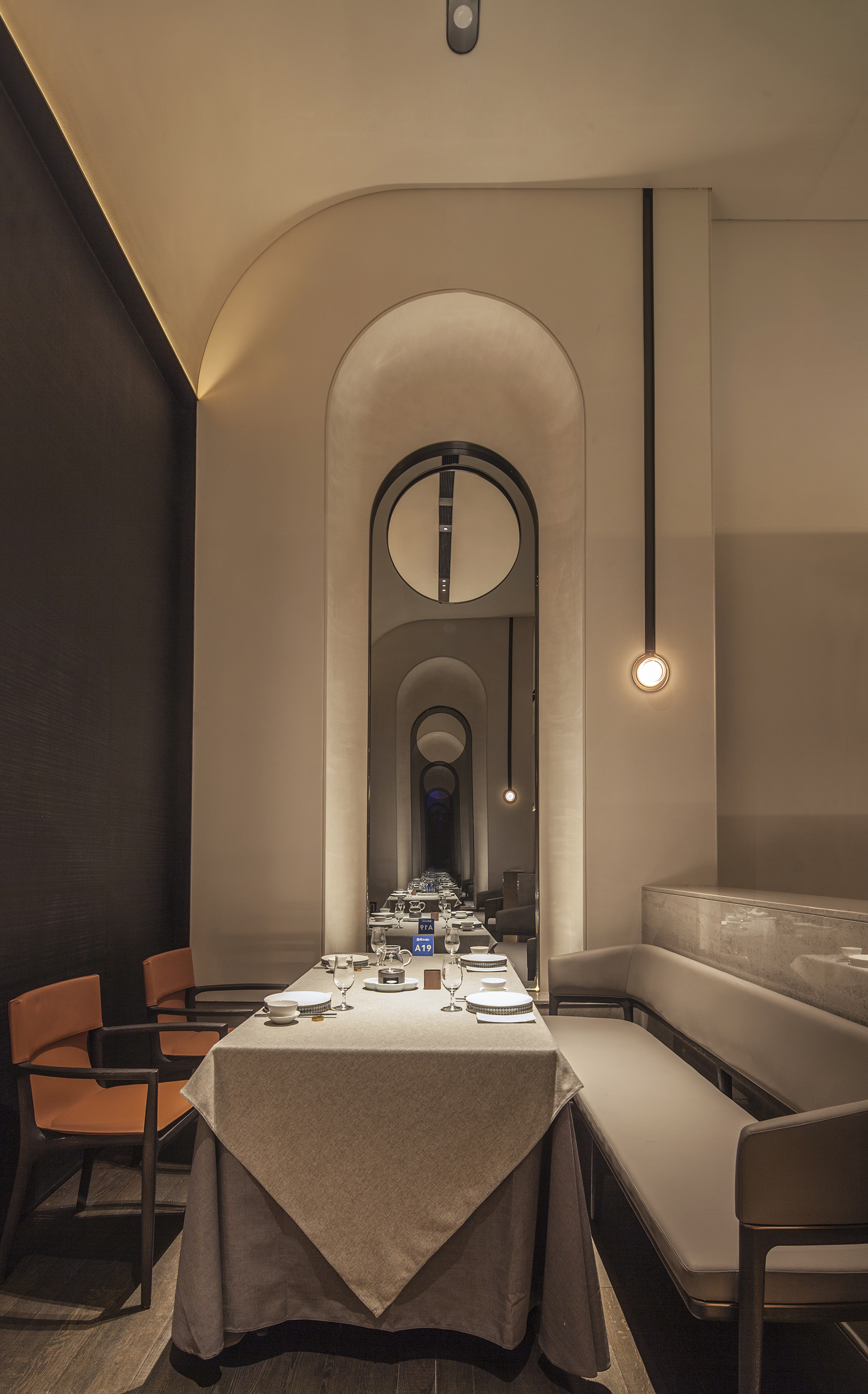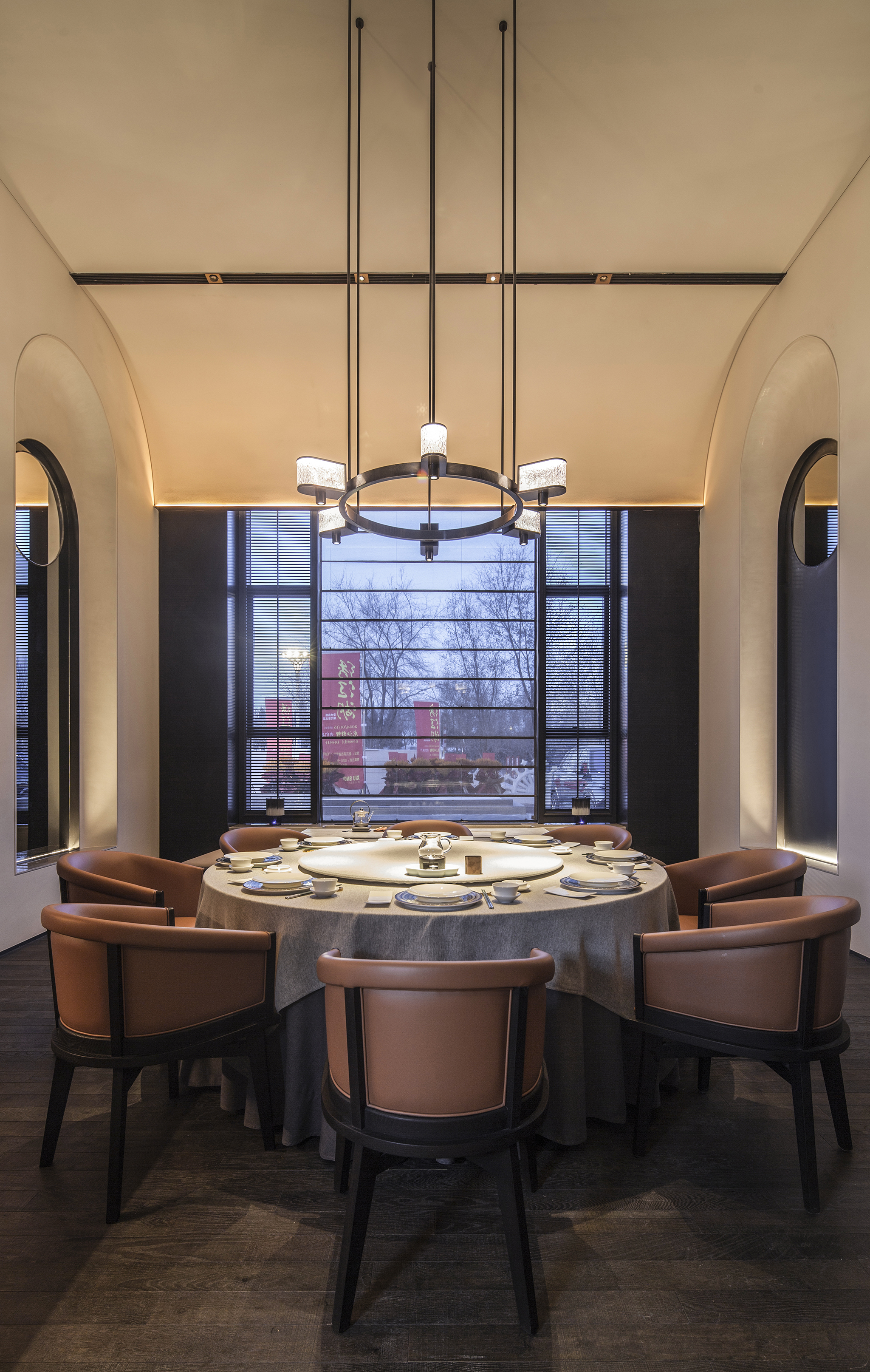 地下一层的功能为后厨房、物料库房、大宴会厅、高端包房、中厅、中厅红酒廊、电梯厅等组成。设计依据着置上而下,贯穿而行的设计手法。强调建筑本身的风彩和语言,用体块起落的空间关系,有机的组成这一层的功能需求,又通过建筑的改造使空间内创造出三个自然光井。使重要的使用空间开敞明亮,尤其宴会区的共享与一二层相通,又在喧嚣中封闭百叶门来多功能使用。