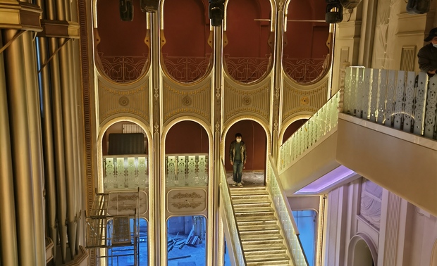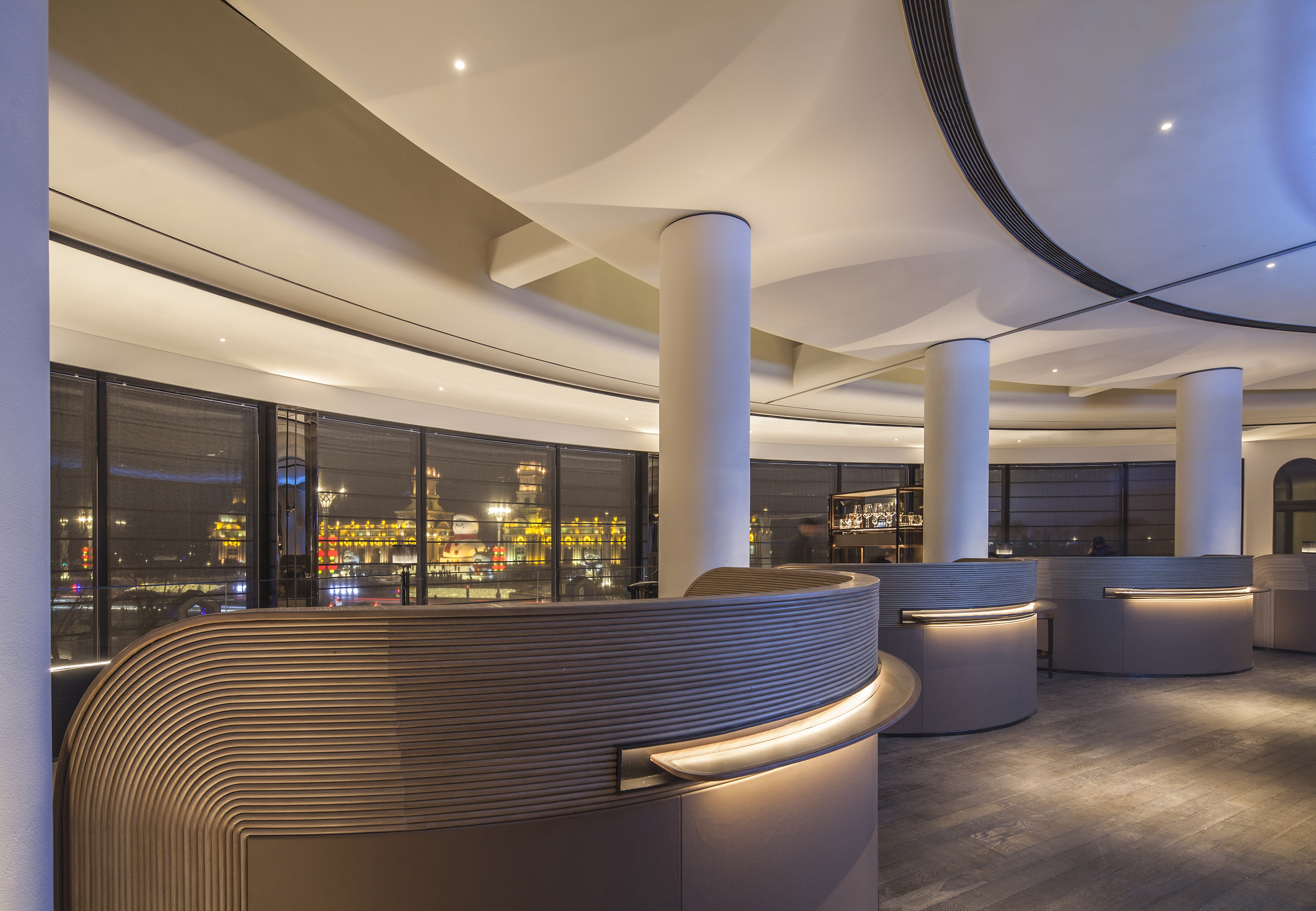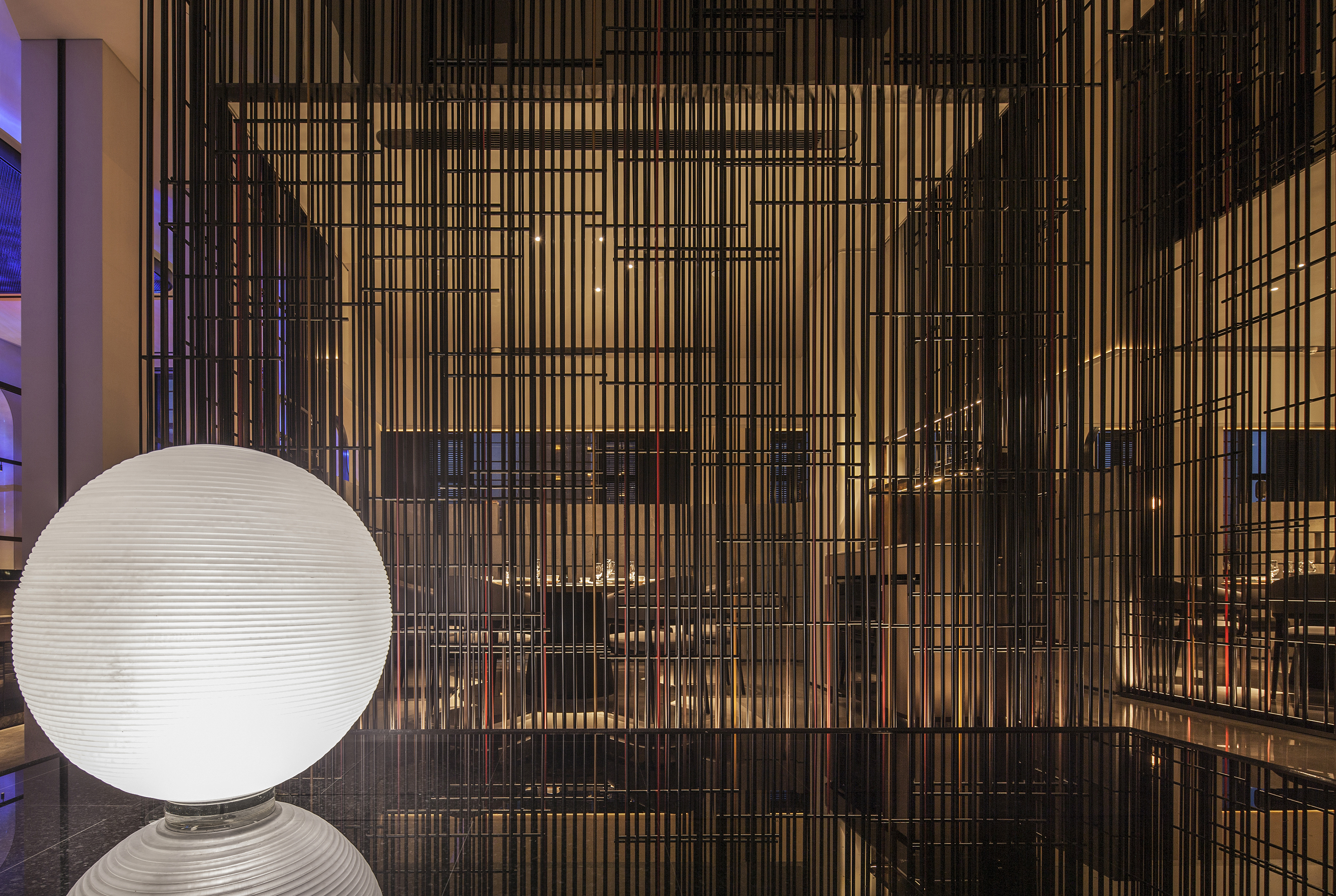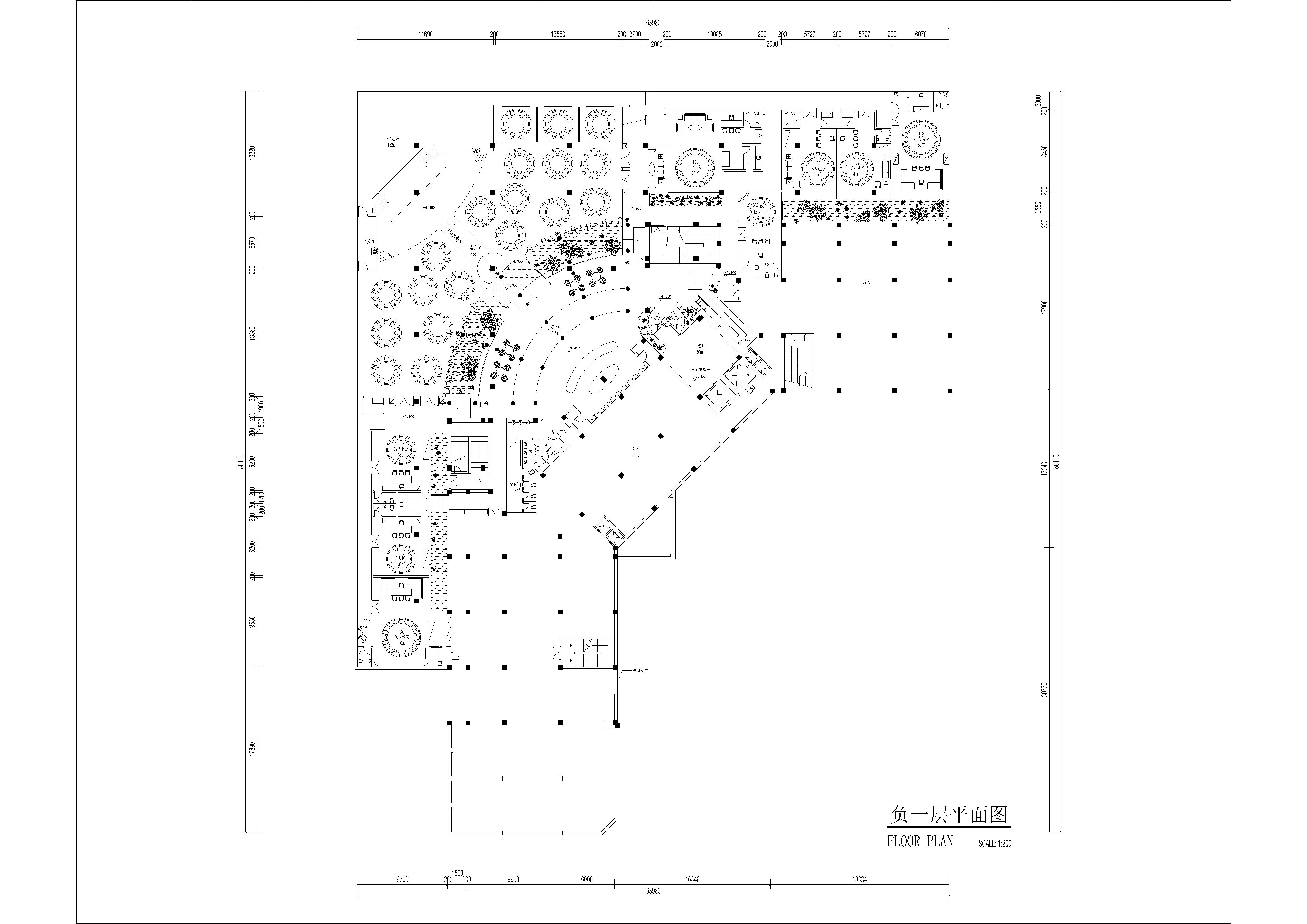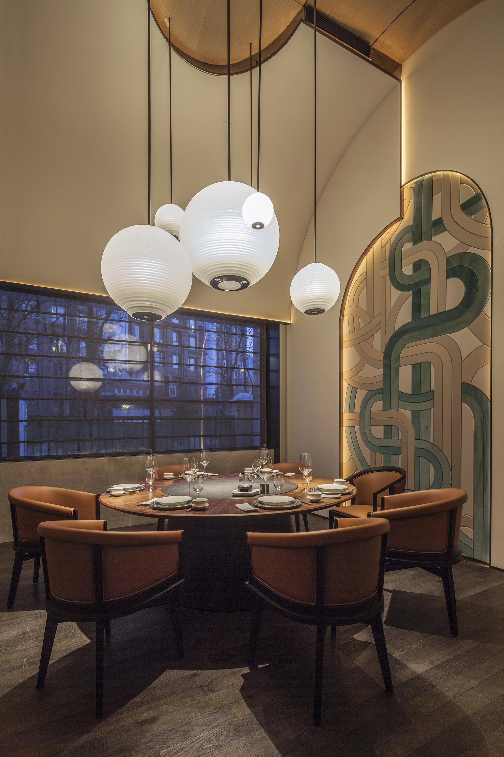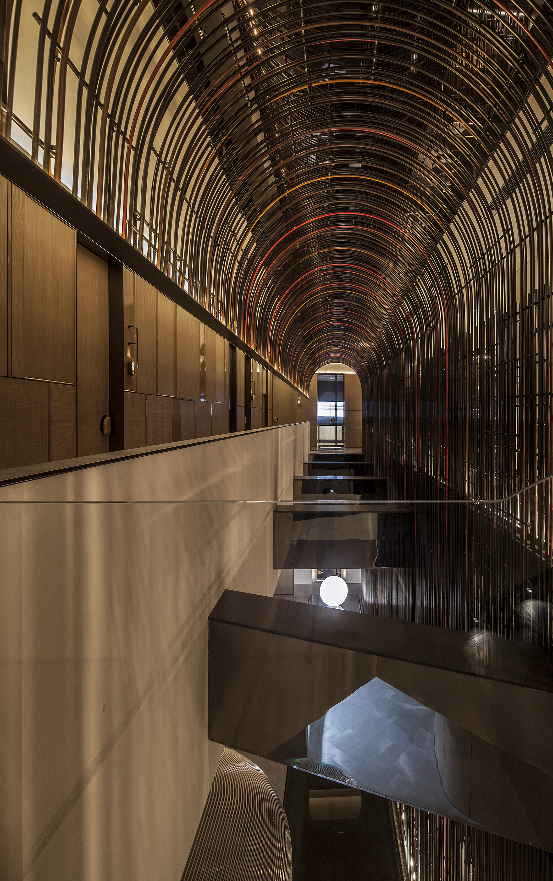 地下一层的功能为后厨房、物料库房、大宴会厅、高端包房、中厅、中厅红酒廊、电梯厅等组成。设计依据着置上而下,贯穿而行的设计手法。强调建筑本身的风彩和语言,用体块起落的空间关系,有机的组成这一层的功能需求,又通过建筑的改造使空间内创造出三个自然光井。使重要的使用空间开敞明亮,尤其宴会区的共享与一二层相通,又在喧嚣中封闭百叶门来多功能使用。