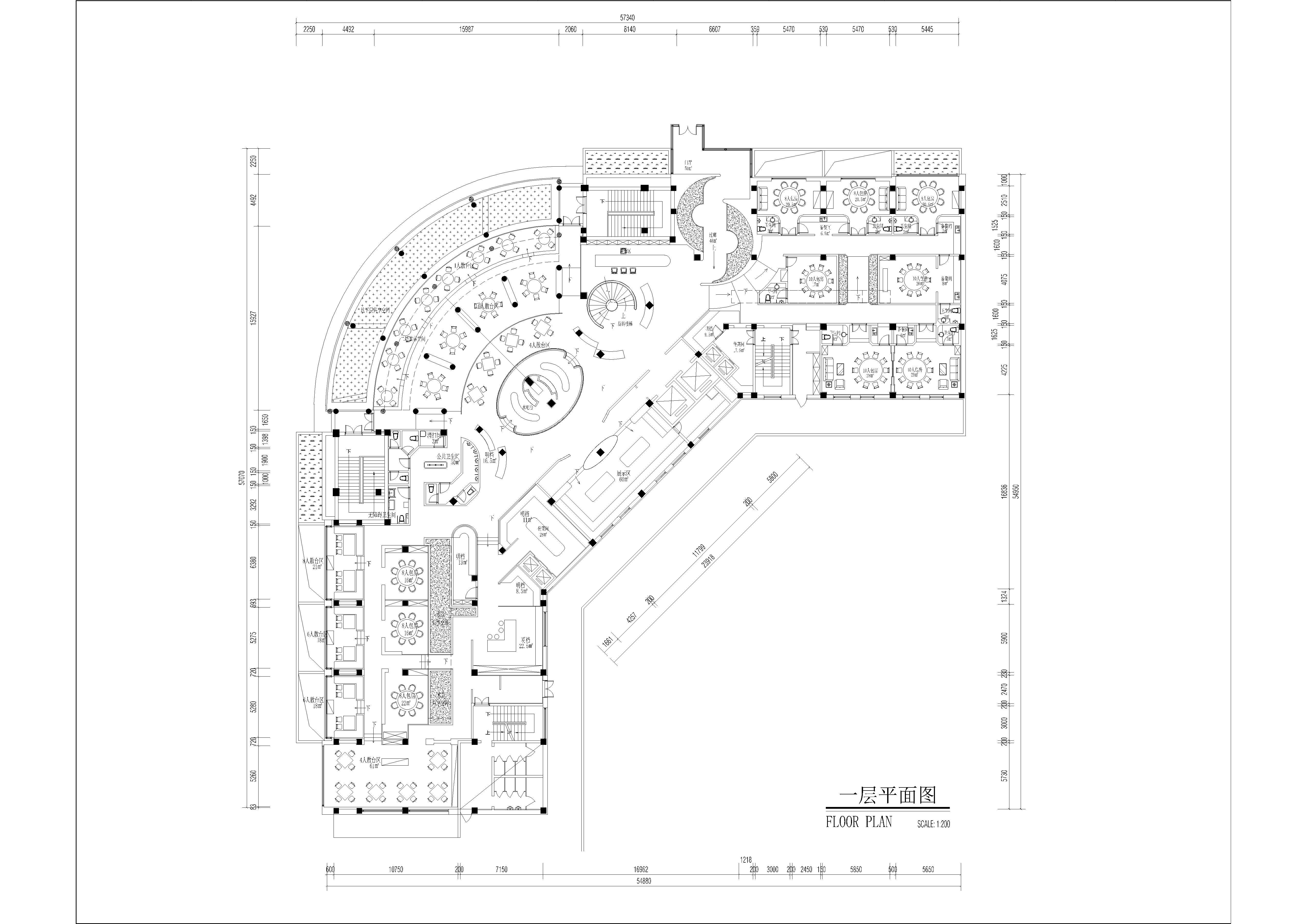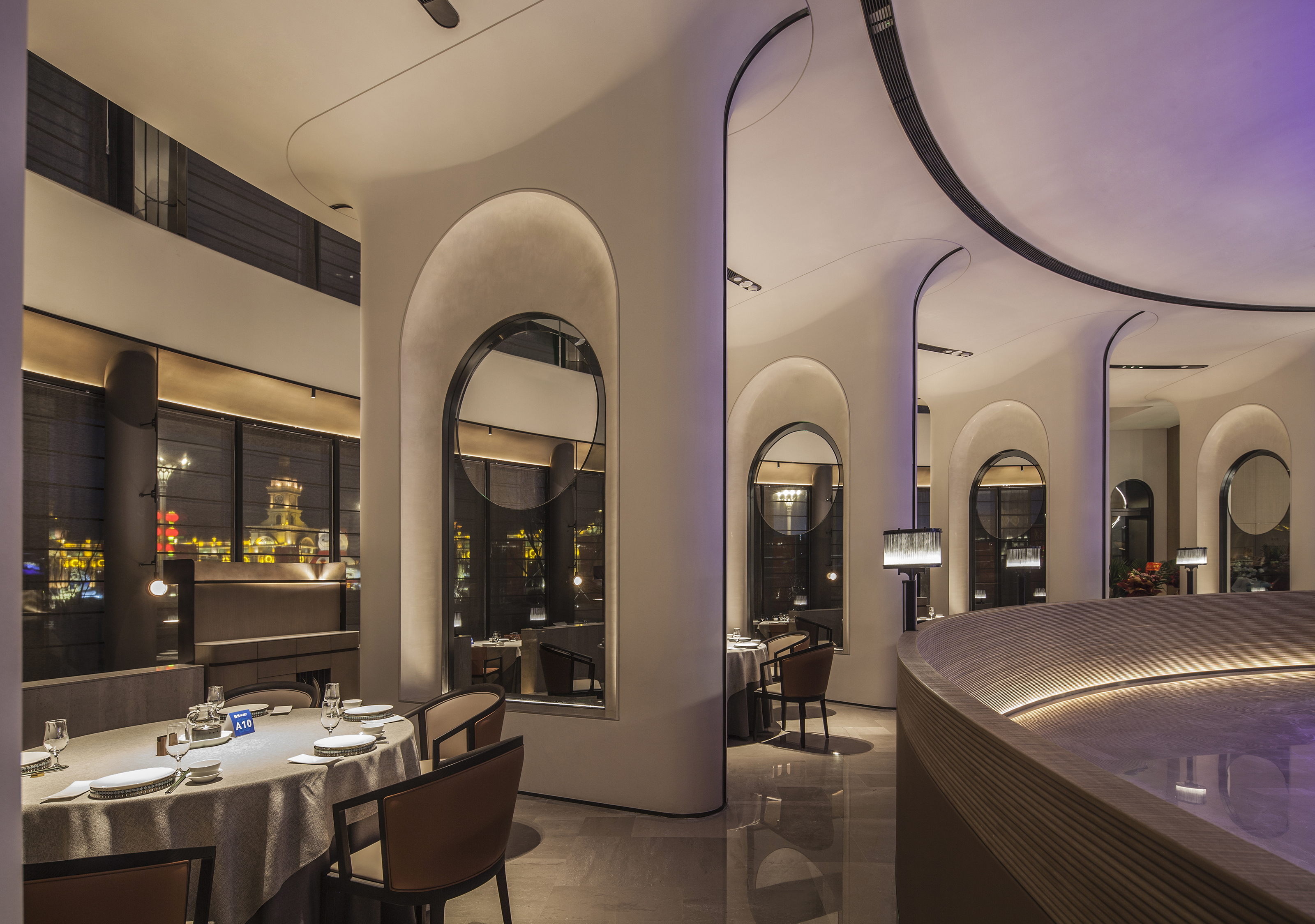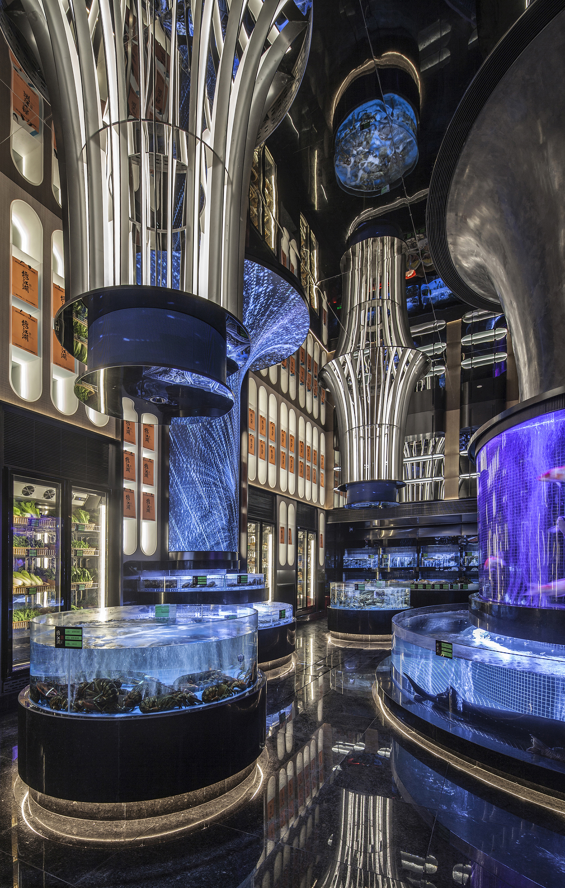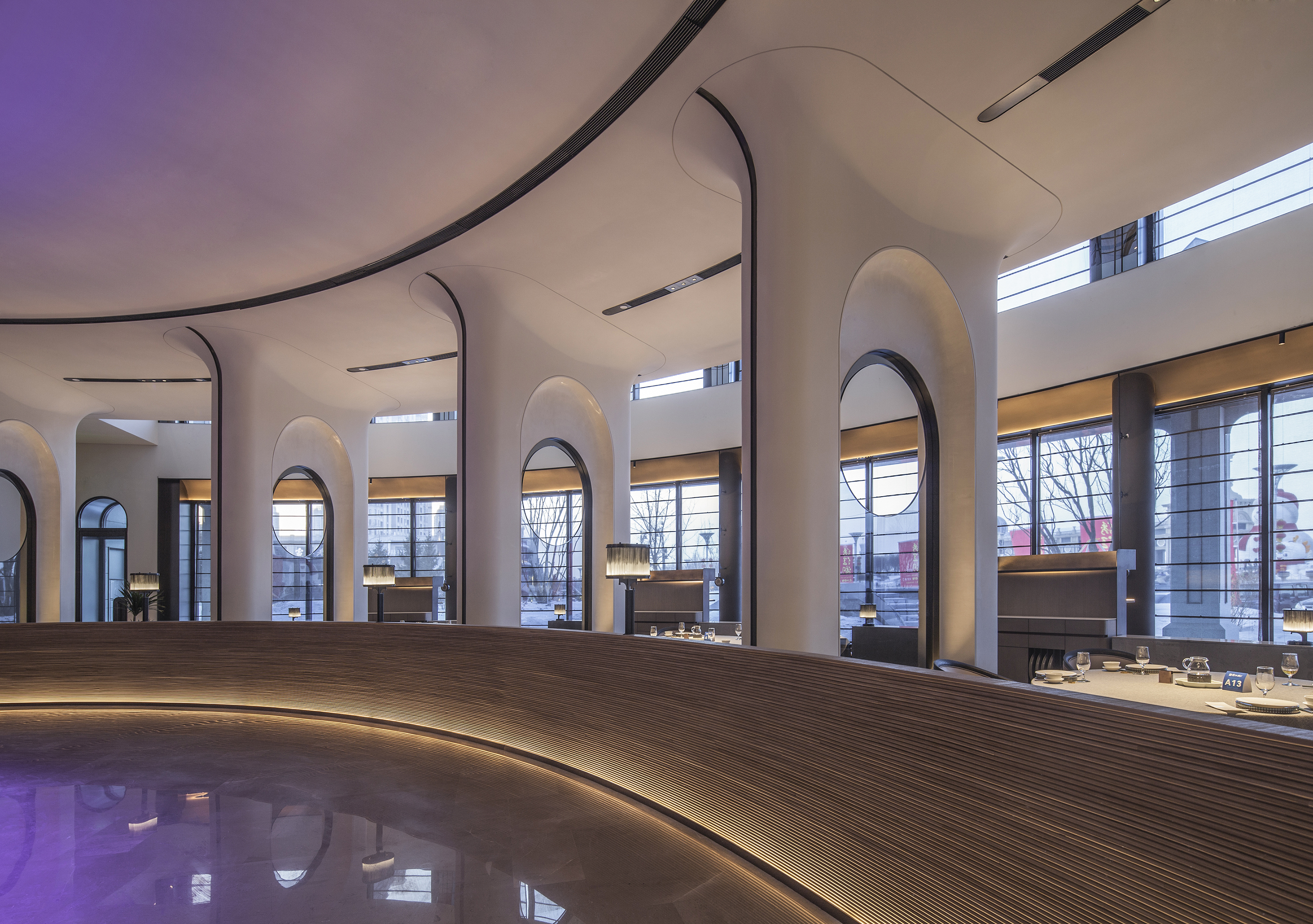 一层功能繁多,从入口的简约时尚动态影视厅,灵动的旋转楼梯,本质亲切的茶吧,都市化休闲体验的多姿水吧和音乐台,地域风物龙江食材展示区,以及各类专项明档、景观散台、风格卡台,主题“绣”卡包,还有小宴会厅商务包房等。