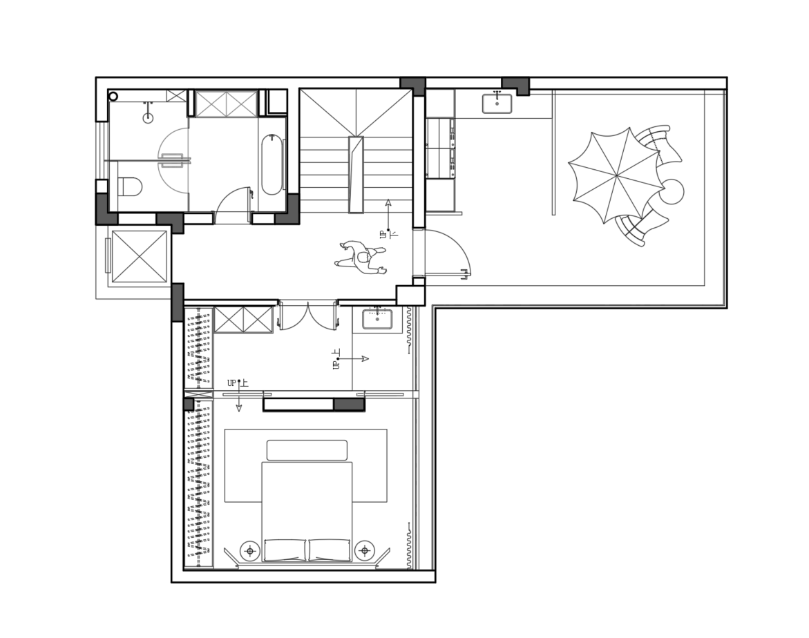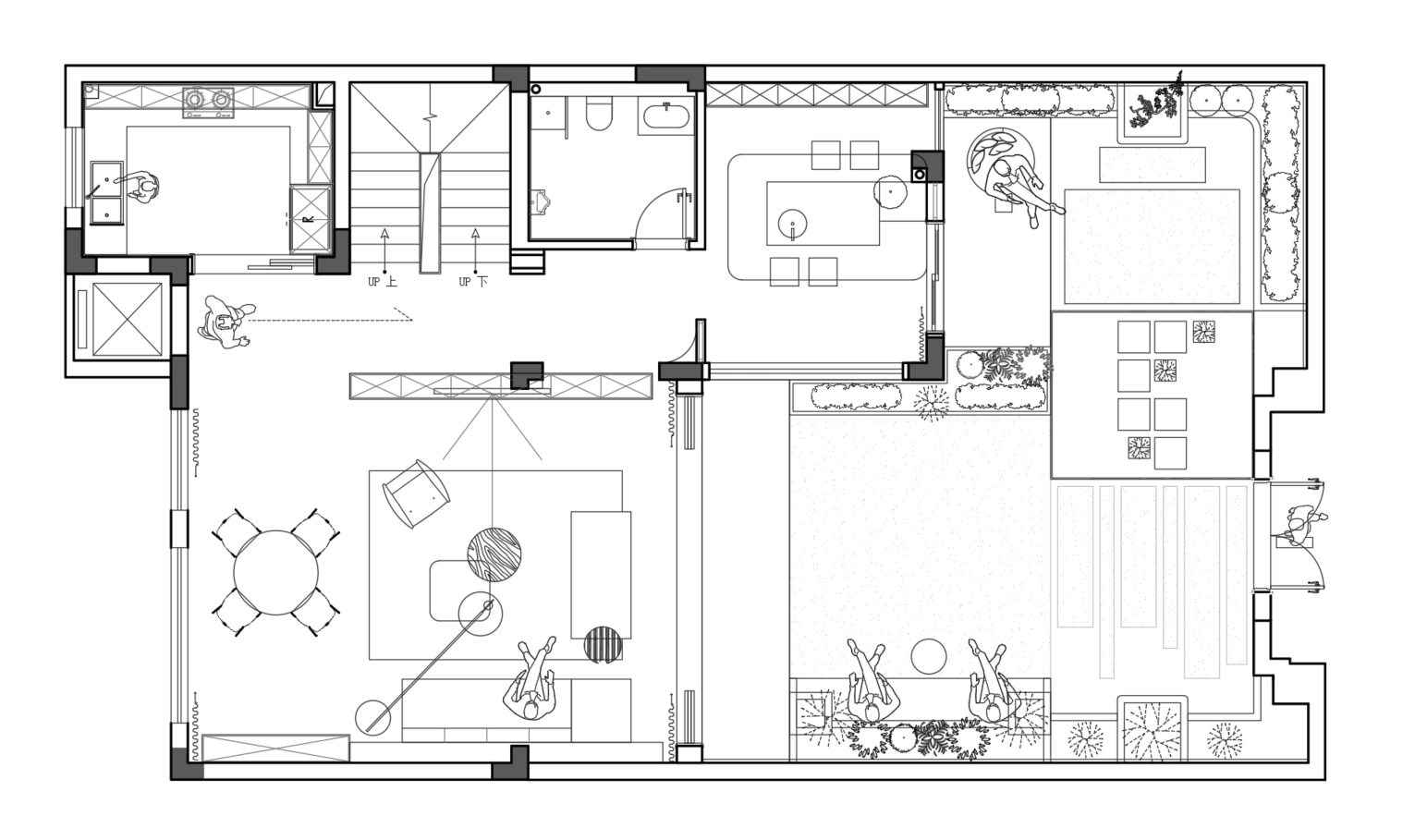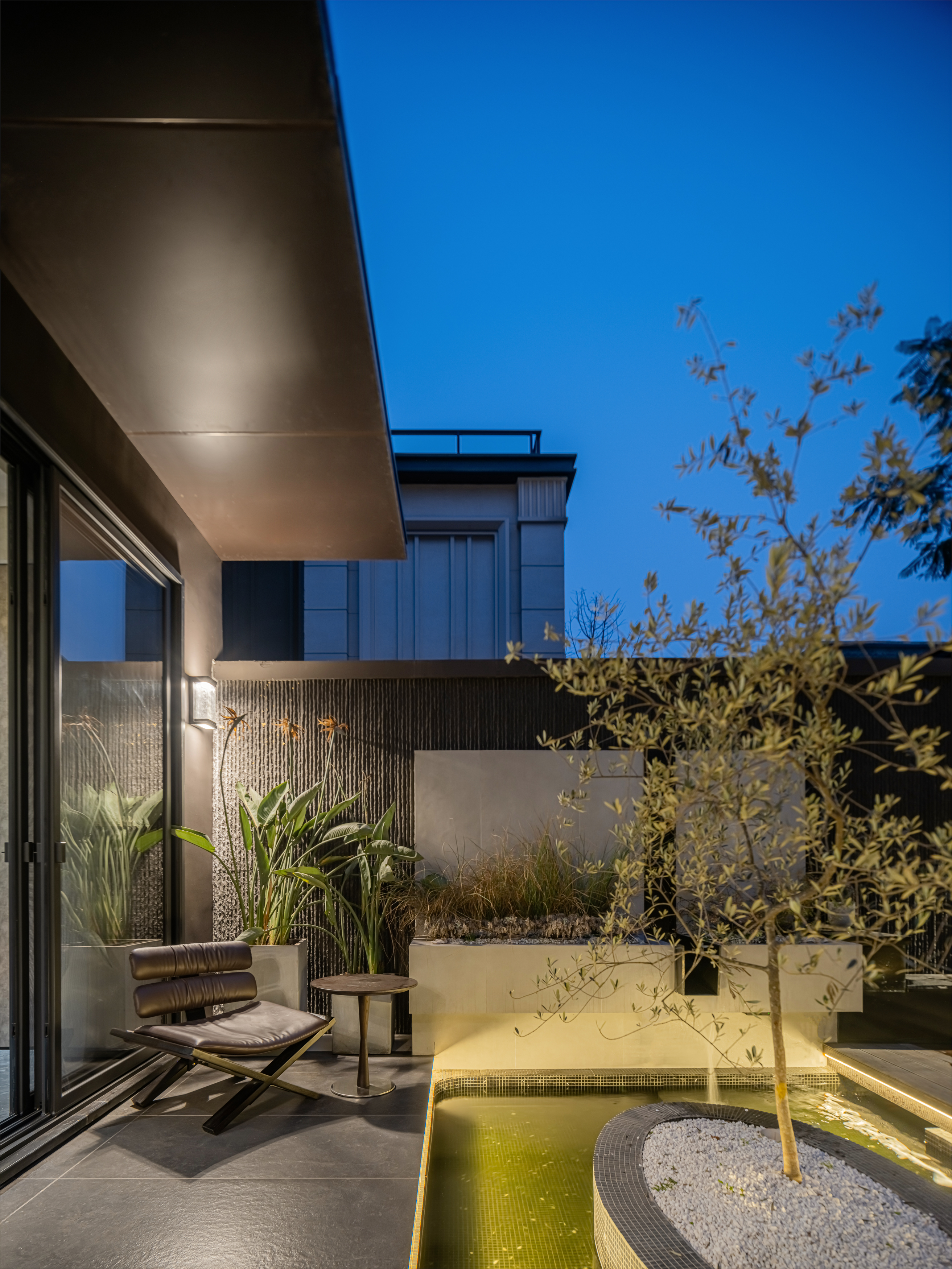 为了满足家人之间的情感交流和日常生活需求,设计师重新规划了空间布局,庭院的景观被引入到室内,让孩子在院内玩耍的同时可以和屋内的父母交流互动。