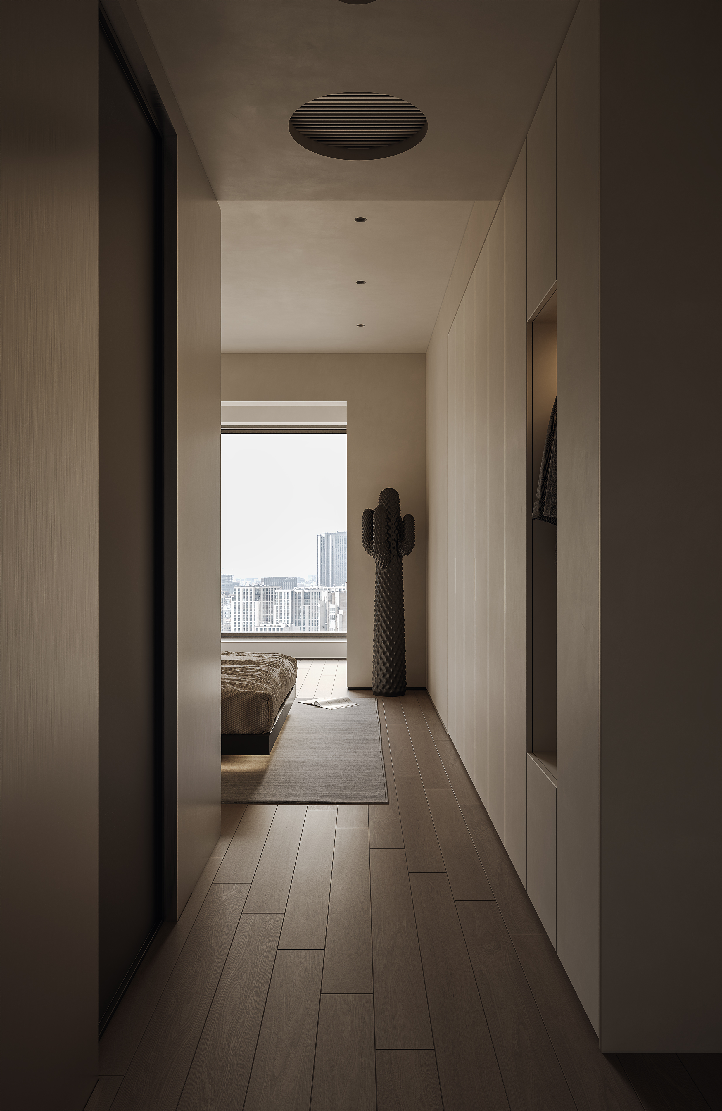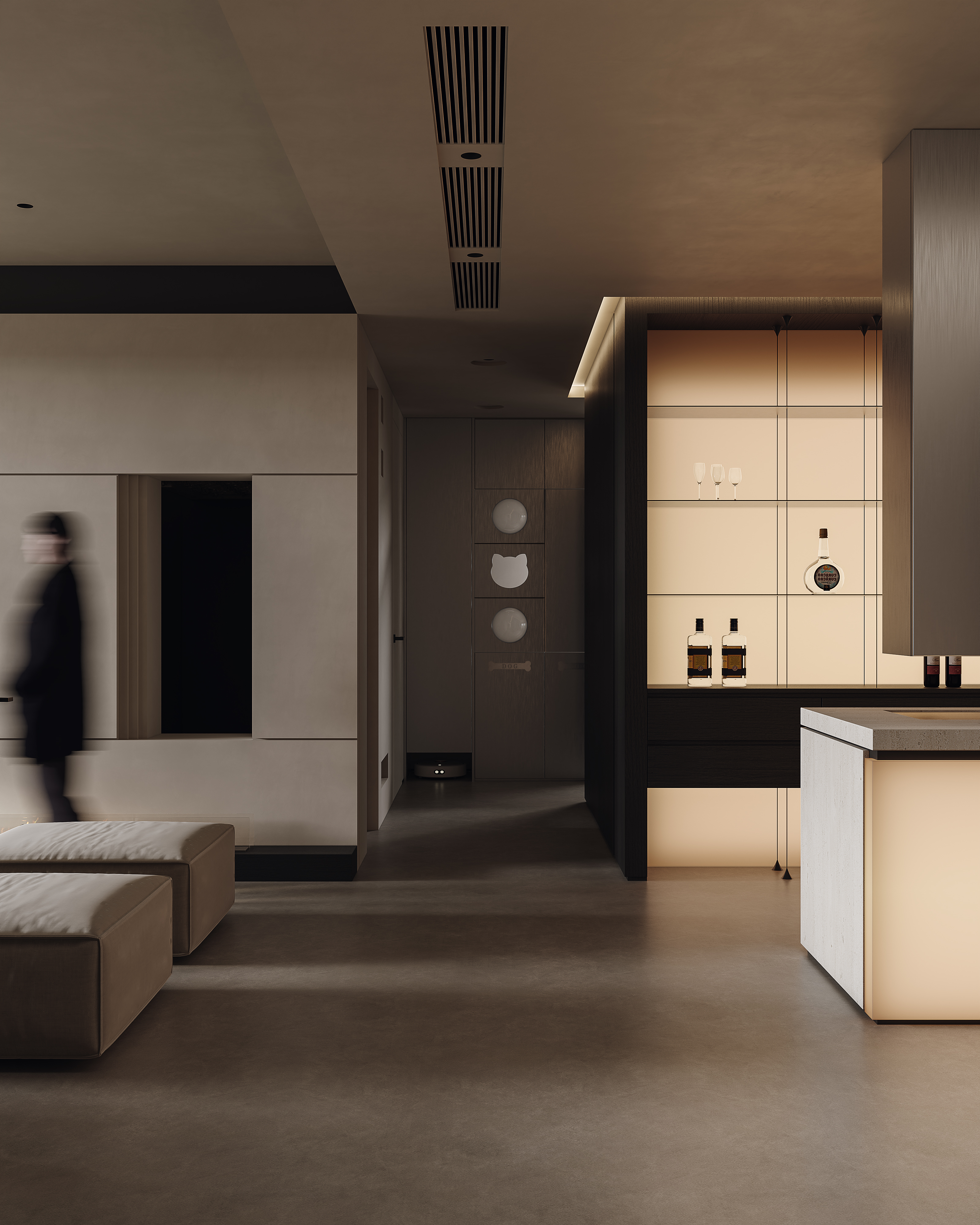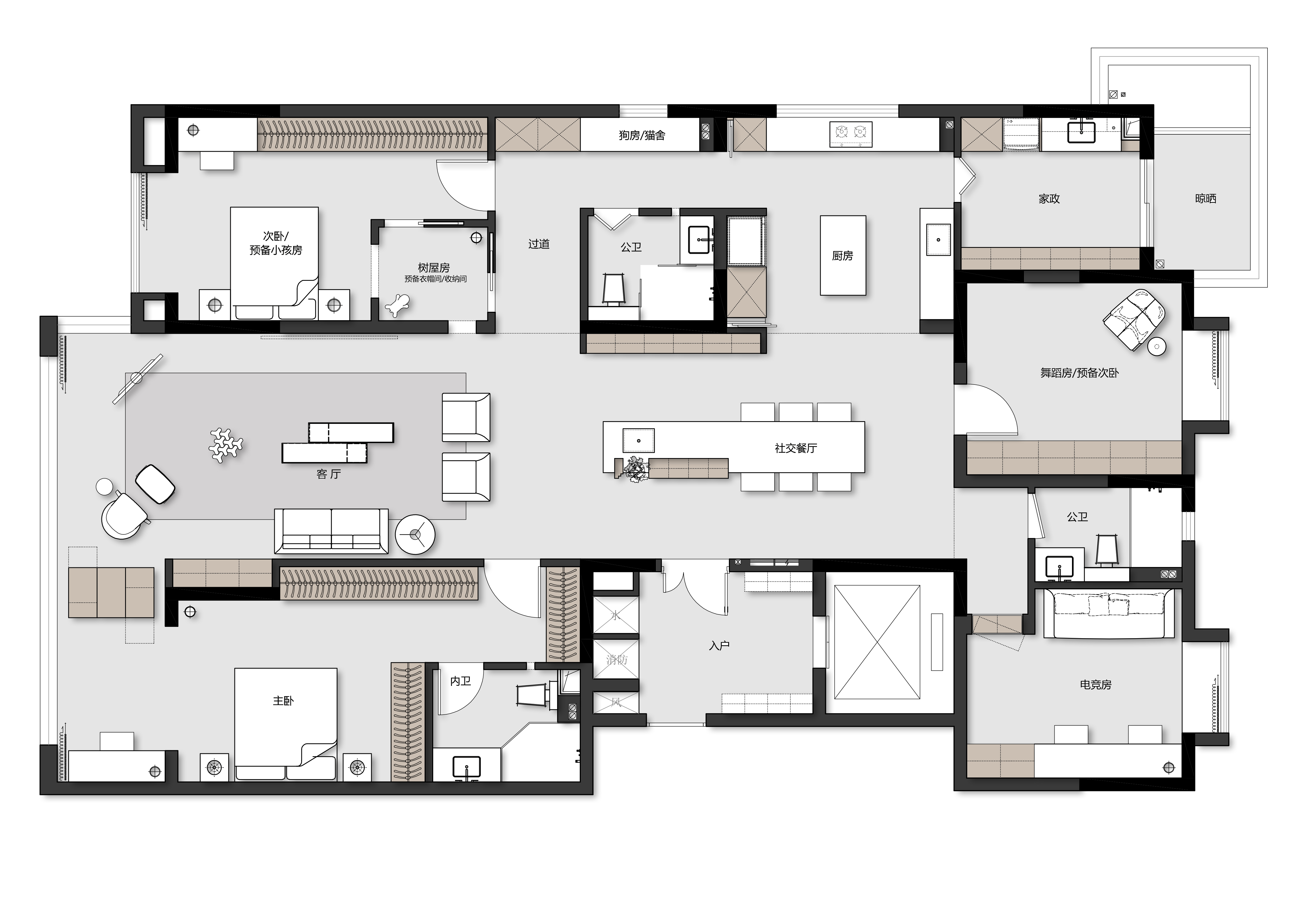 空间布局:用正负形的空间形式 在大空间里置入一个BOX 并且借助围绕BOX产生的洄游动线 串联起所有的公区功能 让居住体验更自由更多样化