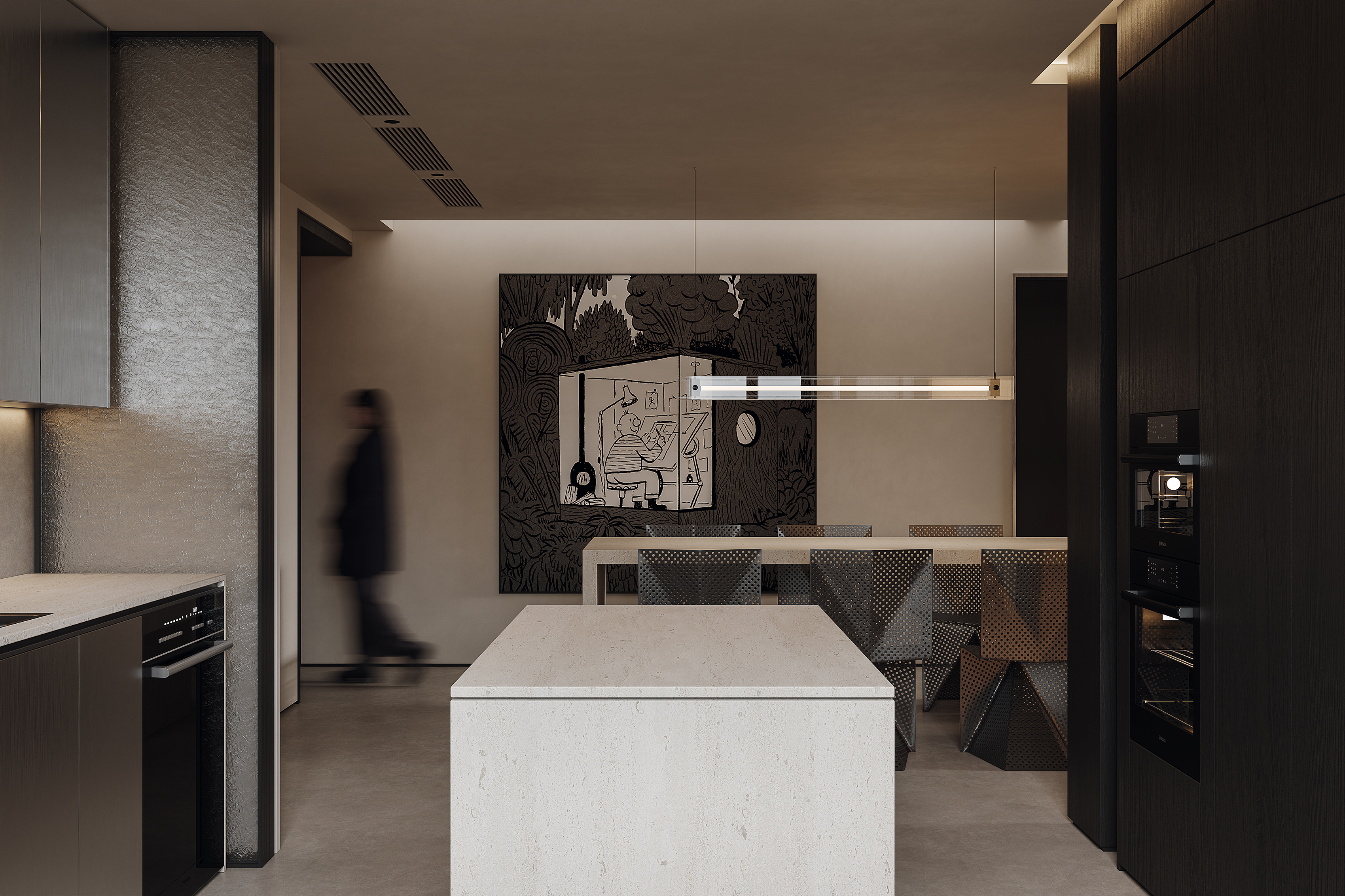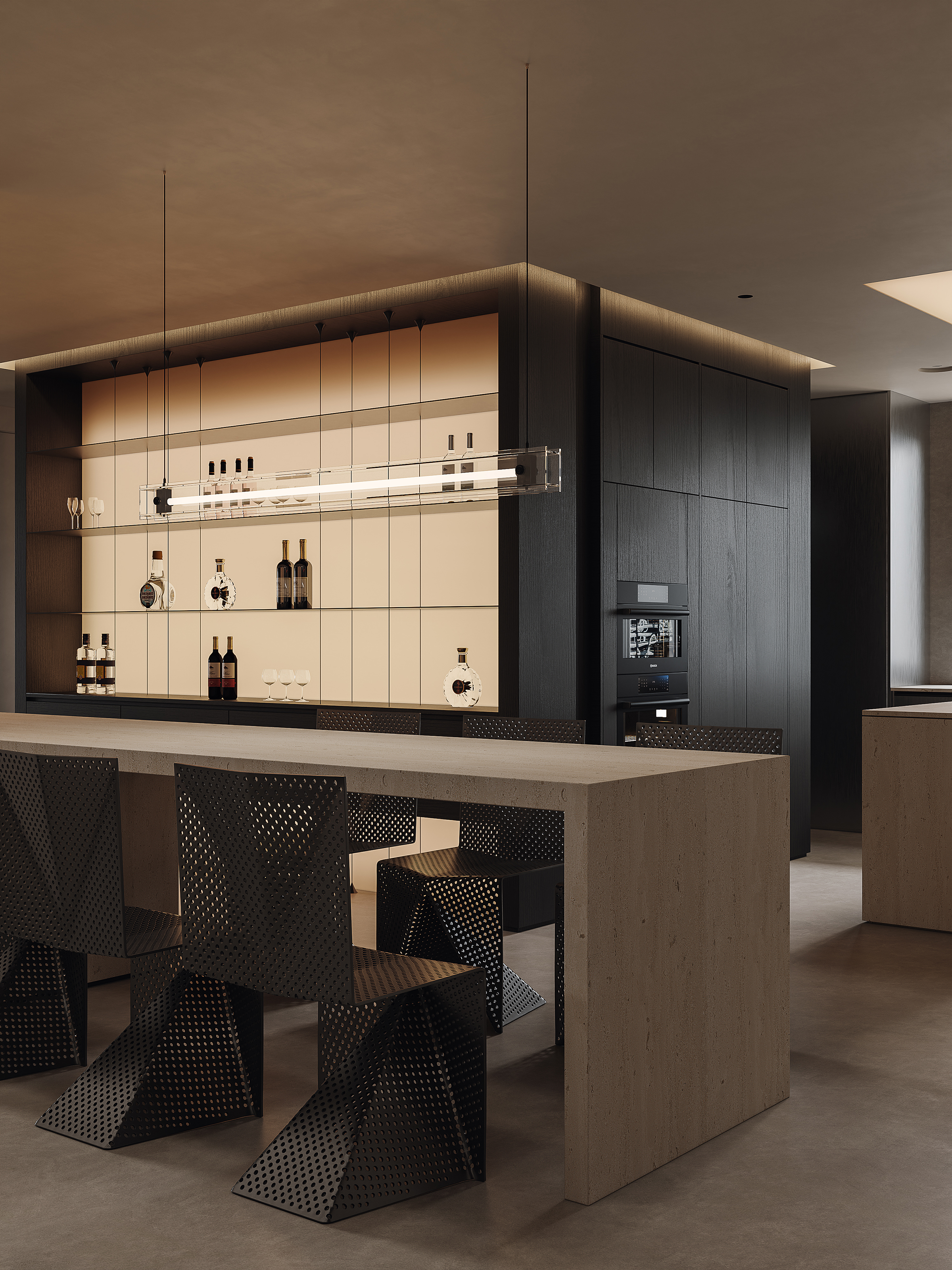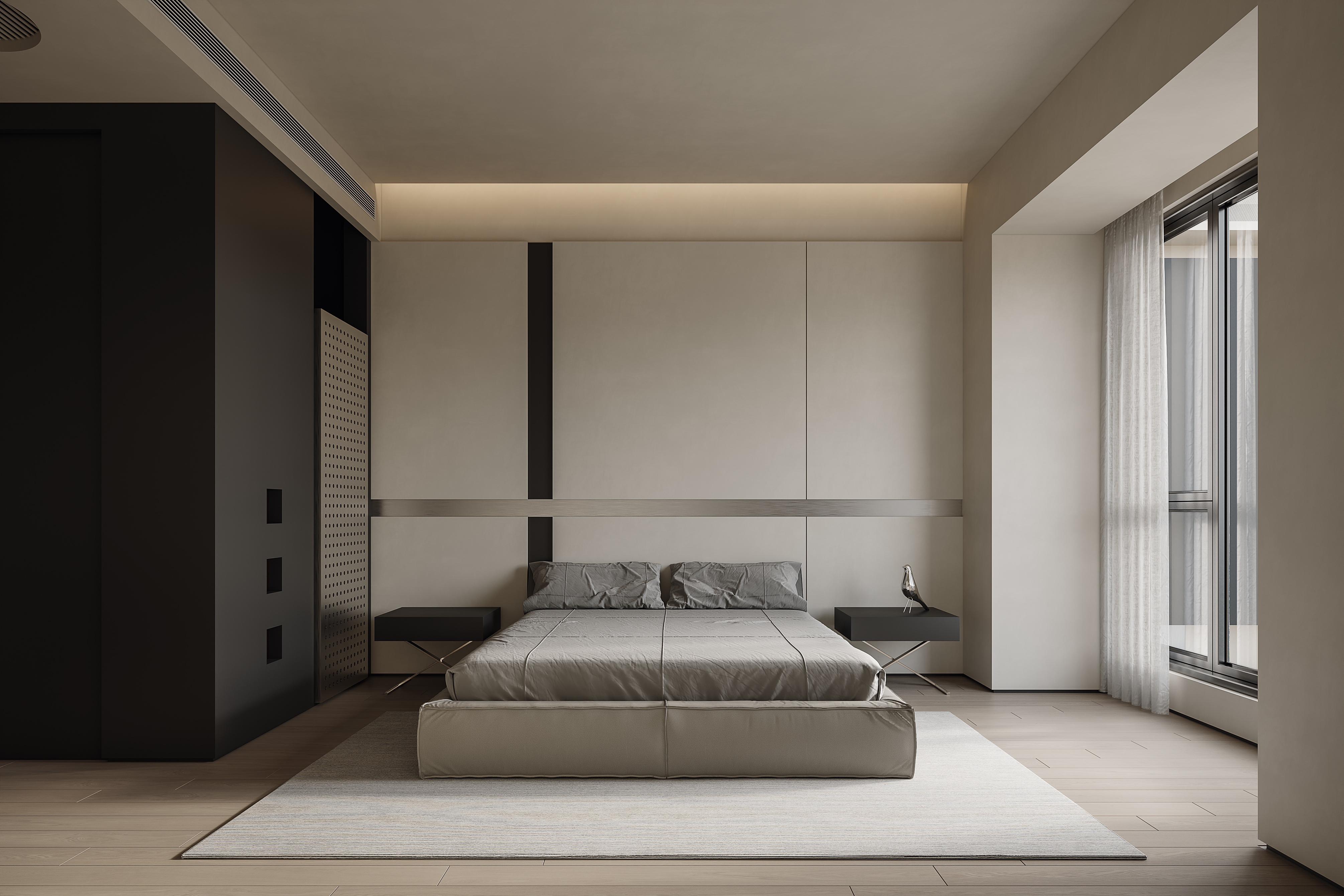 空间布局:用正负形的空间形式 在大空间里置入一个BOX 并且借助围绕BOX产生的洄游动线 串联起所有的公区功能 让居住体验更自由更多样化